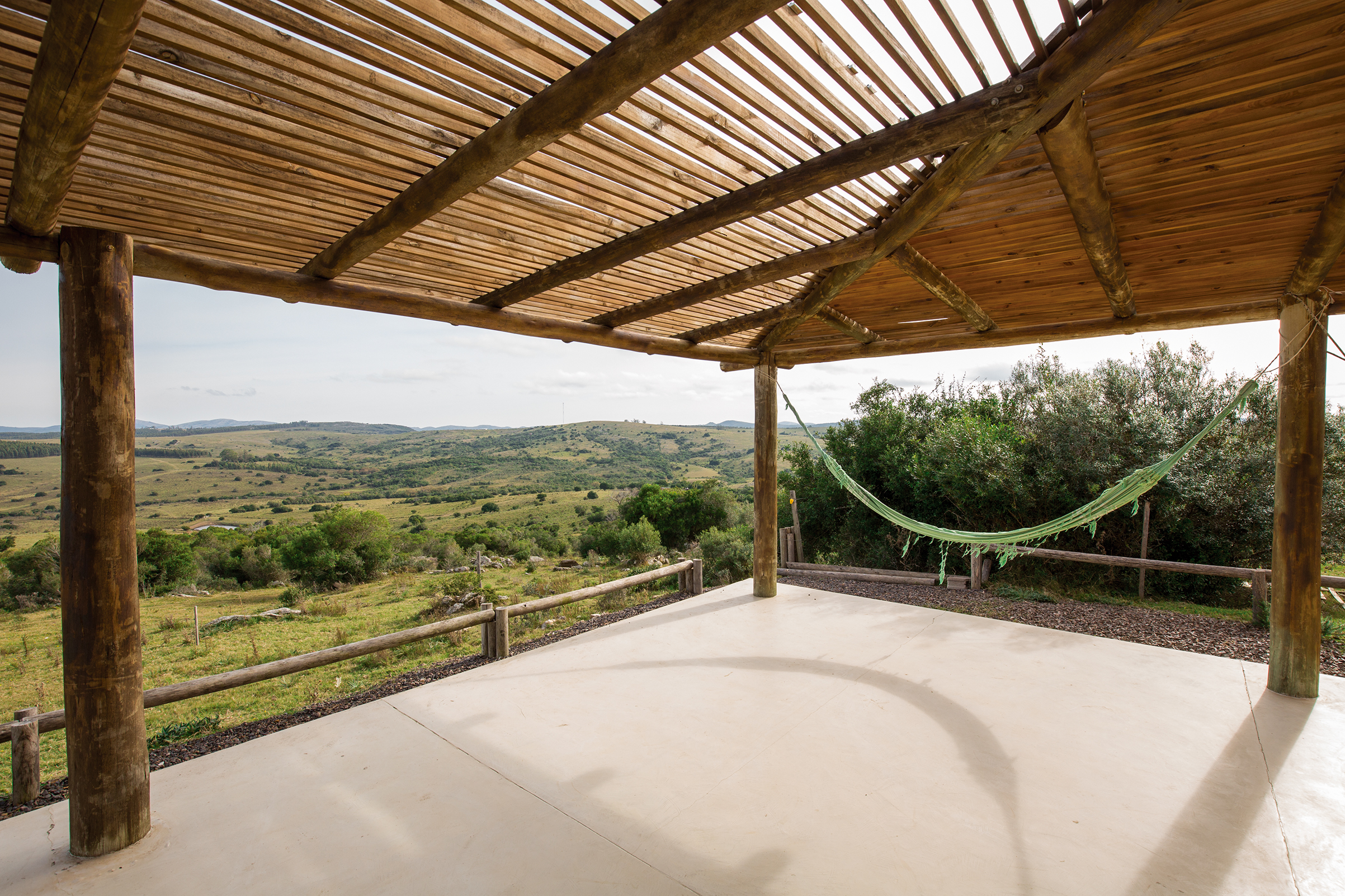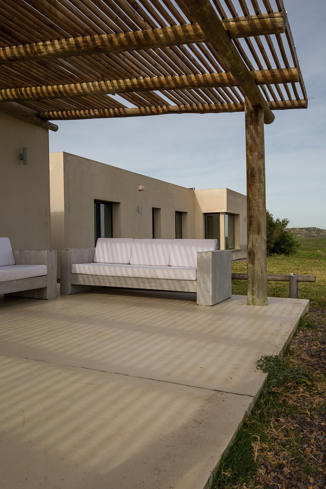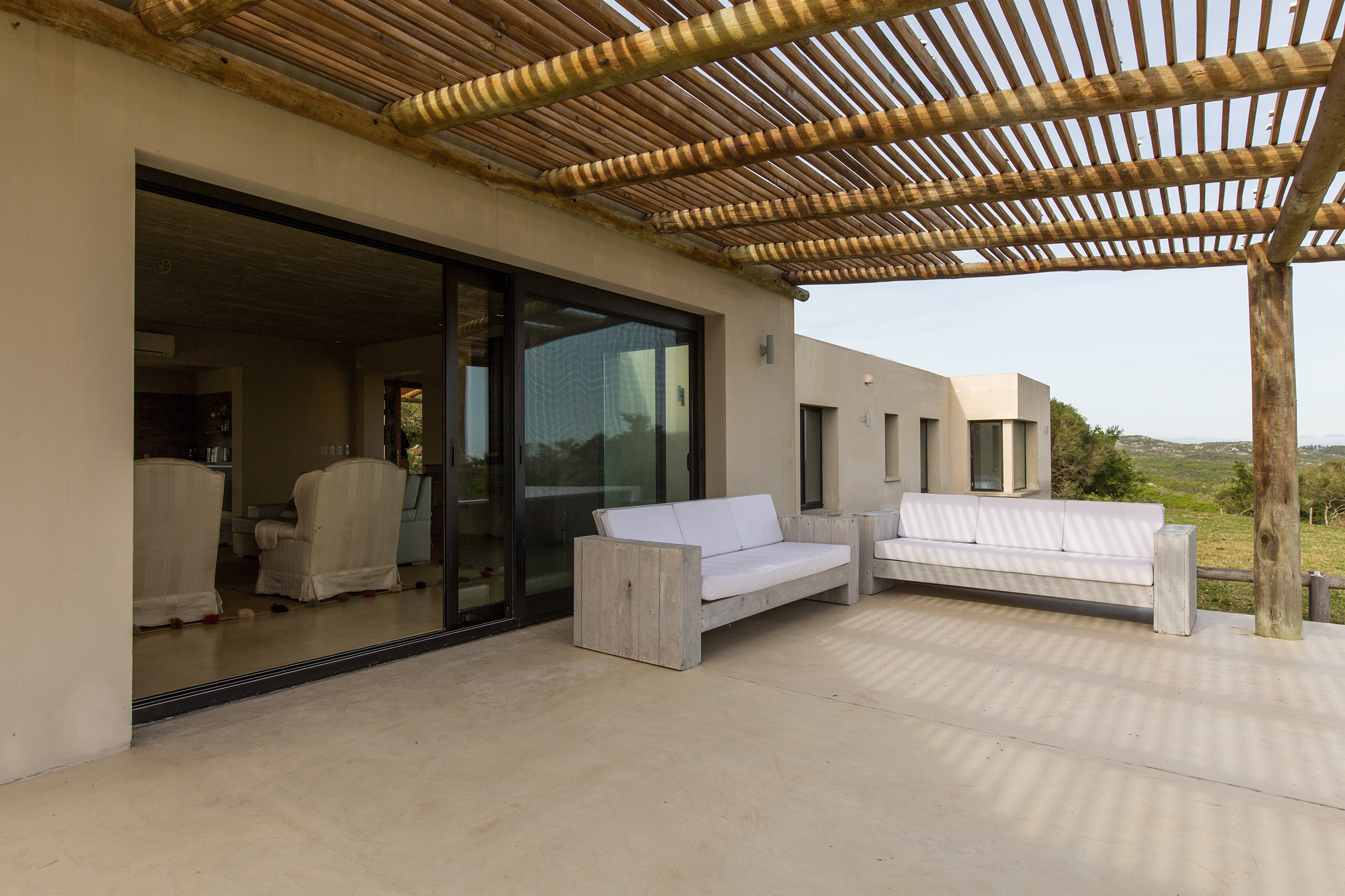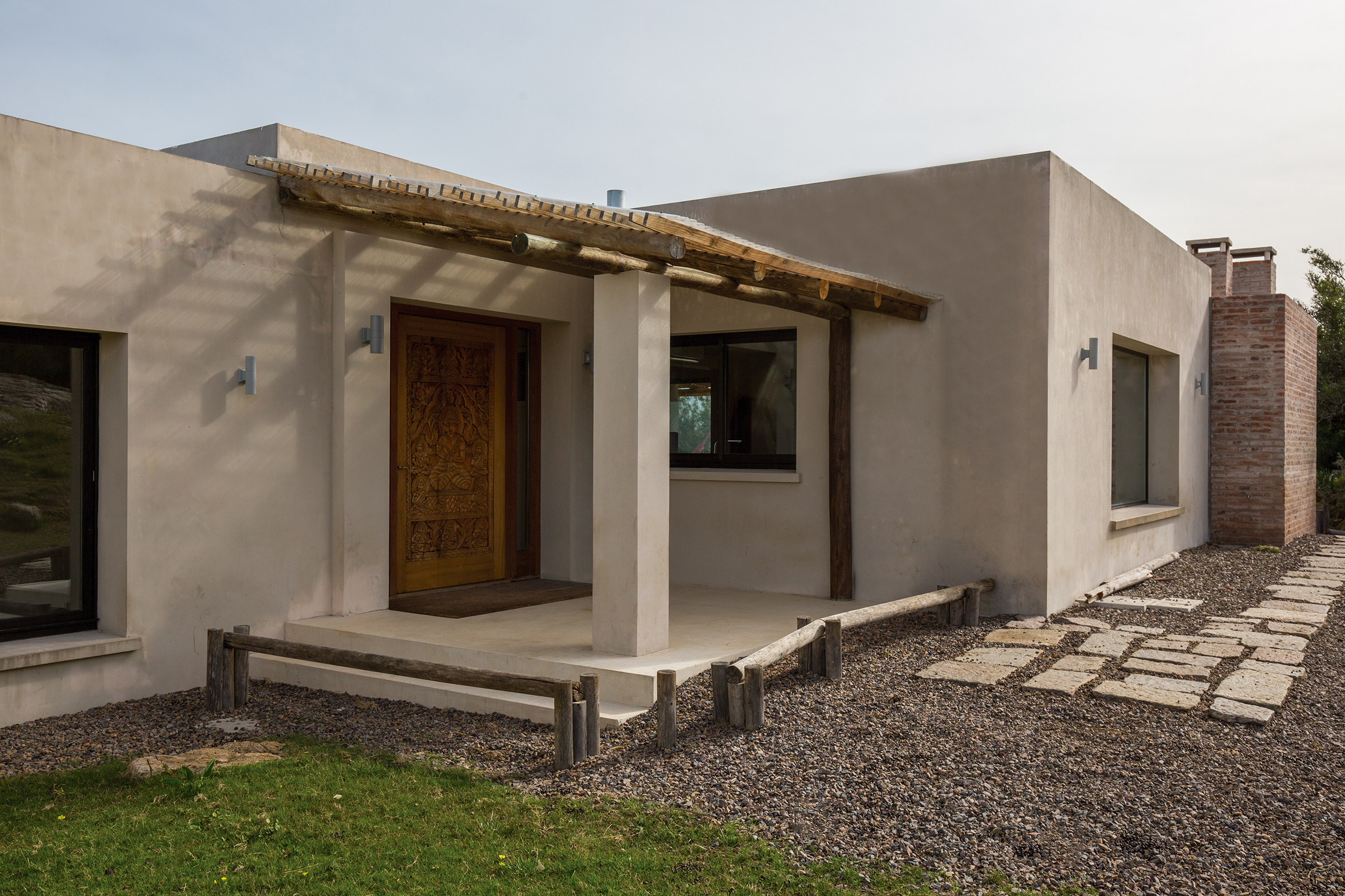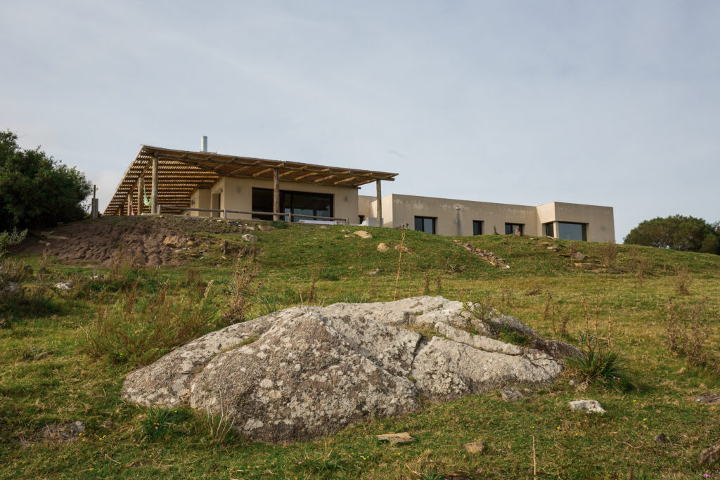 La obra se encuentra en los alrededores de Pan de Azúcar. La residencia está desarrollada en una planta, con forma de H. El principal objetivo fue independizar las áreas privadas: ambientes de dormitorios de las zonas de uso social. El área de los dormitorios está dividida en dos sectores, uno con dormitorios en suites y otro con otros dos dormitorios con baño compartido. Los espacios comunes están disociados de los privados y se comunican a través de un pasillo generoso en espacio que recorre el frente de la residencia y lo sostiene con grandes ventanas que integran al exterior y brindan luz natural. En los ambientes de uso social, la vista a las sierras fue el principal objetivo en la construcción y en la distribución espacial. Se utilizaron materiales nobles y colores claros, para una vivienda pensada para el disfrute durante todo el año. Espacios amplios separan de forma natural a los distintos ambientes con un mobiliario rústico que brinda calidez y armonía. En el exterior, grandes galerías con aleros recorren la casa en sus laterales, estas generan áreas de estar al exterior con vista a las sierras. En la entrada, un gran hall de acceso divide las áreas a través de un muro vidriado que integra a las sierras.