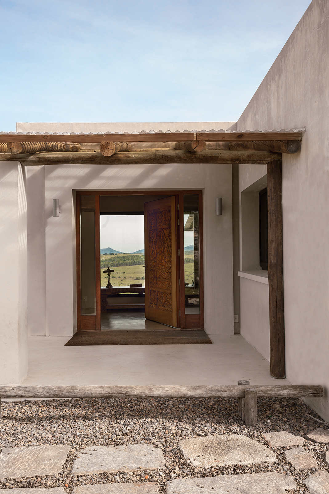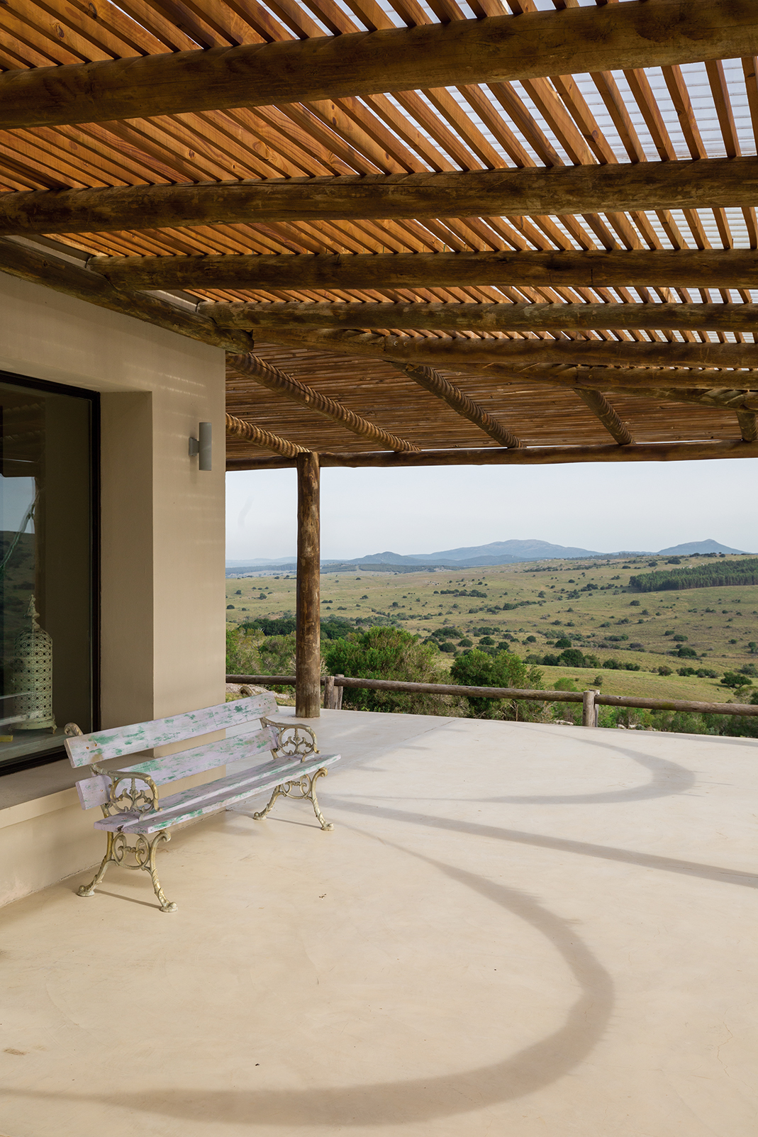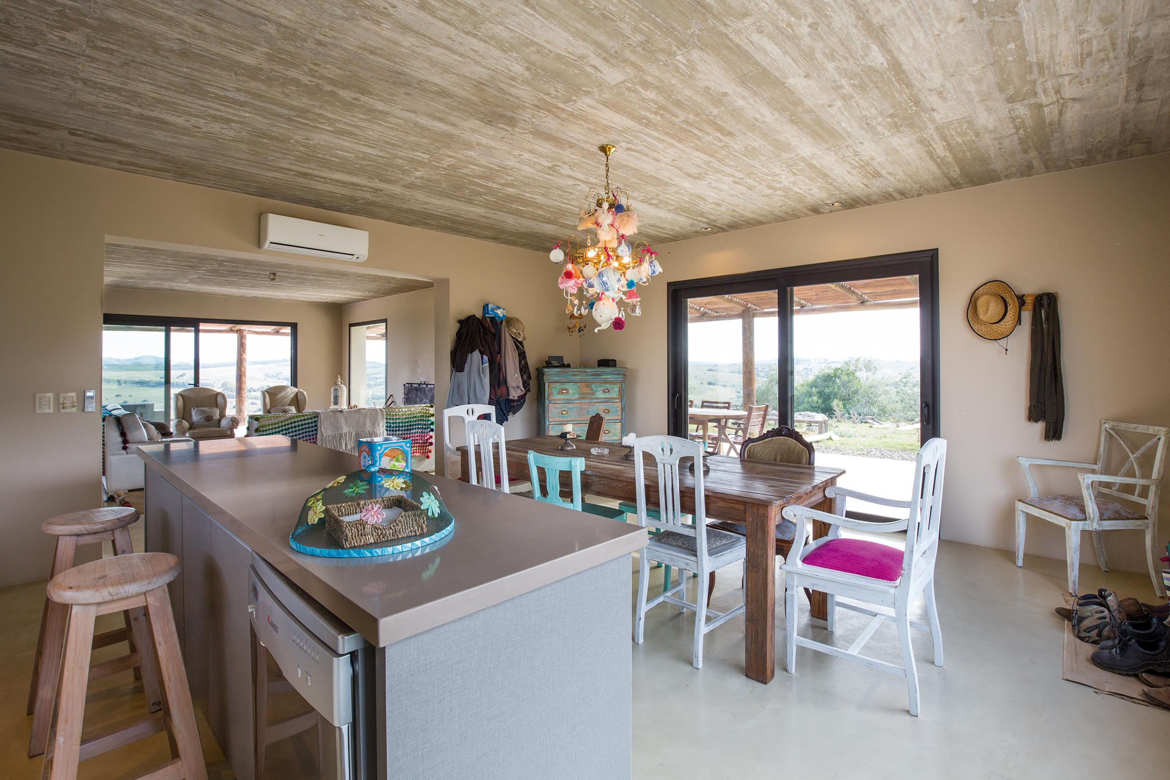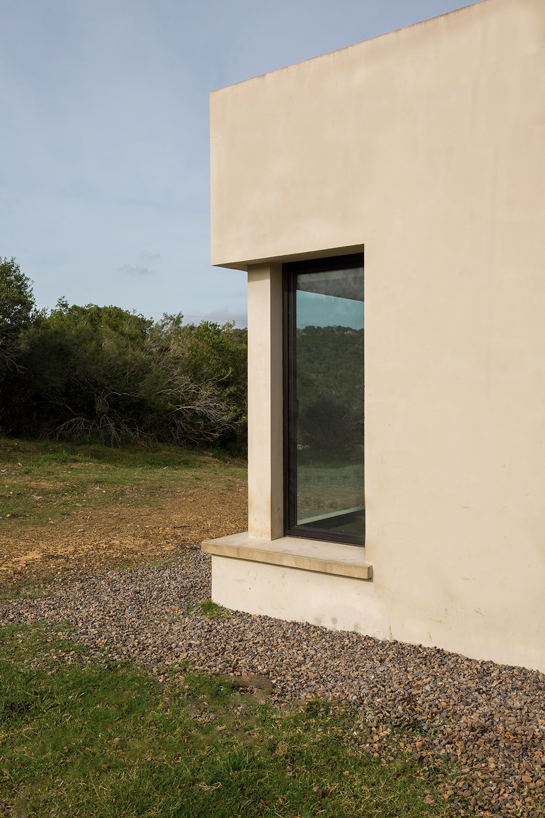 La obra se encuentra en los alrededores de Pan de Azúcar. La residencia está desarrollada en una planta, con forma de H. El principal objetivo fue independizar las áreas privadas: ambientes de dormitorios de las zonas de uso social. El área de los dormitorios está dividida en dos sectores, uno con dormitorios en suites y otro con otros dos dormitorios con baño compartido. Los espacios comunes están disociados de los privados y se comunican a través de un pasillo generoso en espacio que recorre el frente de la residencia y lo sostiene con grandes ventanas que integran al exterior y brindan luz natural. En los ambientes de uso social, la vista a las sierras fue el principal objetivo en la construcción y en la distribución espacial. Se utilizaron materiales nobles y colores claros, para una vivienda pensada para el disfrute durante todo el año. Espacios amplios separan de forma natural a los distintos ambientes con un mobiliario rústico que brinda calidez y armonía. En el exterior, grandes galerías con aleros recorren la casa en sus laterales, estas generan áreas de estar al exterior con vista a las sierras. En la entrada, un gran hall de acceso divide las áreas a través de un muro vidriado que integra a las sierras.