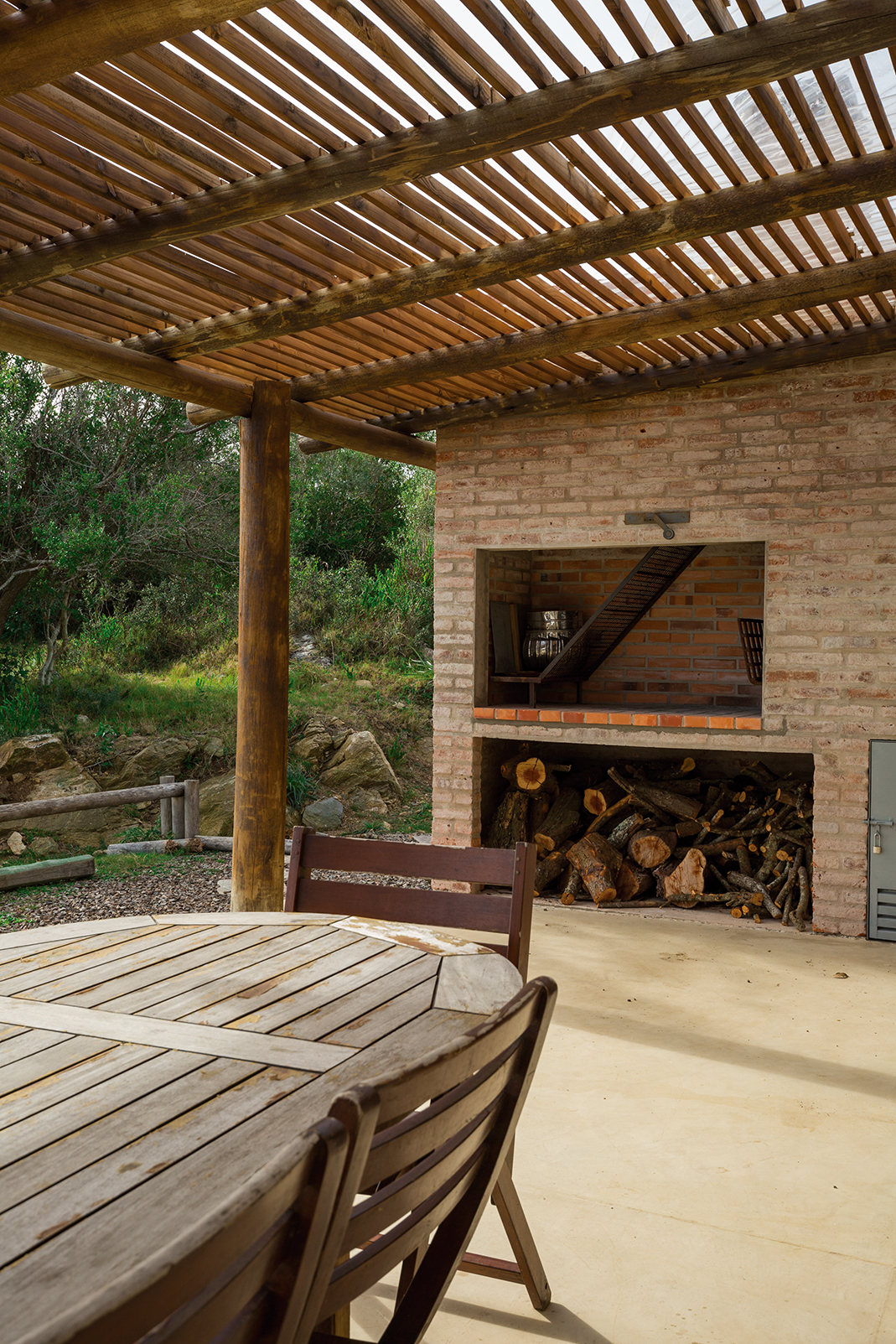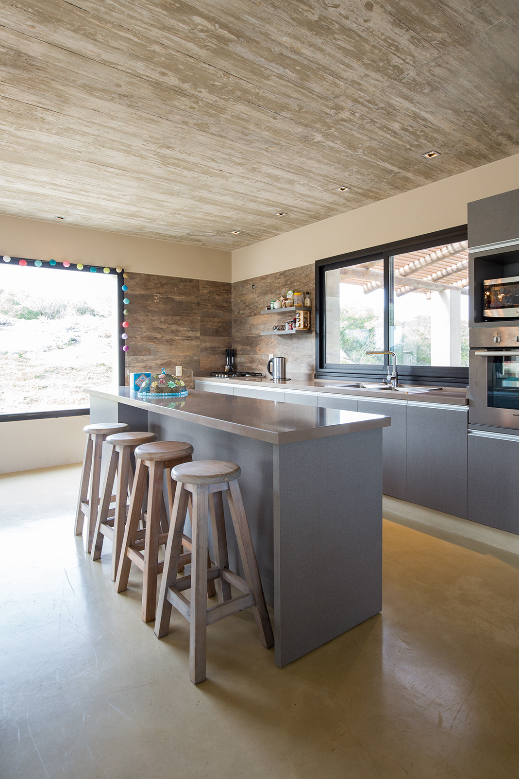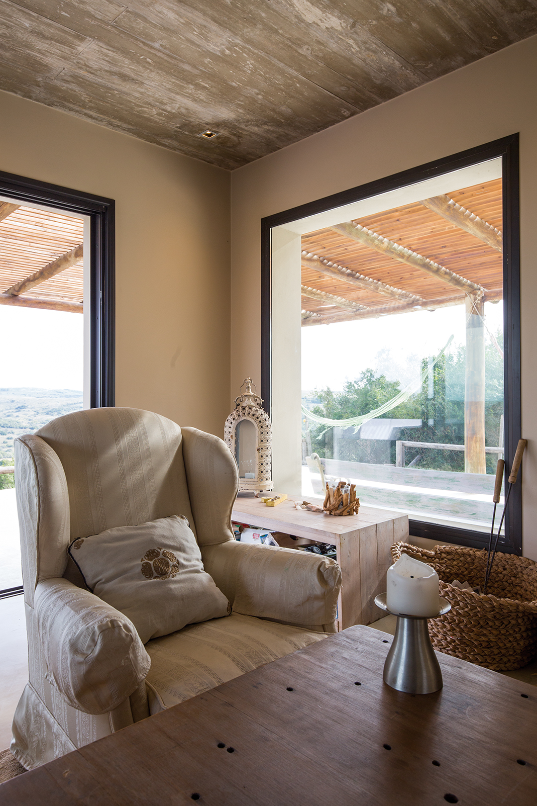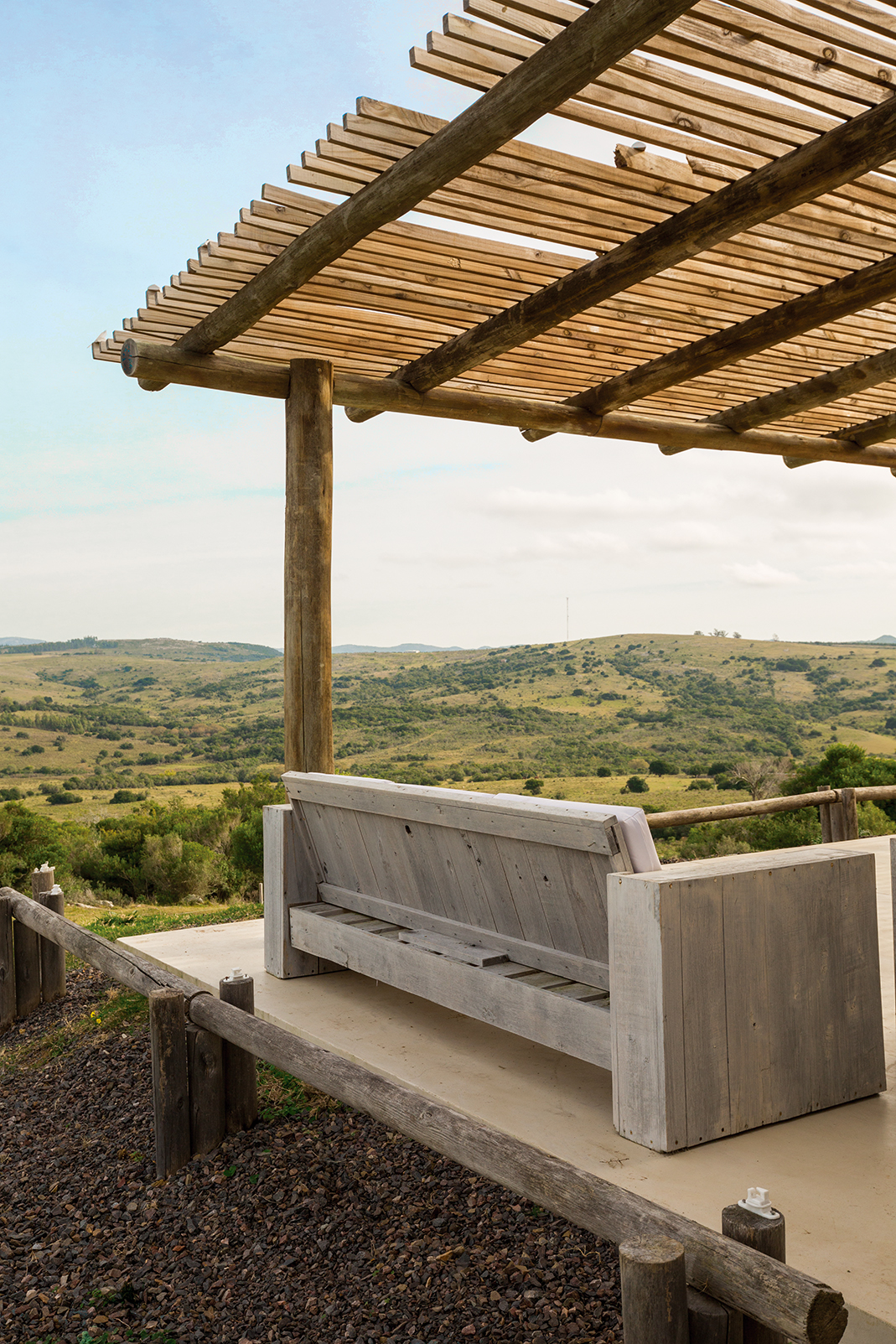 La obra se encuentra en los alrededores de Pan de Azúcar. La residencia está desarrollada en una planta, con forma de H. El principal objetivo fue independizar las áreas privadas: ambientes de dormitorios de las zonas de uso social. El área de los dormitorios está dividida en dos sectores, uno con dormitorios en suites y otro con otros dos dormitorios con baño compartido. Los espacios comunes están disociados de los privados y se comunican a través de un pasillo generoso en espacio que recorre el frente de la residencia y lo sostiene con grandes ventanas que integran al exterior y brindan luz natural. En los ambientes de uso social, la vista a las sierras fue el principal objetivo en la construcción y en la distribución espacial. Se utilizaron materiales nobles y colores claros, para una vivienda pensada para el disfrute durante todo el año. Espacios amplios separan de forma natural a los distintos ambientes con un mobiliario rústico que brinda calidez y armonía. En el exterior, grandes galerías con aleros recorren la casa en sus laterales, estas generan áreas de estar al exterior con vista a las sierras. En la entrada, un gran hall de acceso divide las áreas a través de un muro vidriado que integra a las sierras.