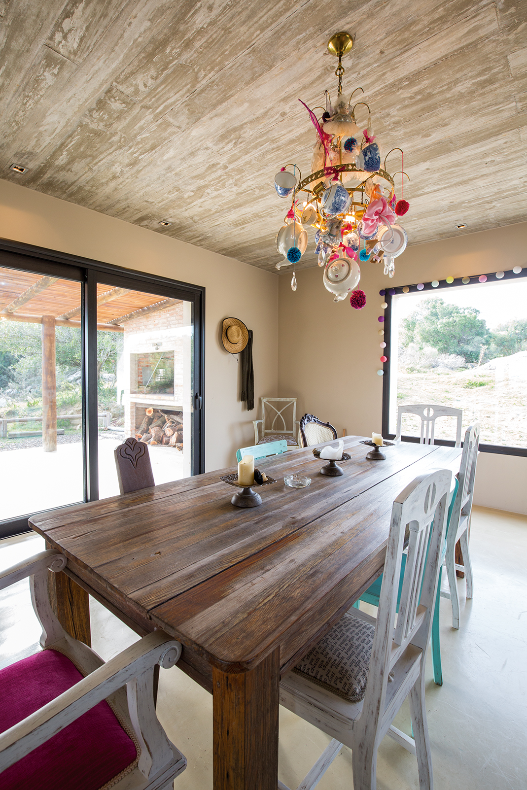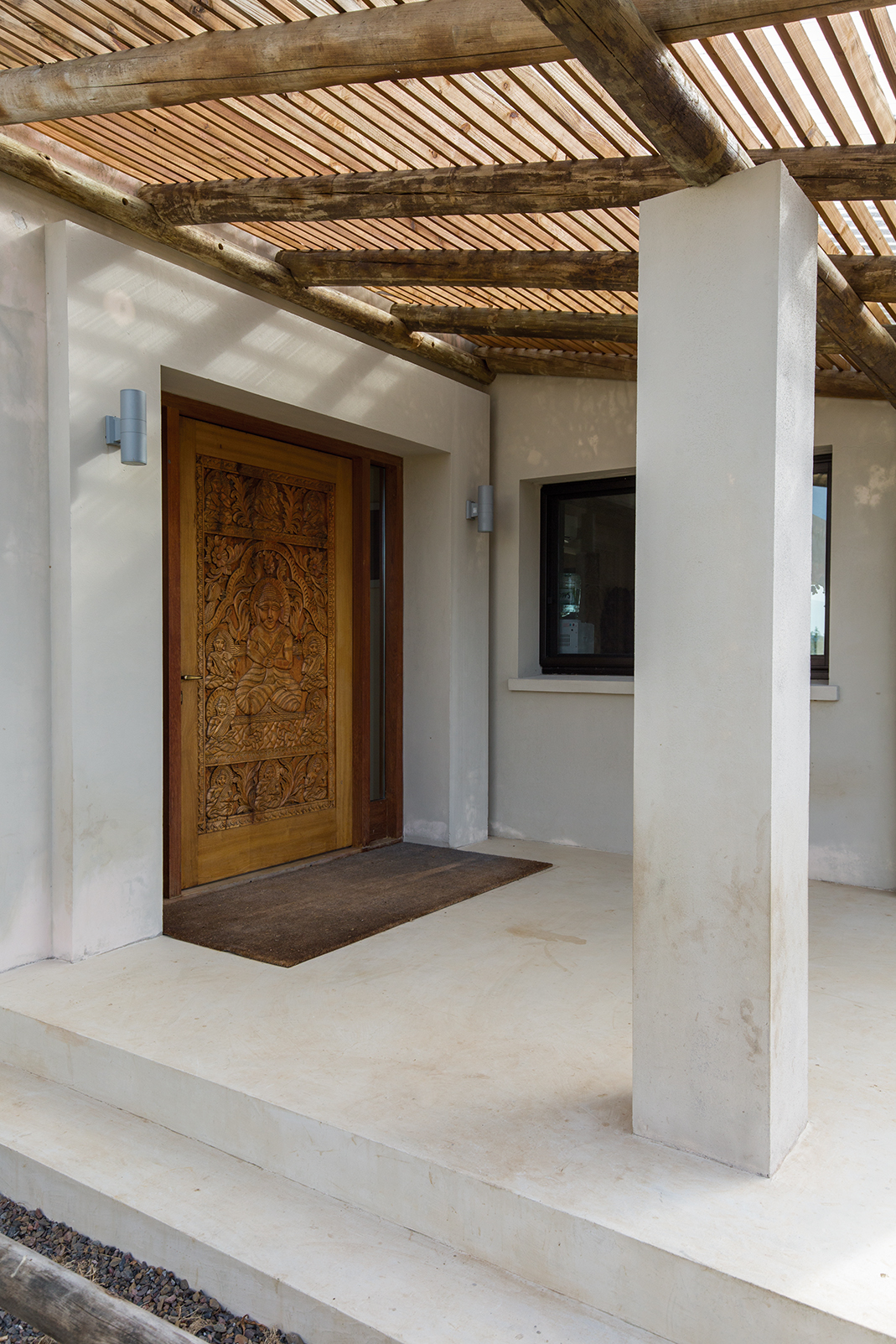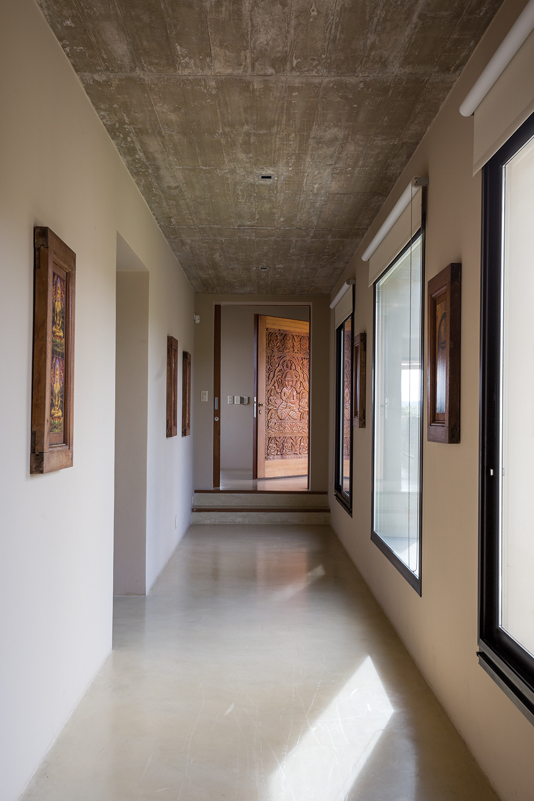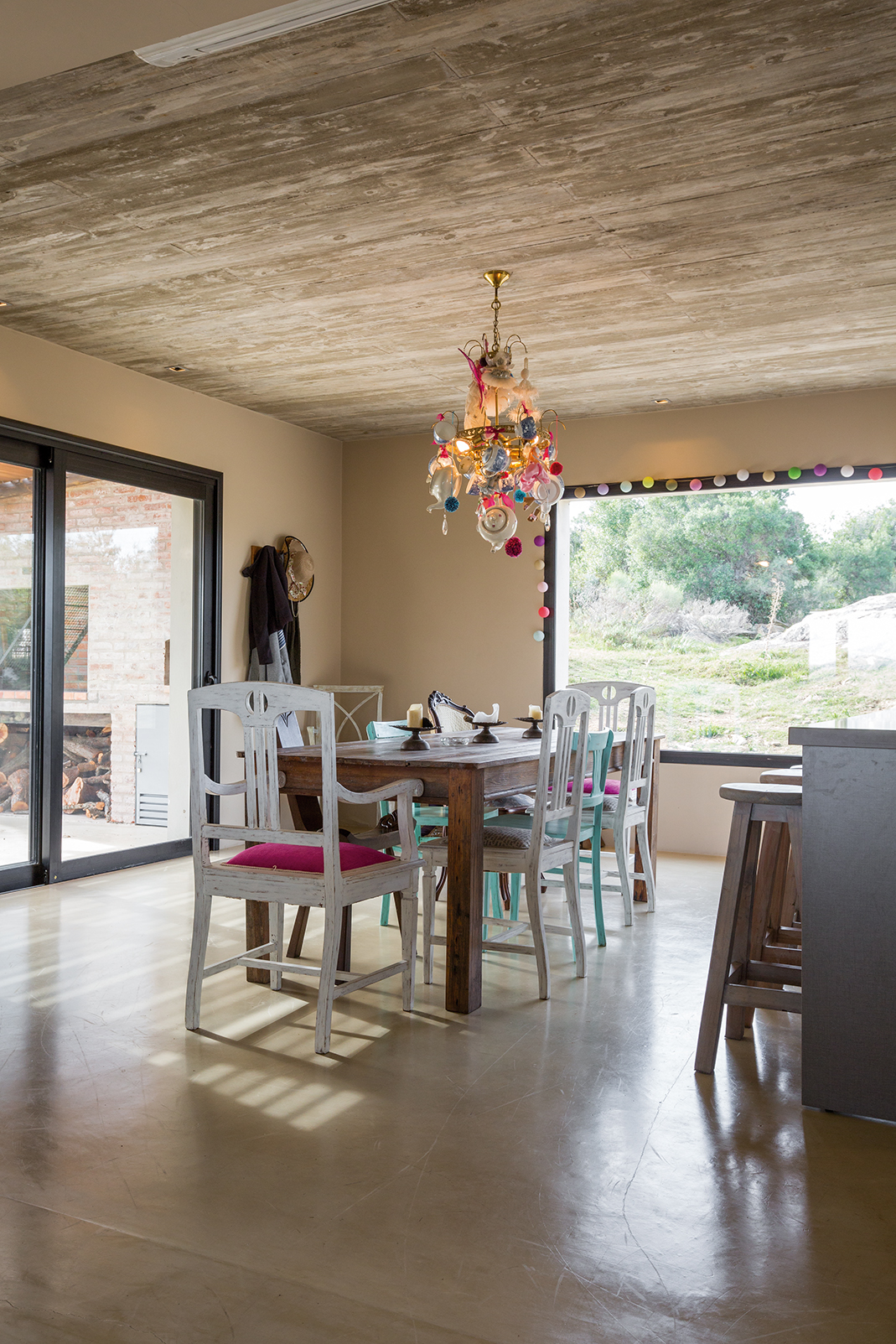 La obra se encuentra en los alrededores de Pan de Azúcar. La residencia está desarrollada en una planta, con forma de H. El principal objetivo fue independizar las áreas privadas: ambientes de dormitorios de las zonas de uso social. El área de los dormitorios está dividida en dos sectores, uno con dormitorios en suites y otro con otros dos dormitorios con baño compartido. Los espacios comunes están disociados de los privados y se comunican a través de un pasillo generoso en espacio que recorre el frente de la residencia y lo sostiene con grandes ventanas que integran al exterior y brindan luz natural. En los ambientes de uso social, la vista a las sierras fue el principal objetivo en la construcción y en la distribución espacial. Se utilizaron materiales nobles y colores claros, para una vivienda pensada para el disfrute durante todo el año. Espacios amplios separan de forma natural a los distintos ambientes con un mobiliario rústico que brinda calidez y armonía. En el exterior, grandes galerías con aleros recorren la casa en sus laterales, estas generan áreas de estar al exterior con vista a las sierras. En la entrada, un gran hall de acceso divide las áreas a través de un muro vidriado que integra a las sierras.