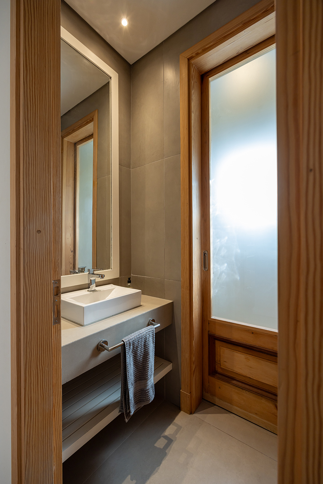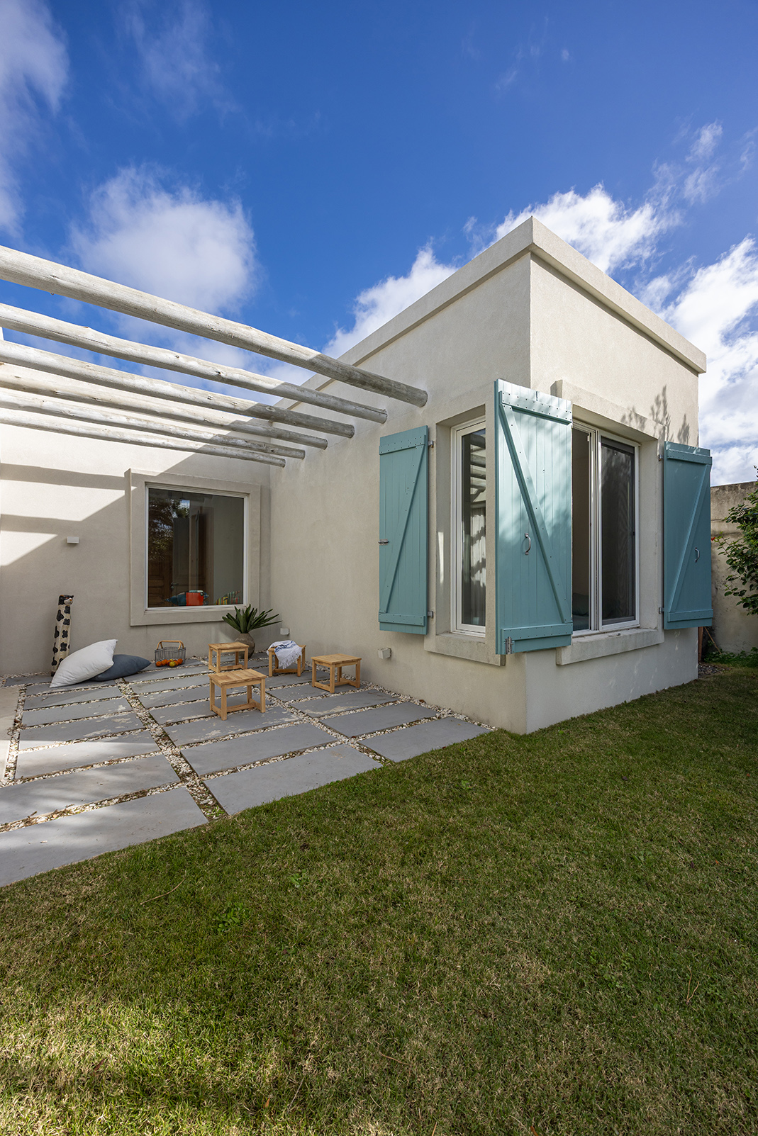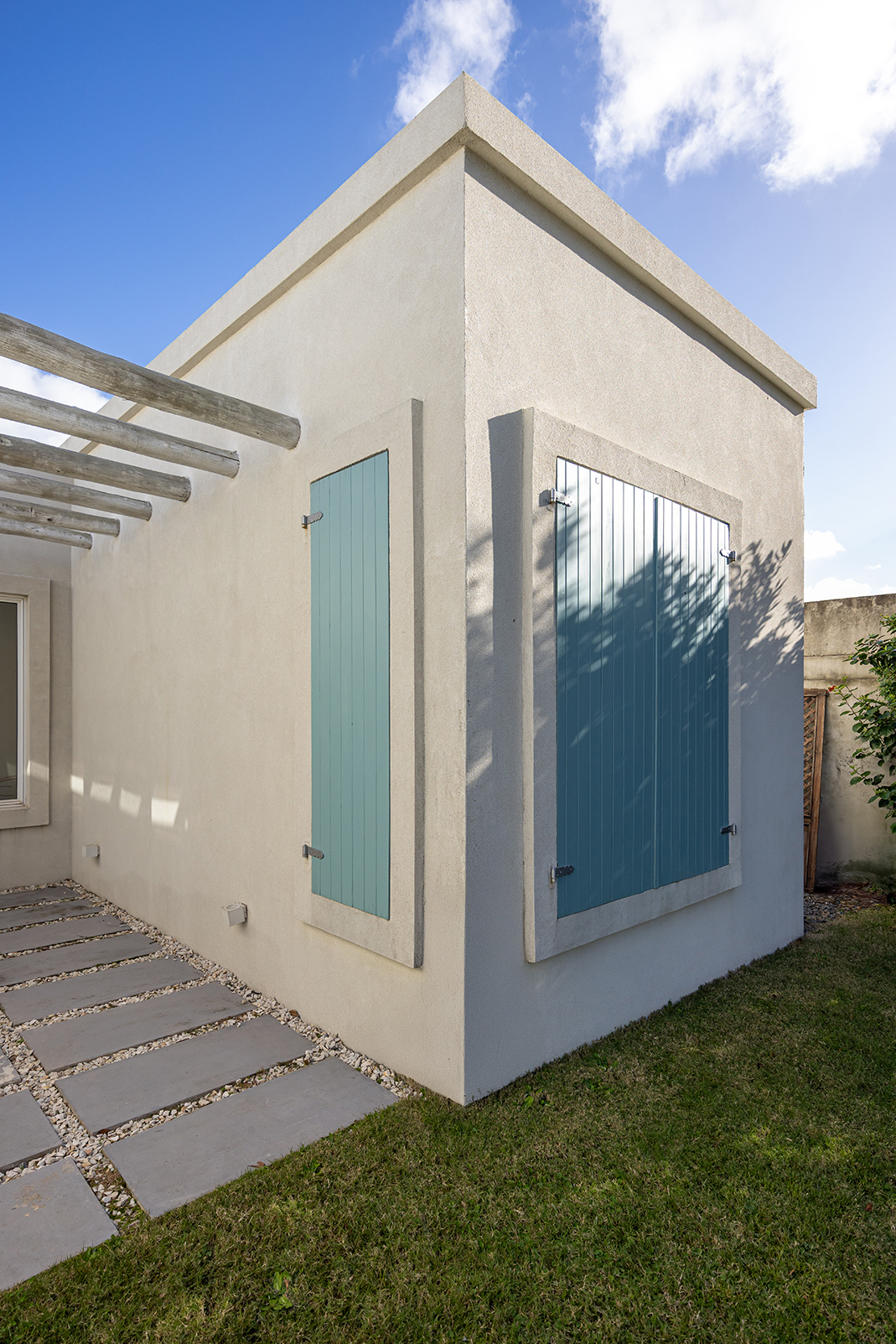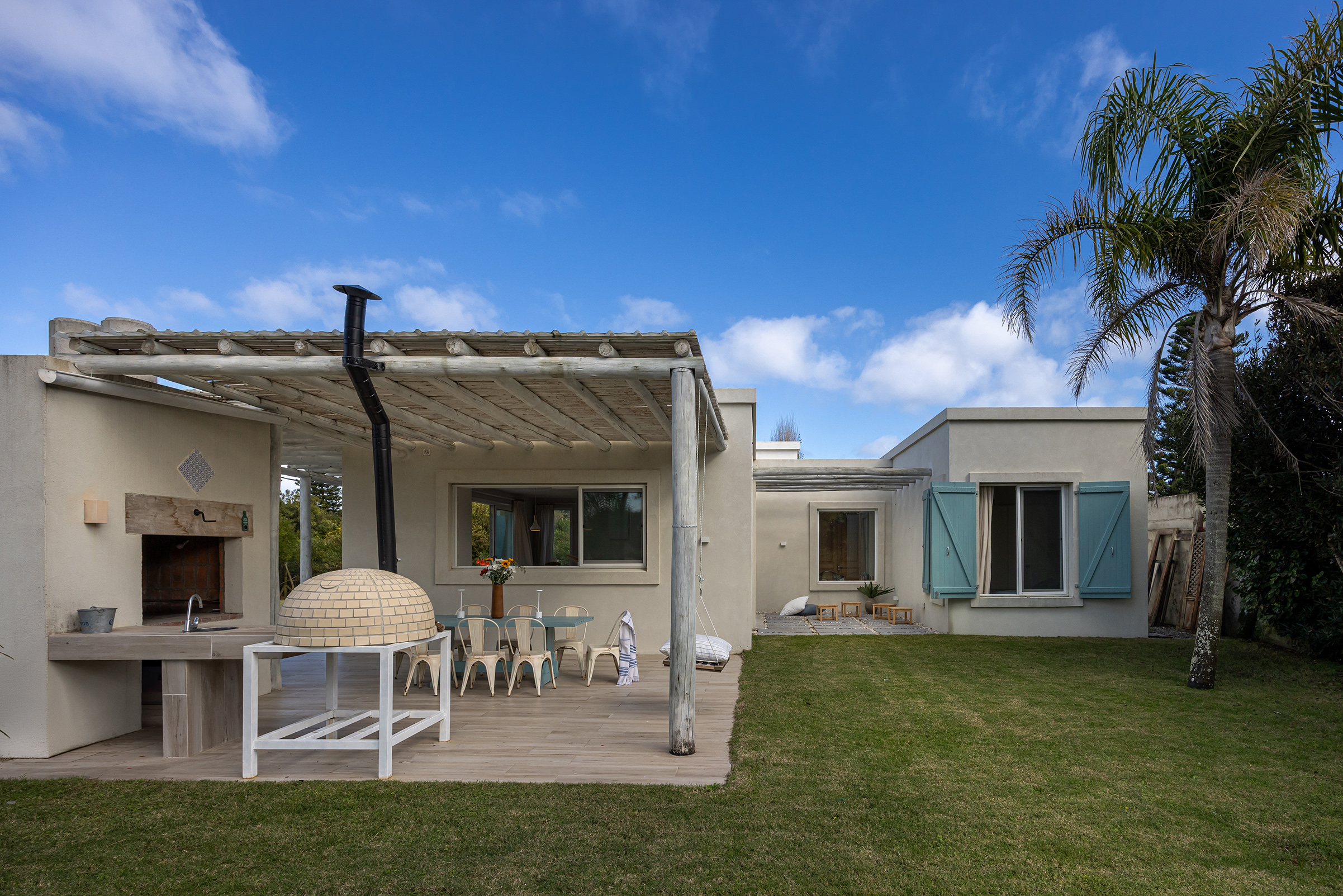 La casa es liviana sin ser frágil. Sus terminaciones son de discreta belleza: paredes blancas, porcelanato claro que unifica interiores y exteriores, carpintería de aluminio blanco de alto rendimiento, postigos celestes que salpican de color y frescura. Pero el alma de la casa está en las puertas: todas ellas recuperadas de un viejo hotel, de pino macizo, restauradas y recicladas con amor. La de entrada —de dos hojas— lleva además una historia bajo su piel: ha sido reforzada con placas de chapa de barco, como si trajera consigo una memoria náutica, un ancla simbólica a otras travesías.