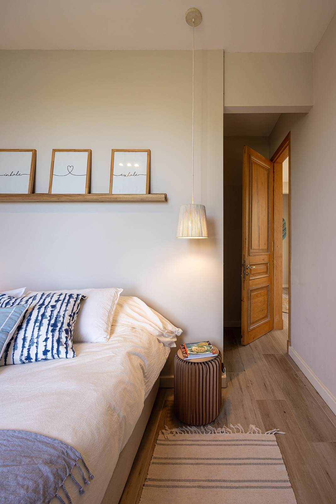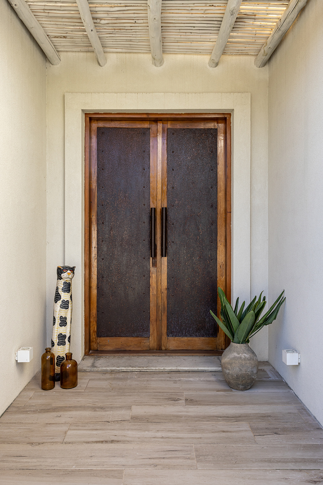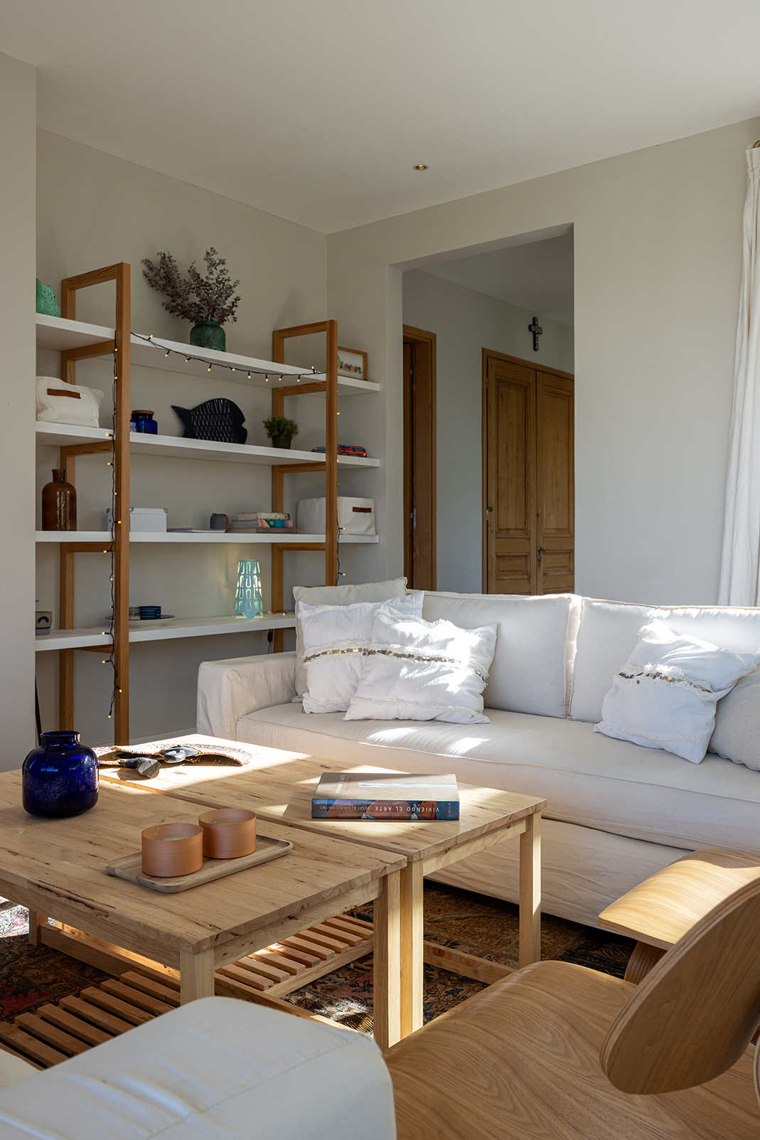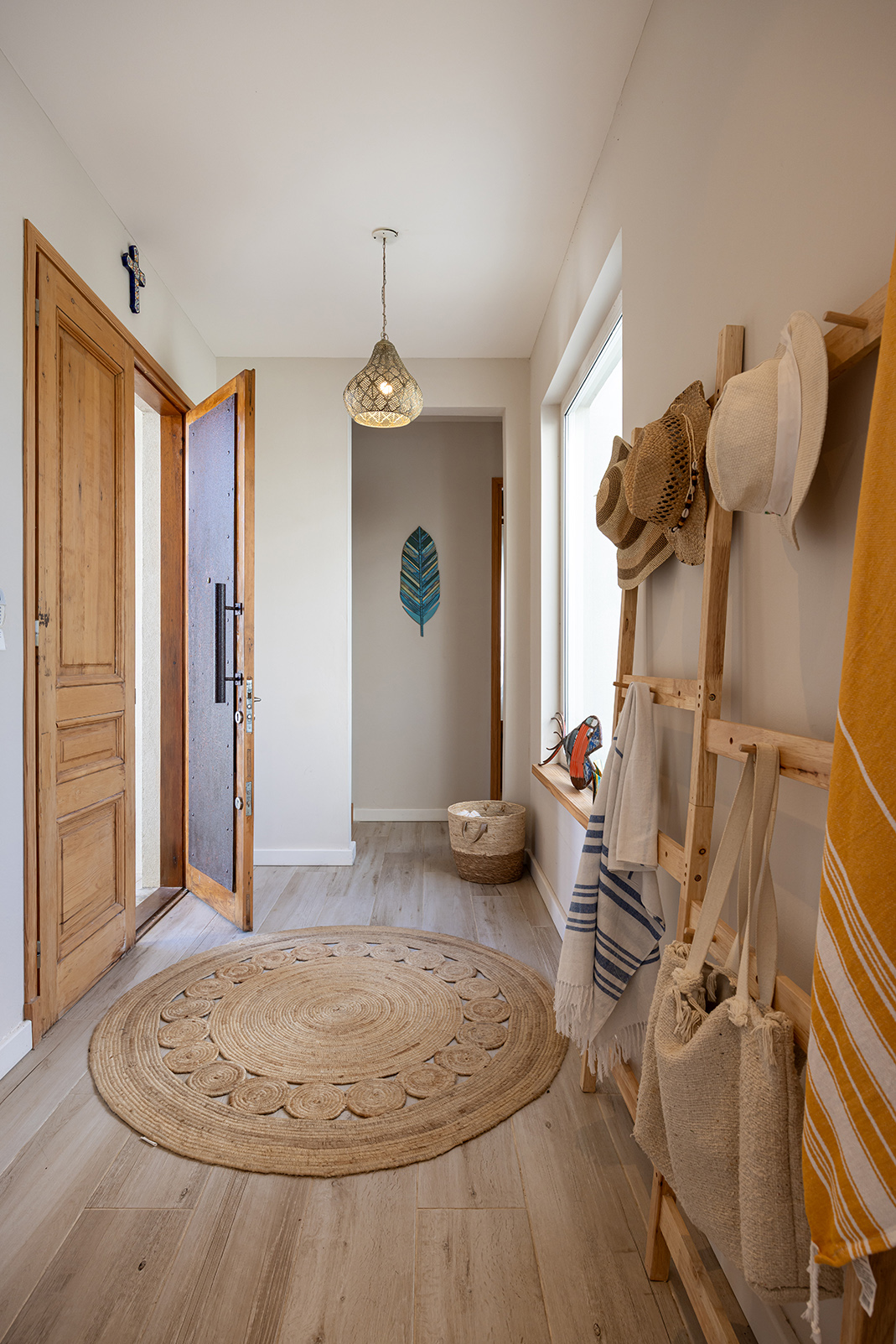 La casa es liviana sin ser frágil. Sus terminaciones son de discreta belleza: paredes blancas, porcelanato claro que unifica interiores y exteriores, carpintería de aluminio blanco de alto rendimiento, postigos celestes que salpican de color y frescura. Pero el alma de la casa está en las puertas: todas ellas recuperadas de un viejo hotel, de pino macizo, restauradas y recicladas con amor. La de entrada —de dos hojas— lleva además una historia bajo su piel: ha sido reforzada con placas de chapa de barco, como si trajera consigo una memoria náutica, un ancla simbólica a otras travesías.