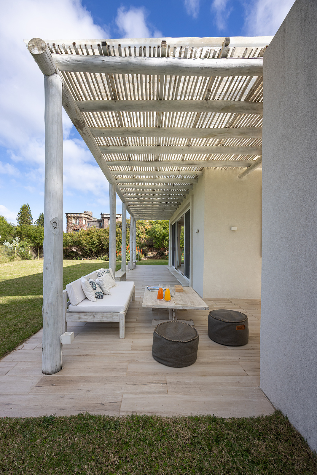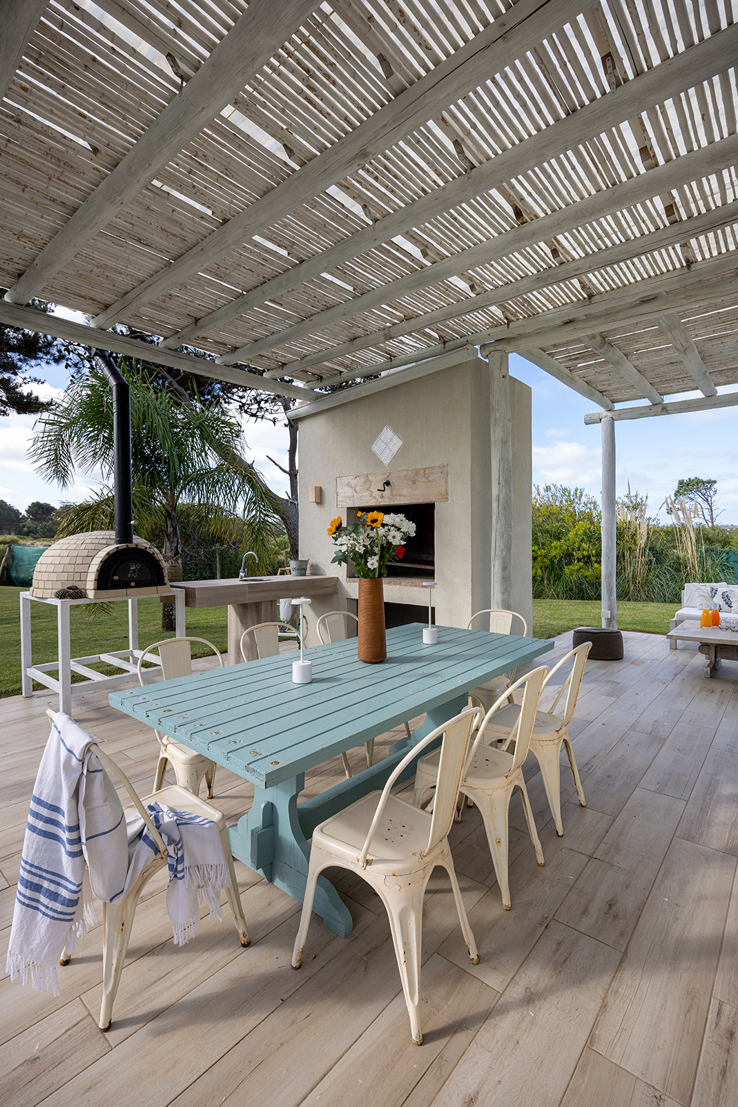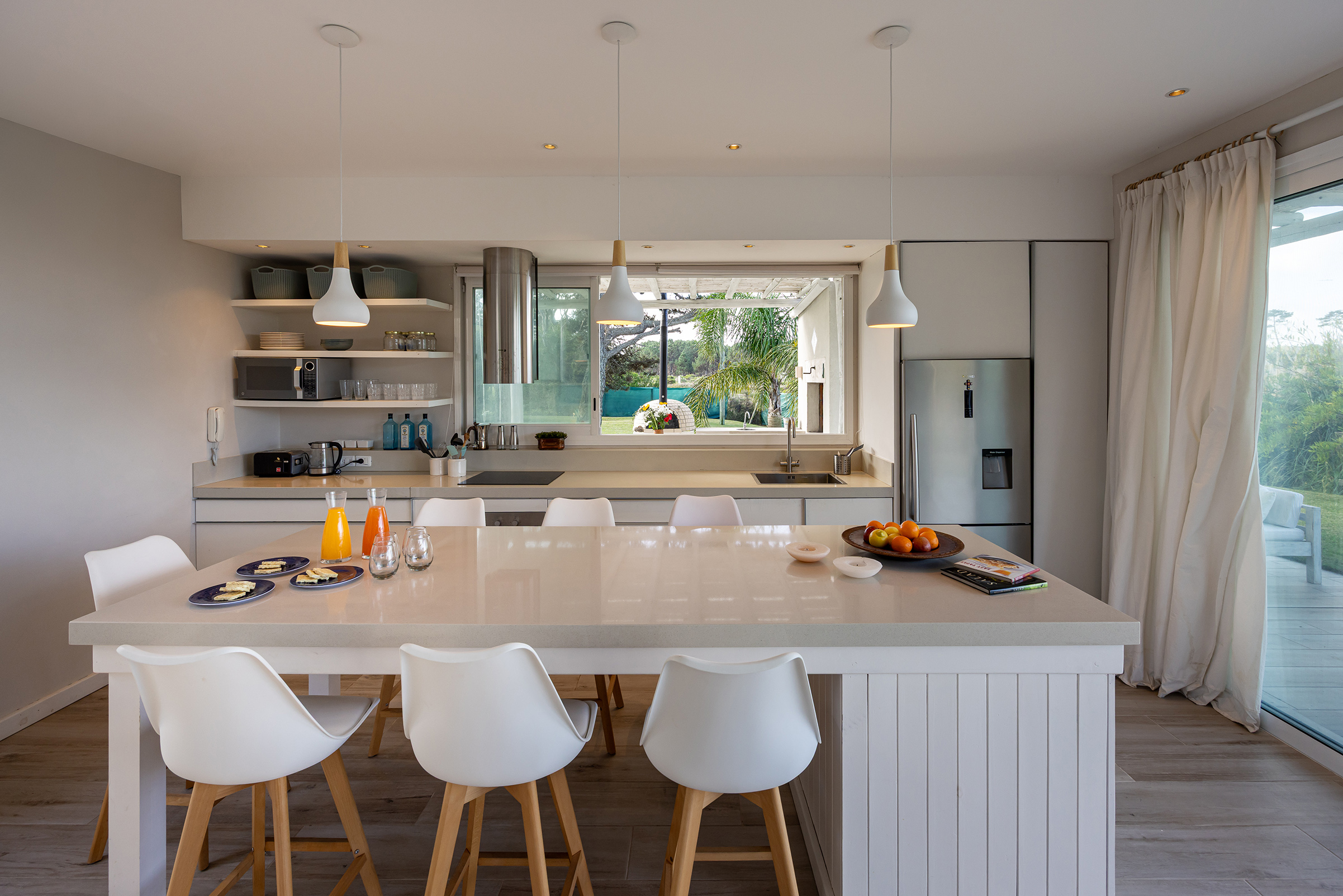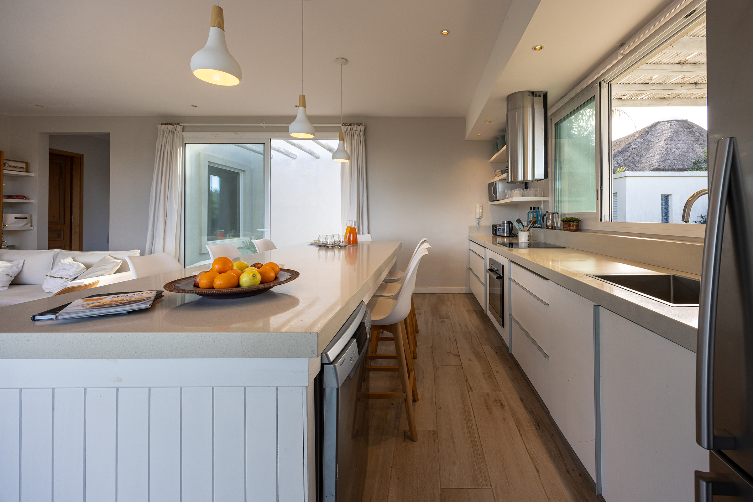 Pero lo esencial no está solo en la planta, sino en el aire que la casa deja correr. El estar-comedor se abre al Este con generosos ventanales, que lo conectan con una galería de palos y cañas patinadas en blanco, como traídas de alguna playa griega. Otro ventanal da al patio central: un espacio íntimo entre crujías, protegido del viento, que recoge la vista del mar a través de los cristales y se abre hacia el Norte, donde el jardín respira. Una pérgola hermana conduce al comedor exterior, donde los almuerzos de verano se alargan bajo la sombra filtrada. La cocina, corazón del convivio, tiene una gran isla para cocinar y reunirse, porque en esta casa se entiende que la comida no es solo nutrición, sino rito.