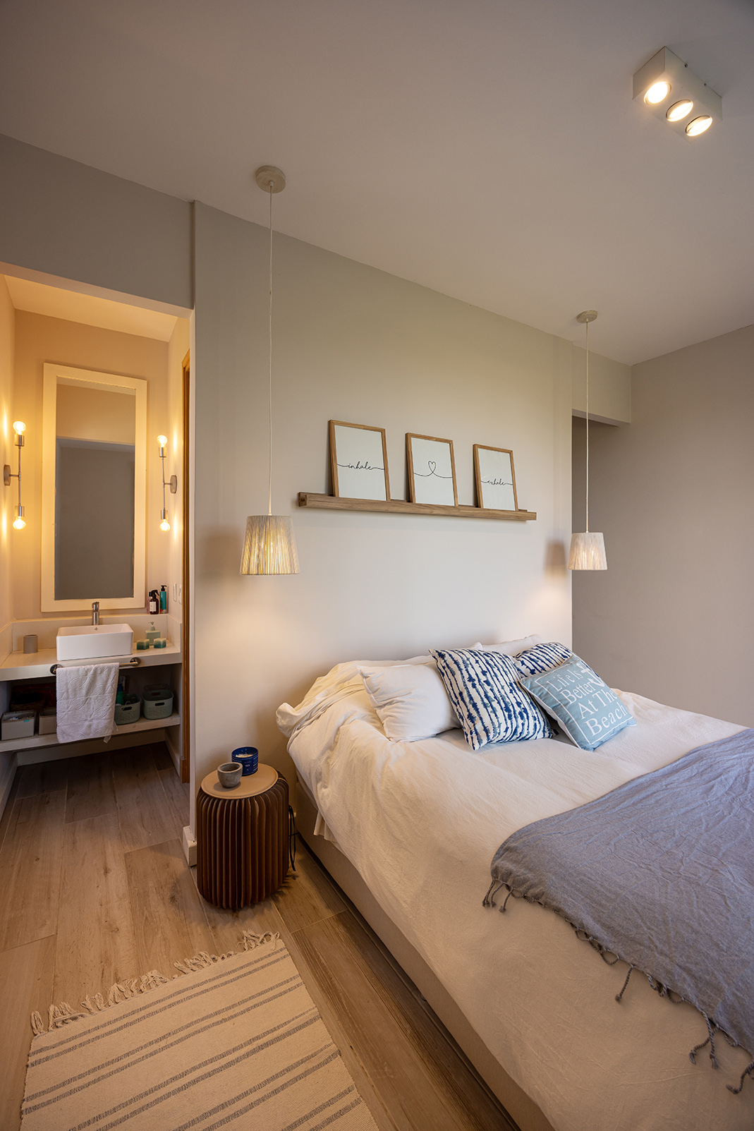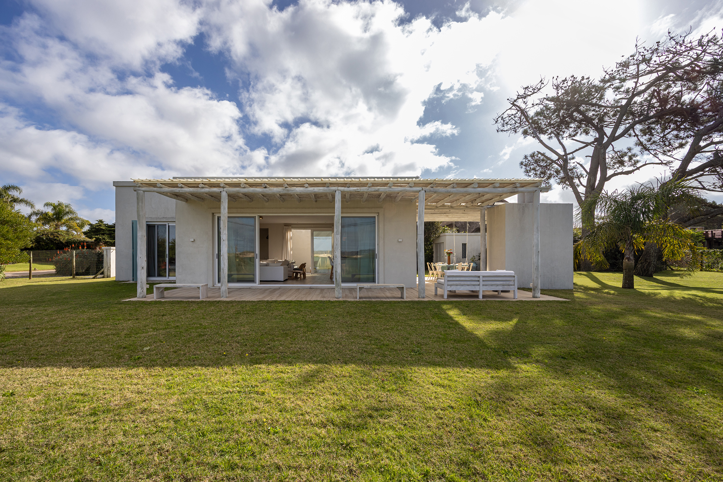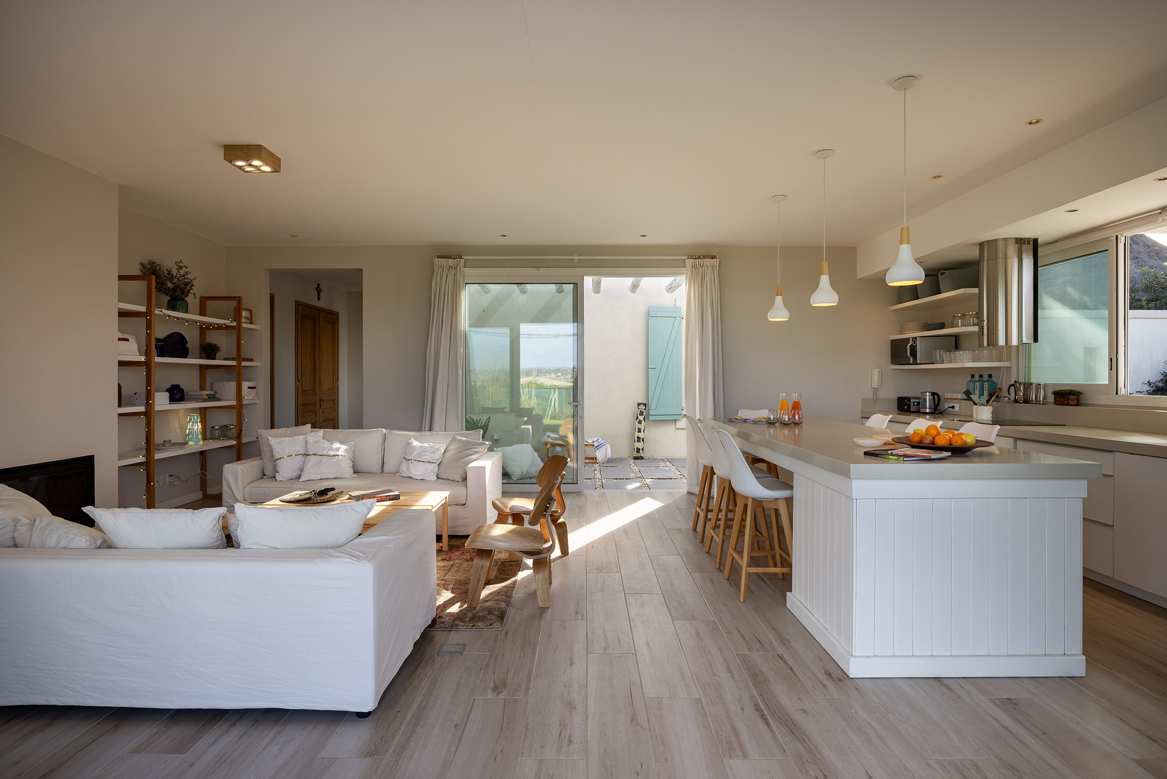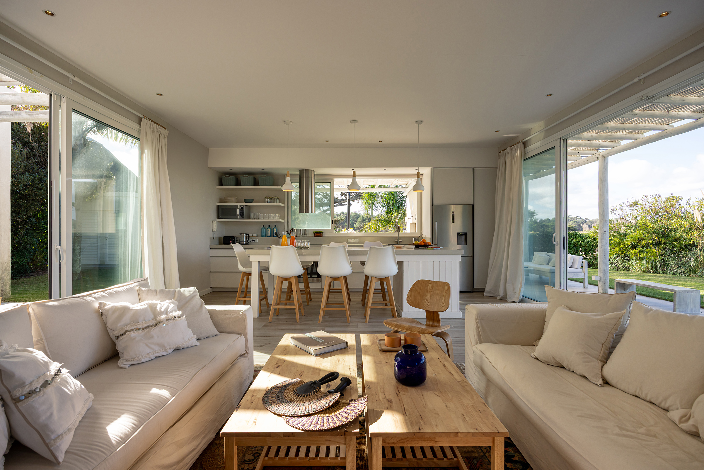 No todas las casas se construyen sobre tierra. Algunas, las menos, se construyen sobre una idea. Y esta, enclavada en un terreno en segunda línea frente al mar, nació de una de esas ideas simples y luminosas que solo los veraneantes auténticos entienden: habitar con sencillez un lugar mágico. En esa curva suave que hace la costa, donde la mirada siempre encuentra al Este y, más allá, a la silueta apacible de Punta Ballena, una familia quiso levantar su refugio estival. De una sola planta, como esas arquitecturas del Mediterráneo que parecen descansar sobre el suelo y no imponerse a él. Una casa en forma de “H”, aunque sus brazos fueran desiguales, como si la planta misma respetara la casualidad feliz del terreno. En el centro, el hall: un conector sobrio, macizo, sin alardes. A un lado, el estar y la cocina-comedor integrados, junto a una suite que mira hacia Punta Ballena. Al otro, dos dormitorios más contenidos, que comparten un baño compartimentado.