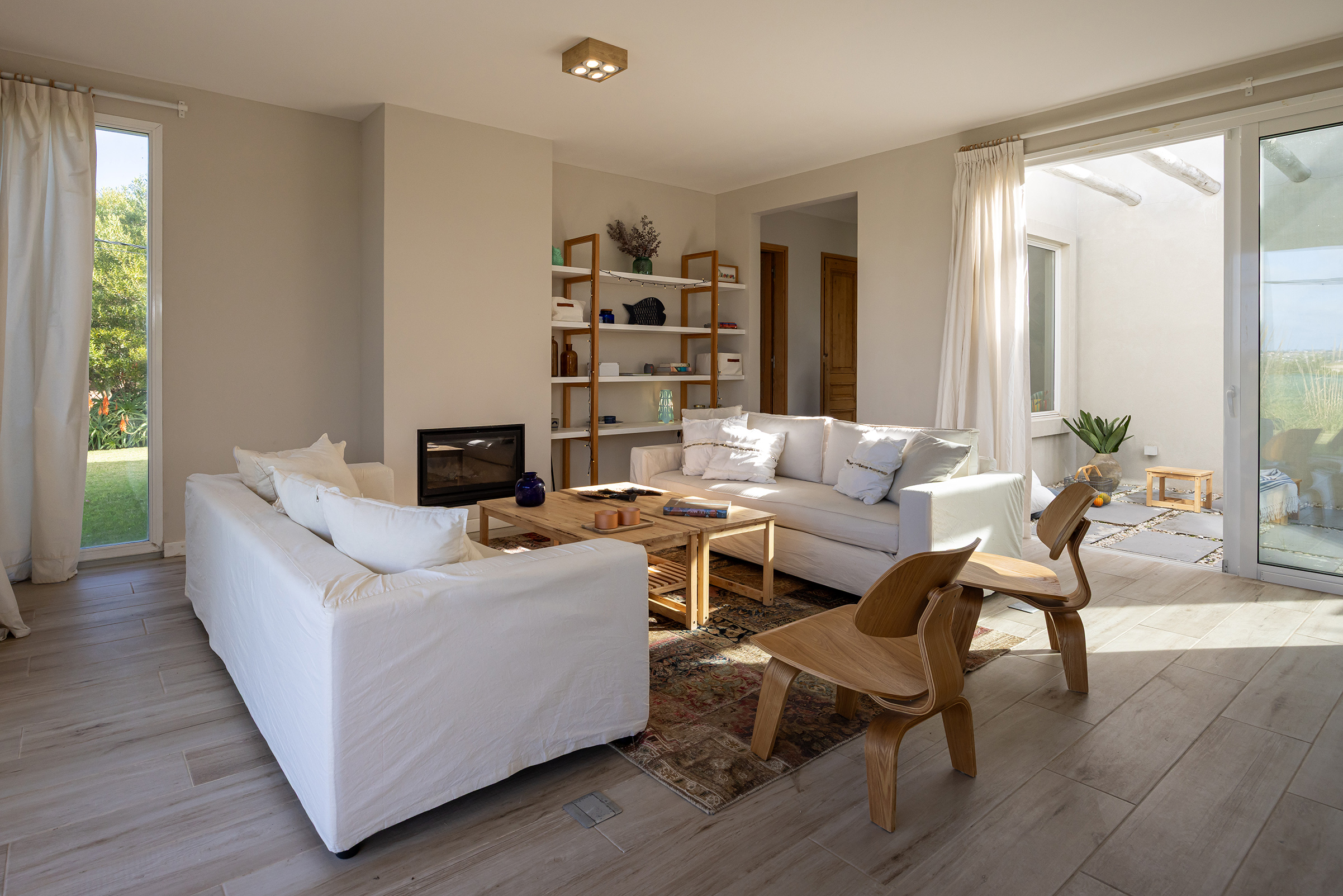 La casa se posa sobre el terreno con naturalidad. Ocupa apenas la mitad del padrón, lo que permite que el jardín —ese otro protagonista— despliegue su lenguaje. Al Norte, entre pinos marítimos preservados, el espacio se convierte en claro, en sombra, en respiro. En la esquina misma, un fire pit marca el centro invisible de las noches estrelladas: allí donde la familia, y quizás los amigos, comparten el fuego lento y la conversación libre. El cerco con sus flores anaranjadas no solo protege la intimidad, sino que embellece sin interrumpir las vistas.