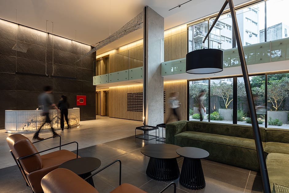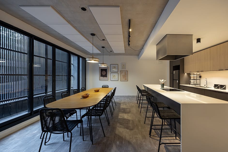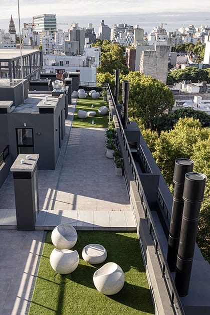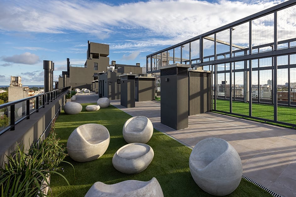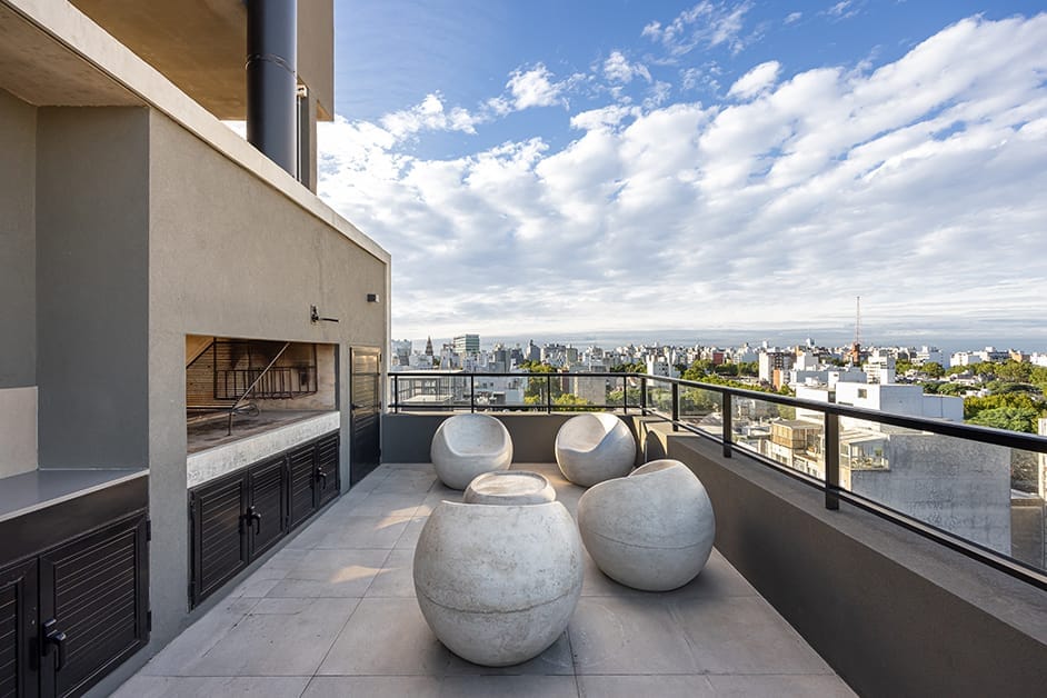 El diseño lineal de las fachadas logra aligerar la carga de un volumen realmente importante que abraza la esquina y se prolonga sobre la calle Jackson e incorpora un patio interno que habilita contra fachadas que reciben luz natural y un conjunto de amenities que ocupan mil doscientos metros cuadrados y llaman la atención por su composición: piscina, gimnasio, espacios gourmet comunes, lavadero, barbacoas abiertas y cerradas y servicio de portería las veinticuatro horas del día, todos los días.