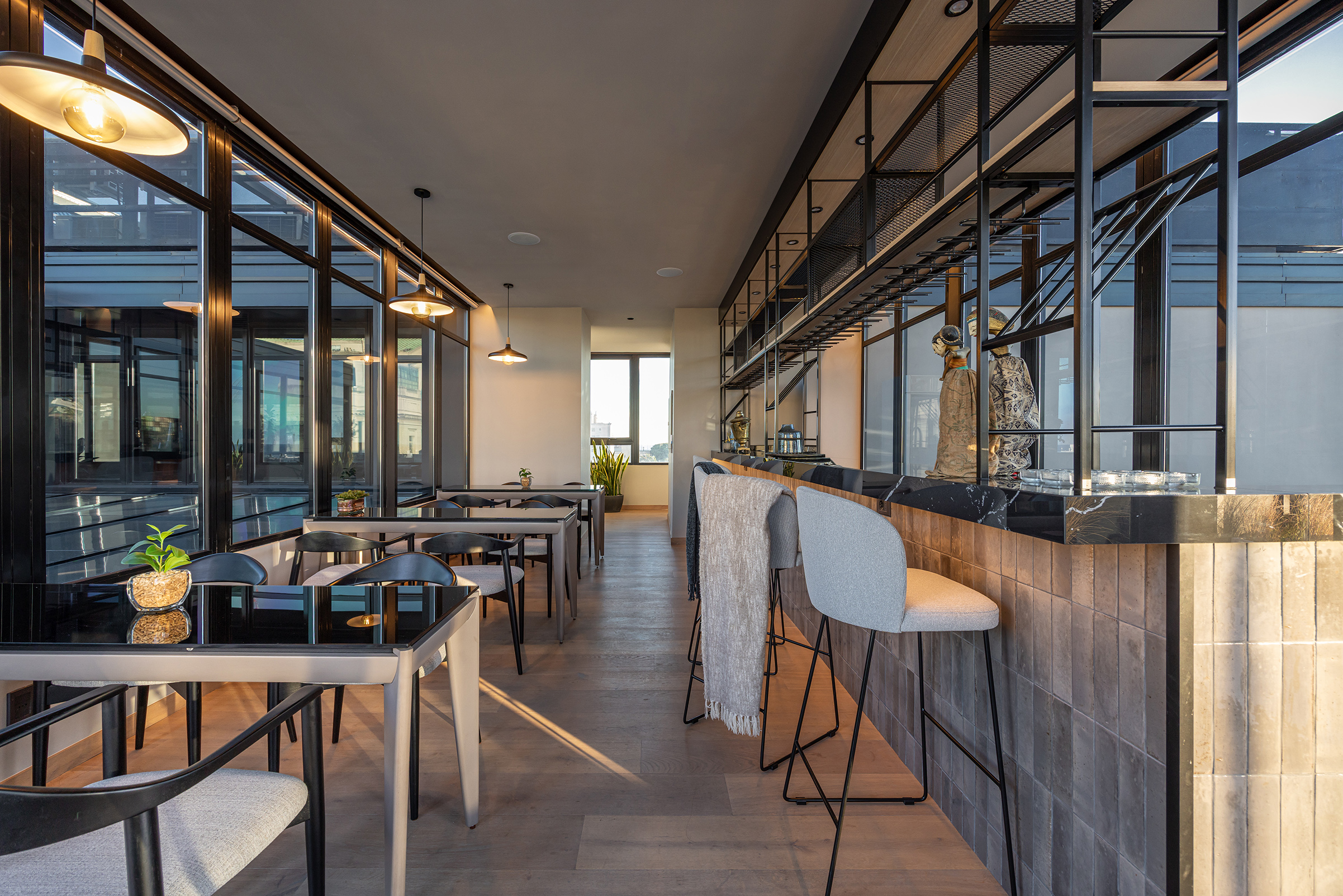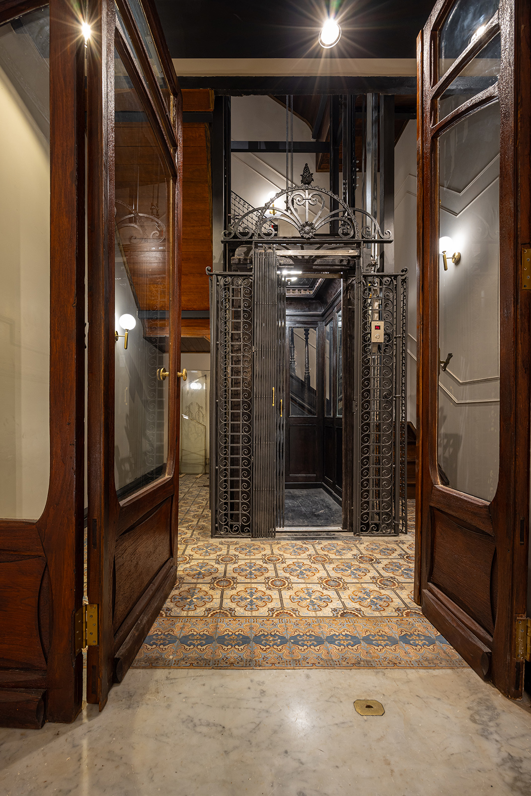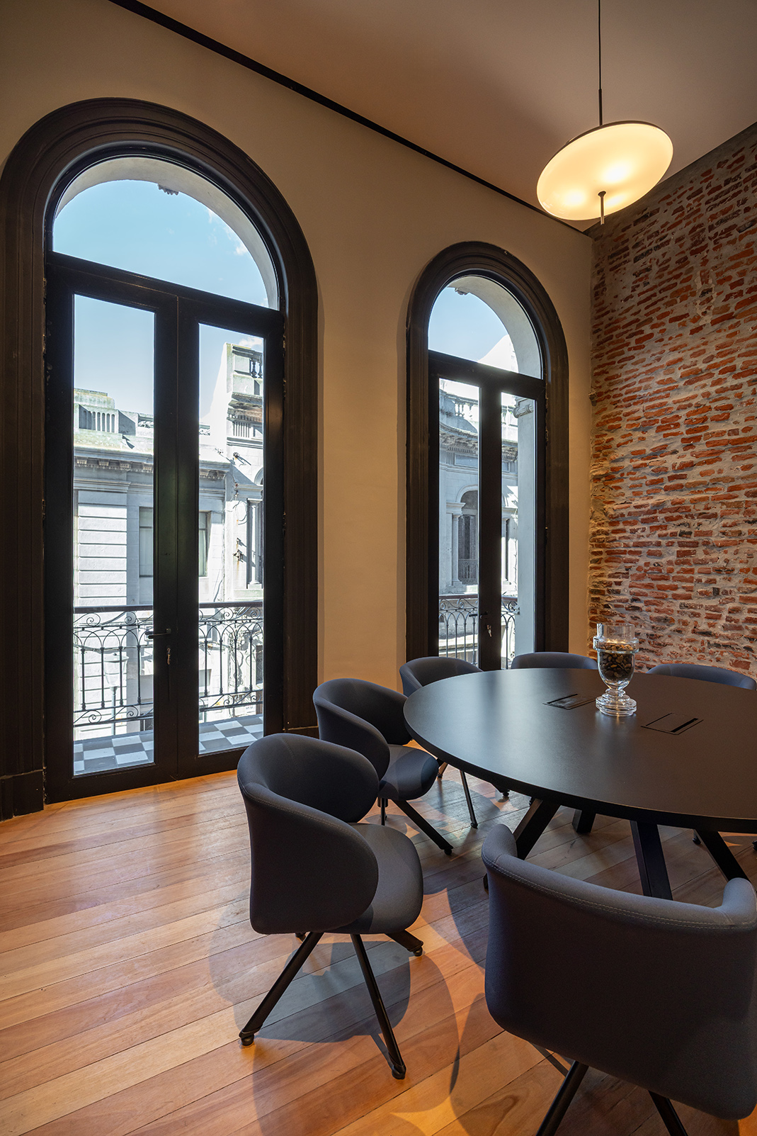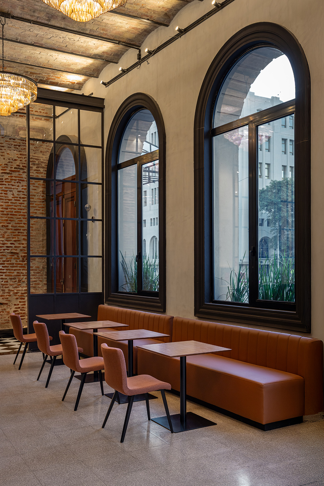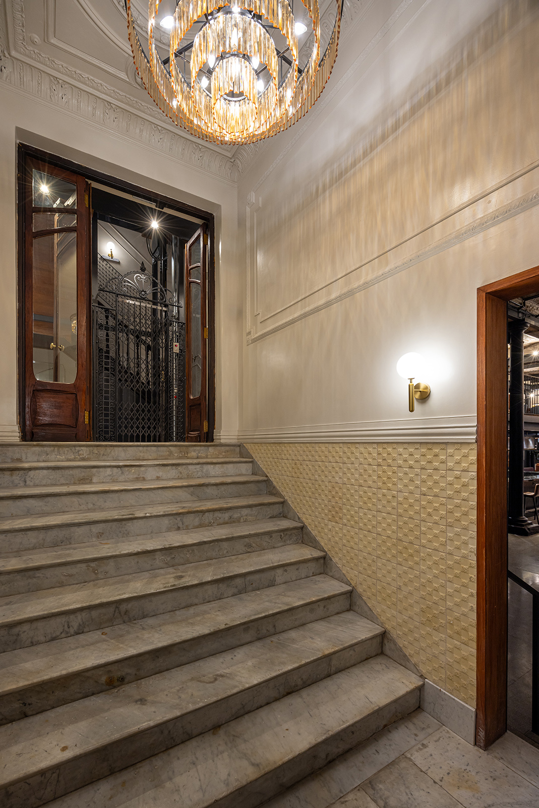 La vieja escalinata de mármol, el ascensor de hierro y madera, la estructura oculta bajo capas de parches y reformas, todo fue rescatado con una mezcla de precisión técnica y fervor casi religioso. Como quien, al reencontrar una carta de amor olvidada, decide no solo leerla, sino contestarla. El programa —restaurante, cowork, hotel, cafetería, salón de eventos— no fue un simple relleno funcional. Fue una narrativa. Cada espacio habla con el otro, se vincula, se prolonga hacia la bahía, hacia el puerto, hacia la ciudad que lo rodea y que empieza a despertar. La sala de eventos, cafetería y terraza que se construyeron sobre la azotea reversionan a los viejos miradores en clave contemporánea. La demolición de los sectores ruinosos no fue destrucción, sino respiración: se abrieron patios, se dejó entrar la luz. En vez de disimular las huellas del tiempo, se las integró con orgullo: muros pelados que muestran la cerámica, bovedillas a la vista, pisos de pinotea que crujen como si contaran historias. Todo está ahí, como en una novela bien escrita, donde cada párrafo tiene sentido y cada omisión es elocuente. Y, sin embargo, quizás lo más audaz fue lo menos ruidoso: esa mansarda que durante años había desaparecido — literalmente borrada del paisaje urbano— y que ahora reaparece, no como réplica, sino como interpretación contemporánea. Una coronación sobria y elegante que devuelve al edificio sus proporciones originales y, con ellas, su carácter.