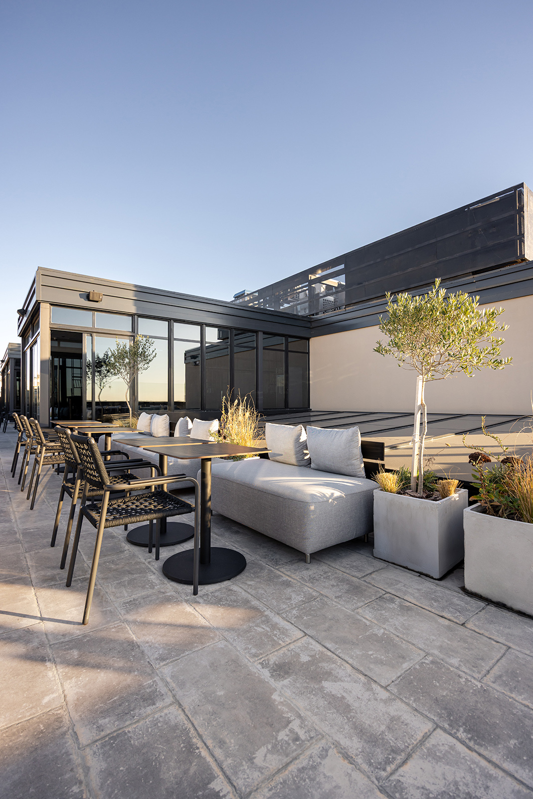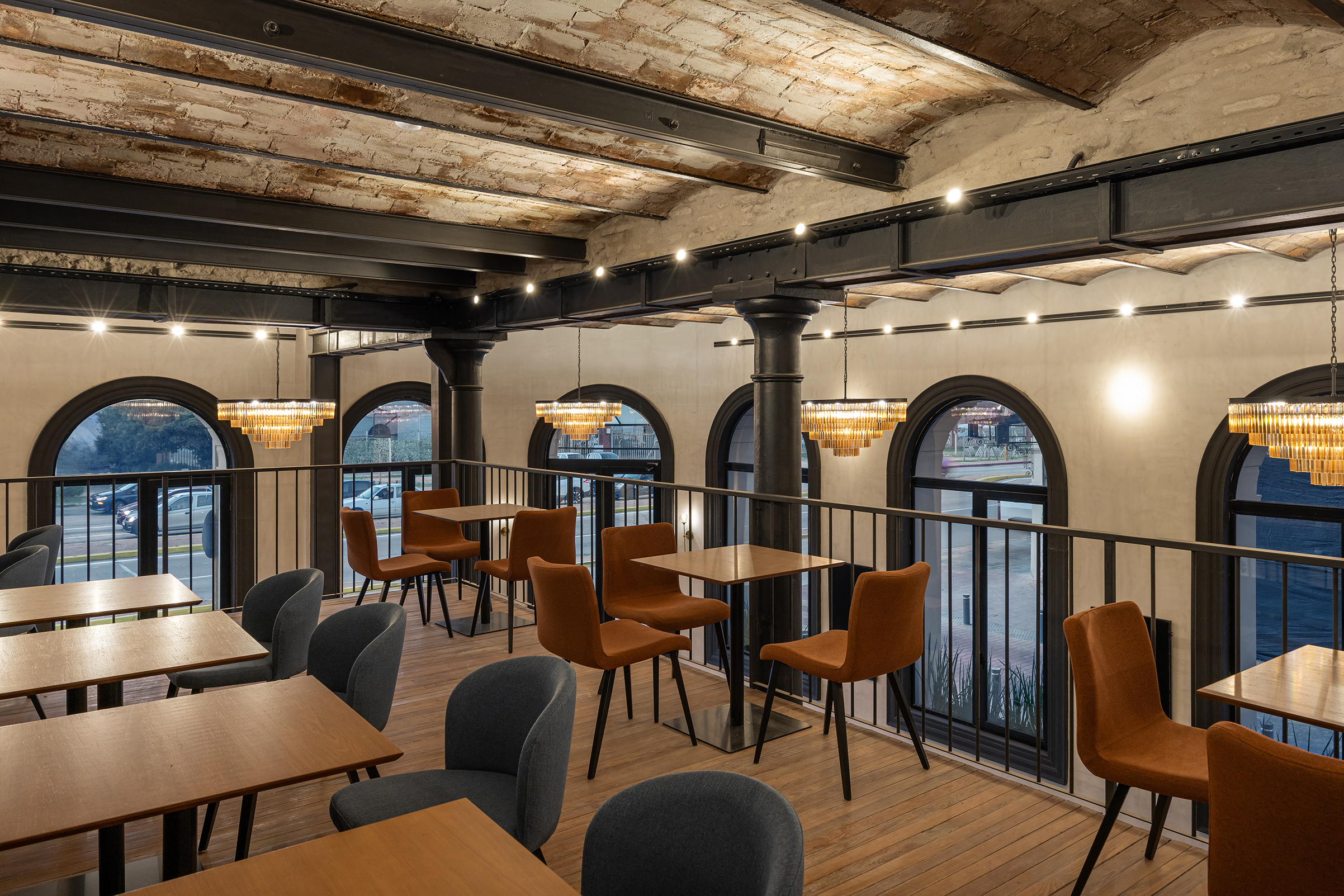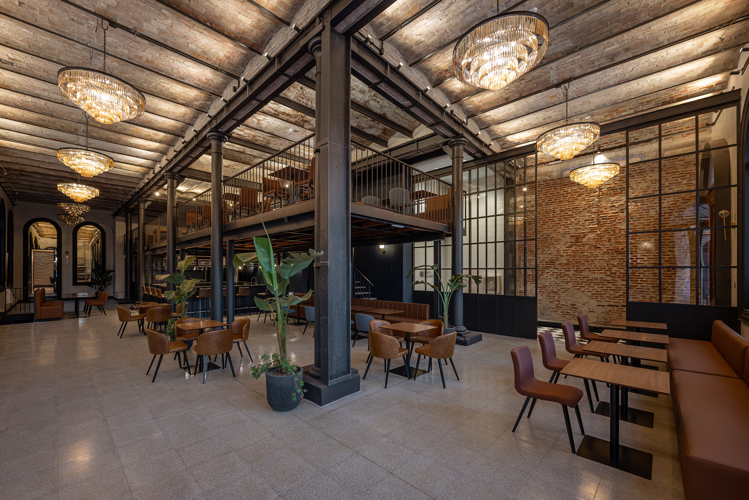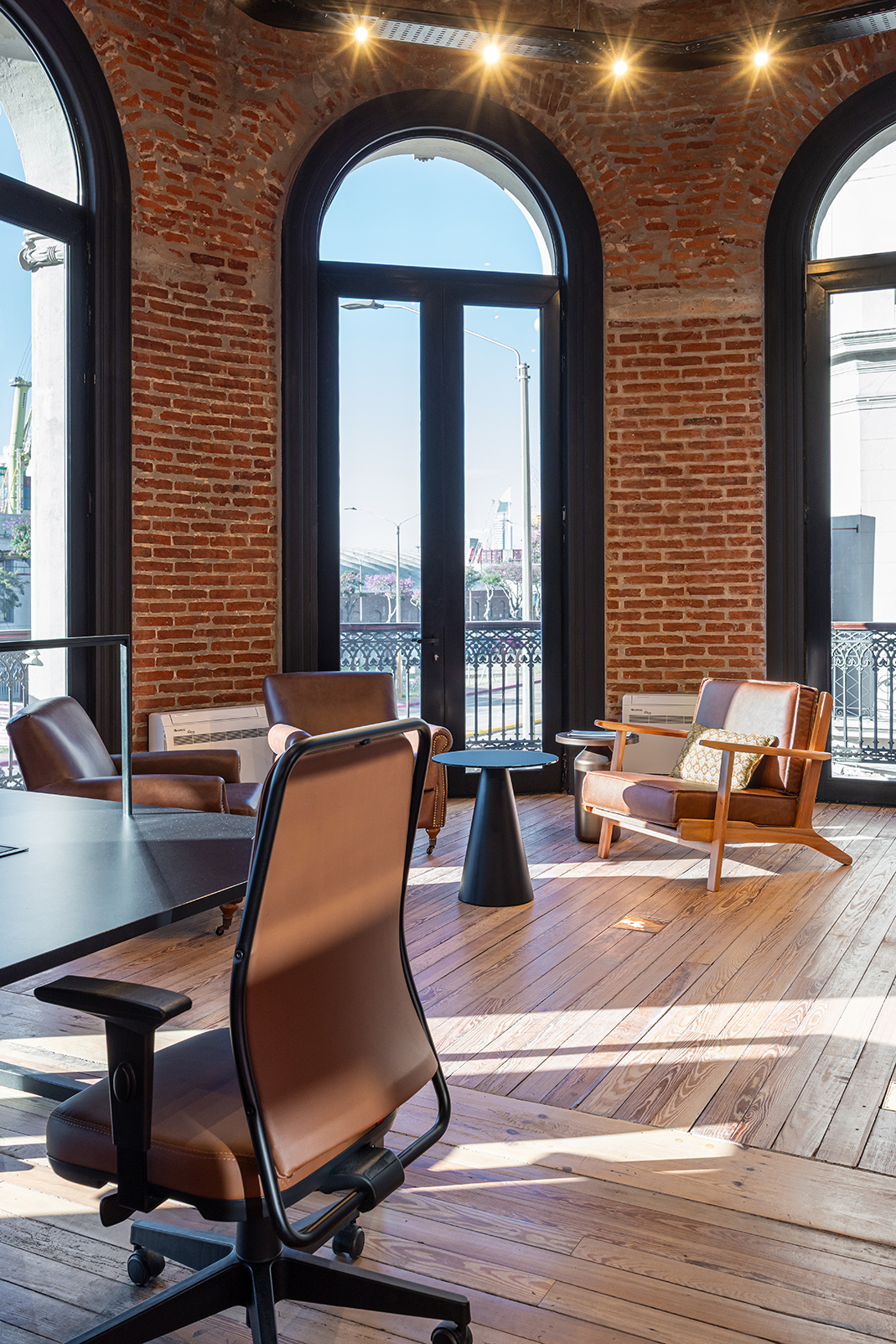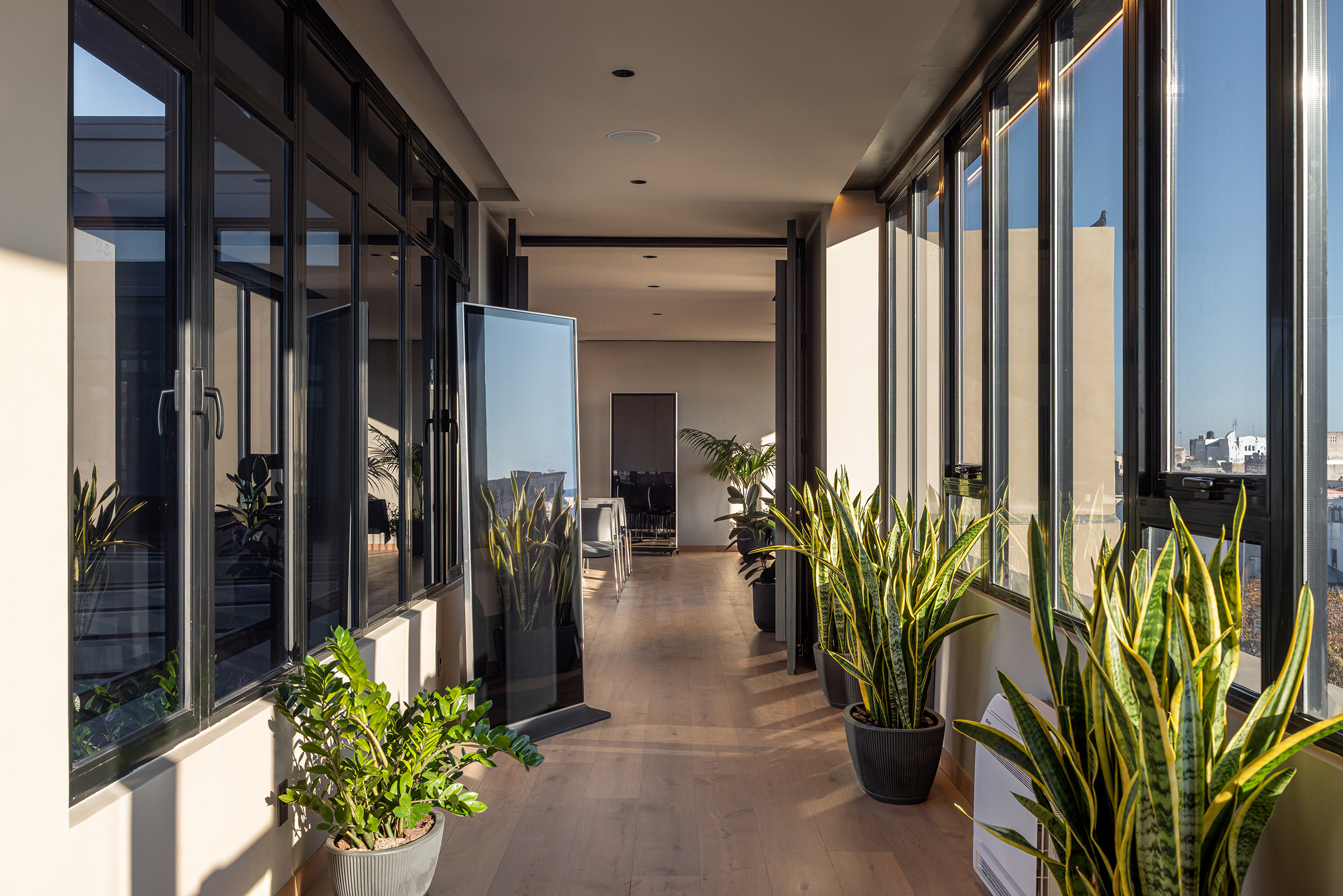 La vieja escalinata de mármol, el ascensor de hierro y madera, la estructura oculta bajo capas de parches y reformas, todo fue rescatado con una mezcla de precisión técnica y fervor casi religioso. Como quien, al reencontrar una carta de amor olvidada, decide no solo leerla, sino contestarla. El programa —restaurante, cowork, hotel, cafetería, salón de eventos— no fue un simple relleno funcional. Fue una narrativa. Cada espacio habla con el otro, se vincula, se prolonga hacia la bahía, hacia el puerto, hacia la ciudad que lo rodea y que empieza a despertar. La sala de eventos, cafetería y terraza que se construyeron sobre la azotea reversionan a los viejos miradores en clave contemporánea. La demolición de los sectores ruinosos no fue destrucción, sino respiración: se abrieron patios, se dejó entrar la luz. En vez de disimular las huellas del tiempo, se las integró con orgullo: muros pelados que muestran la cerámica, bovedillas a la vista, pisos de pinotea que crujen como si contaran historias. Todo está ahí, como en una novela bien escrita, donde cada párrafo tiene sentido y cada omisión es elocuente. Y, sin embargo, quizás lo más audaz fue lo menos ruidoso: esa mansarda que durante años había desaparecido — literalmente borrada del paisaje urbano— y que ahora reaparece, no como réplica, sino como interpretación contemporánea. Una coronación sobria y elegante que devuelve al edificio sus proporciones originales y, con ellas, su carácter.