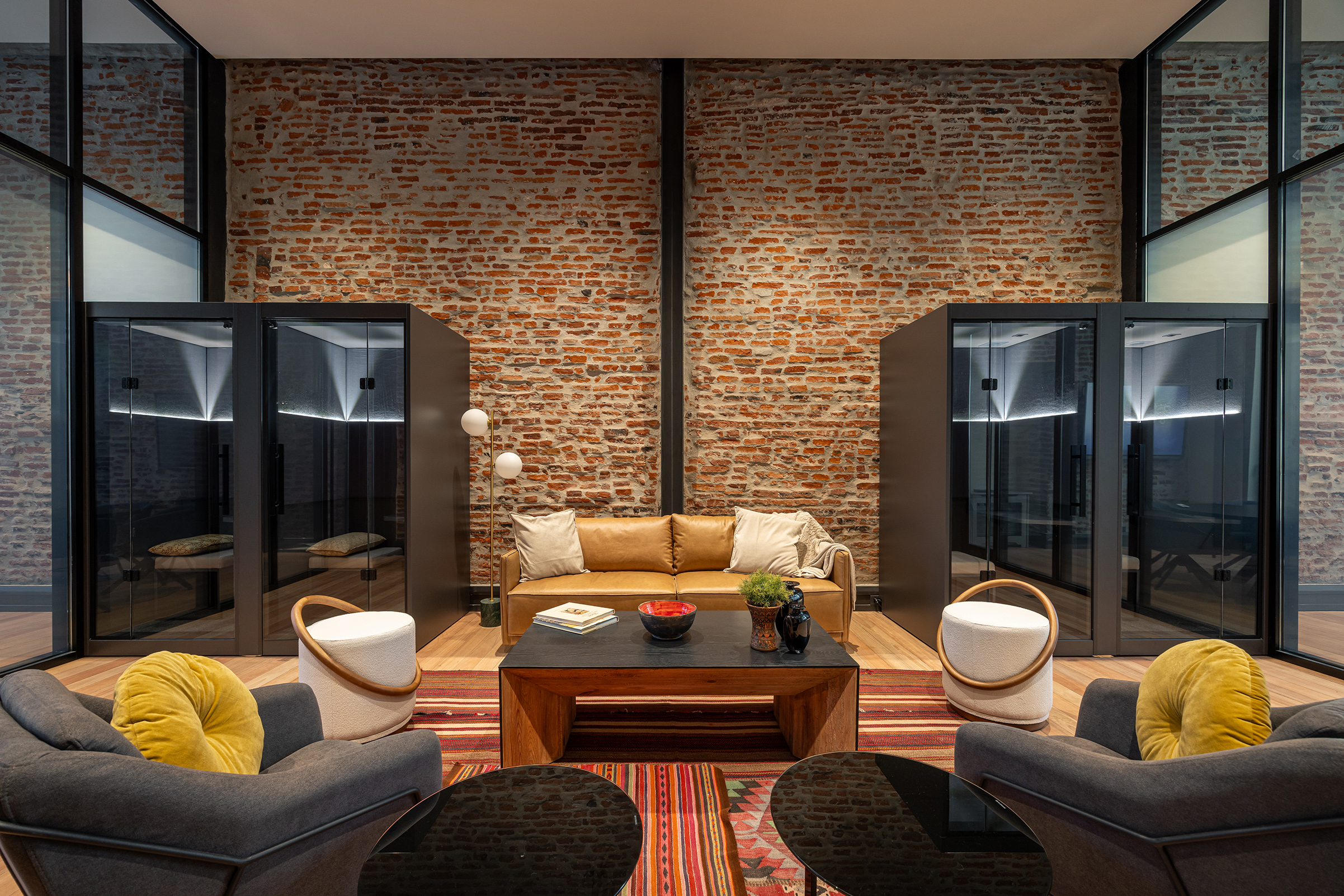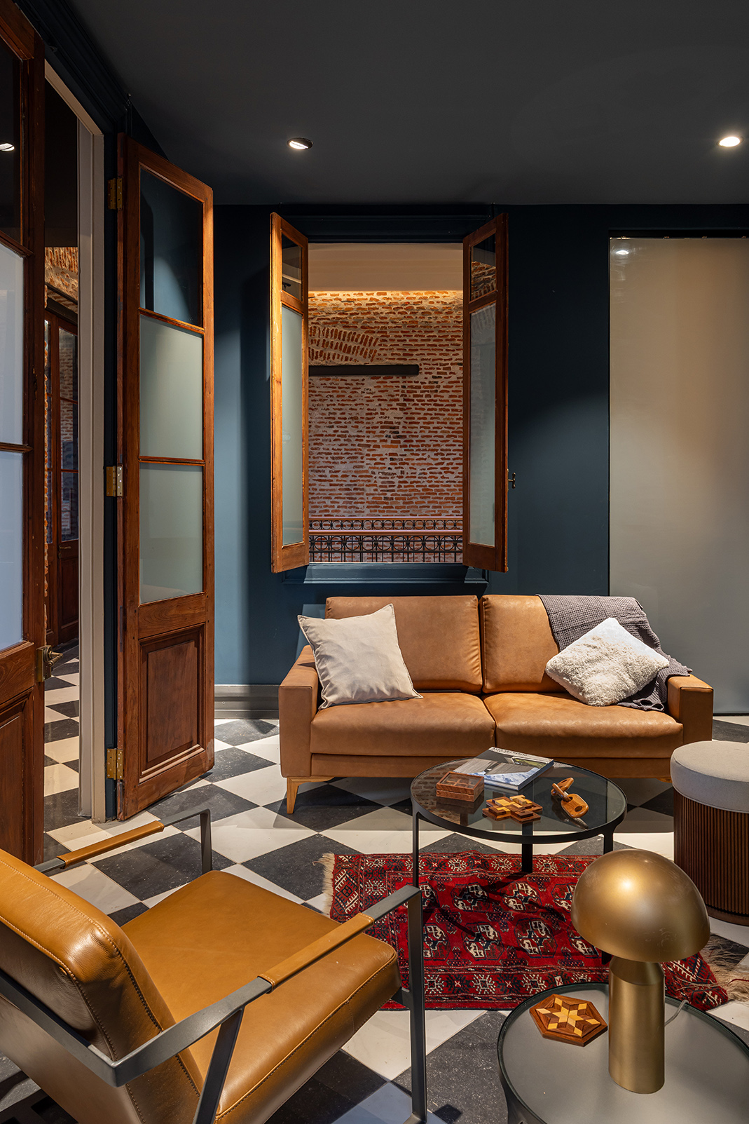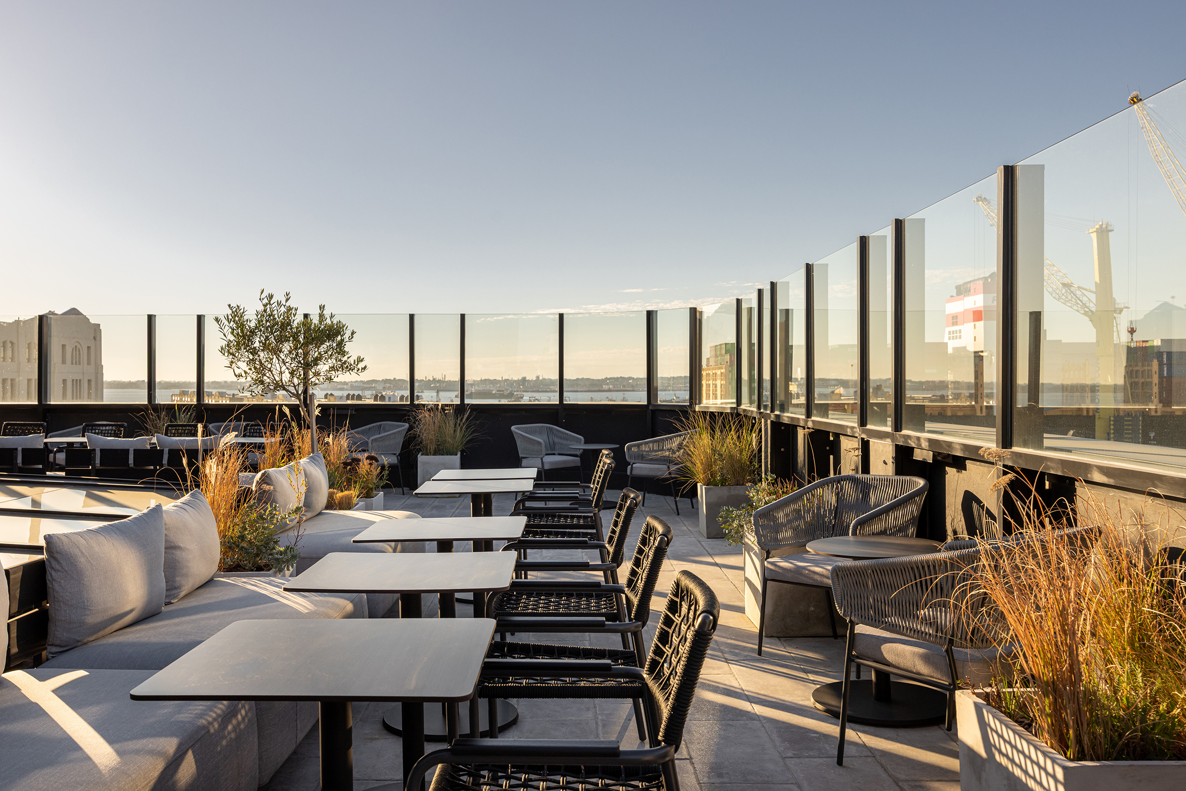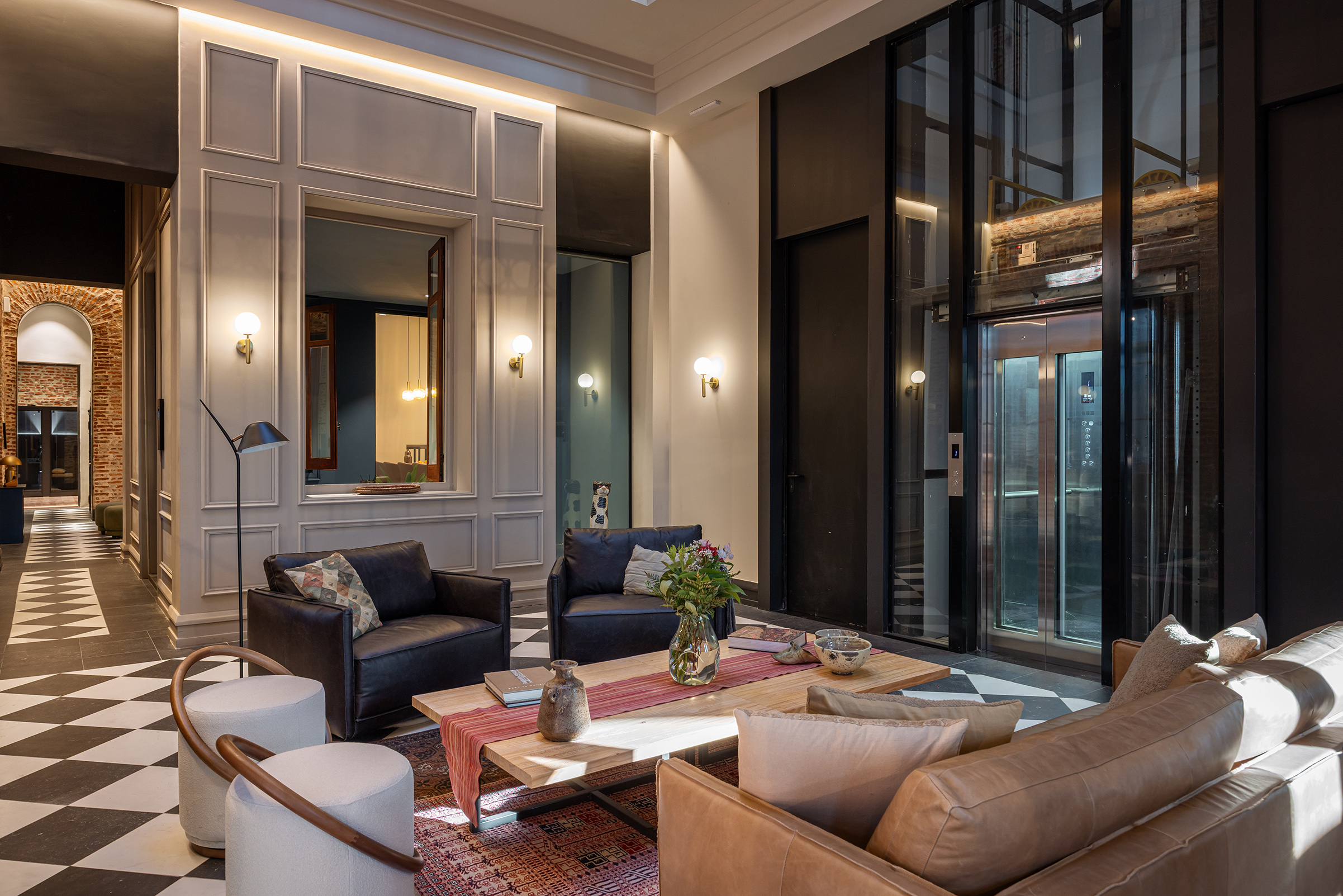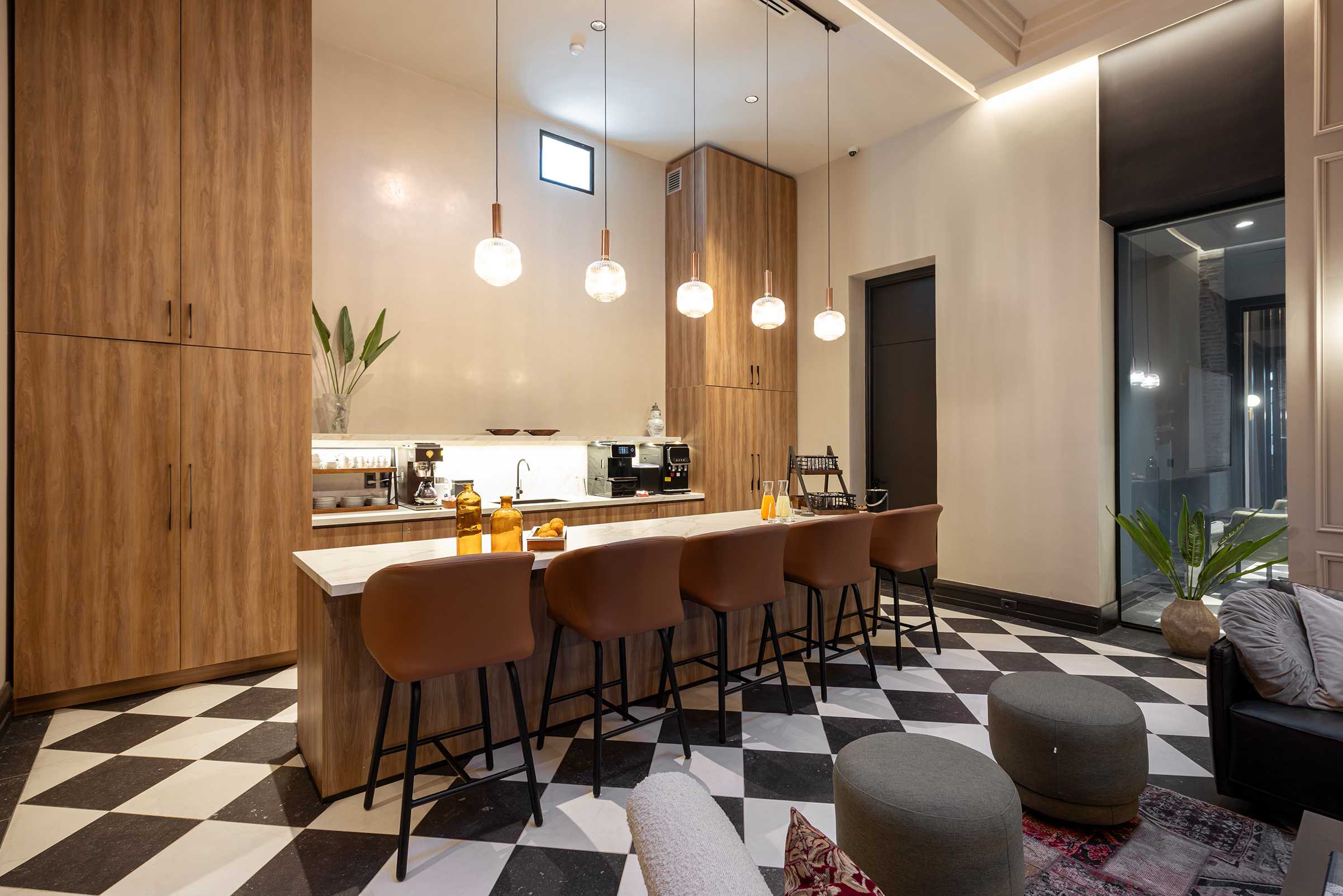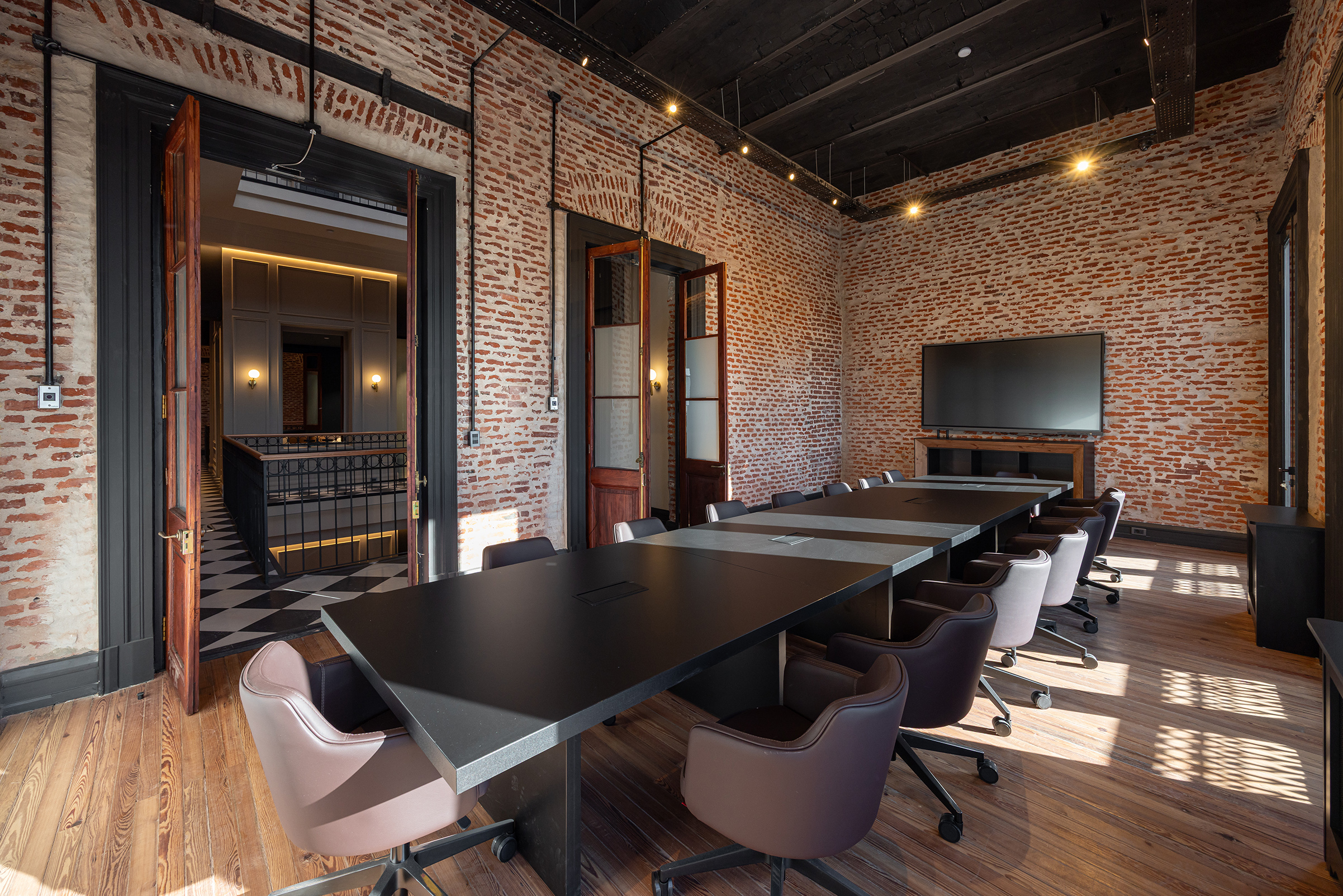 La vieja escalinata de mármol, el ascensor de hierro y madera, la estructura oculta bajo capas de parches y reformas, todo fue rescatado con una mezcla de precisión técnica y fervor casi religioso. Como quien, al reencontrar una carta de amor olvidada, decide no solo leerla, sino contestarla. El programa —restaurante, cowork, hotel, cafetería, salón de eventos— no fue un simple relleno funcional. Fue una narrativa. Cada espacio habla con el otro, se vincula, se prolonga hacia la bahía, hacia el puerto, hacia la ciudad que lo rodea y que empieza a despertar. La sala de eventos, cafetería y terraza que se construyeron sobre la azotea reversionan a los viejos miradores en clave contemporánea. La demolición de los sectores ruinosos no fue destrucción, sino respiración: se abrieron patios, se dejó entrar la luz. En vez de disimular las huellas del tiempo, se las integró con orgullo: muros pelados que muestran la cerámica, bovedillas a la vista, pisos de pinotea que crujen como si contaran historias. Todo está ahí, como en una novela bien escrita, donde cada párrafo tiene sentido y cada omisión es elocuente. Y, sin embargo, quizás lo más audaz fue lo menos ruidoso: esa mansarda que durante años había desaparecido — literalmente borrada del paisaje urbano— y que ahora reaparece, no como réplica, sino como interpretación contemporánea. Una coronación sobria y elegante que devuelve al edificio sus proporciones originales y, con ellas, su carácter.