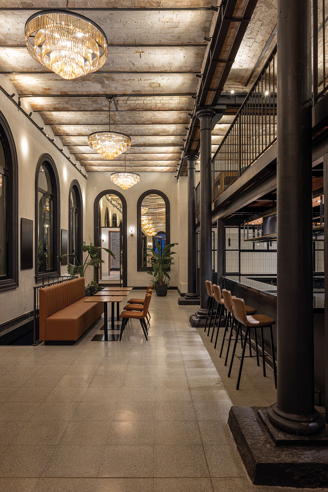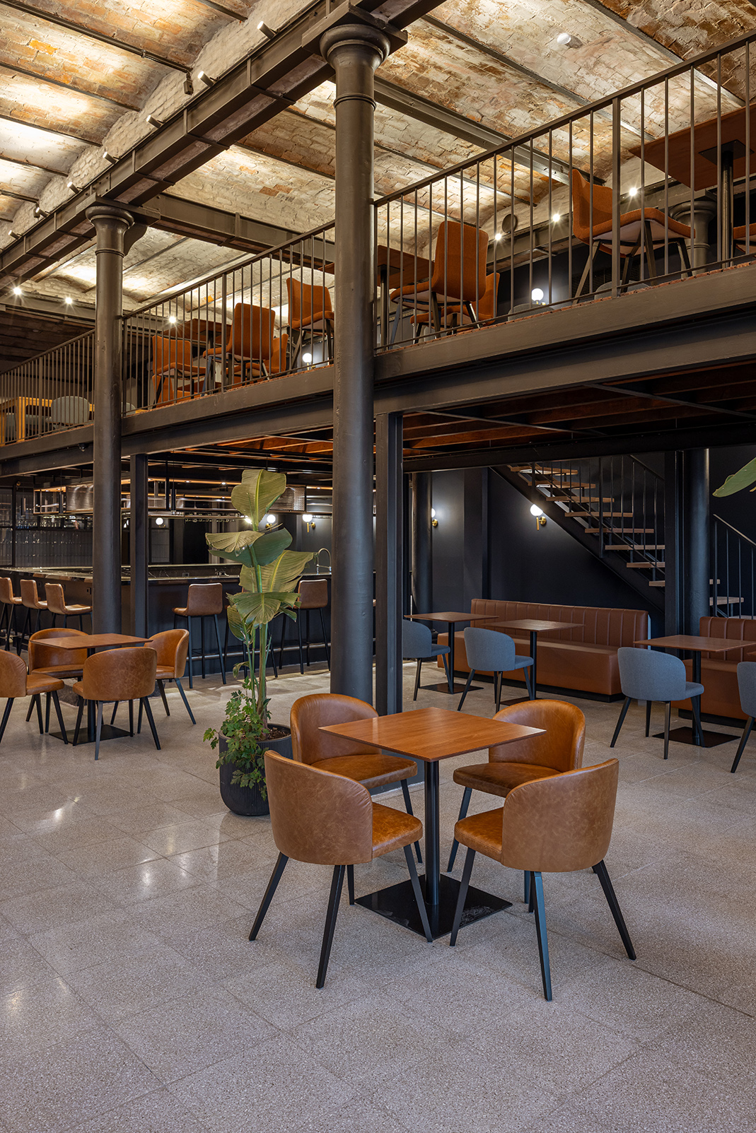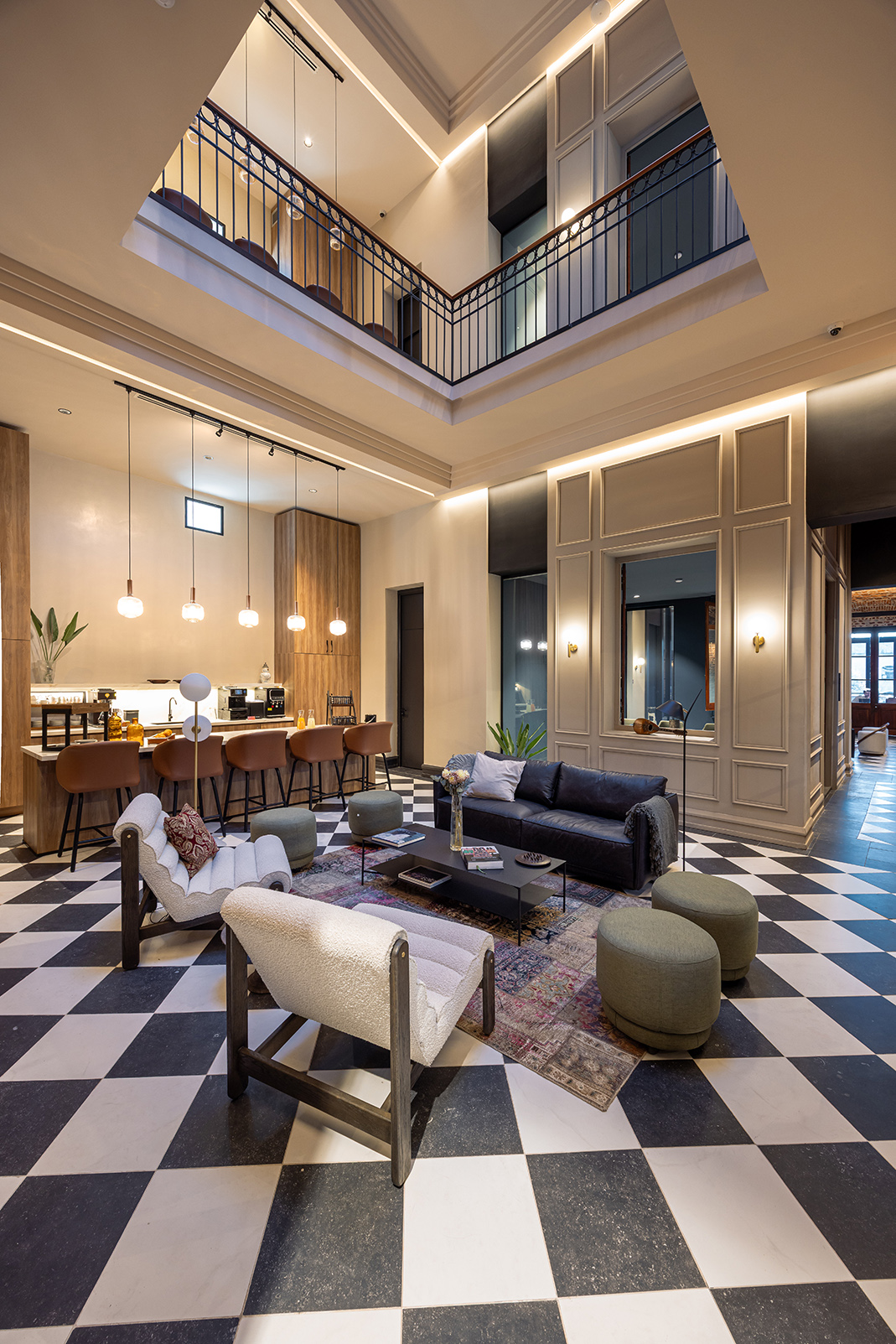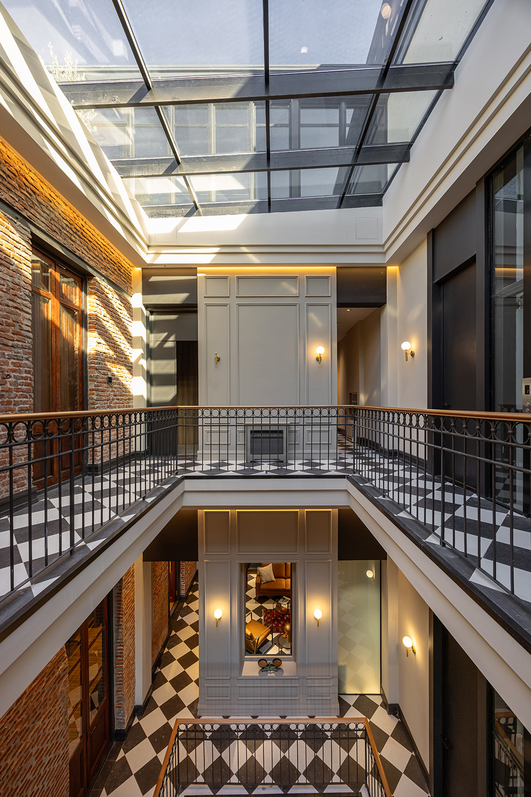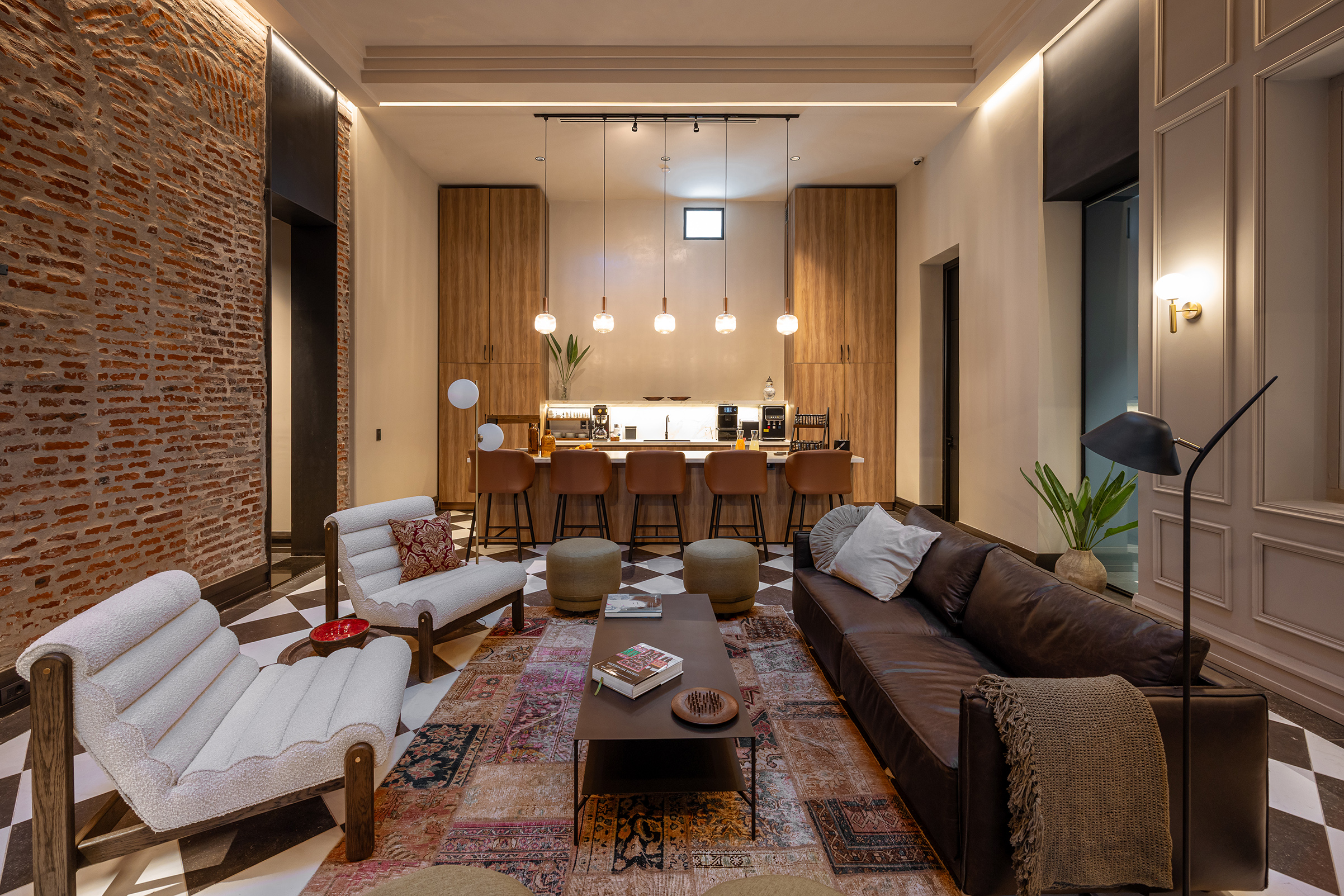 La vieja escalinata de mármol, el ascensor de hierro y madera, la estructura oculta bajo capas de parches y reformas, todo fue rescatado con una mezcla de precisión técnica y fervor casi religioso. Como quien, al reencontrar una carta de amor olvidada, decide no solo leerla, sino contestarla. El programa —restaurante, cowork, hotel, cafetería, salón de eventos— no fue un simple relleno funcional. Fue una narrativa. Cada espacio habla con el otro, se vincula, se prolonga hacia la bahía, hacia el puerto, hacia la ciudad que lo rodea y que empieza a despertar. La sala de eventos, cafetería y terraza que se construyeron sobre la azotea reversionan a los viejos miradores en clave contemporánea. La demolición de los sectores ruinosos no fue destrucción, sino respiración: se abrieron patios, se dejó entrar la luz. En vez de disimular las huellas del tiempo, se las integró con orgullo: muros pelados que muestran la cerámica, bovedillas a la vista, pisos de pinotea que crujen como si contaran historias. Todo está ahí, como en una novela bien escrita, donde cada párrafo tiene sentido y cada omisión es elocuente. Y, sin embargo, quizás lo más audaz fue lo menos ruidoso: esa mansarda que durante años había desaparecido — literalmente borrada del paisaje urbano— y que ahora reaparece, no como réplica, sino como interpretación contemporánea. Una coronación sobria y elegante que devuelve al edificio sus proporciones originales y, con ellas, su carácter.