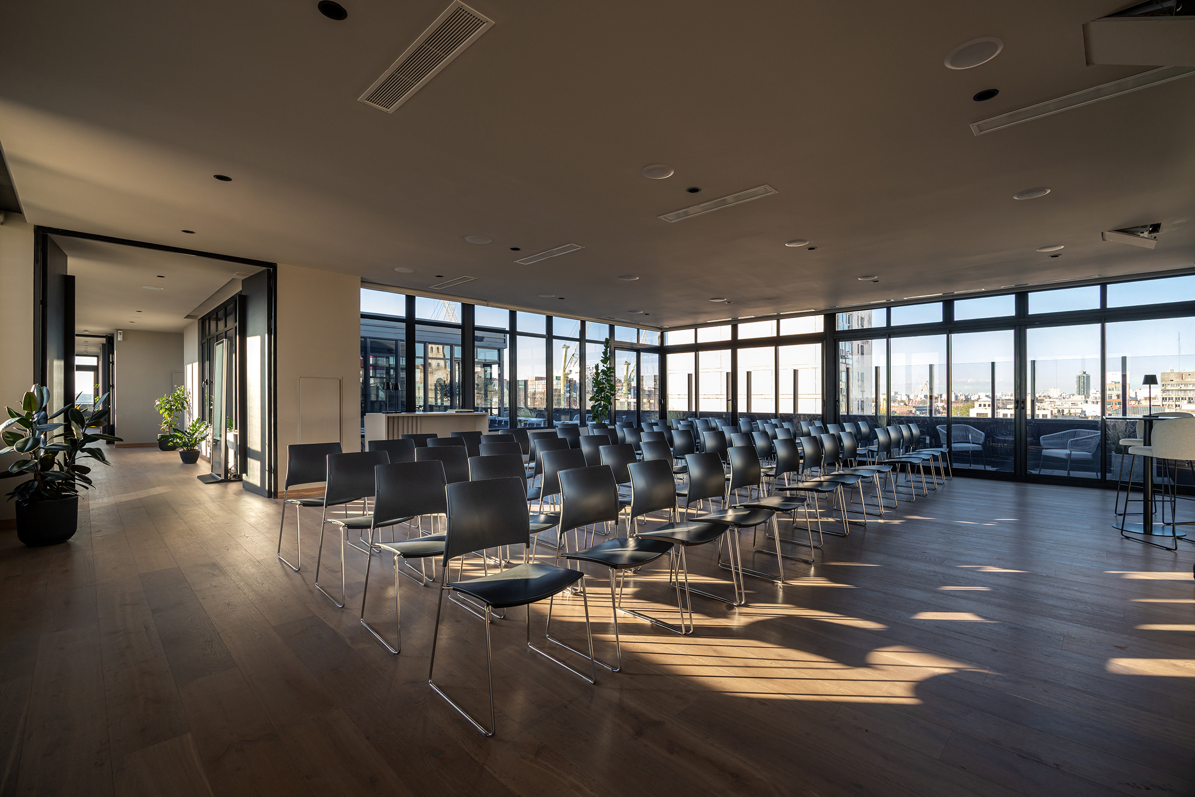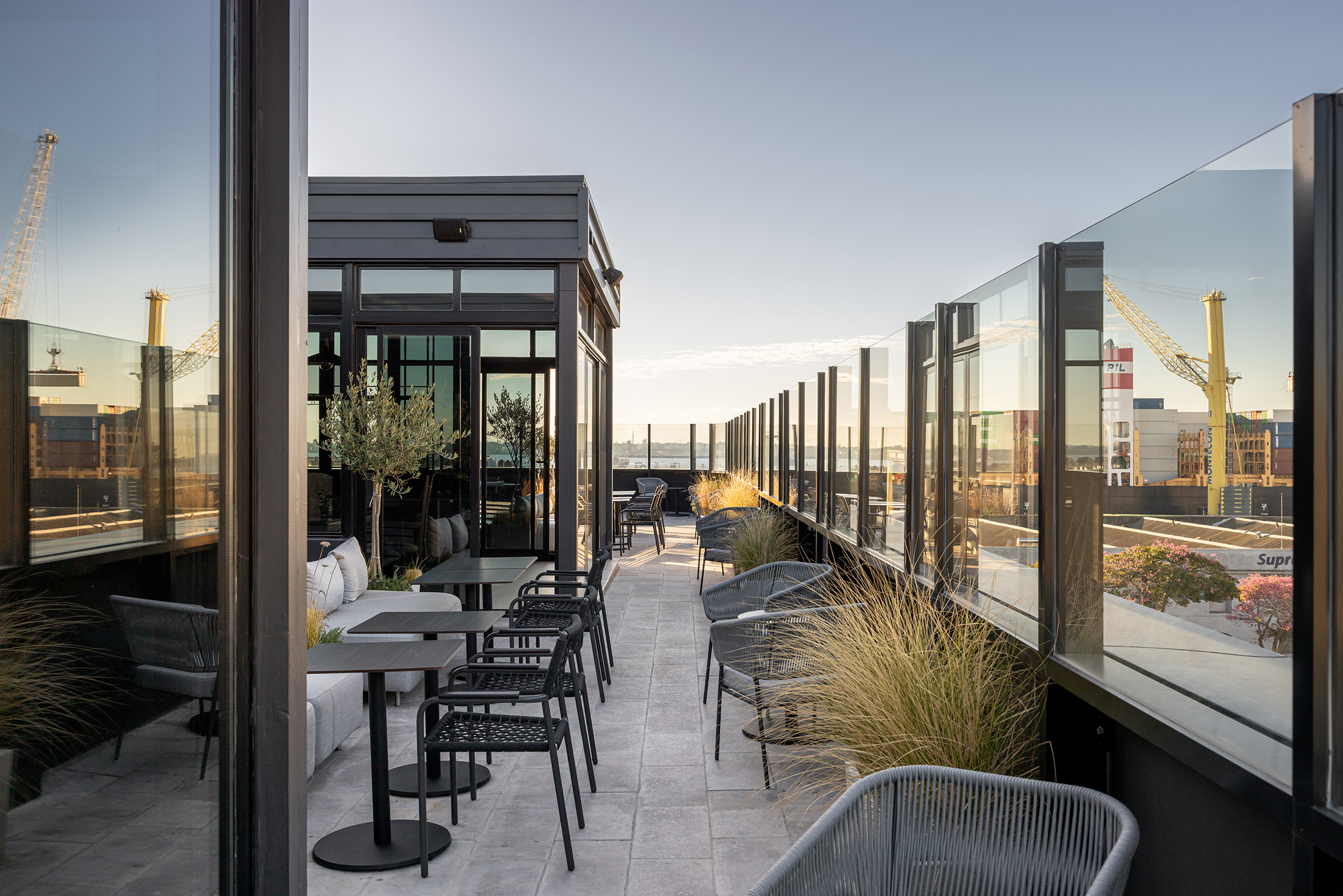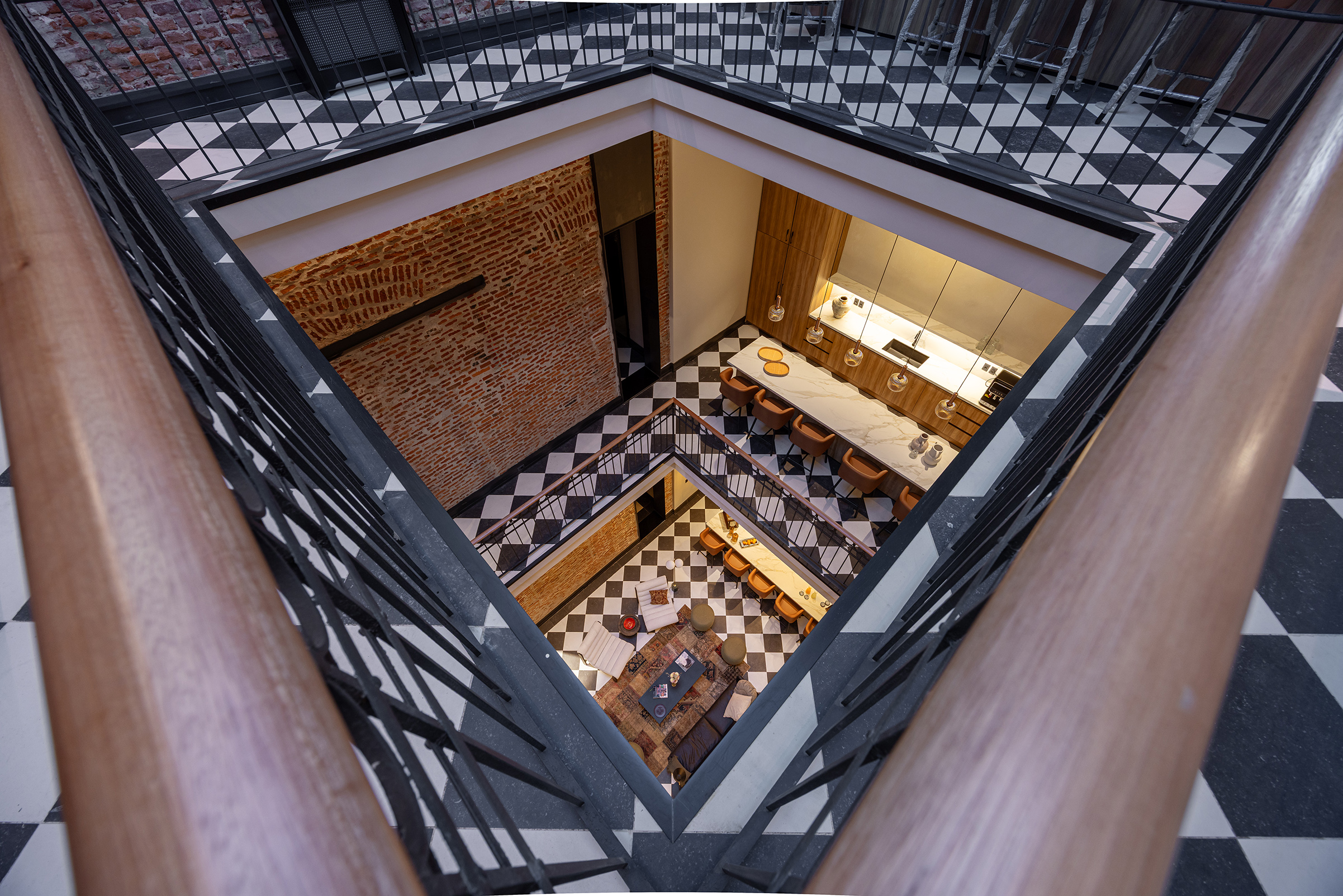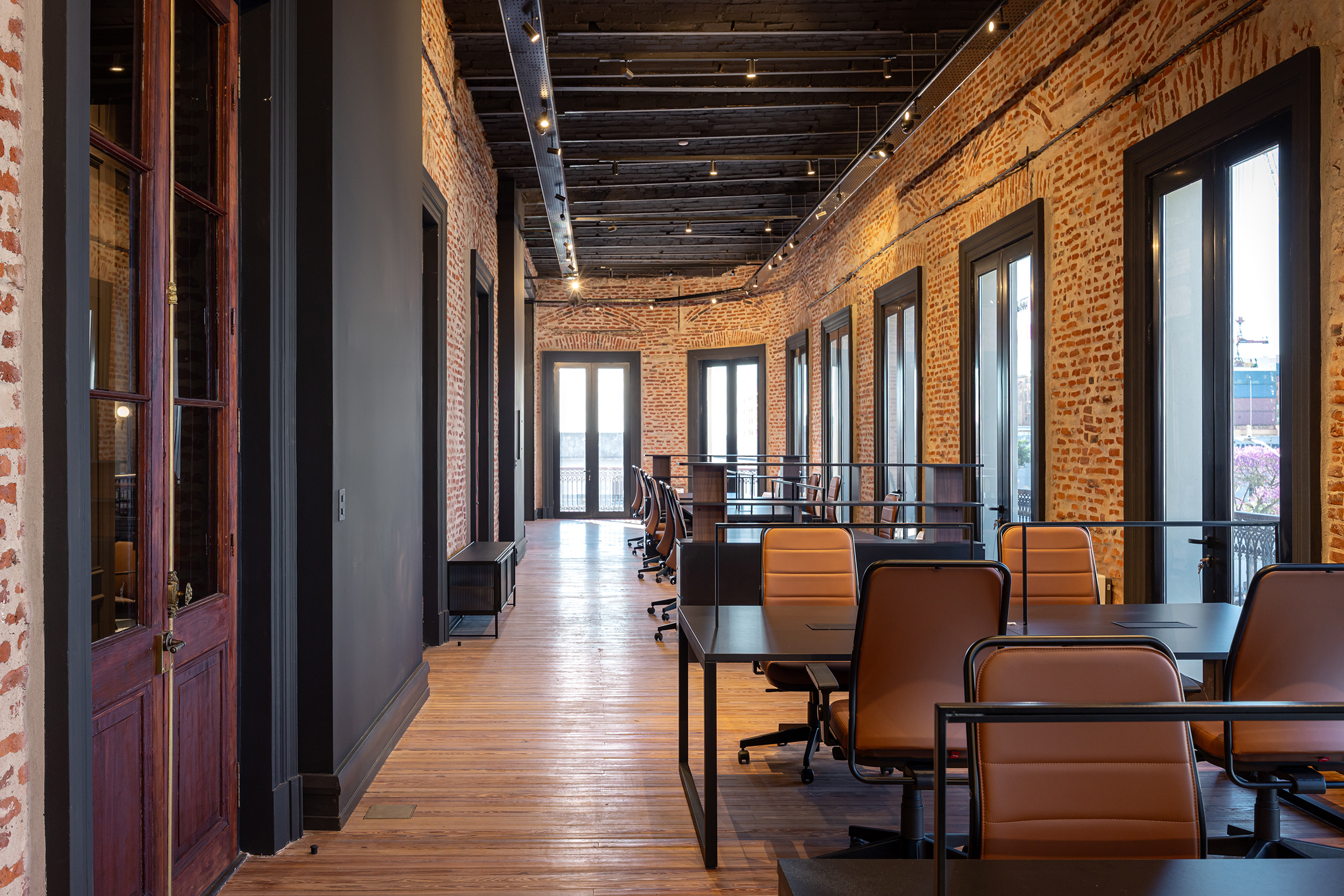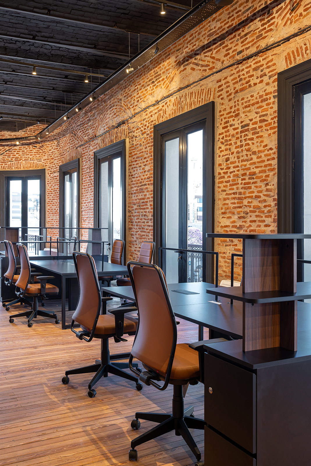 La vieja escalinata de mármol, el ascensor de hierro y madera, la estructura oculta bajo capas de parches y reformas, todo fue rescatado con una mezcla de precisión técnica y fervor casi religioso. Como quien, al reencontrar una carta de amor olvidada, decide no solo leerla, sino contestarla. El programa —restaurante, cowork, hotel, cafetería, salón de eventos— no fue un simple relleno funcional. Fue una narrativa. Cada espacio habla con el otro, se vincula, se prolonga hacia la bahía, hacia el puerto, hacia la ciudad que lo rodea y que empieza a despertar. La sala de eventos, cafetería y terraza que se construyeron sobre la azotea reversionan a los viejos miradores en clave contemporánea. La demolición de los sectores ruinosos no fue destrucción, sino respiración: se abrieron patios, se dejó entrar la luz. En vez de disimular las huellas del tiempo, se las integró con orgullo: muros pelados que muestran la cerámica, bovedillas a la vista, pisos de pinotea que crujen como si contaran historias. Todo está ahí, como en una novela bien escrita, donde cada párrafo tiene sentido y cada omisión es elocuente. Y, sin embargo, quizás lo más audaz fue lo menos ruidoso: esa mansarda que durante años había desaparecido — literalmente borrada del paisaje urbano— y que ahora reaparece, no como réplica, sino como interpretación contemporánea. Una coronación sobria y elegante que devuelve al edificio sus proporciones originales y, con ellas, su carácter.