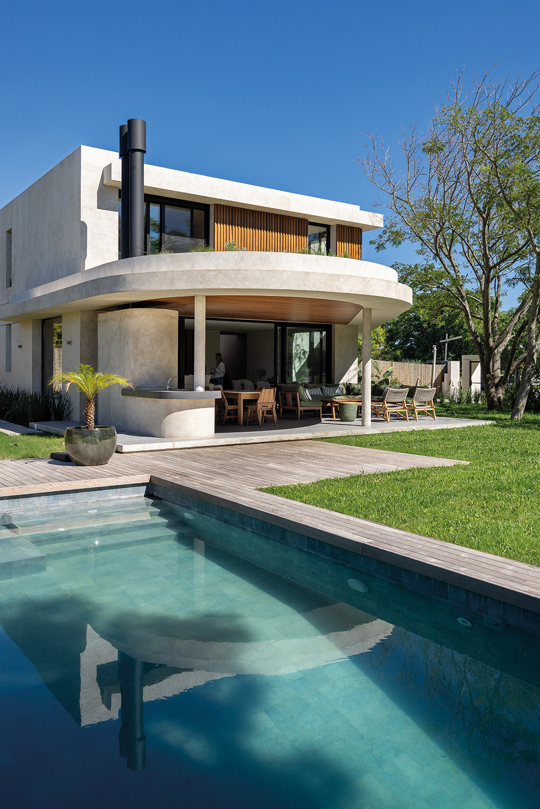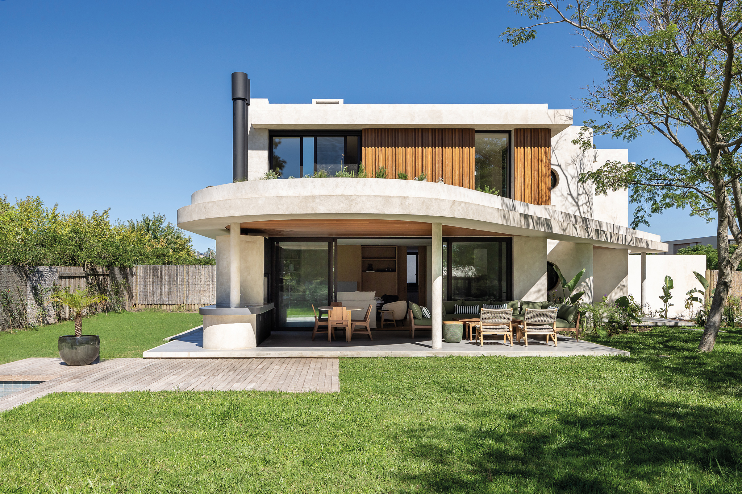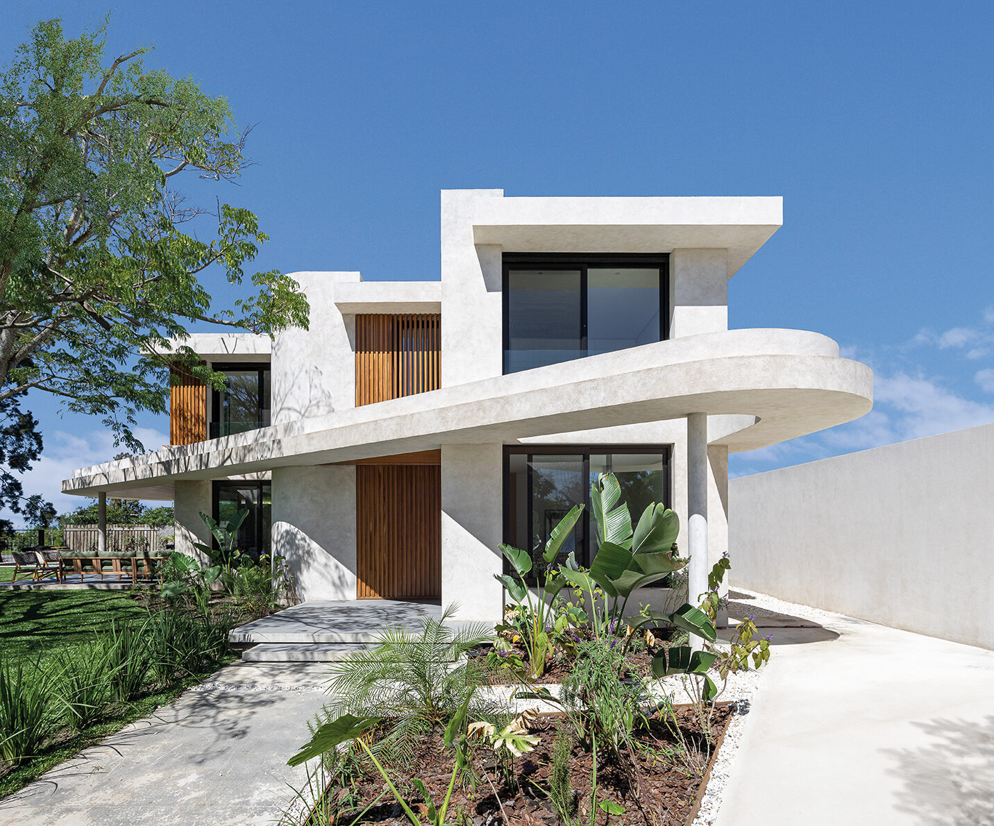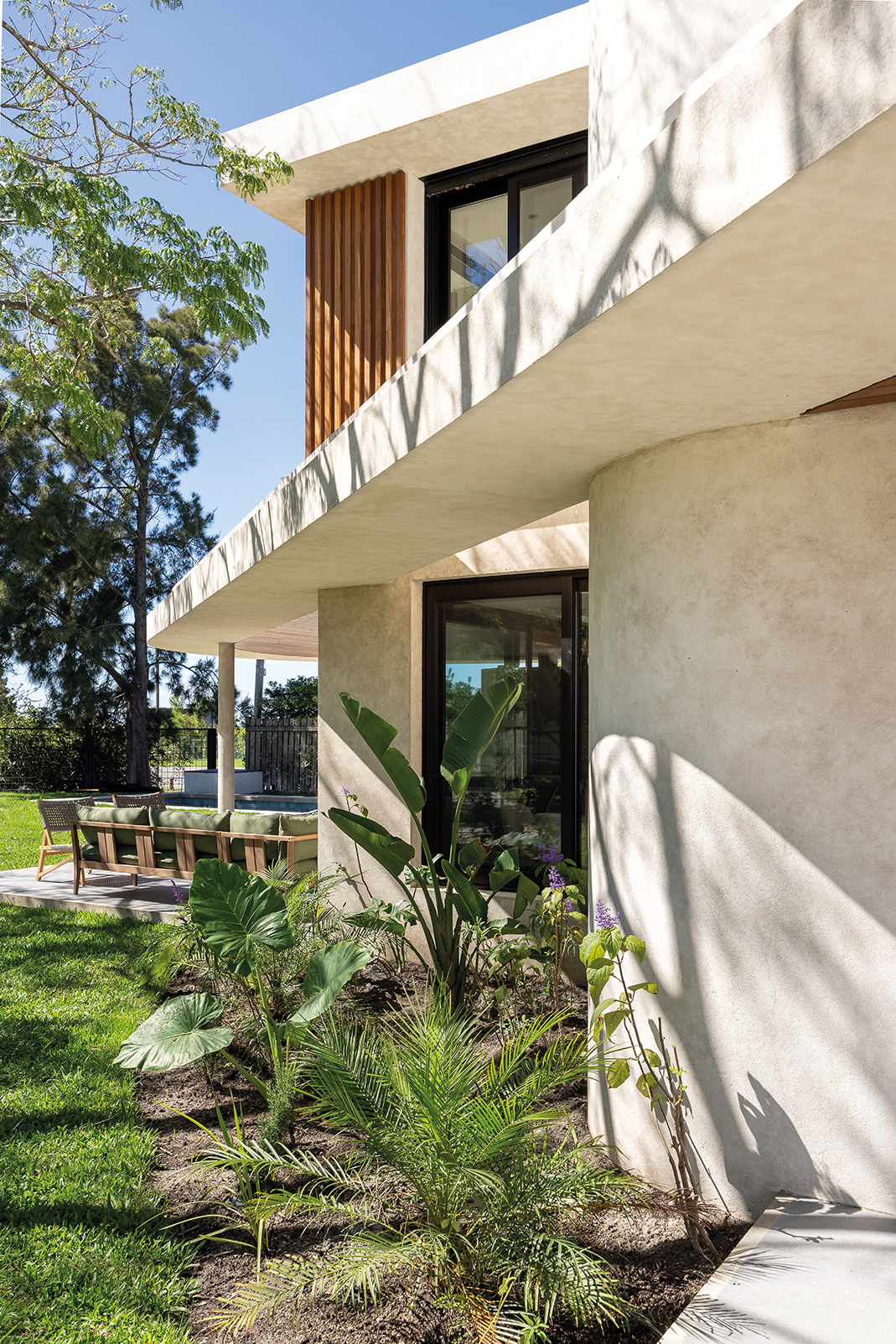 La casa se desarrolla en dos plantas claramente diferenciadas. La fachada central se presenta como un espacio intencionalmente privado, logrando una efectiva separación entre las áreas públicas y privadas y facilitando la disposición ordenada del jardín. La fachada principal, por su parte, enfrenta el terreno con un juego escalonado en su arquitectura, resuelto mediante un volado curvo de hormigón que no solo completa la silueta de la casa, sino que también se mimetiza con el entorno, integrando el edificio al paisaje de manera sutil y elegante.
