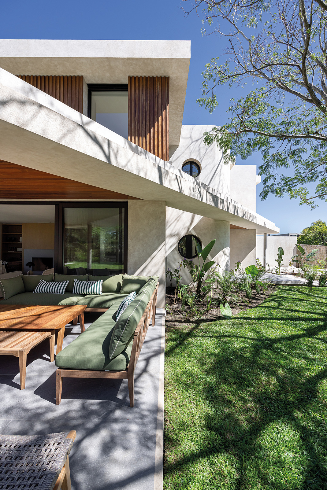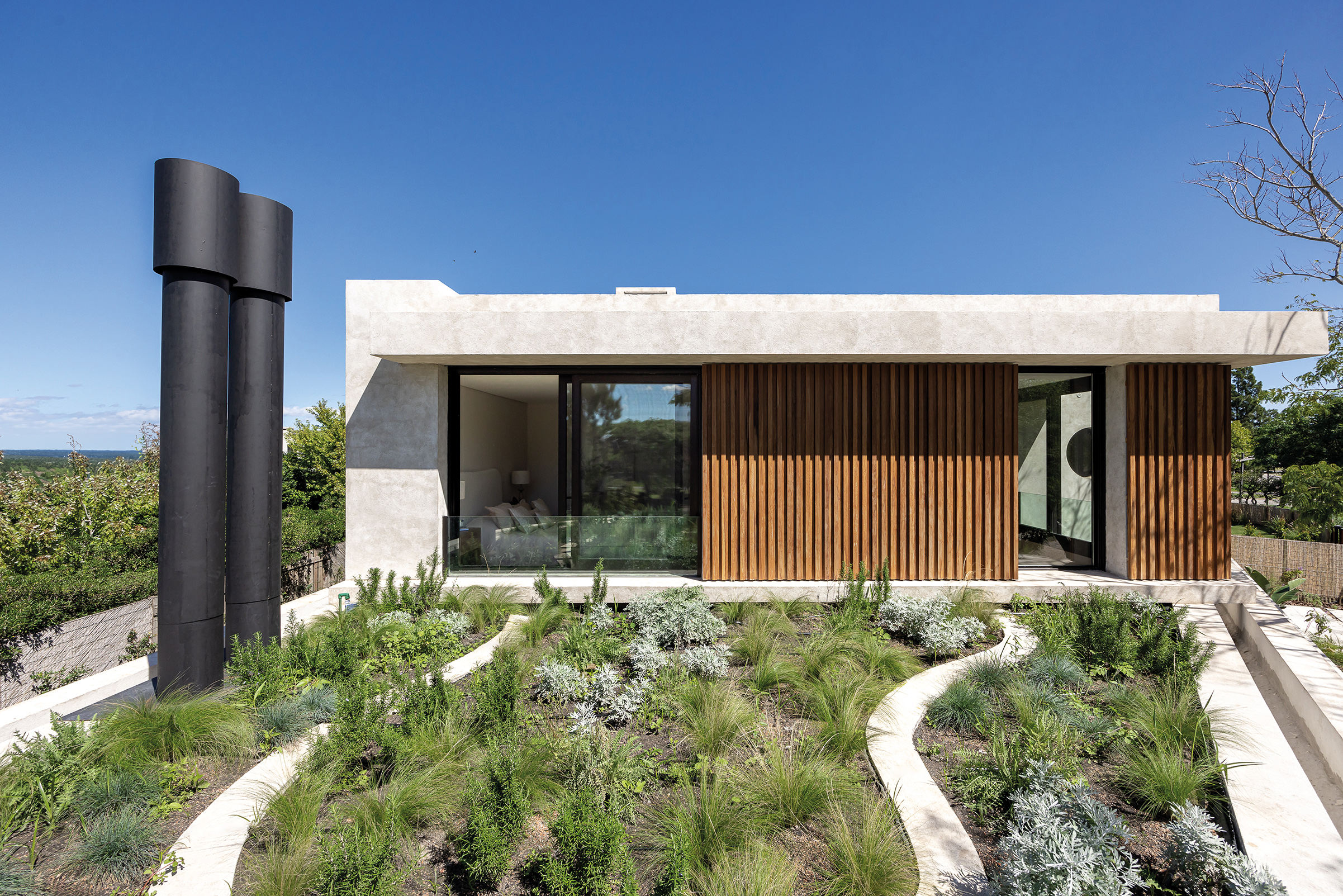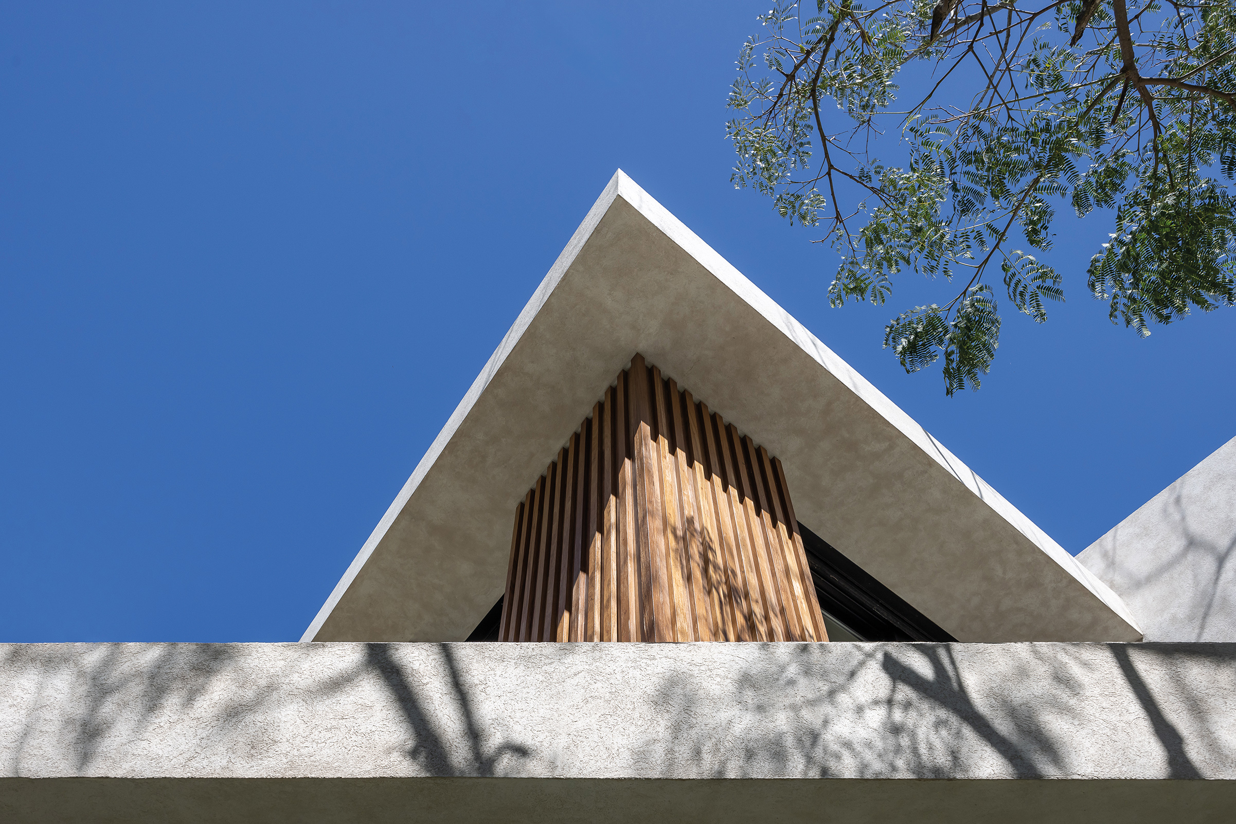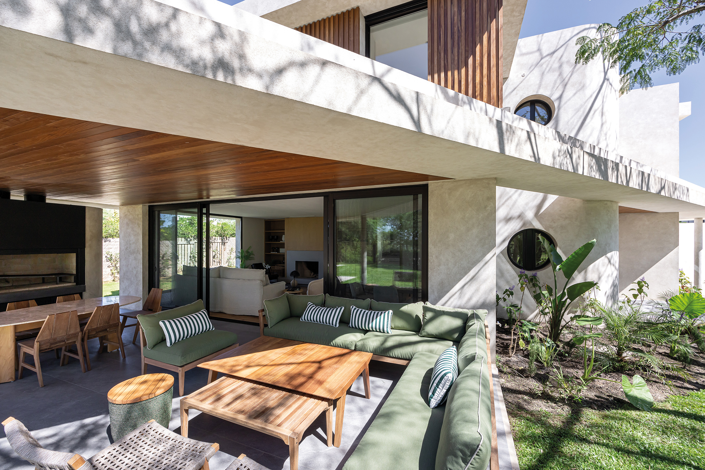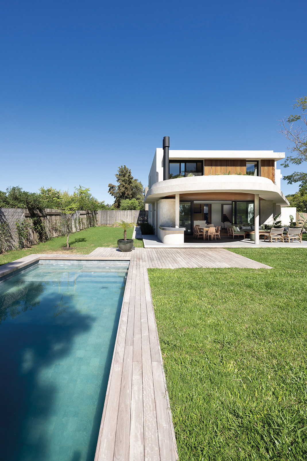 La casa se desarrolla en dos plantas claramente diferenciadas. La fachada central se presenta como un espacio intencionalmente privado, logrando una efectiva separación entre las áreas públicas y privadas y facilitando la disposición ordenada del jardín. La fachada principal, por su parte, enfrenta el terreno con un juego escalonado en su arquitectura, resuelto mediante un volado curvo de hormigón que no solo completa la silueta de la casa, sino que también se mimetiza con el entorno, integrando el edificio al paisaje de manera sutil y elegante.