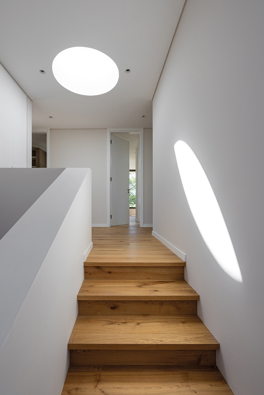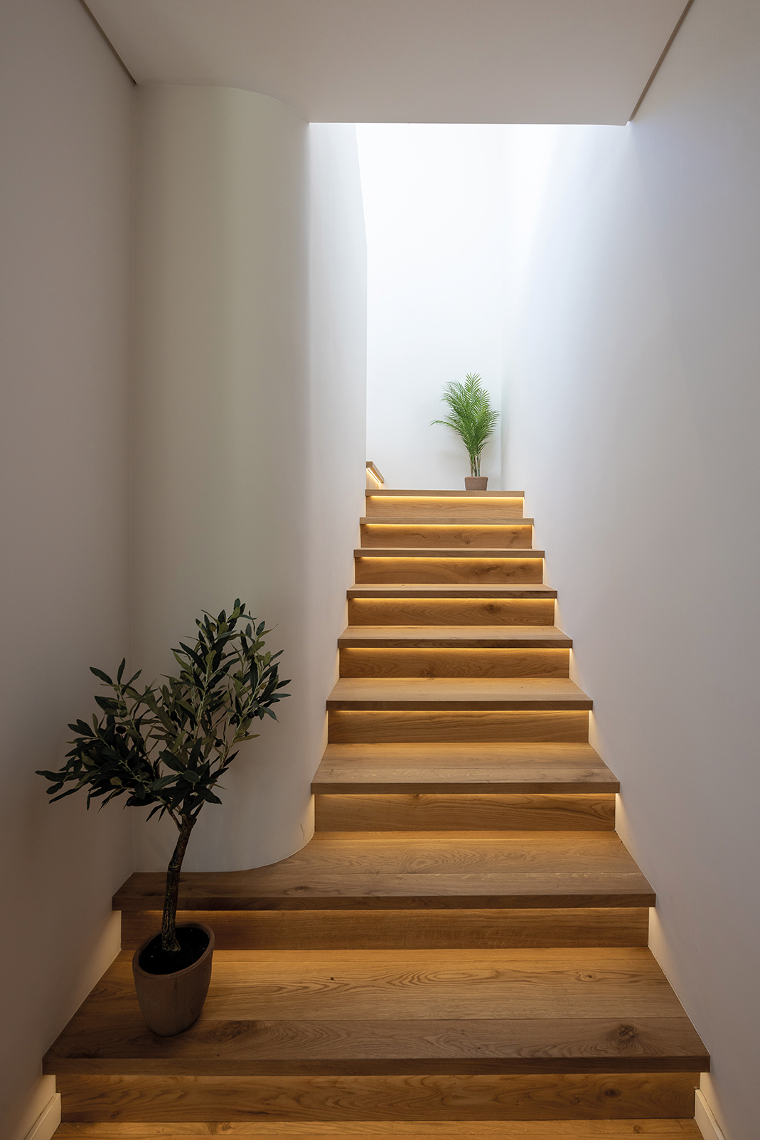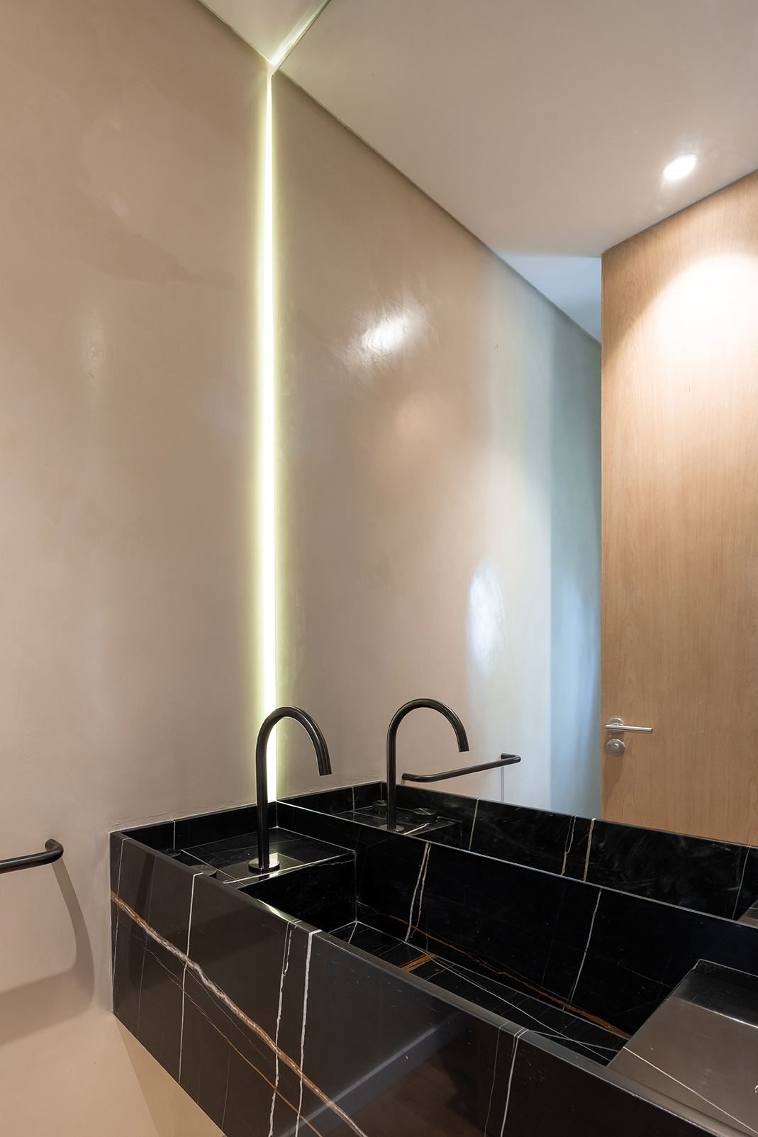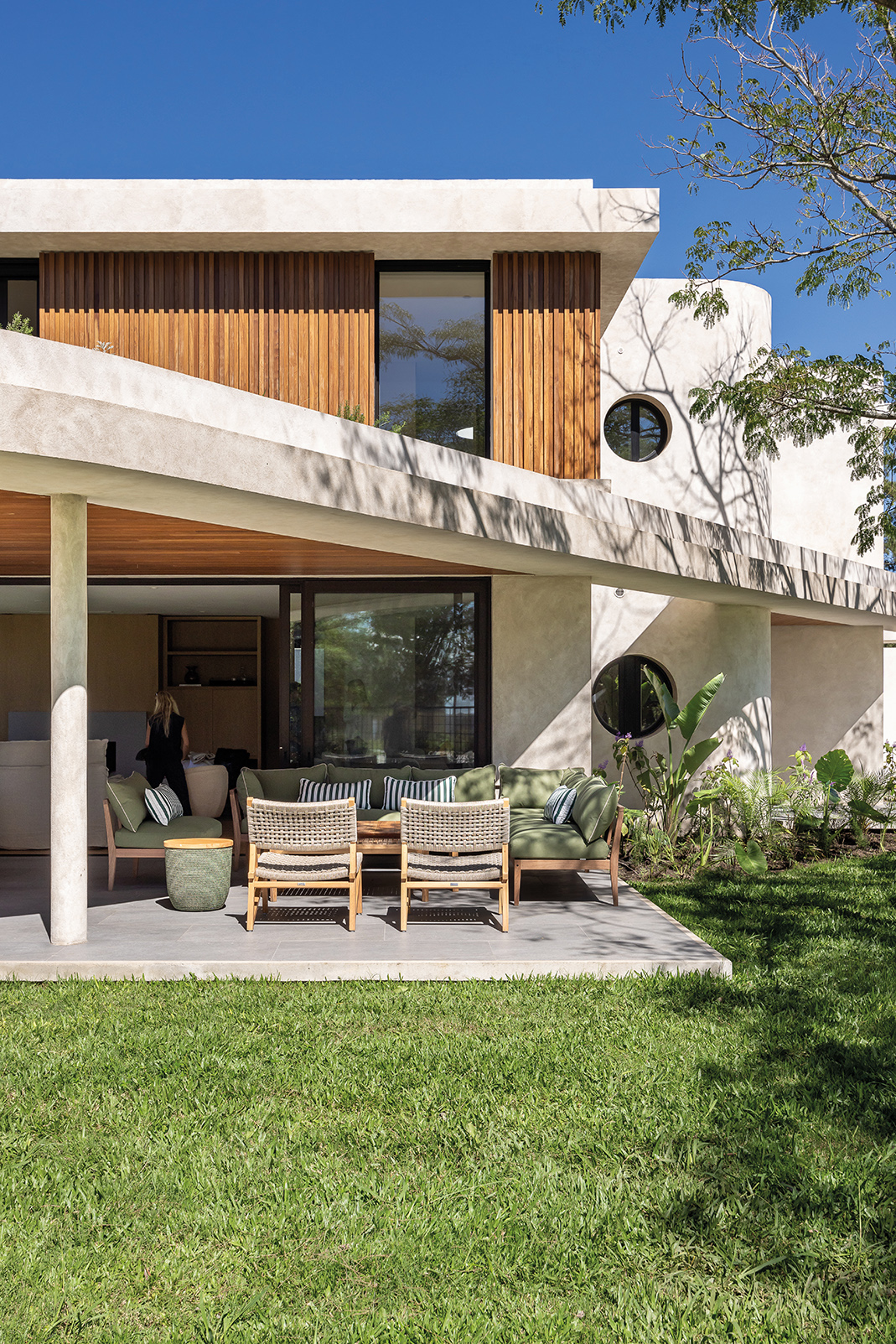 Este juego rítmico de la estructura, compuesto por tres volúmenes escalonados, crea una perspectiva dinámica que parece fundirse con el movimiento natural del terreno. Estos volúmenes, conectados y complementados por el volado curvo de hormigón, establecen un estilo arquitectónico singular y contemporáneo, con una ingeniosa referencia a lo clásico a través de una paleta tonal refinada. El uso de revestimientos en madera para las áreas privadas añade un toque orgánico y natural, suavizando la contundencia del hormigón y aportando calidez al conjunto.