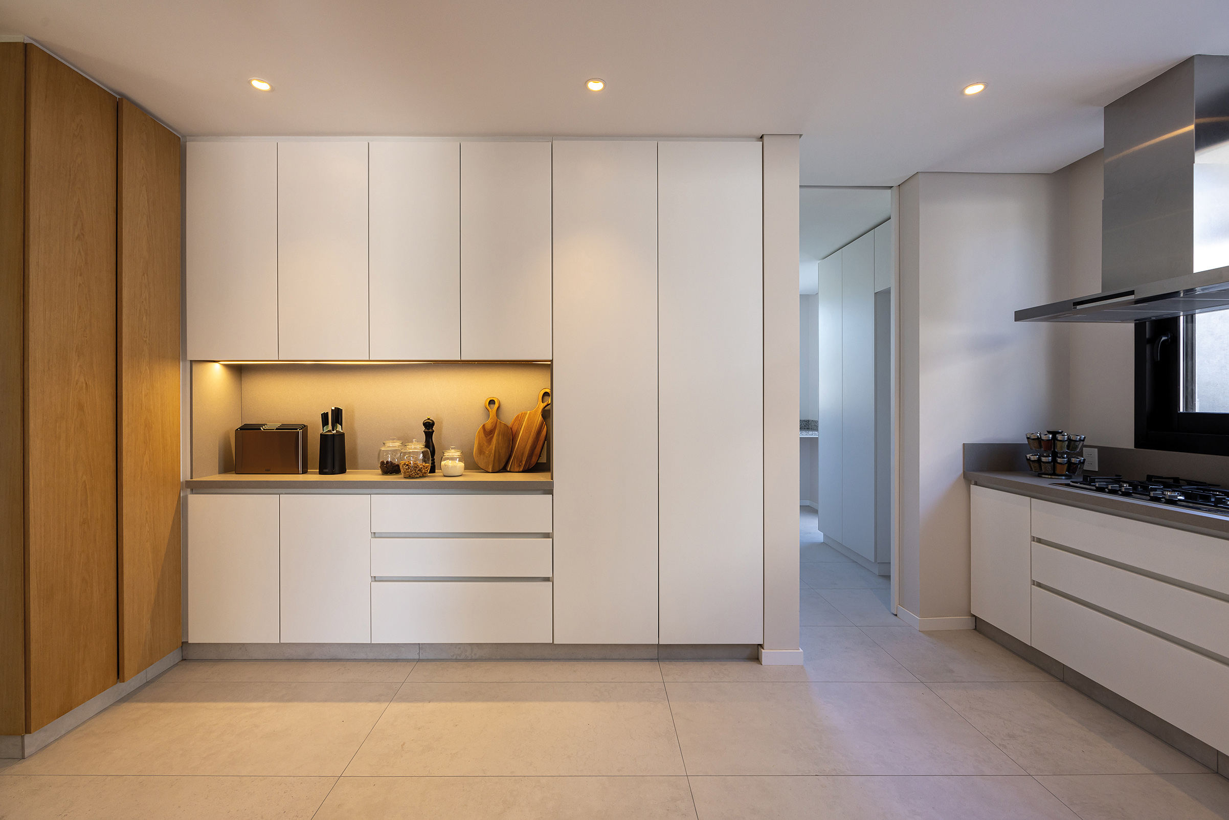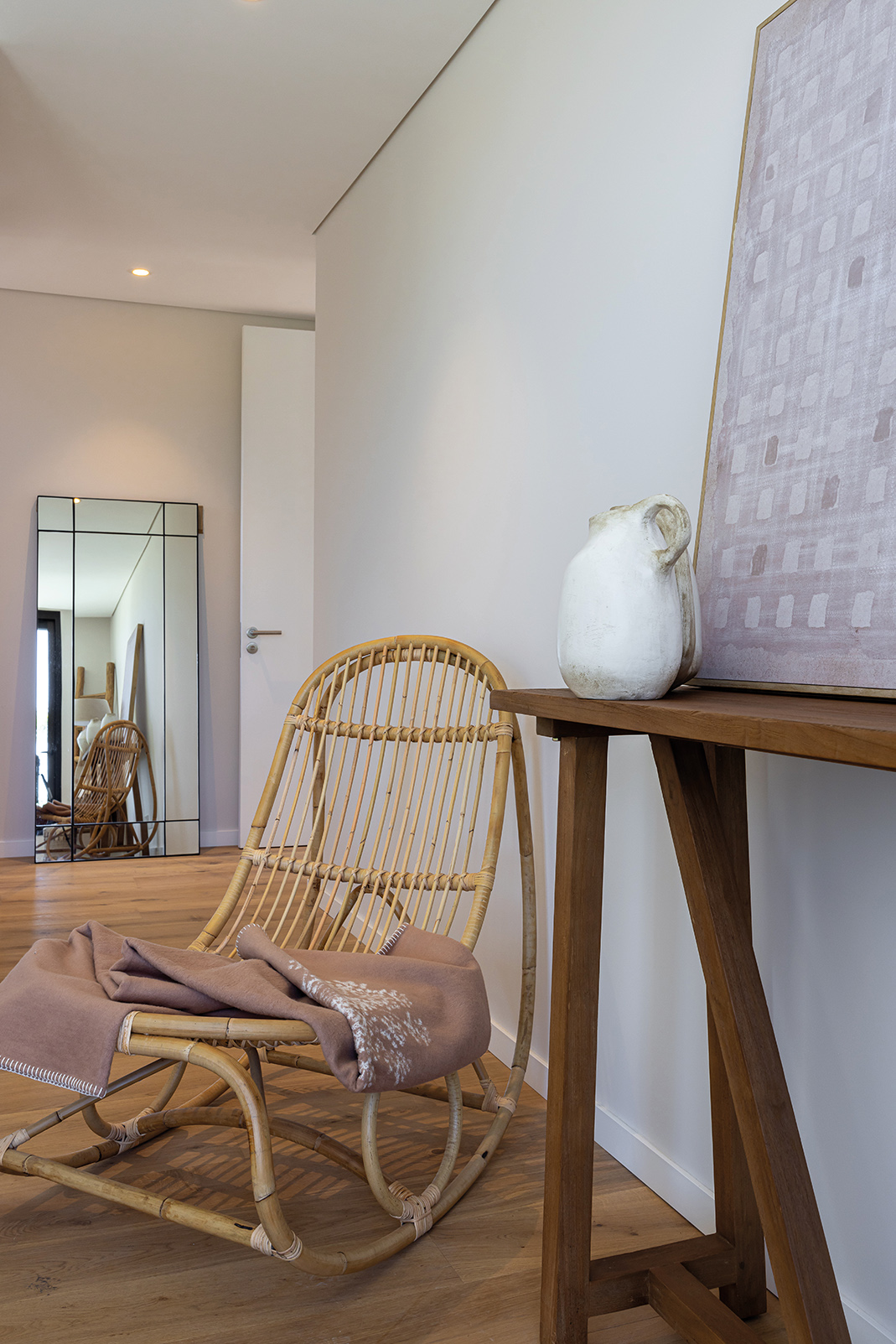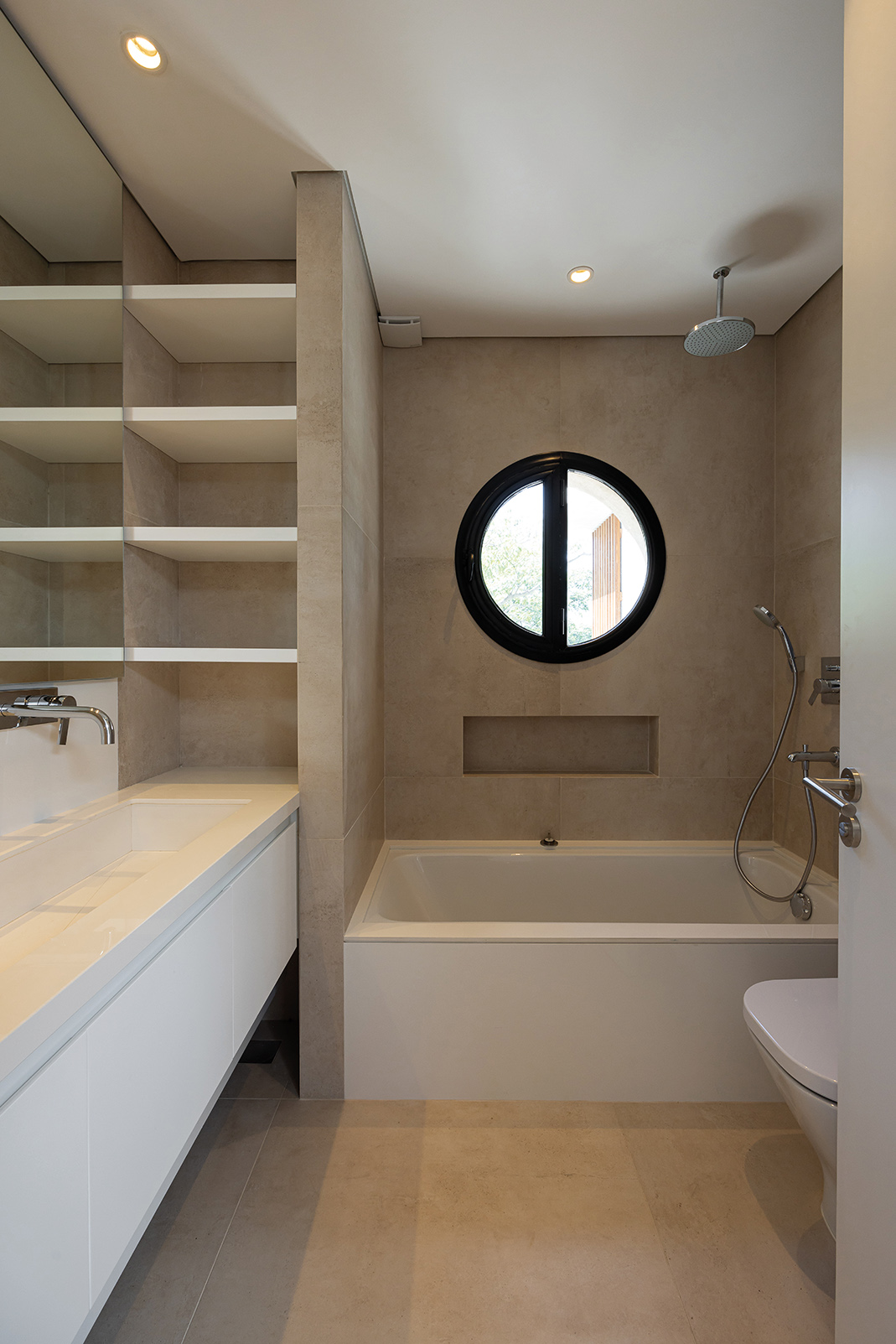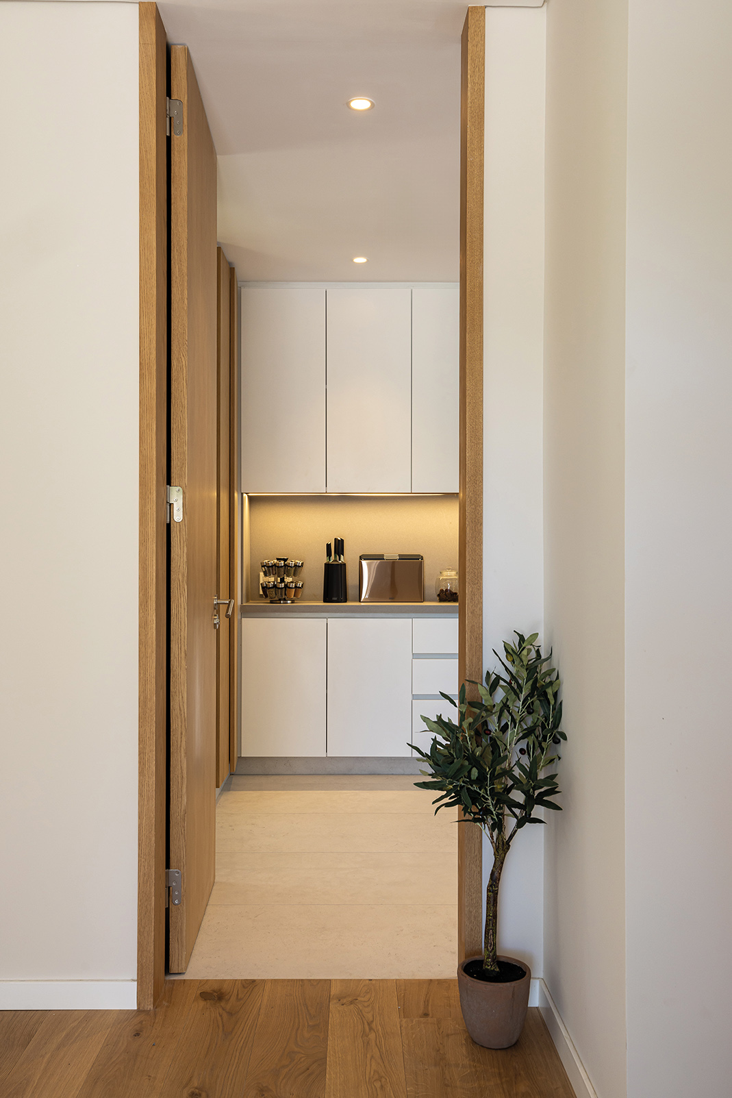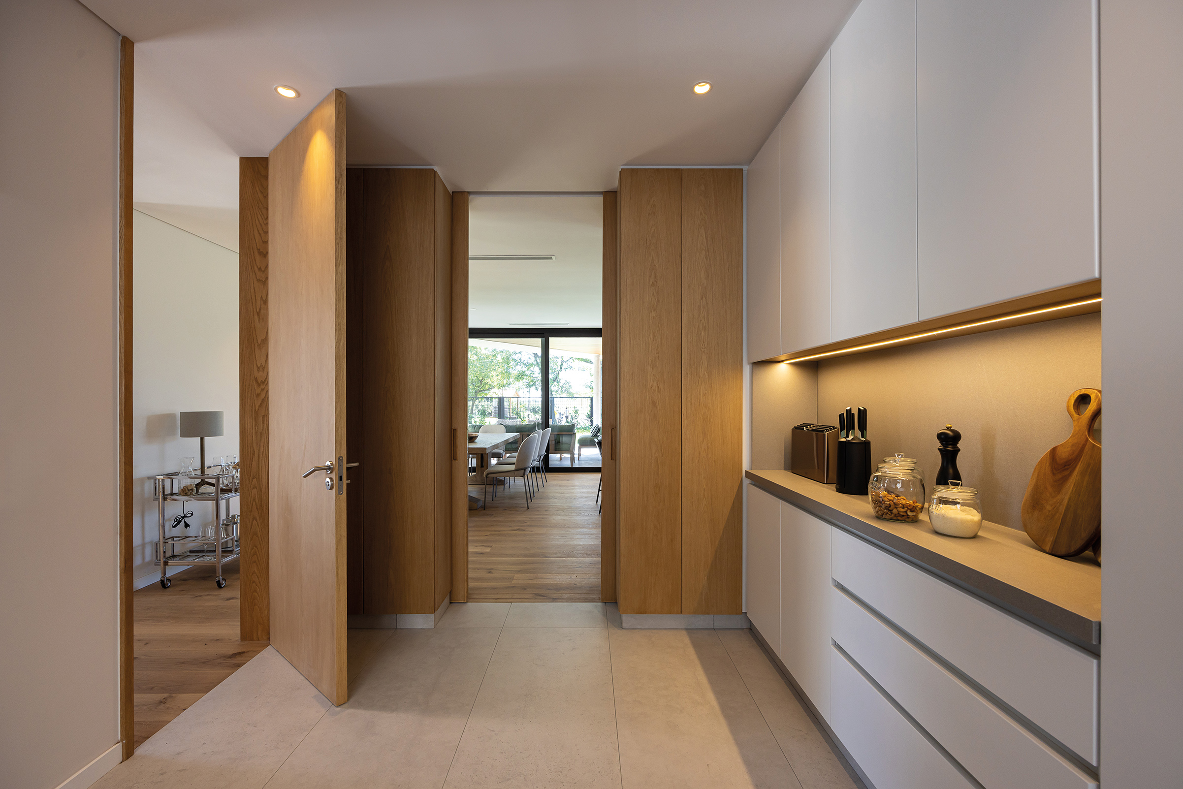 Este juego rítmico de la estructura, compuesto por tres volúmenes escalonados, crea una perspectiva dinámica que parece fundirse con el movimiento natural del terreno. Estos volúmenes, conectados y complementados por el volado curvo de hormigón, establecen un estilo arquitectónico singular y contemporáneo, con una ingeniosa referencia a lo clásico a través de una paleta tonal refinada. El uso de revestimientos en madera para las áreas privadas añade un toque orgánico y natural, suavizando la contundencia del hormigón y aportando calidez al conjunto.