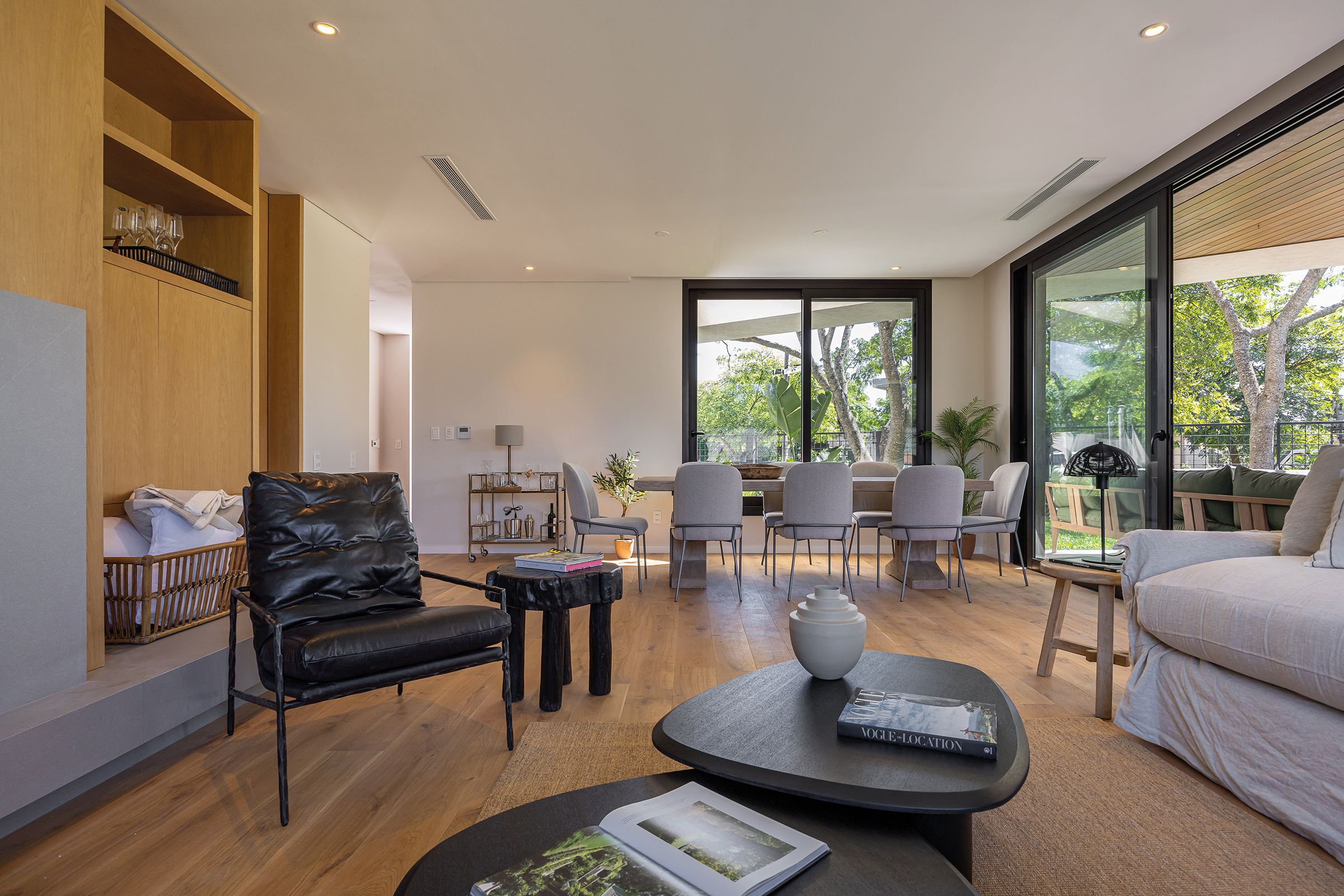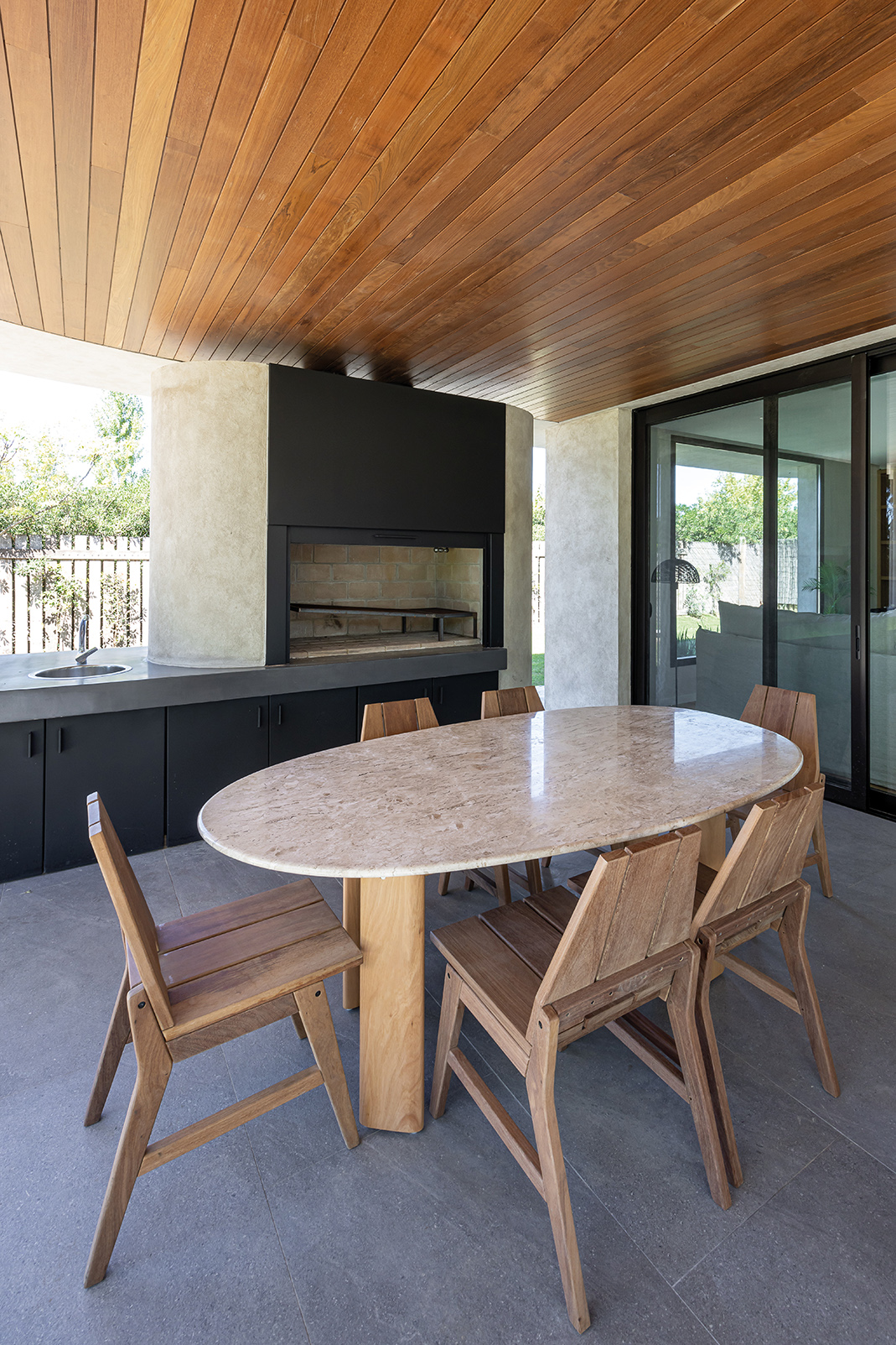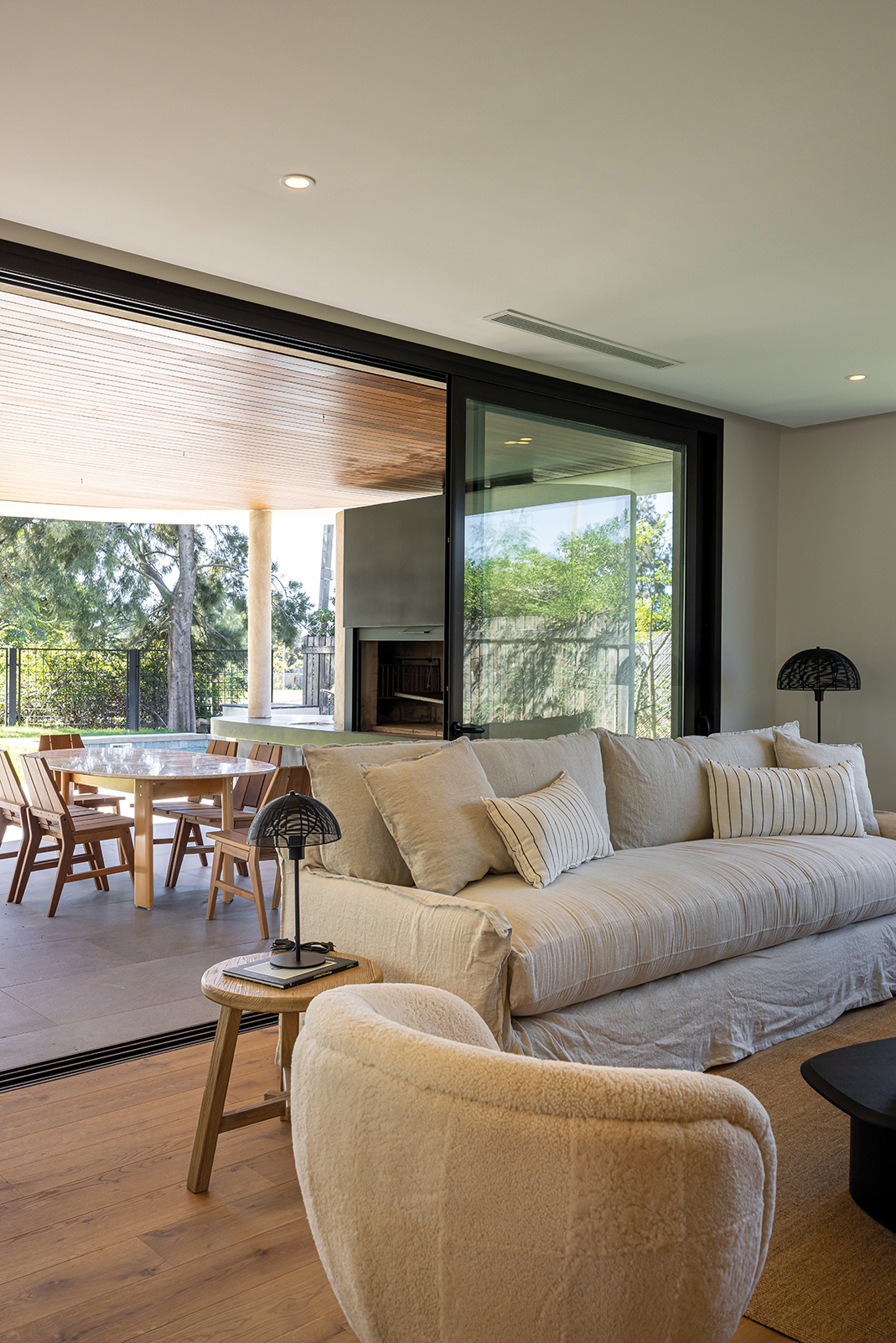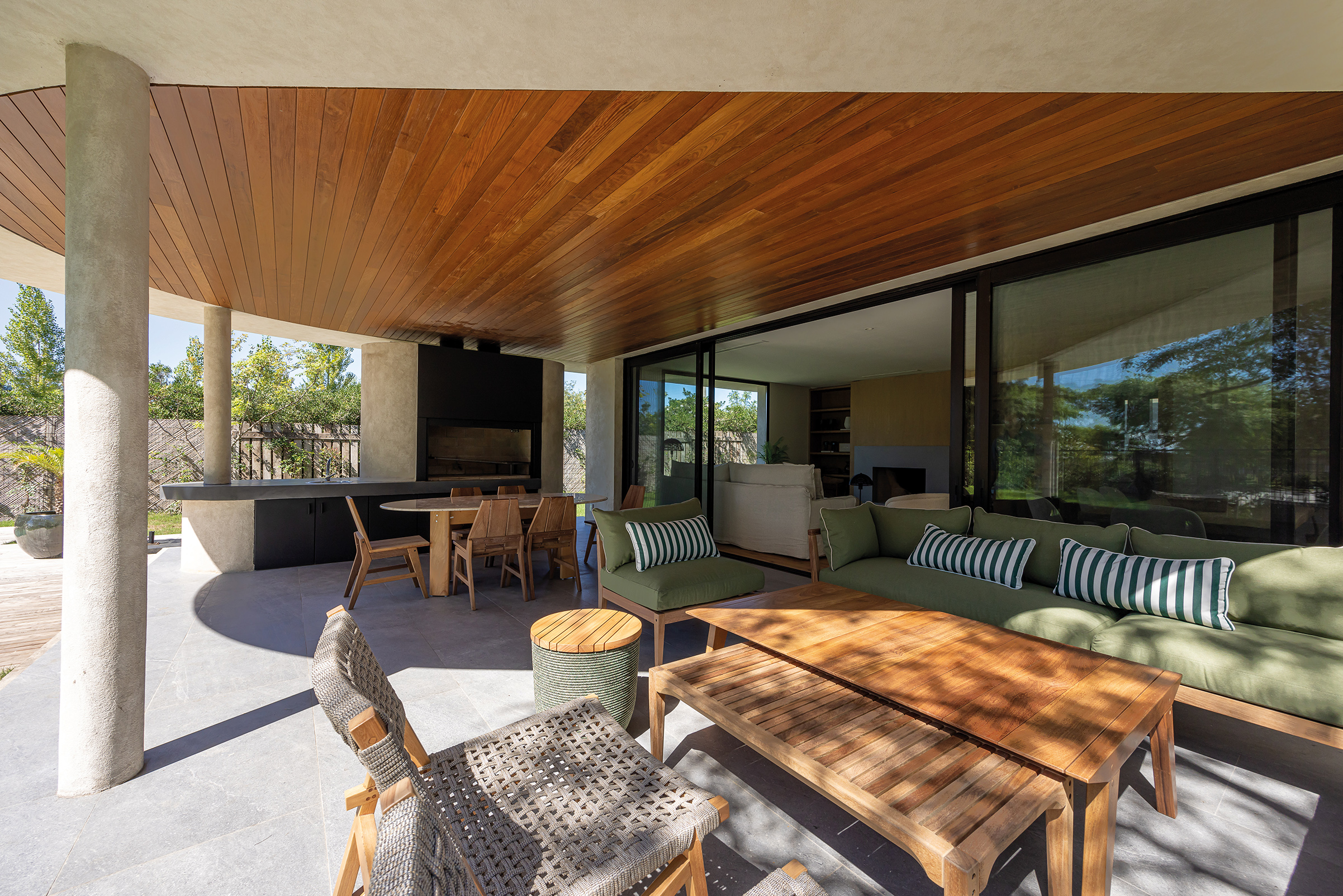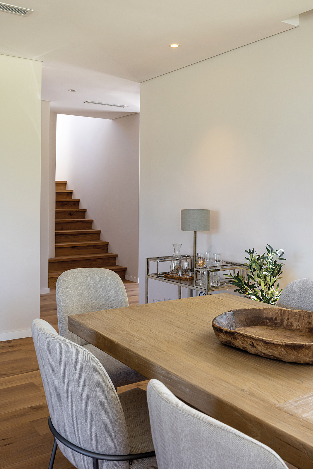 La estructura, en su conjunto, evoca la imagen de una gran nave que se despliega armoniosamente sobre el terreno. El acceso a la casa es amplio y acogedor, conduciendo a una espaciosa cocina que se integra sin esfuerzo con el gran ambiente principal de la planta baja, donde el living y el comedor se fusionan para crear un núcleo central de convivencia. Este espacio, de marcado minimalismo cálido, se caracteriza por una paleta de colores blancos y el uso extensivo de madera en pisos y cielorrasos, creando un ambiente acogedor y sereno. Una gran abertura conecta este espacio con un estar externo, generando un vínculo estrecho entre el interior y el exterior y permitiendo que el paisaje se convierta en un elemento integral de la experiencia habitacional.