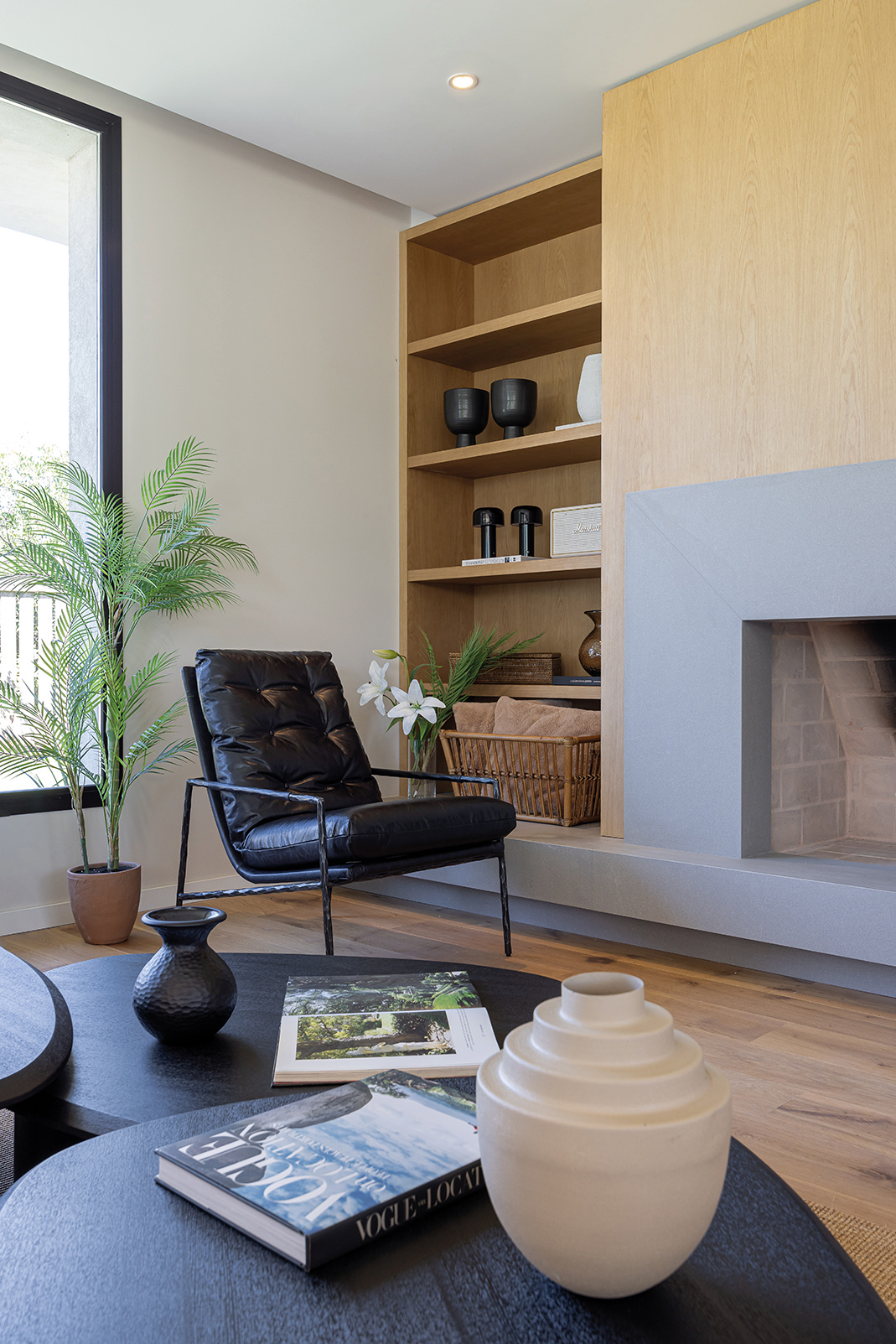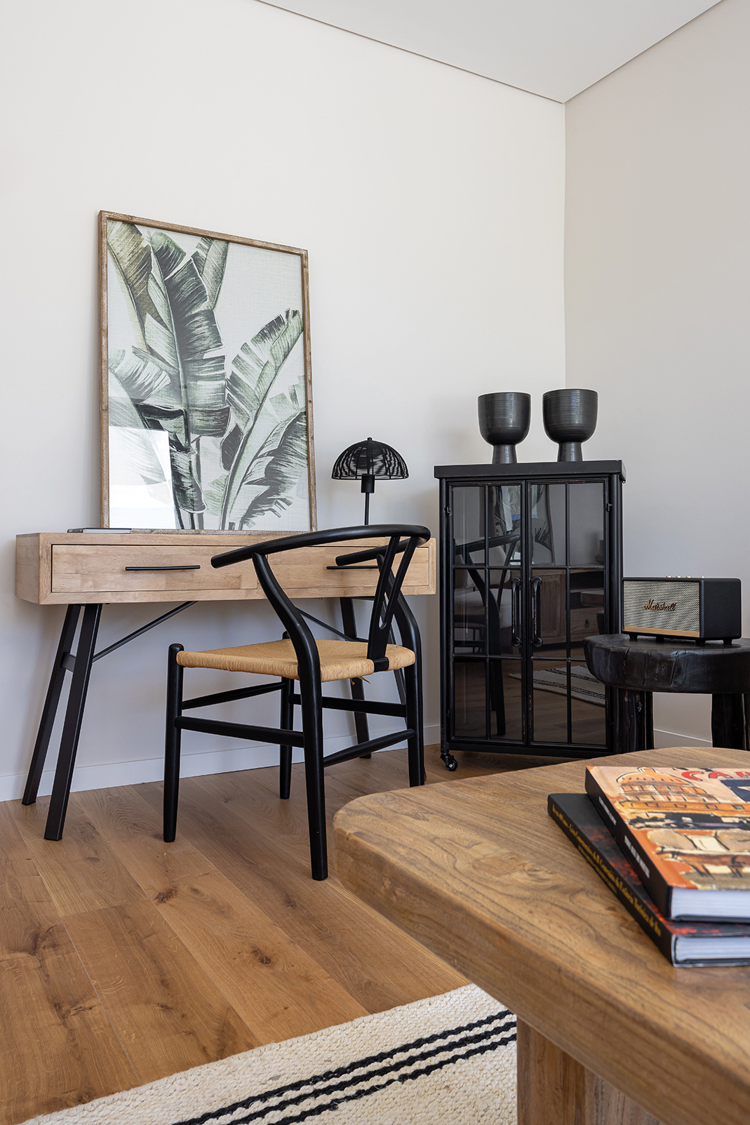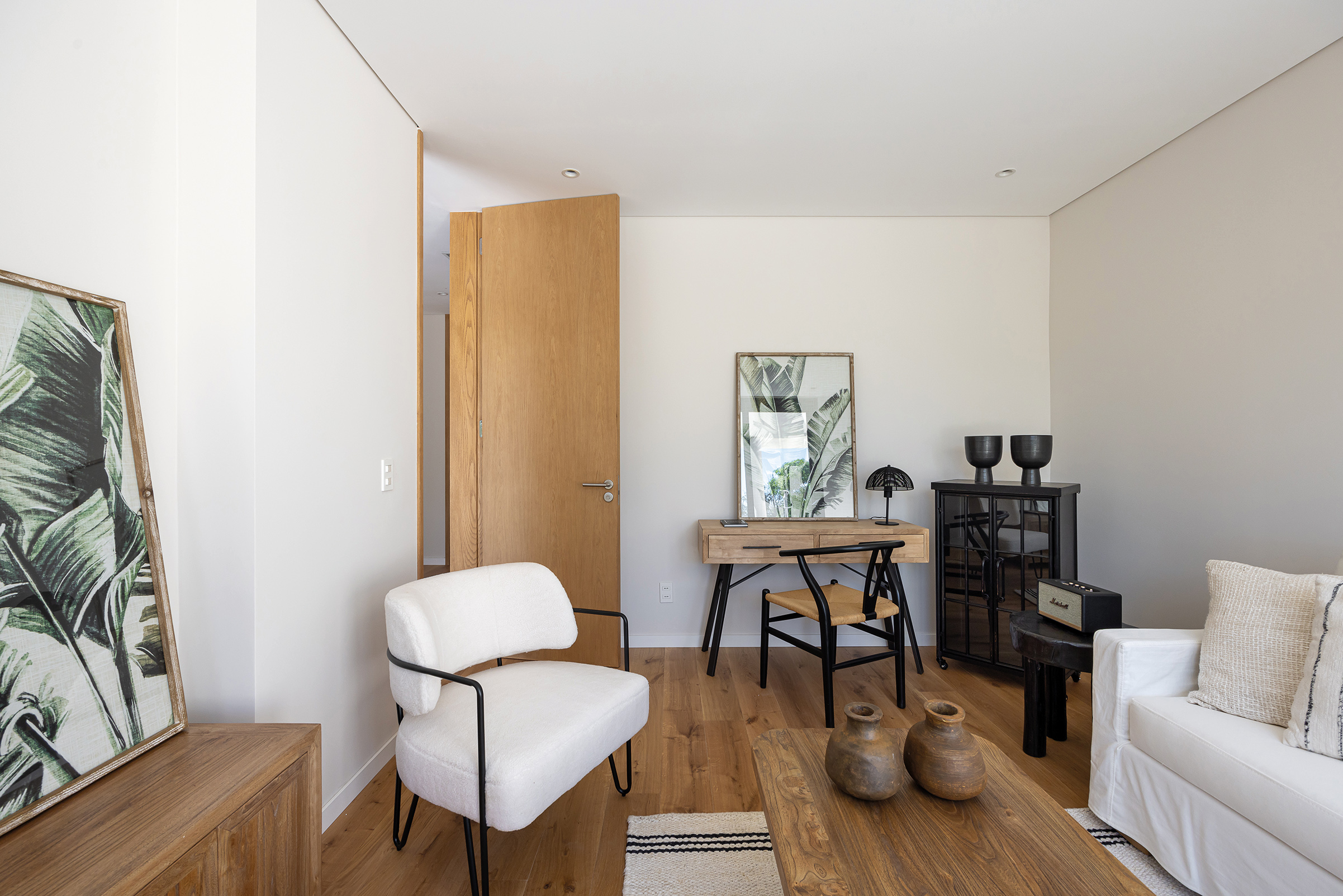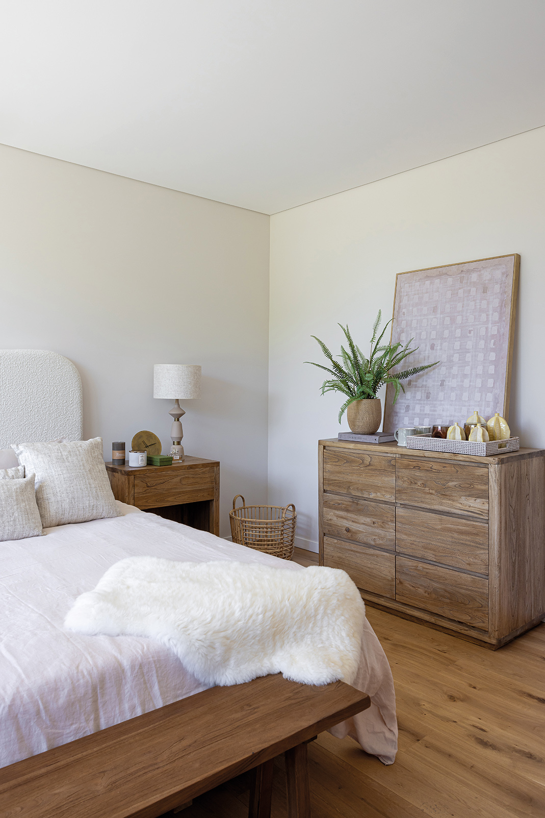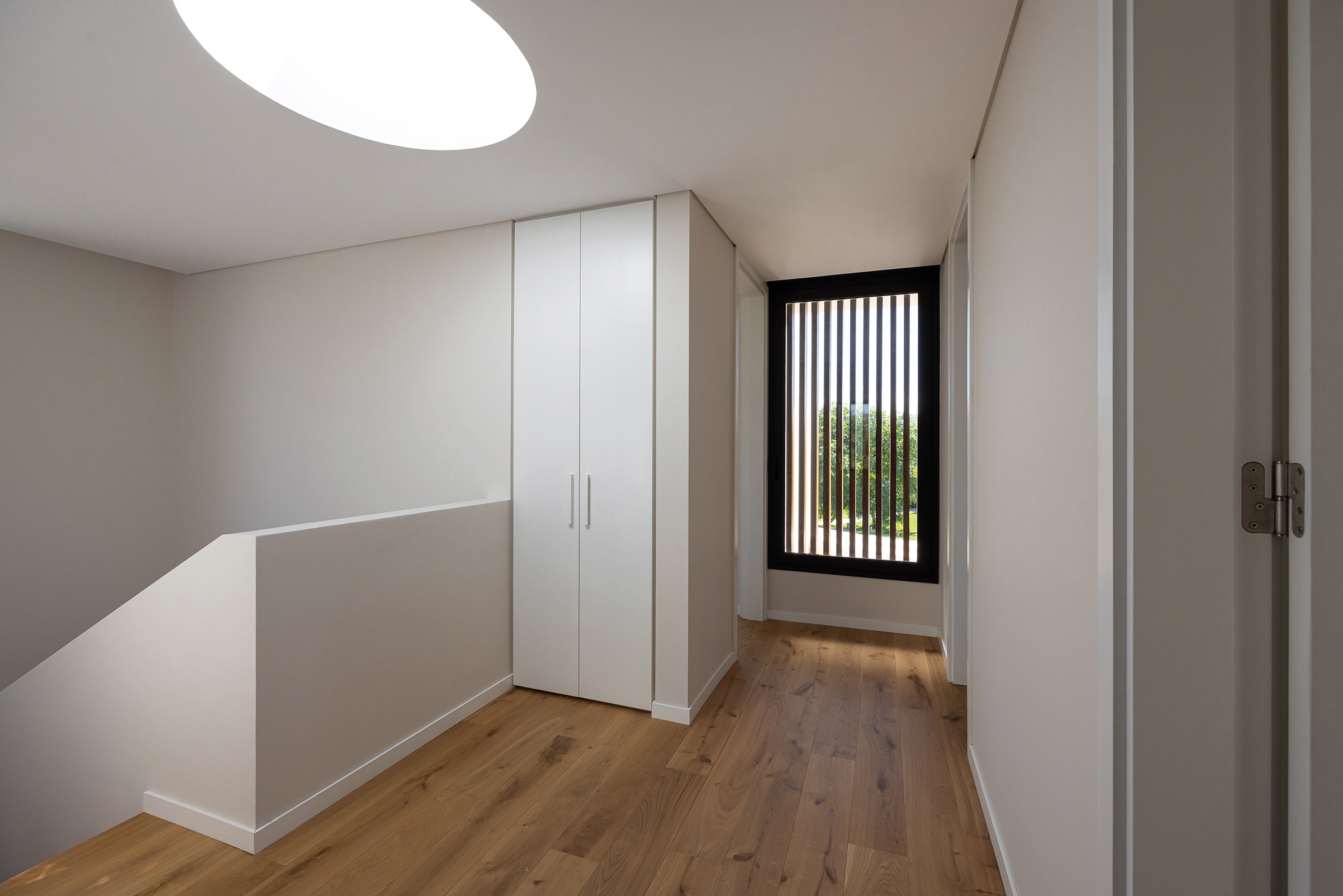 La estructura, en su conjunto, evoca la imagen de una gran nave que se despliega armoniosamente sobre el terreno. El acceso a la casa es amplio y acogedor, conduciendo a una espaciosa cocina que se integra sin esfuerzo con el gran ambiente principal de la planta baja, donde el living y el comedor se fusionan para crear un núcleo central de convivencia. Este espacio, de marcado minimalismo cálido, se caracteriza por una paleta de colores blancos y el uso extensivo de madera en pisos y cielorrasos, creando un ambiente acogedor y sereno. Una gran abertura conecta este espacio con un estar externo, generando un vínculo estrecho entre el interior y el exterior y permitiendo que el paisaje se convierta en un elemento integral de la experiencia habitacional.