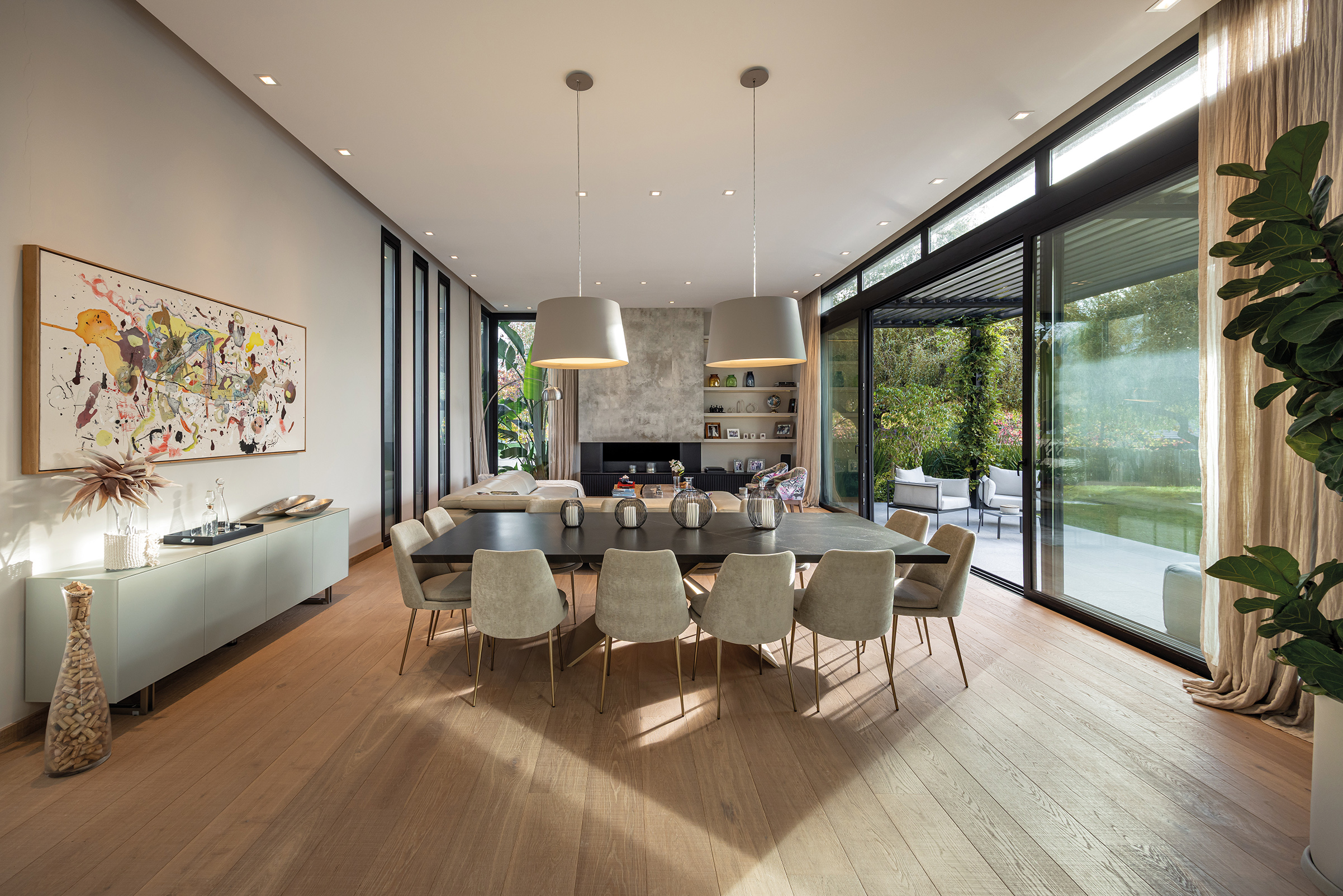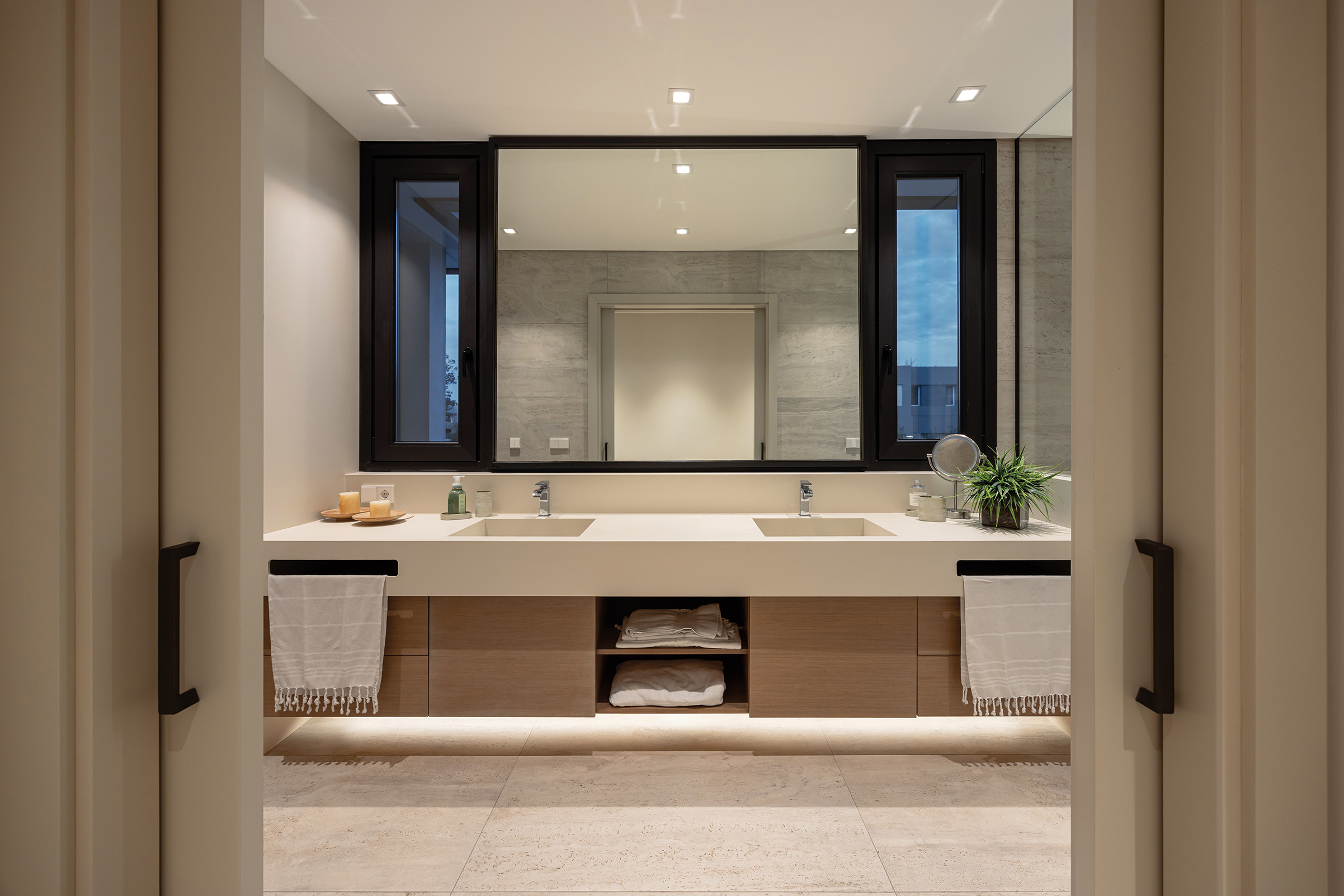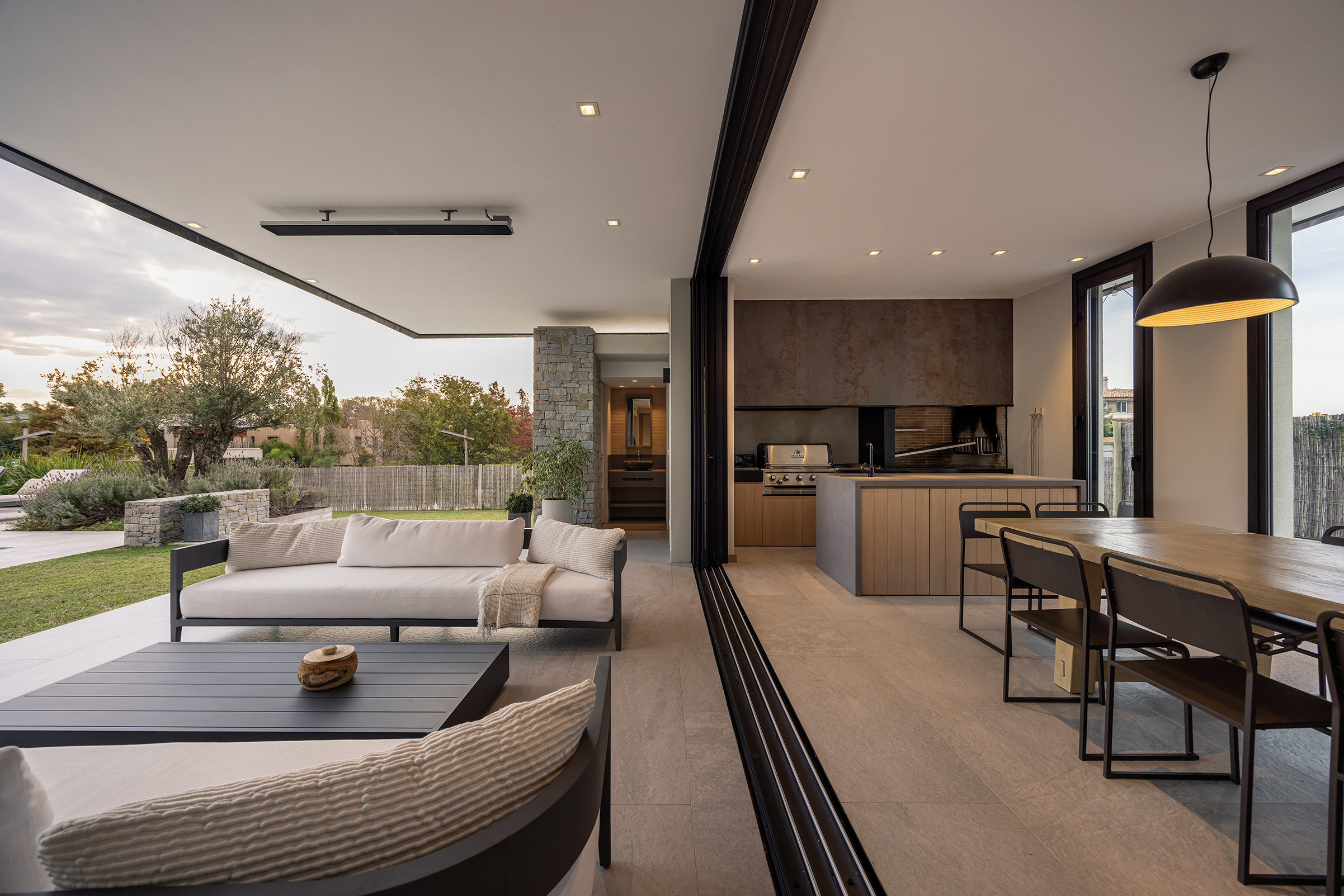 Los materiales responden a un principio de sobriedad sofisticada. Colores arena dominan los paramentos y se continúan en los interiores. Aberturas de PVC negro de altas prestaciones contrastan con paredes claras; carpinterías interiores laqueadas desaparecen en el muro. Los pisos de madera rubios, en formato de ingeniería, aportan calidez; el porcelanato en cocina, barbacoa y exteriores retoma la paleta, manteniendo la coherencia cromática.