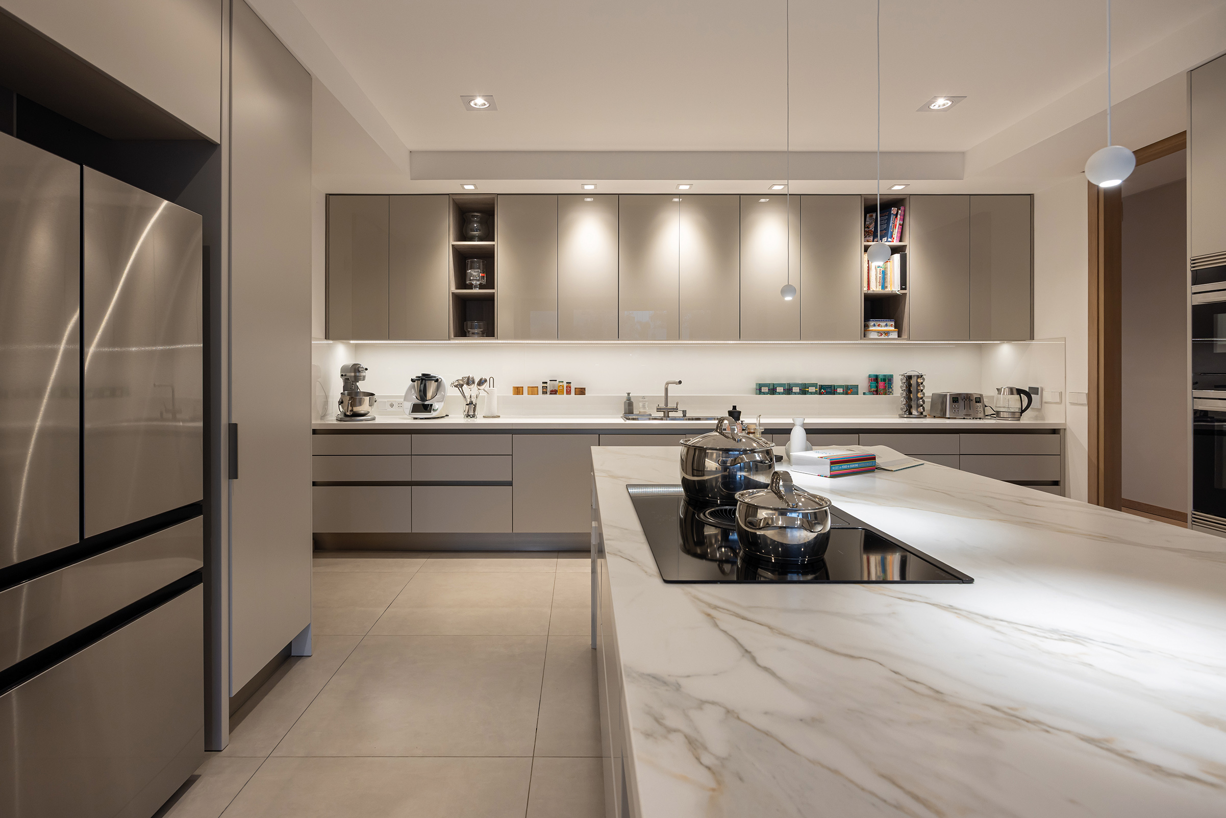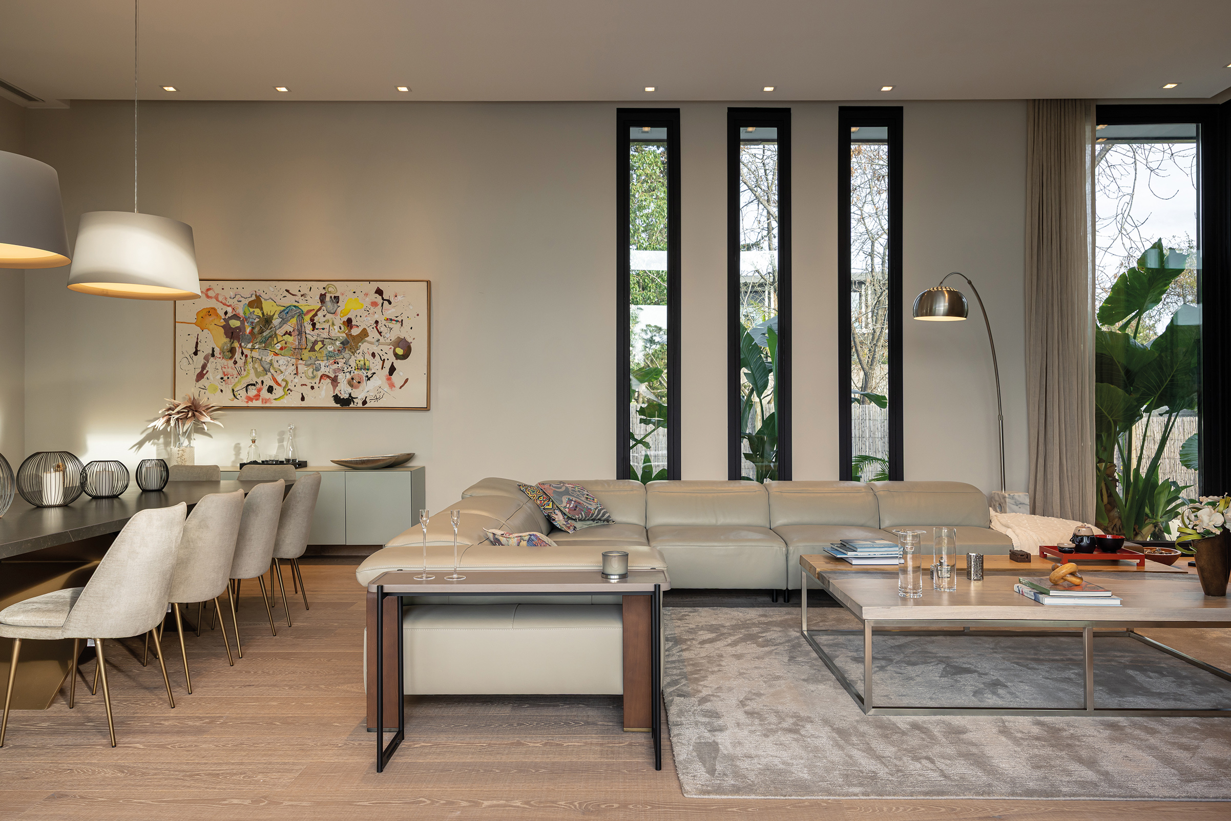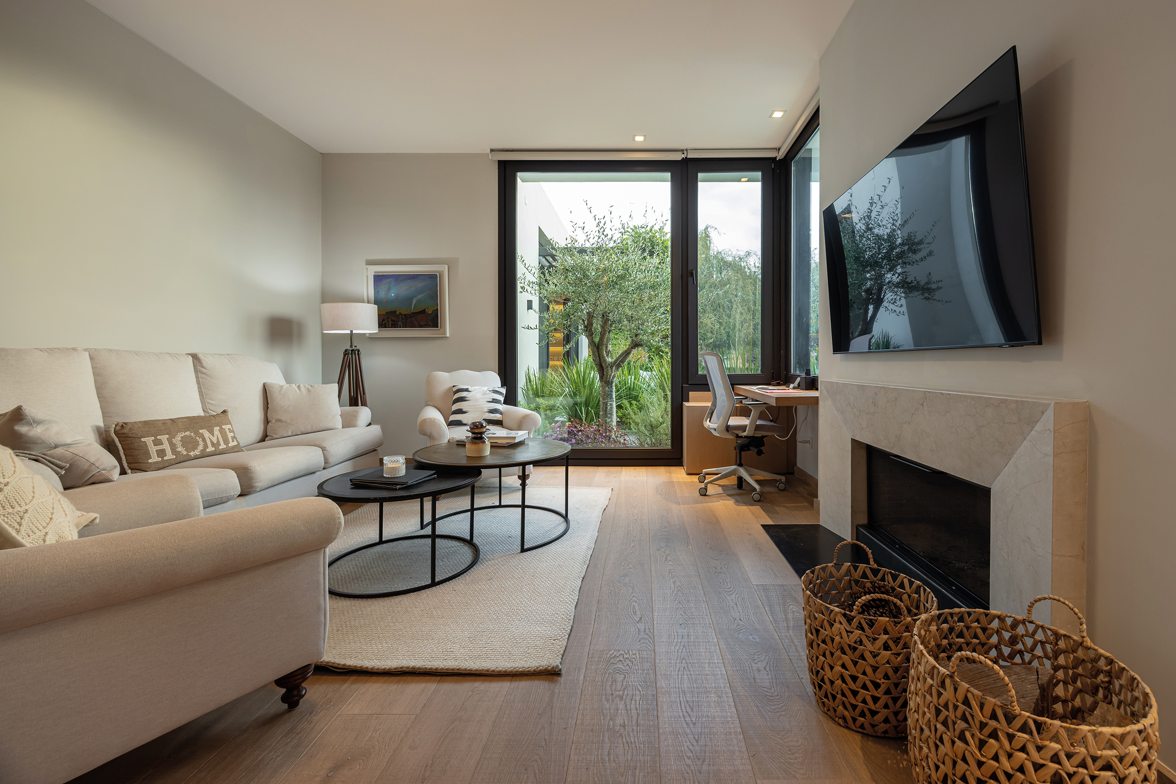 Los materiales responden a un principio de sobriedad sofisticada. Colores arena dominan los paramentos y se continúan en los interiores. Aberturas de PVC negro de altas prestaciones contrastan con paredes claras; carpinterías interiores laqueadas desaparecen en el muro. Los pisos de madera rubios, en formato de ingeniería, aportan calidez; el porcelanato en cocina, barbacoa y exteriores retoma la paleta, manteniendo la coherencia cromática.
