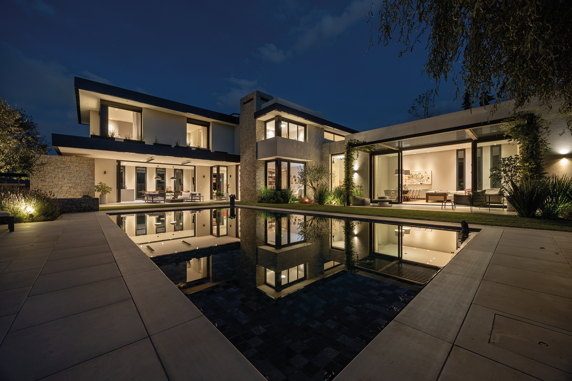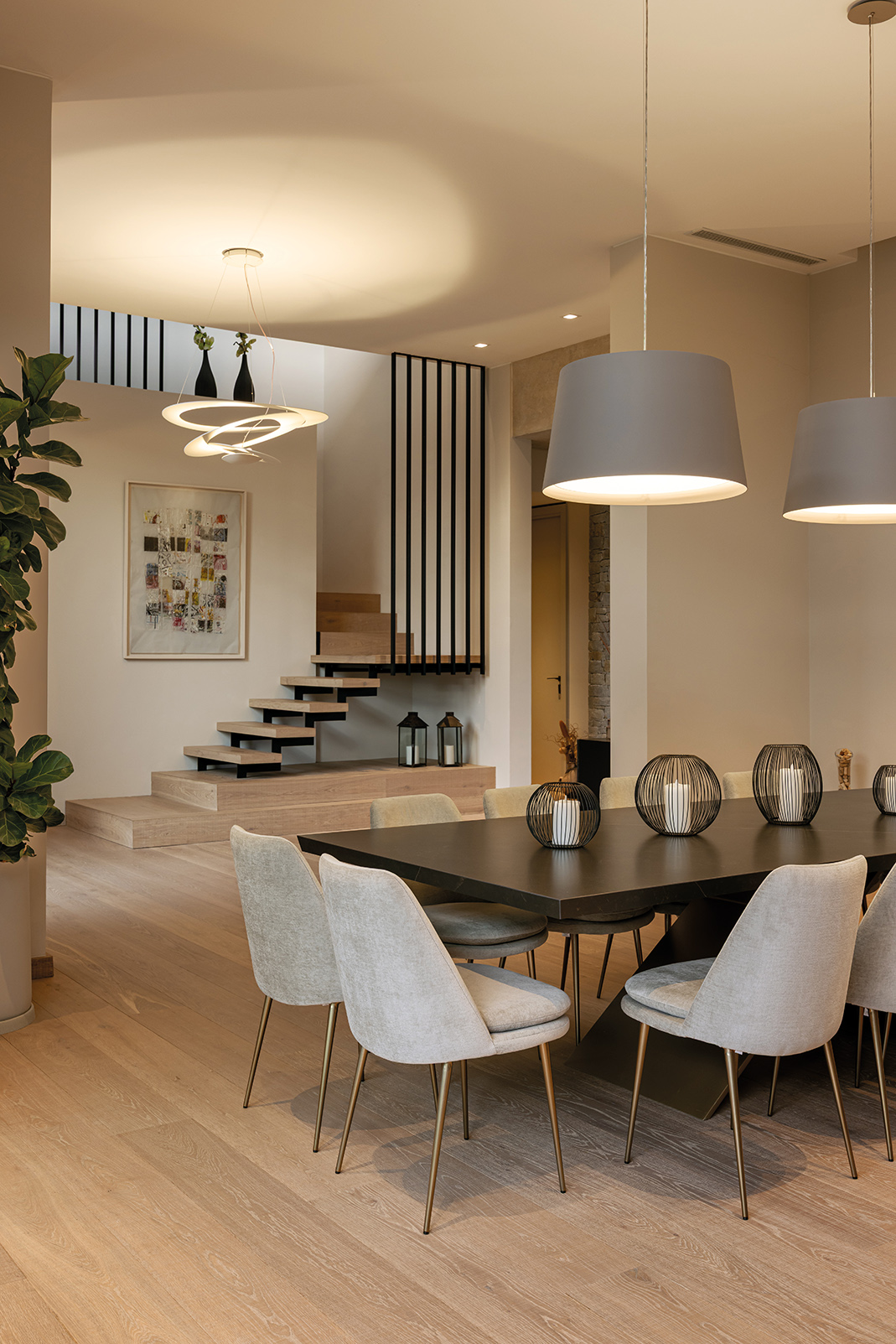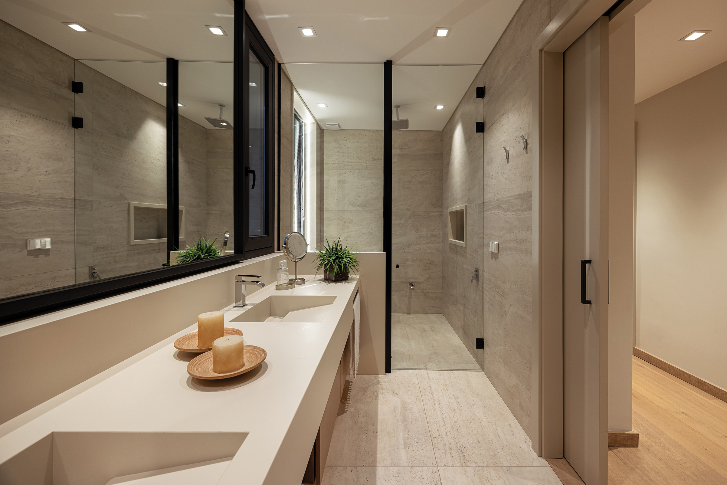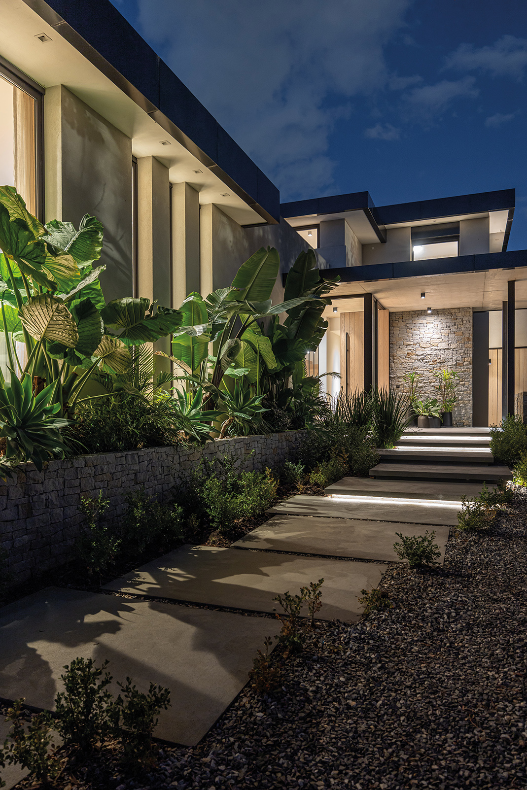El acceso lateral no es un recurso casual: es parte de la dramaturgia del recorrido. Un sendero de losas de hormigón escoltado por una jardinera exuberante conduce hacia una fachada lateral que se impone como la verdadera entrada. Hay allí una composición rítmica de aberturas, aleros de alucobond negro, ángulos vidriados que dialogan entre sí. El hall de acceso, a doble altura, es un espacio que se ve desde la calle y que al ingresar se abre, como un abanico, hacia múltiples escenas: el living con vistas hacia la piscina, un olivo que actúa como ancla visual, la escalera que asciende con elegancia, una cava para quinientas botellas que insinúa el culto hedonista del buen vivir.