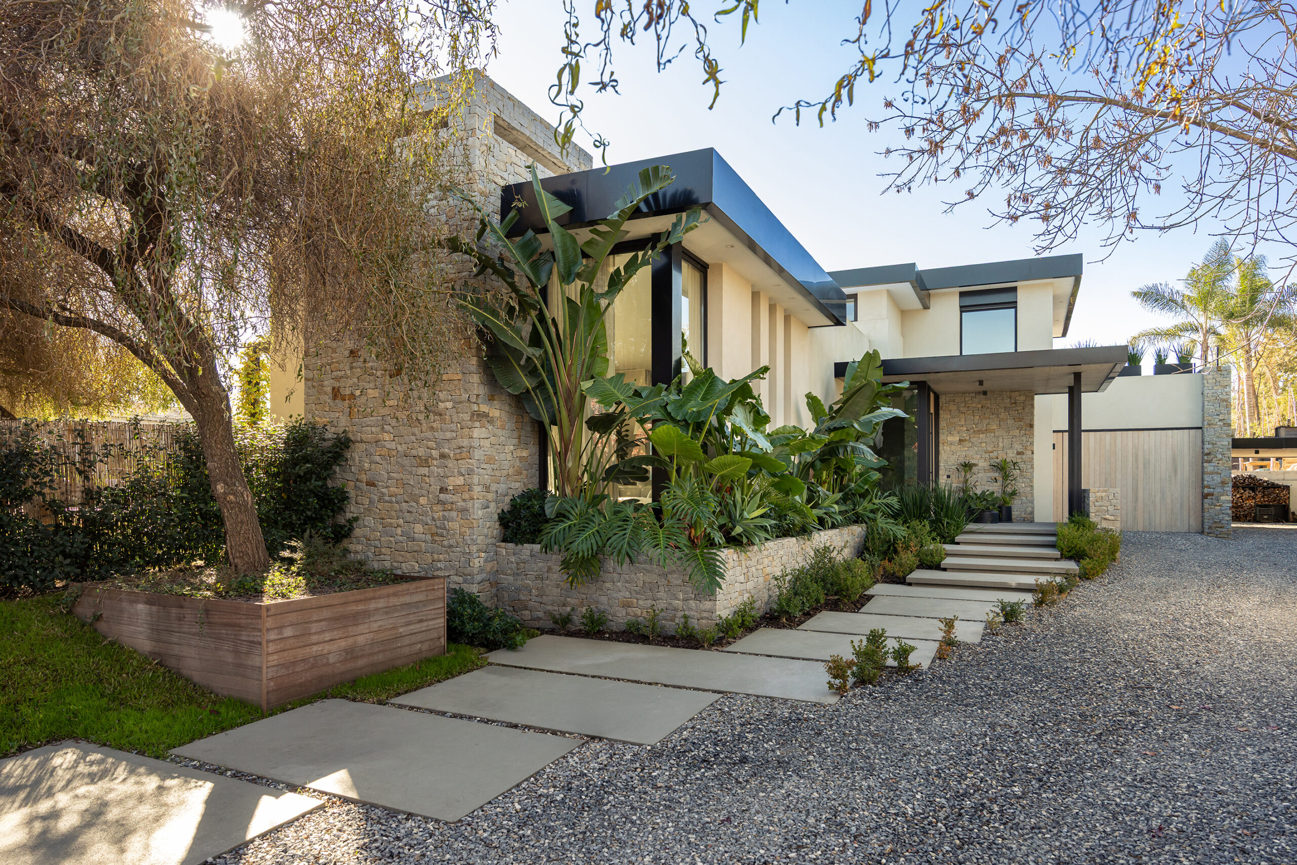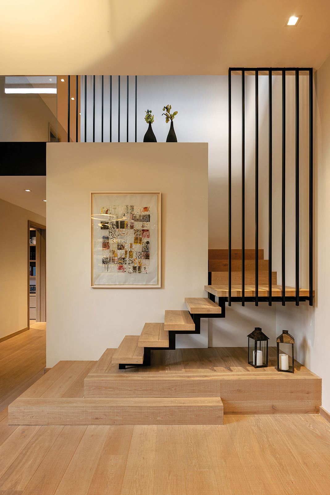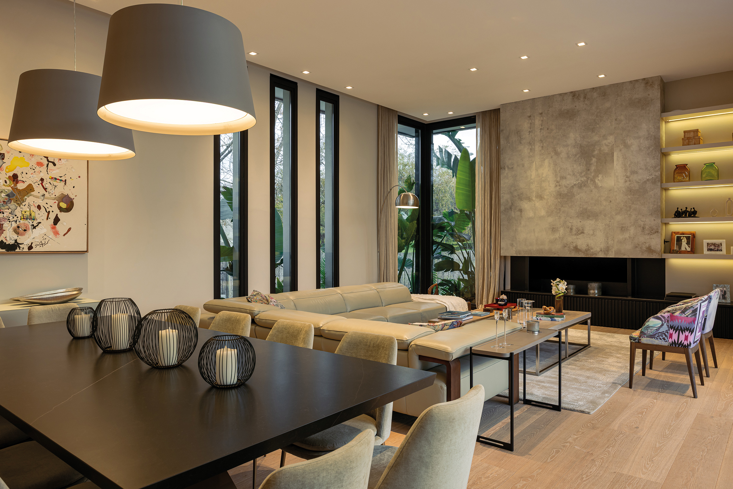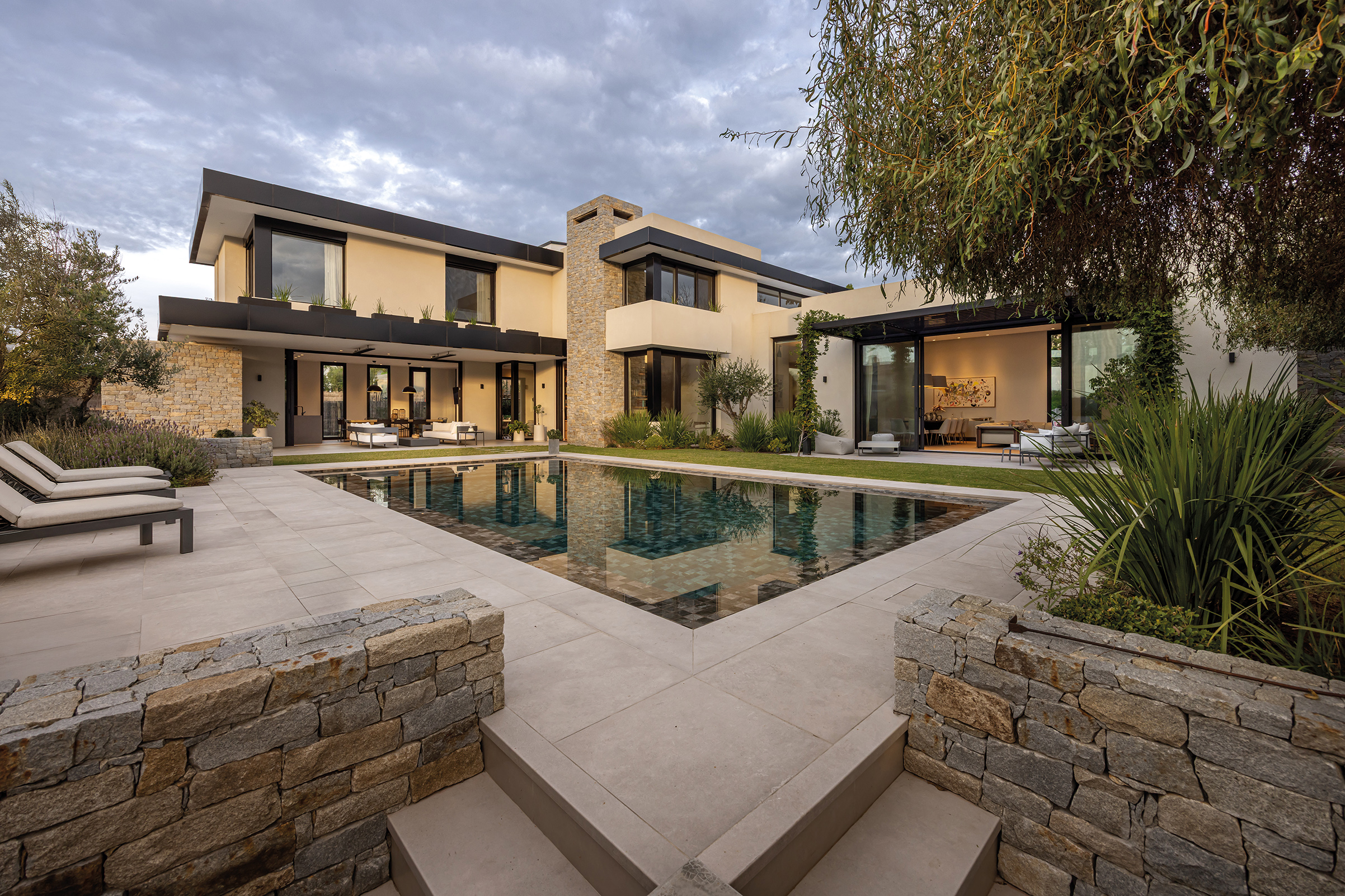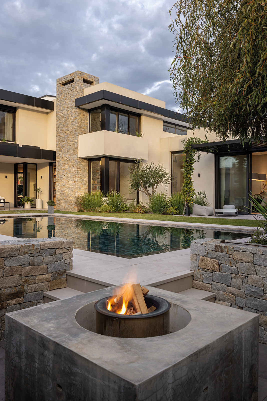 El acceso lateral no es un recurso casual: es parte de la dramaturgia del recorrido. Un sendero de losas de hormigón escoltado por una jardinera exuberante conduce hacia una fachada lateral que se impone como la verdadera entrada. Hay allí una composición rítmica de aberturas, aleros de alucobond negro, ángulos vidriados que dialogan entre sí. El hall de acceso, a doble altura, es un espacio que se ve desde la calle y que al ingresar se abre, como un abanico, hacia múltiples escenas: el living con vistas hacia la piscina, un olivo que actúa como ancla visual, la escalera que asciende con elegancia, una cava para quinientas botellas que insinúa el culto hedonista del buen vivir.