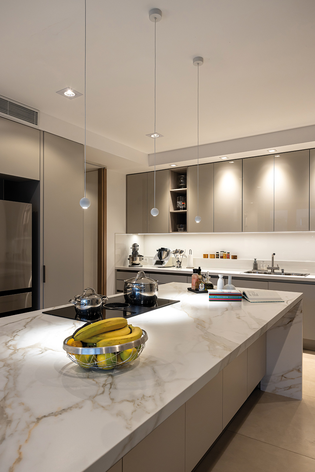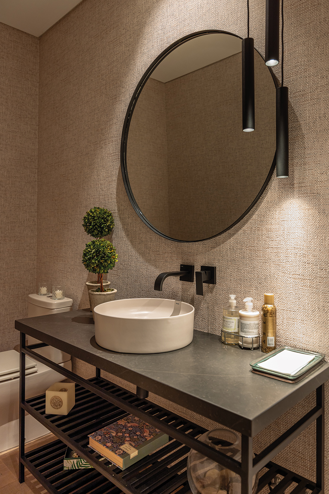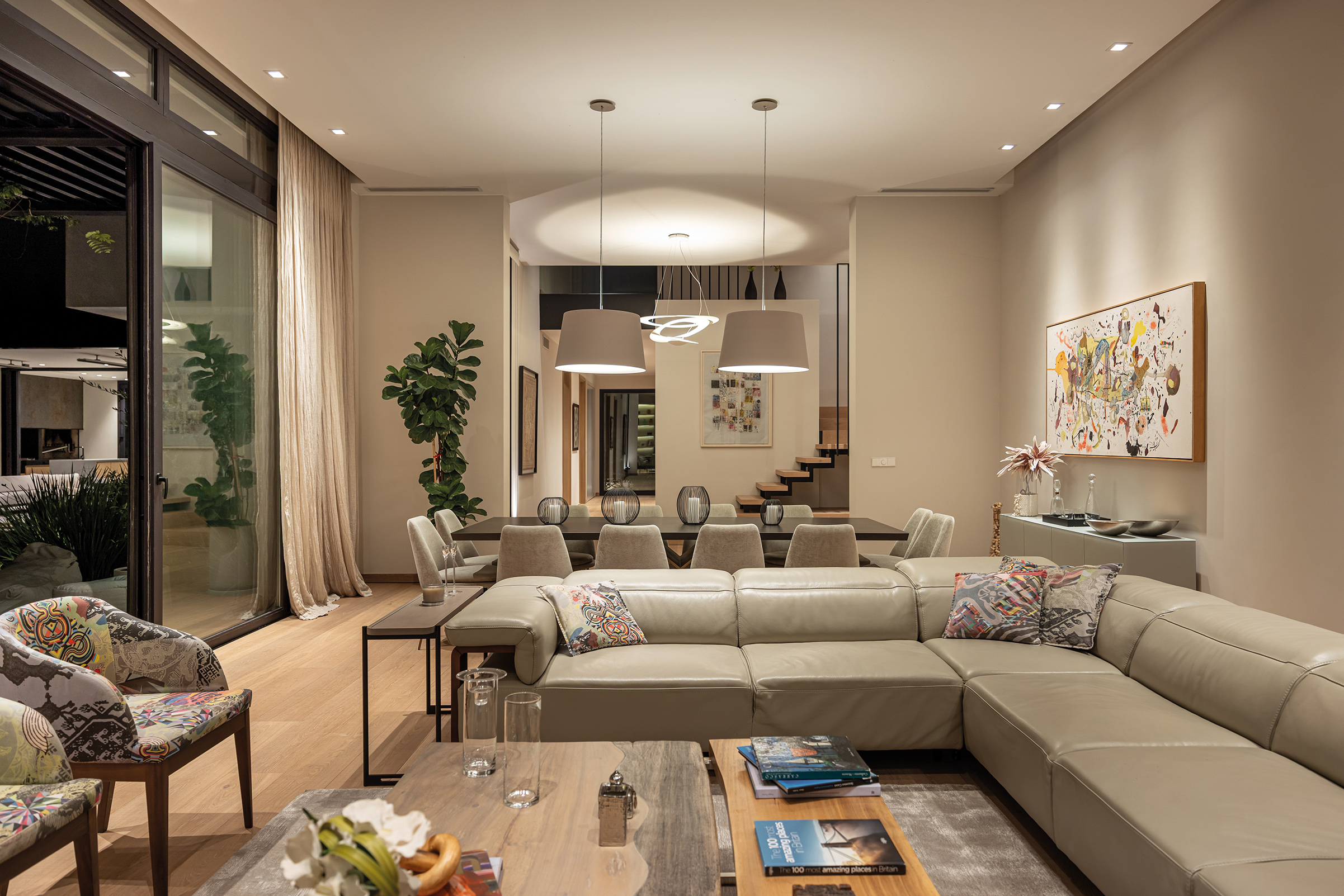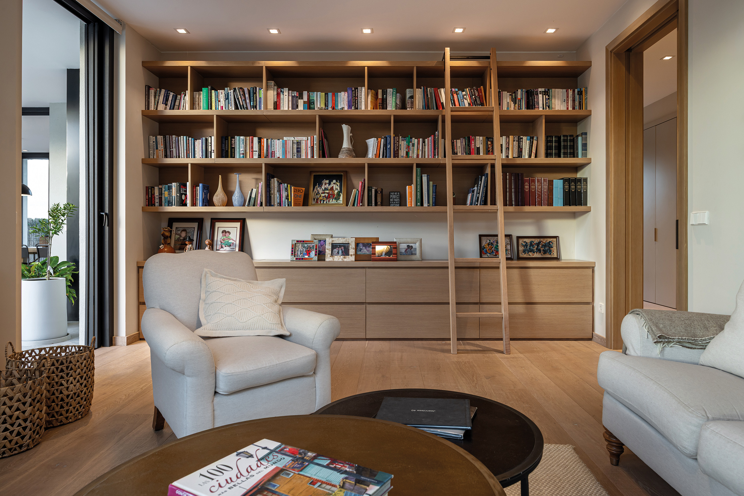 El acceso lateral no es un recurso casual: es parte de la dramaturgia del recorrido. Un sendero de losas de hormigón escoltado por una jardinera exuberante conduce hacia una fachada lateral que se impone como la verdadera entrada. Hay allí una composición rítmica de aberturas, aleros de alucobond negro, ángulos vidriados que dialogan entre sí. El hall de acceso, a doble altura, es un espacio que se ve desde la calle y que al ingresar se abre, como un abanico, hacia múltiples escenas: el living con vistas hacia la piscina, un olivo que actúa como ancla visual, la escalera que asciende con elegancia, una cava para quinientas botellas que insinúa el culto hedonista del buen vivir.