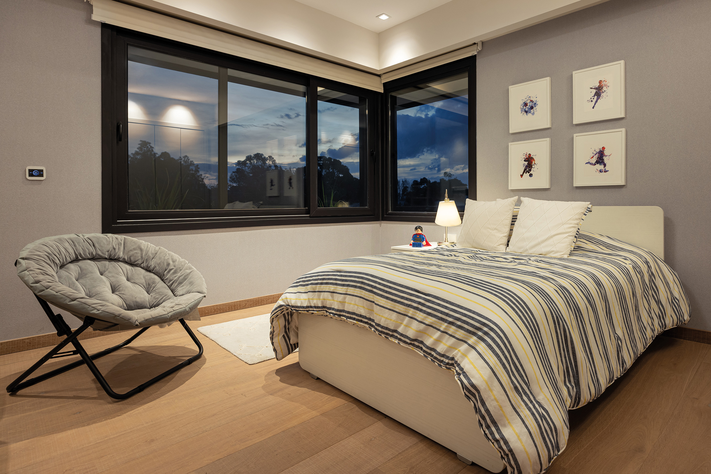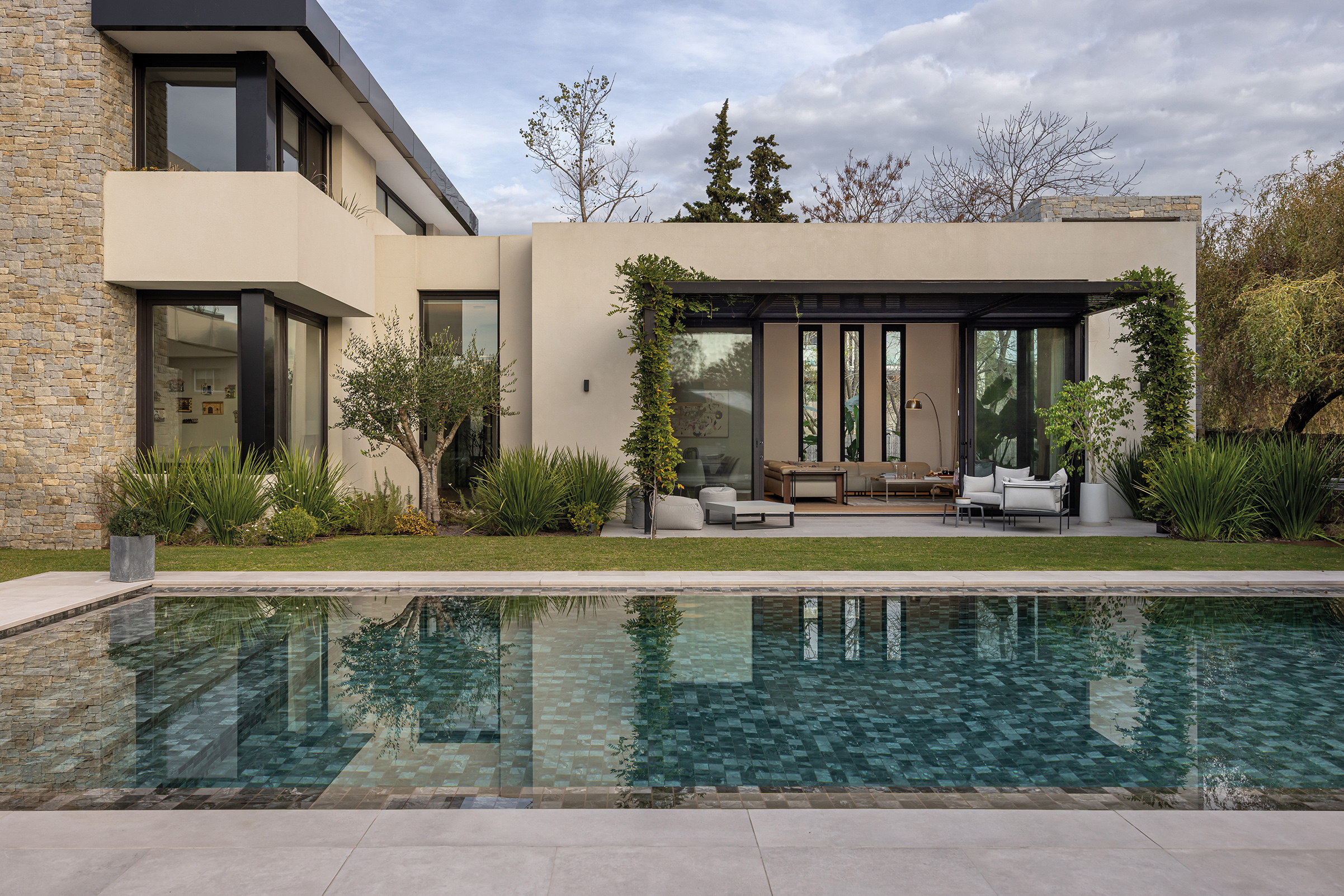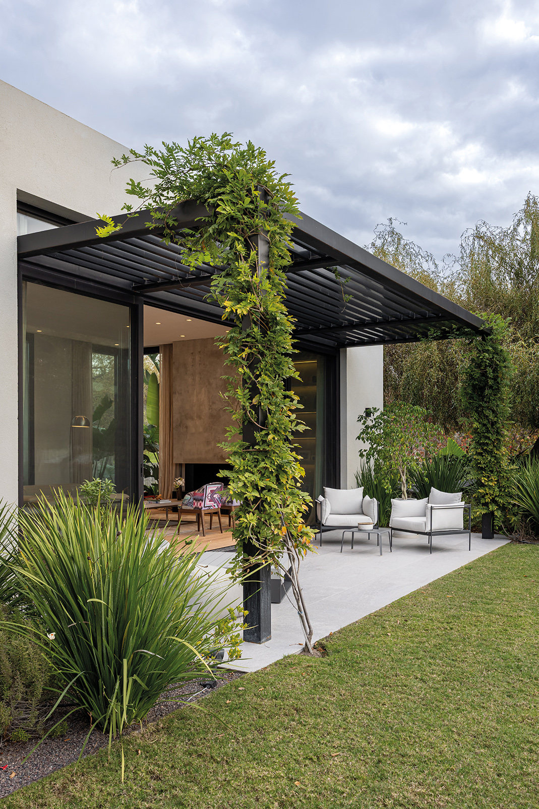 Toda la casa responde a un principio: la permeabilidad. No se trata solo de abrir ventanas, sino de pensar el espacio como una secuencia continua entre interior y exterior. Pérgolas con glicinas, galerías pensadas para desayunar al sol, un estar exterior como prolongación de la barbacoa: la arquitectura aquí no es límite sino umbral. Cada espacio techado o semicubierto actúa como membrana entre lo doméstico y lo natural. La luz —esa materia prima invisible— cambia a lo largo del día y del año, y fue tratada como protagonista desde el inicio. Las orientaciones fueron cuidadosamente distribuidas: Oeste y Norte para el estar, Este para cocina y servicios, ángulos vidriados para el playroom y una vista siempre abierta hacia un jardín que desdibuja todo límite con los padrones vecinos. La planta baja despliega también una colección de placeres discretos: barbacoa abierta hacia un estar exterior techado, área de juegos, baño para uso exterior, piscina, fire pit entre árboles centenarios. Hay incluso una canchita de fútbol escondida, sumergida al nivel de la vereda, como un secreto lúdico del paisaje. En el ala derecha, los espacios de servicio —lavadero, suite de servicio, garaje cerrado y una cochera abierta— concluyen en un gesto inesperado: una huerta desbordante plantada sobre la cubierta, que convierte un deseo práctico en acto poético. En planta alta, cuatro suites ordenan la vida íntima. La principal, generosa y orientada a la esquina, cuenta con vestidores y baño compartimentado. Las tres restantes, pensadas para los hijos, retoman el juego de ventanas en ángulo y conservan la amplitud, la luz, el silencio. Aquí también la arquitectura evita el énfasis y prefiere la armonía.