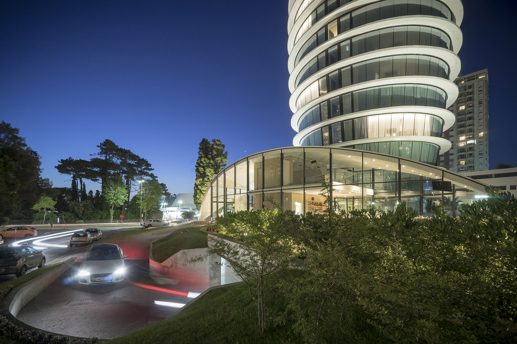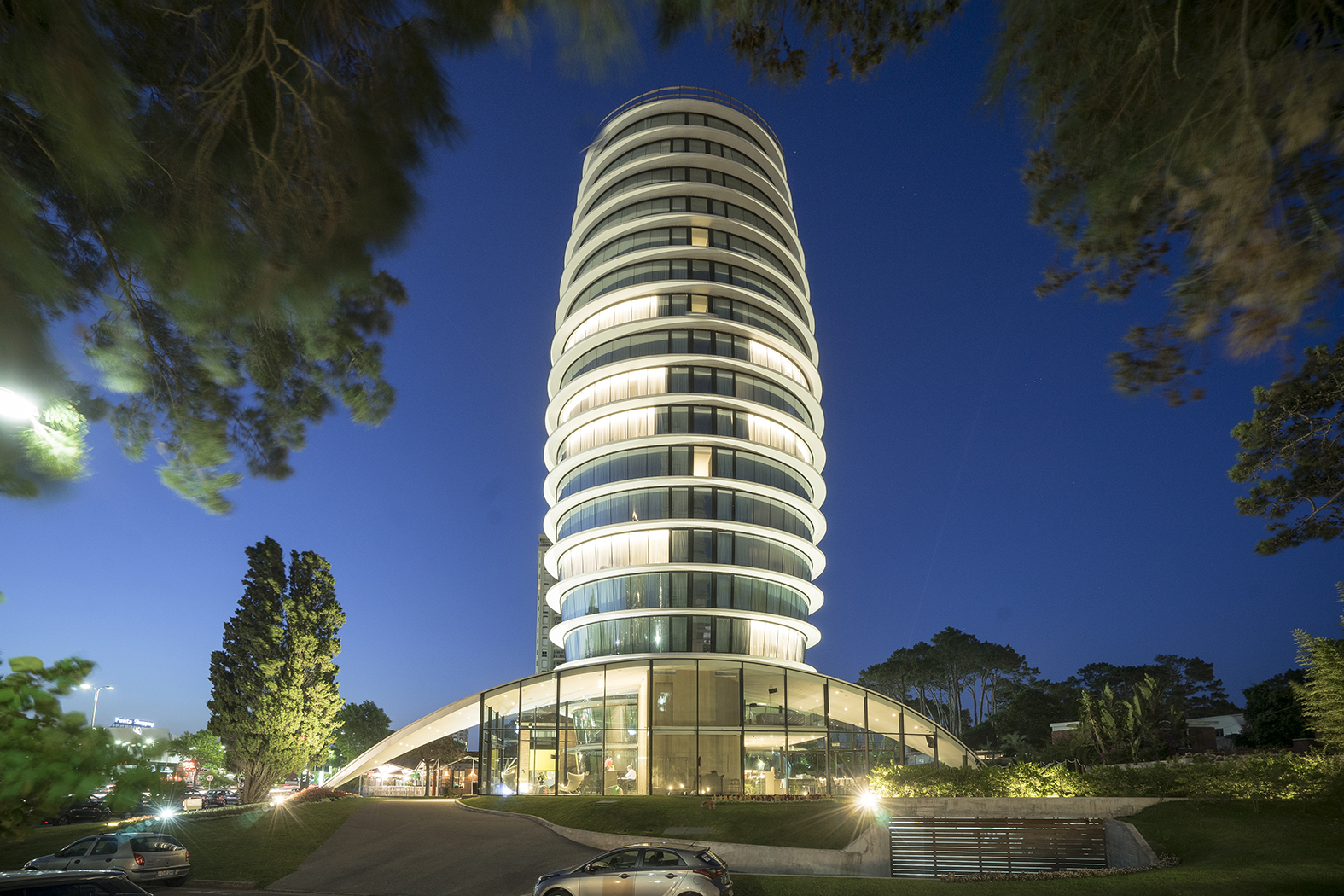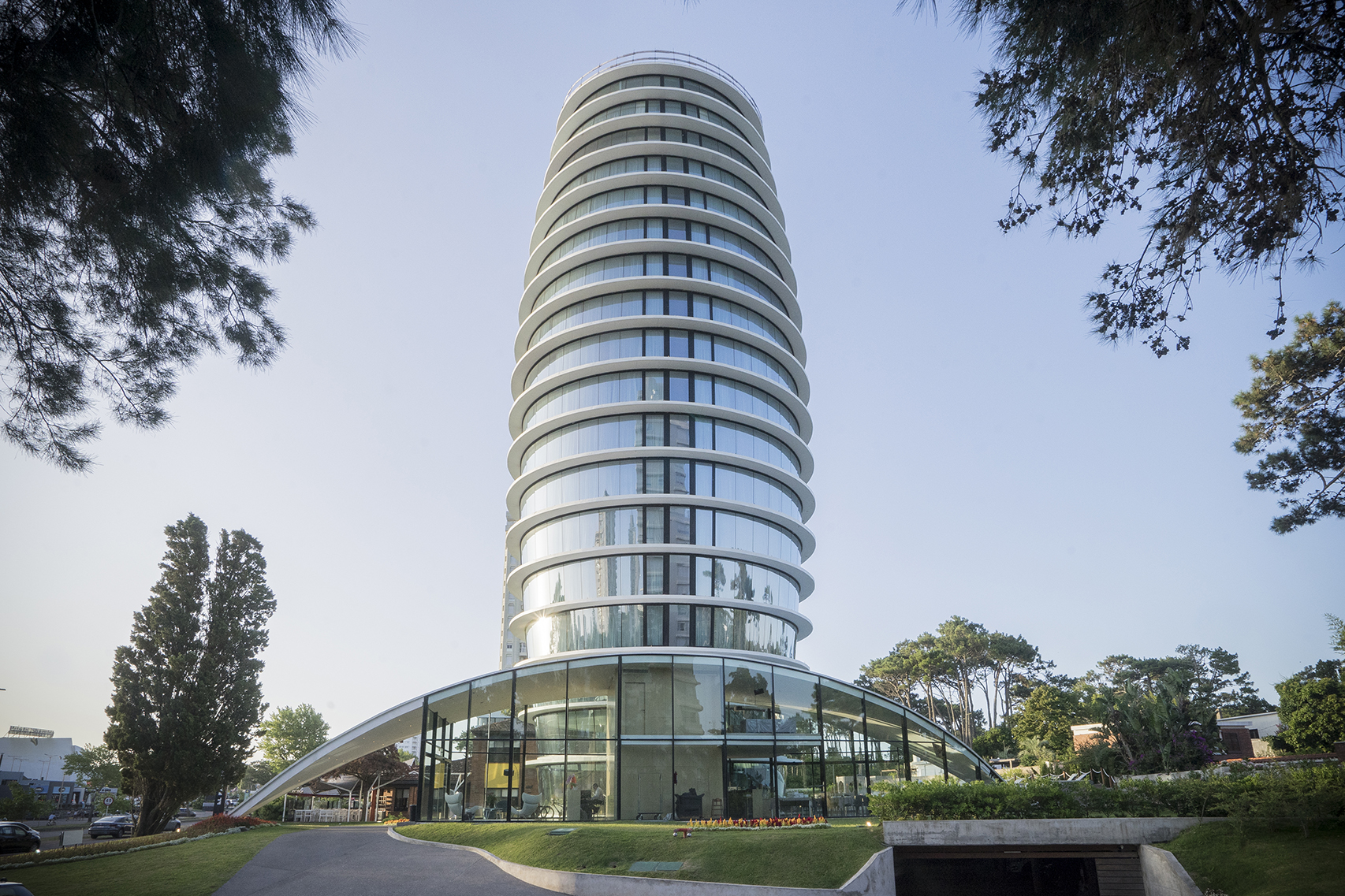 El hotel ofrece 54 habitaciones, de las cuales 50 son estándar y 4 son suites. En cuanto a las amenities, el hotel ofrece cafetería, gimnasio, sauna, piscina interior y exterior, y sala de conferencias. Adicionalmente está el Restaurante El Palenque, el cual es incorporado al proyecto a fin de que apoye al programa del hotel. La transparencia aparece en el hotel como un principio fundamental que acompaña a la forma. Es precisamente la conjunción de estas dos características, la singular configuración formal y la transparencia, lo que le confiere al proyecto su particular luminosidad. El resultado es una arquitectura escultórica, única, elegante y futurista, que además del confort de sus instalaciones, ofrece un deleite estético tanto a huéspedes como a aquellos quienes alcen su mirada sobre el cielo de Punta del Este.