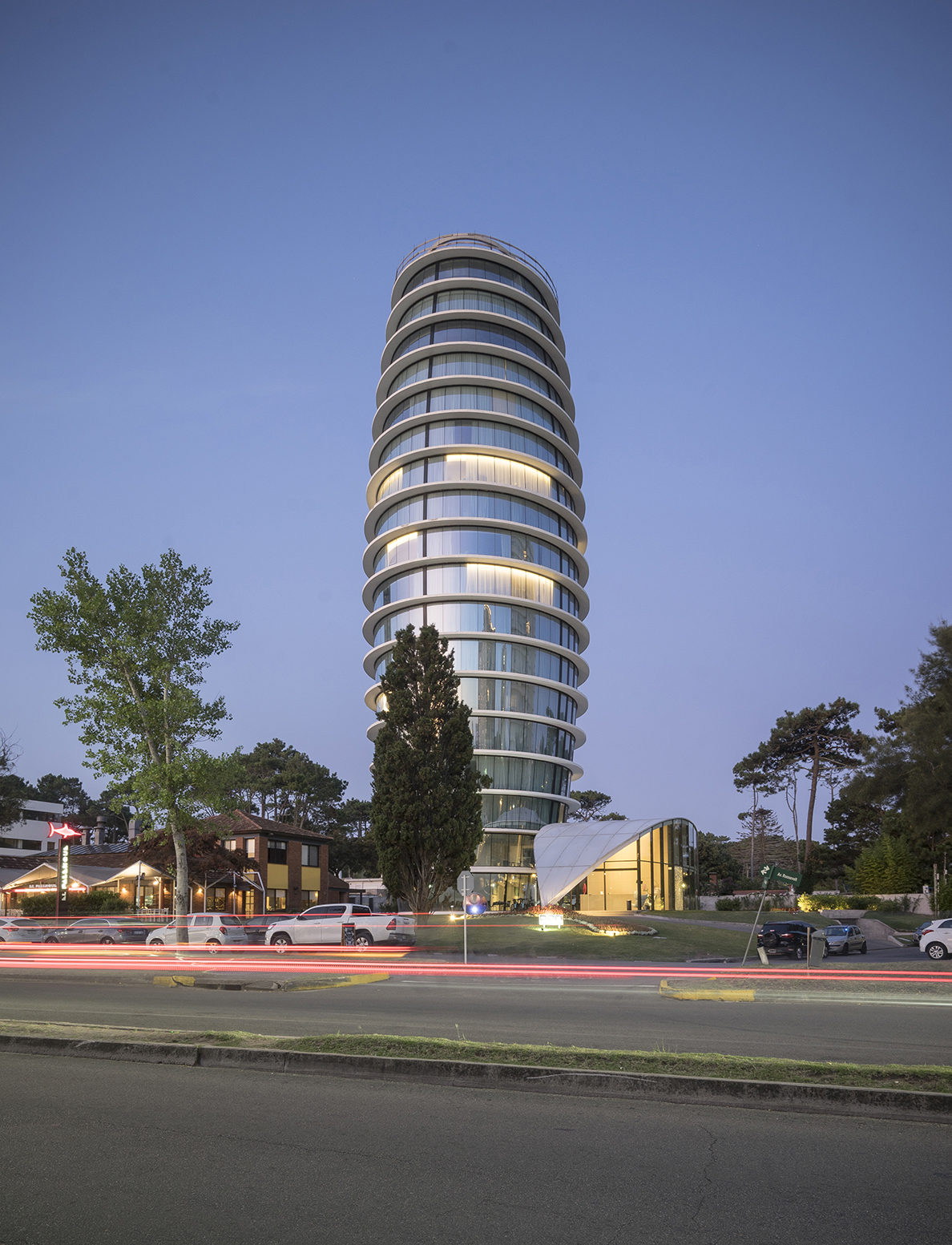 Don Hotel es el edificio, con forma de bala, que se levanta sobre la avenida Roosevelt, frente al complejo del Punta Shopping. Alineado con el famoso restaurante El Palenque, propiedad del mismo grupo inversor, propone un paisaje emblemático para la sustantiva arteria urbana. La arquitectura de este hotel se inscribe en una tendencia contemporánea que busca la consecución de piezas hoteleras de trazos simples, fáciles de evocar, que terminen por constituir un ícono distintivo del lugar en el que se emplazan. En este sentido, el proyecto logra ampliamente su cometido, al proponer un volumen reconocible, con una configuración única, que rompe con lo proyectado hasta ahora en el contexto local.