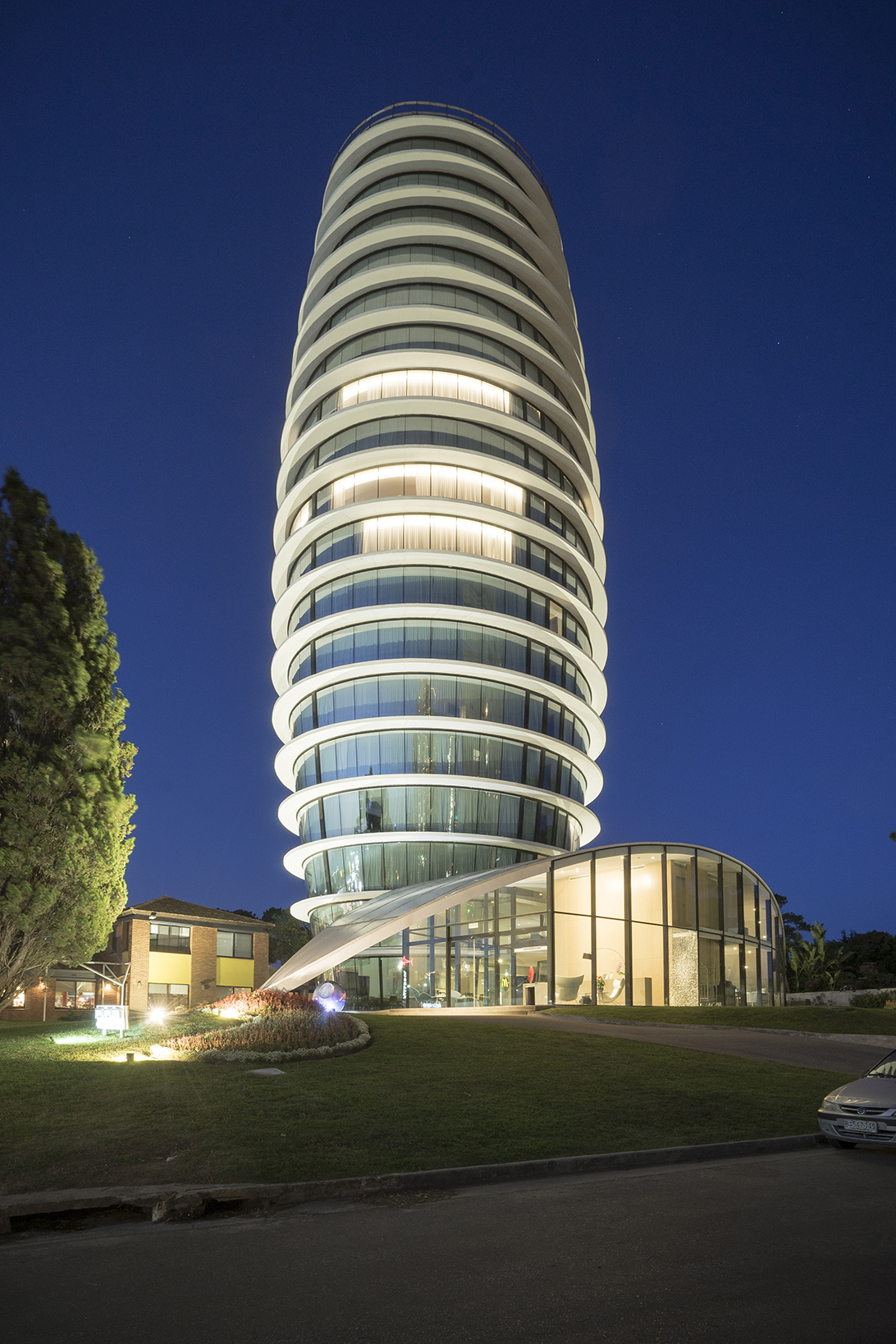 El proyecto estuvo a cargo del estudio Guevara Ottonello Arquitectos, y consiste en un conjunto articulado por un volumen principal en forma de torre, acompañado por un sinuoso volumen bajo. El primero de los volúmenes concentra el conjunto de habitaciones del hotel. El segundo, alberga los servicios y un amplio conjunto de amenities.