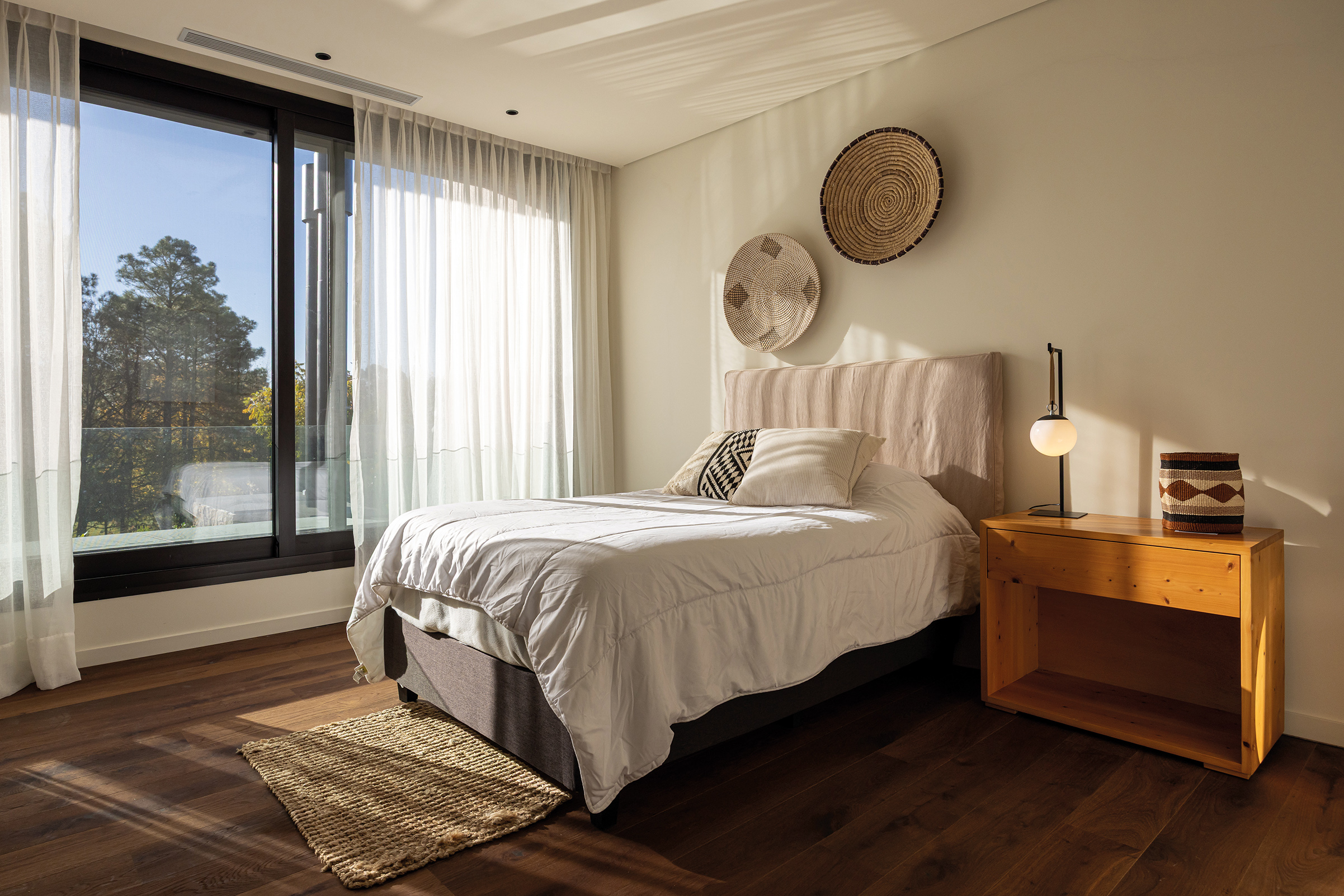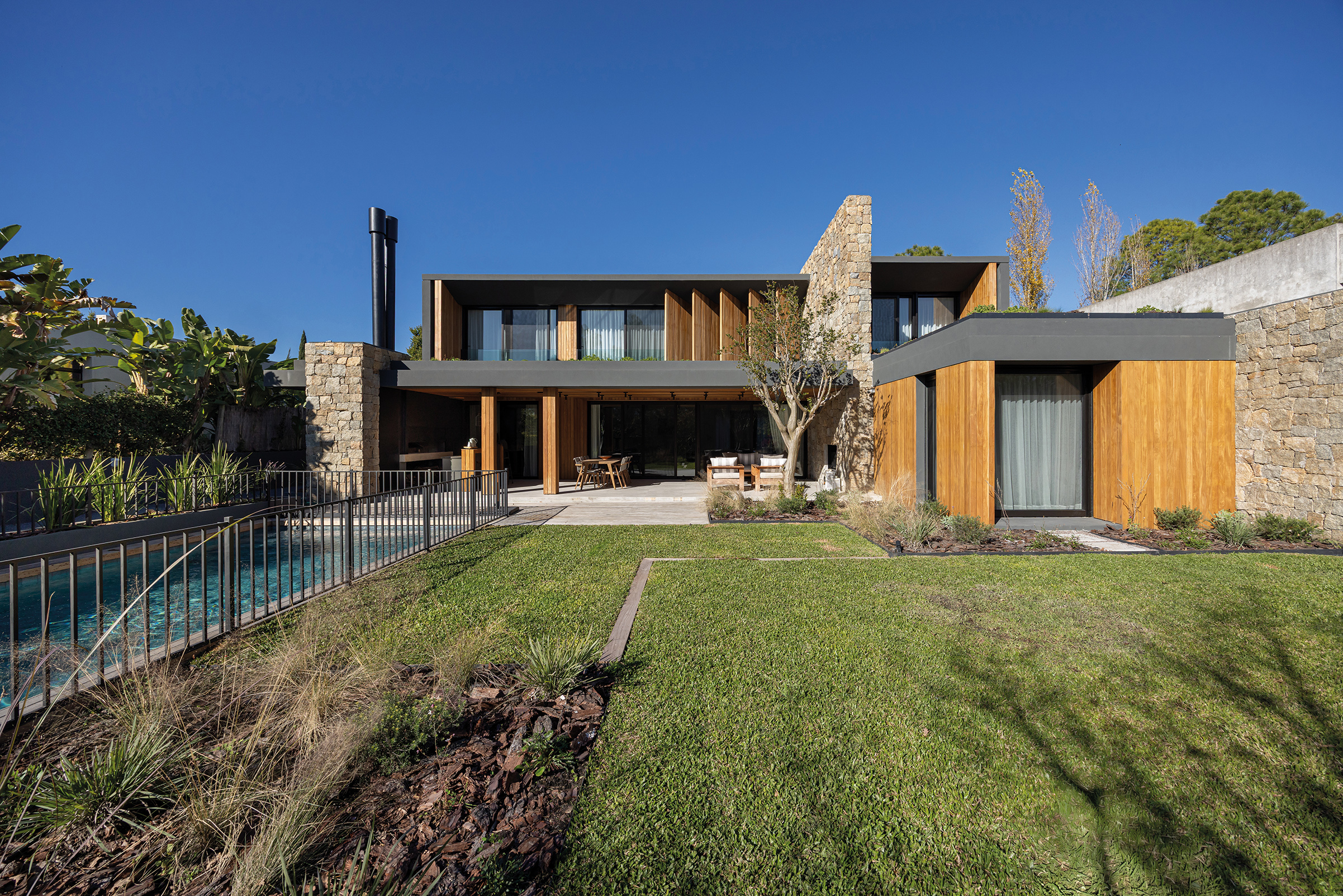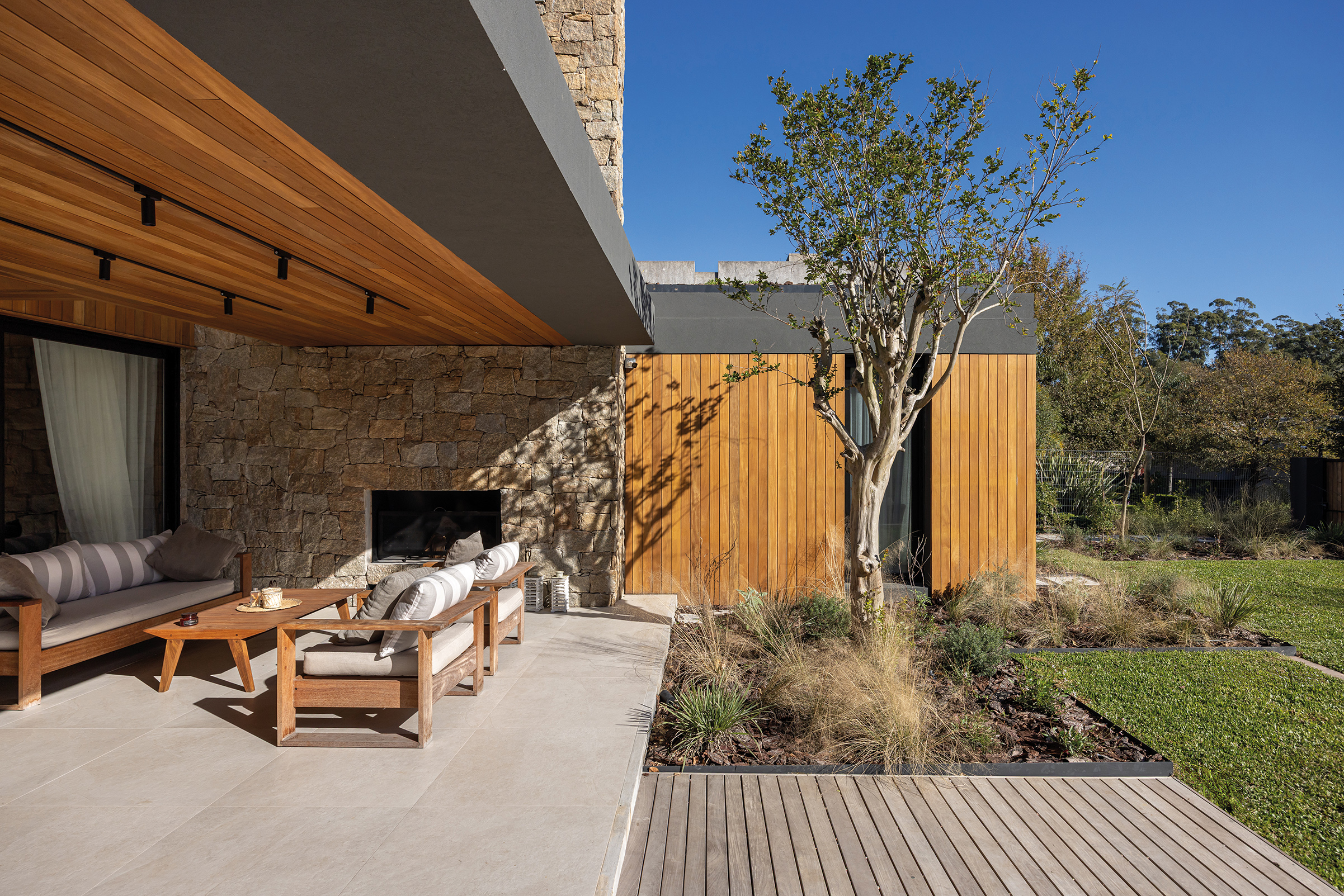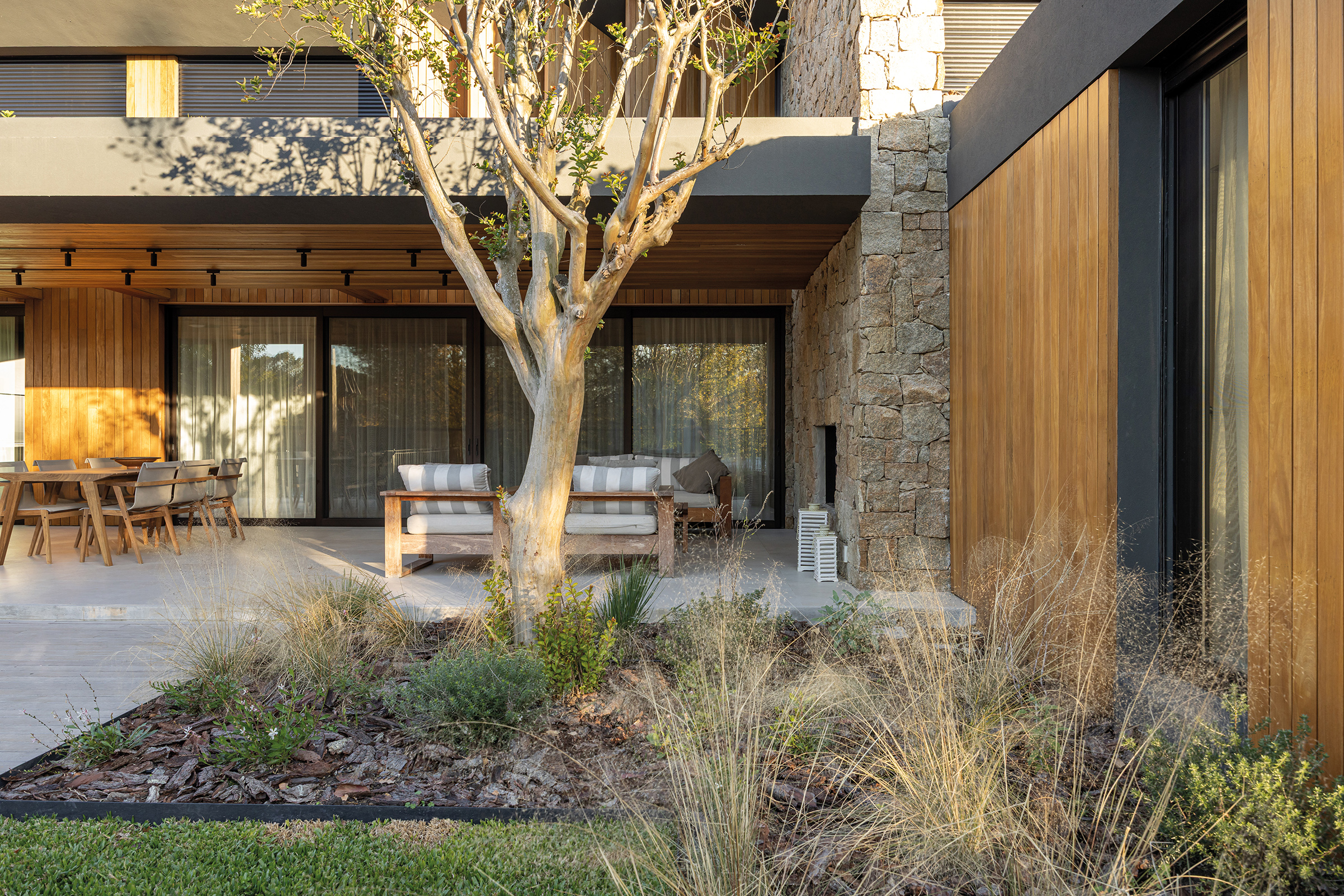 La materialidad del conjunto fue elegida con rigor y sensibilidad. Se trabajó con una paleta austera, coherente, donde prevalecen los materiales nobles: piedra natural, madera tratada, revoques textura dos. Nada es ostentoso, todo busca la armonía con el paisaje y con la vida que se proyecta en él. La casa no pretende destacar con estridencia, sino con carácter. Se diferencia de las construcciones vecinas porque no intenta imitarlas ni competir. Simplemente es. Se afirma con identidad propia, pero sin alardes.