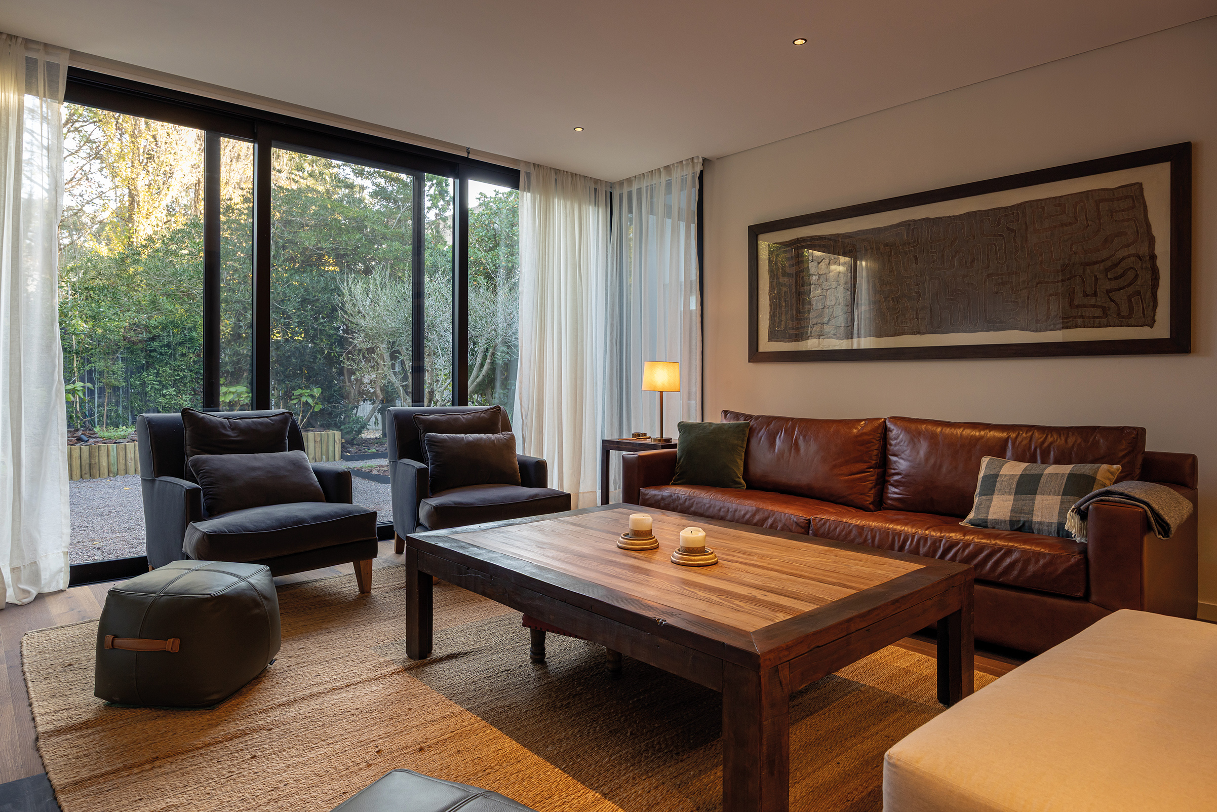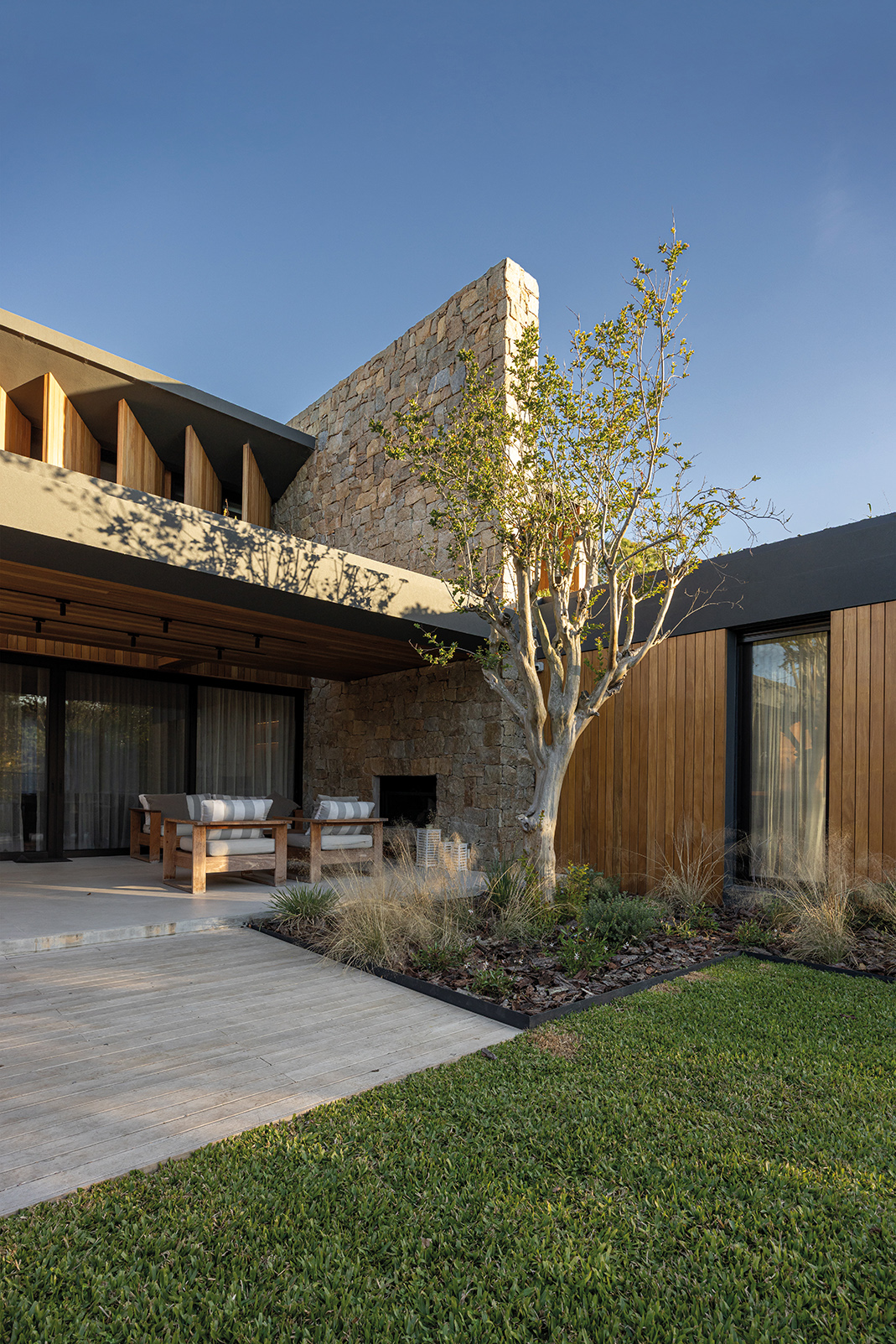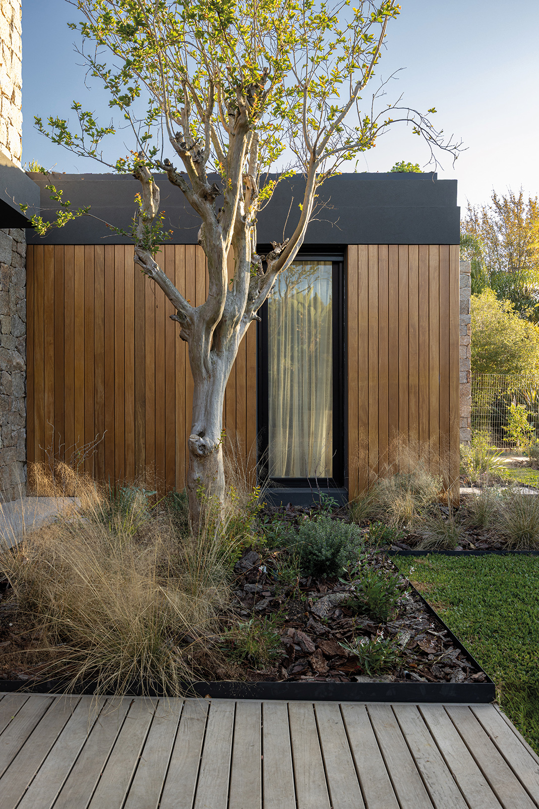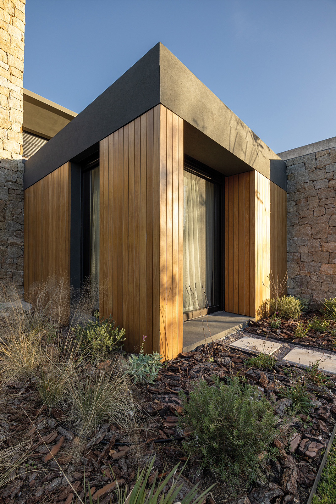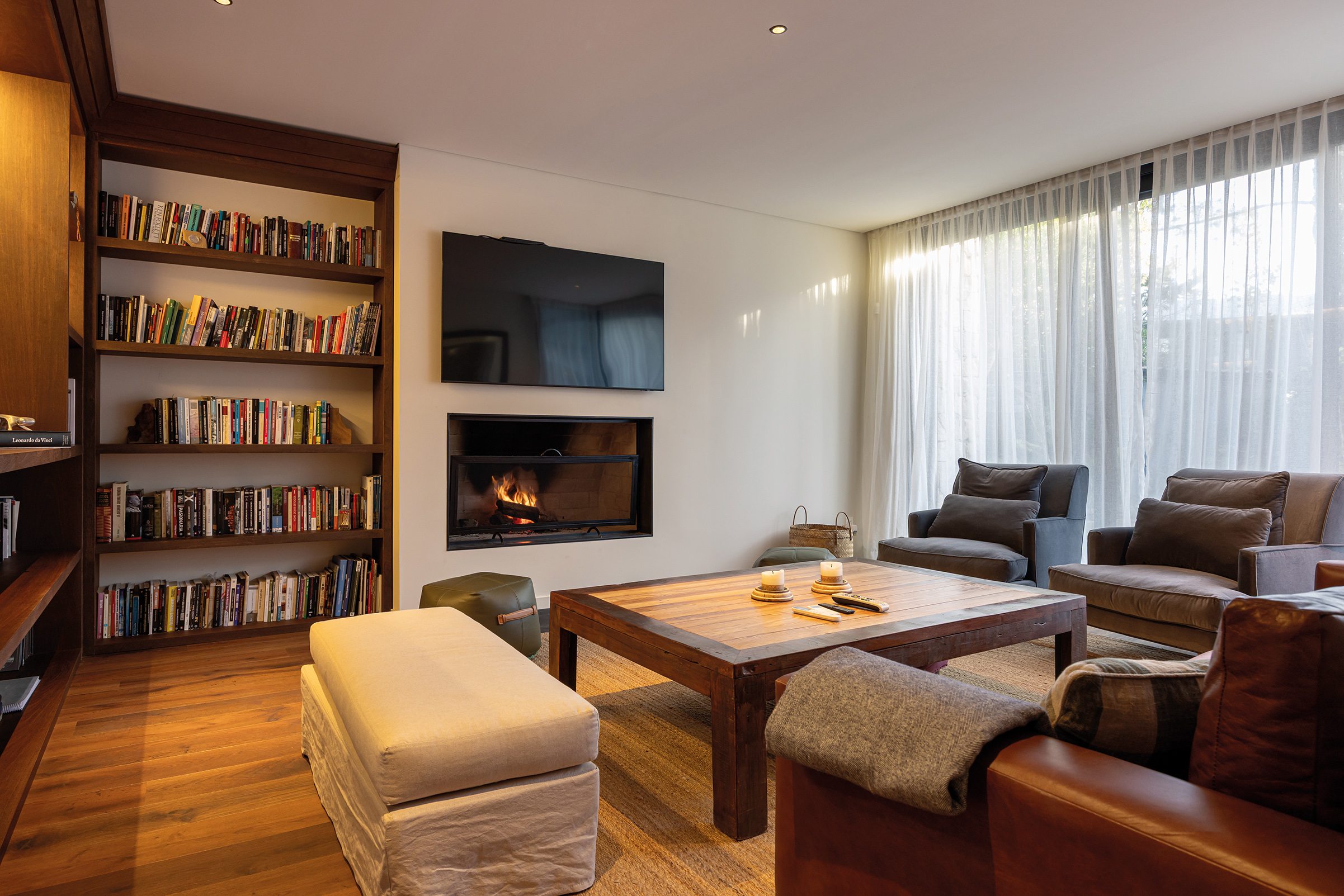 La materialidad del conjunto fue elegida con rigor y sensibilidad. Se trabajó con una paleta austera, coherente, donde prevalecen los materiales nobles: piedra natural, madera tratada, revoques textura dos. Nada es ostentoso, todo busca la armonía con el paisaje y con la vida que se proyecta en él. La casa no pretende destacar con estridencia, sino con carácter. Se diferencia de las construcciones vecinas porque no intenta imitarlas ni competir. Simplemente es. Se afirma con identidad propia, pero sin alardes.
