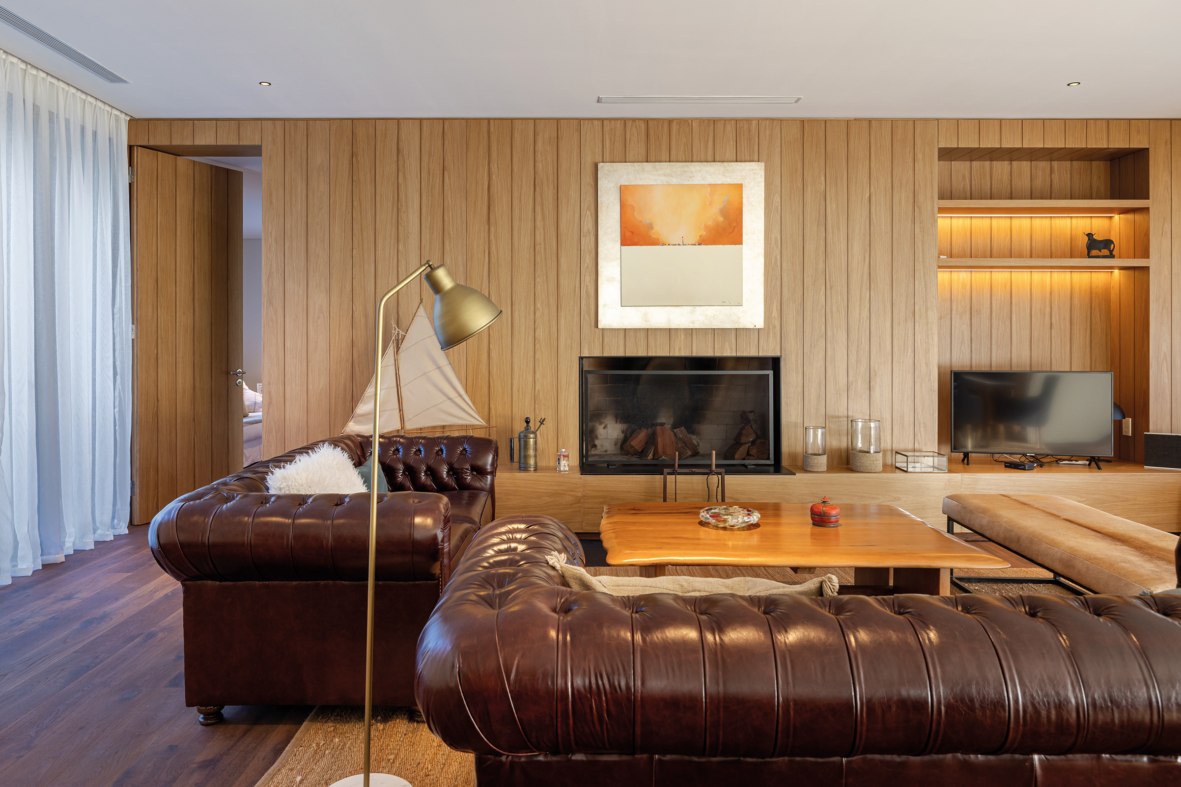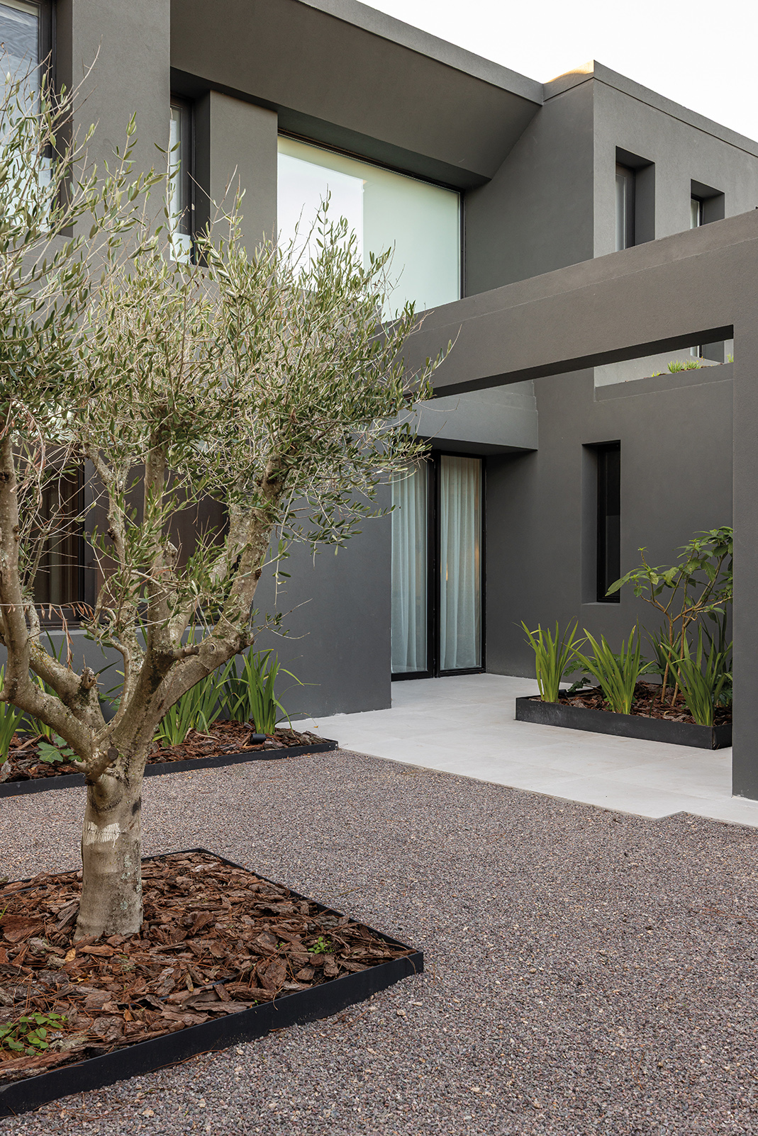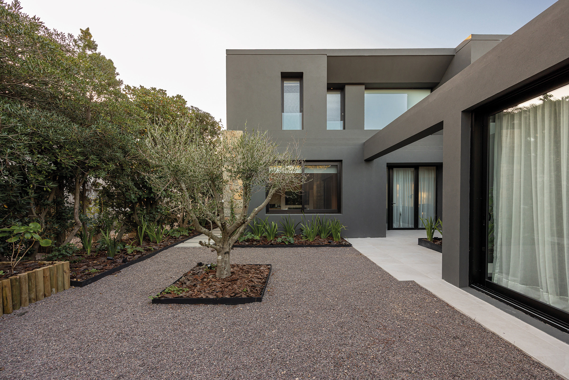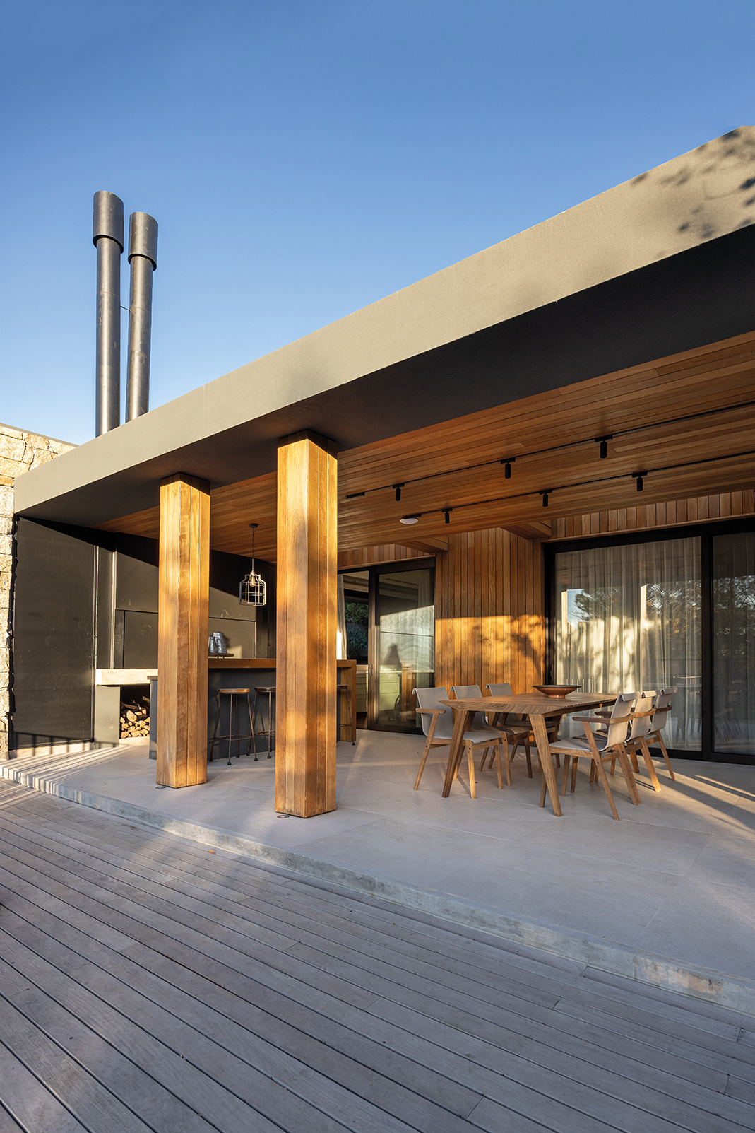 La materialidad del conjunto fue elegida con rigor y sensibilidad. Se trabajó con una paleta austera, coherente, donde prevalecen los materiales nobles: piedra natural, madera tratada, revoques textura dos. Nada es ostentoso, todo busca la armonía con el paisaje y con la vida que se proyecta en él. La casa no pretende destacar con estridencia, sino con carácter. Se diferencia de las construcciones vecinas porque no intenta imitarlas ni competir. Simplemente es. Se afirma con identidad propia, pero sin alardes.