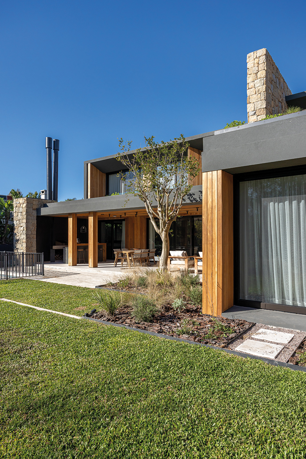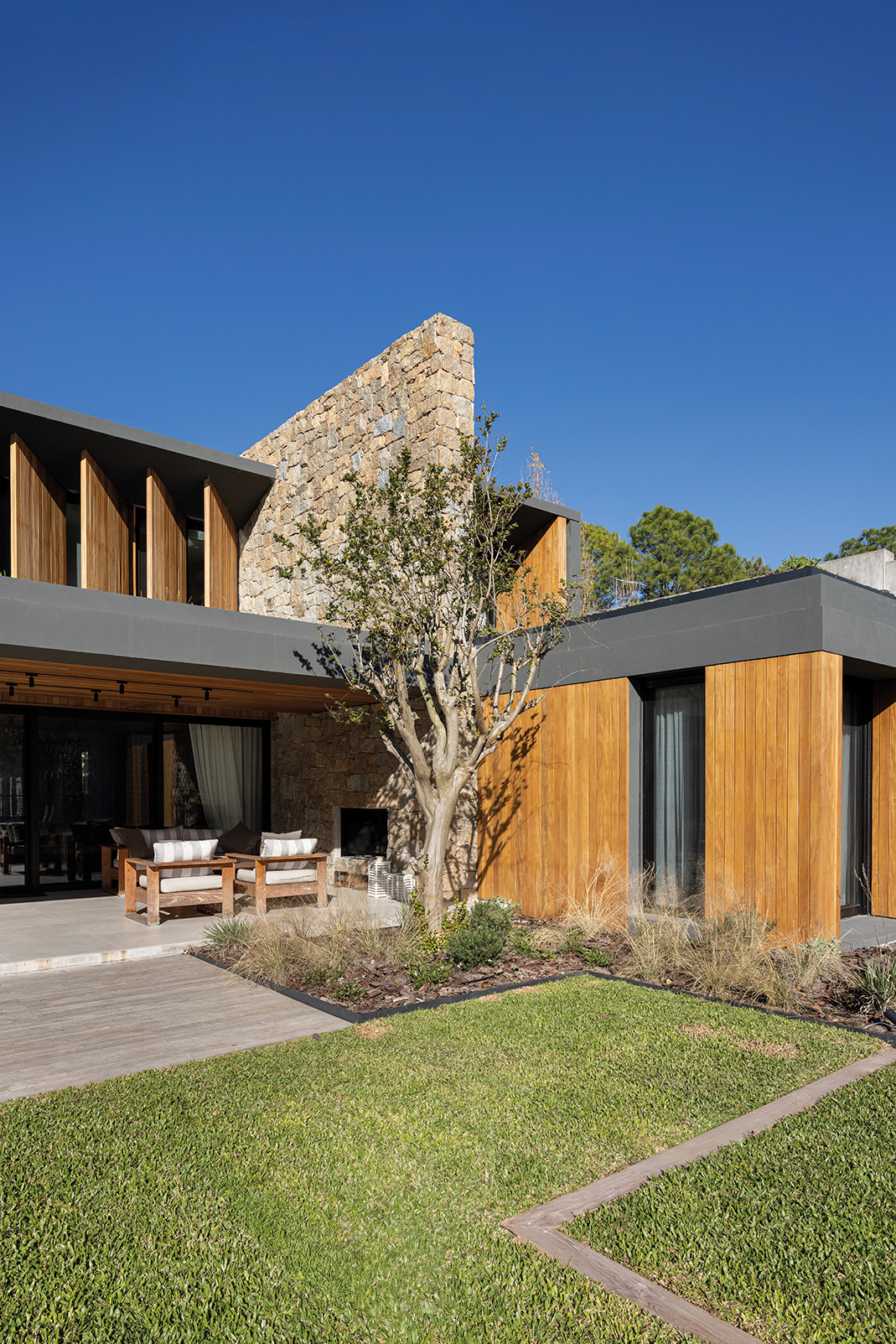 Formalmente, la casa se construye a partir de un diálogo de contrastes. La planta baja, revestida en piedra, se presenta como un basamento firme, anclado al terreno, casi geológico. Encima, la planta alta se posa con mayor liviandad, como si flotara. Esta operación refuerza la jerarquía de los materiales y otorga a la casa una lectura visual clara: lo pétreo sostiene, lo liviano se posa. El plano vertical de piedra que articula ambos niveles adquiere protagonismo y carga simbólica; es muro y es columna, es espina dorsal y es gesto expresivo.