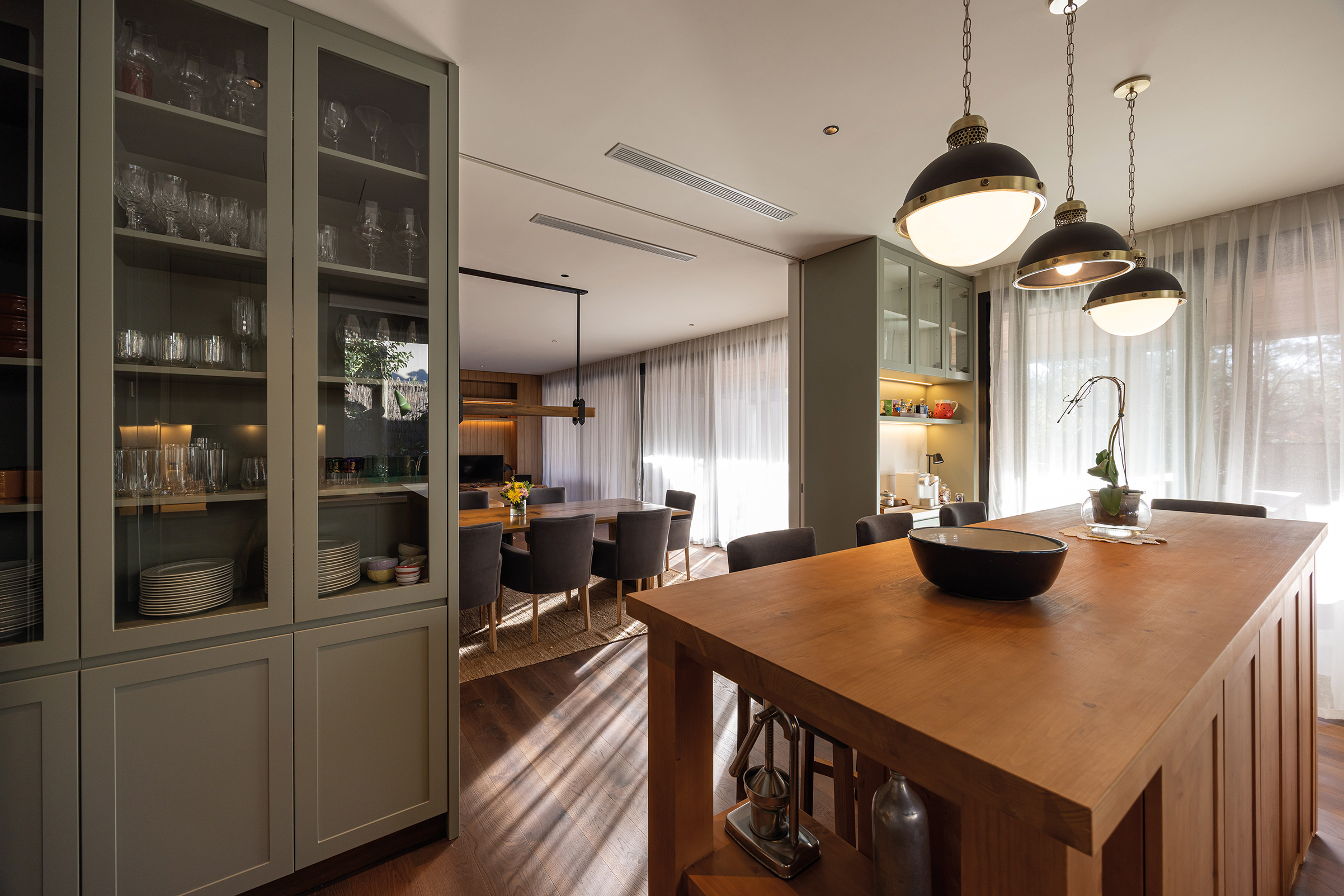 La cocina, lejos de ser un espacio secundario o aislado, fue pensada como el núcleo afectivo de la casa. La solicitud del cliente fue precisa: la cocina debía ser el centro. Y la arquitectura respondió con generosidad, integrándola al living-comedor y a la galería exterior, en una secuencia continua que diluye los límites entre interior y exterior. Esta articulación espacial transforma la cocina en escenario principal del día a día, y rompe con el viejo esquema que la relegaba a lo doméstico y oculto. Aquí, se cocina a la vista, con el paisaje como telón de fondo y la familia como espectadora activa.