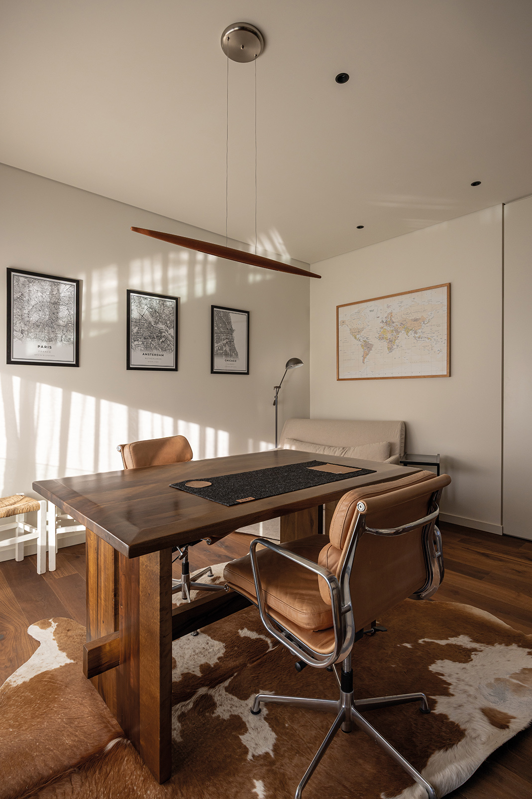 La superficie total construida alcanza los 580 metros cuadrados, pero el dato numérico poco dice si no se comprende el modo en que ese espacio fue distribuido. Cinco dormitorios, un estar íntimo que puede transformarse en escritorio, un estar social más expansivo, una cocina integrada y áreas de servicio componen el programa funcional. Sin embargo, el valor del proyecto no está en la enumeración de funciones, sino en la manera en que estas se vinculan entre sí, en la fluidez con que el habitar cotidiano se despliega.