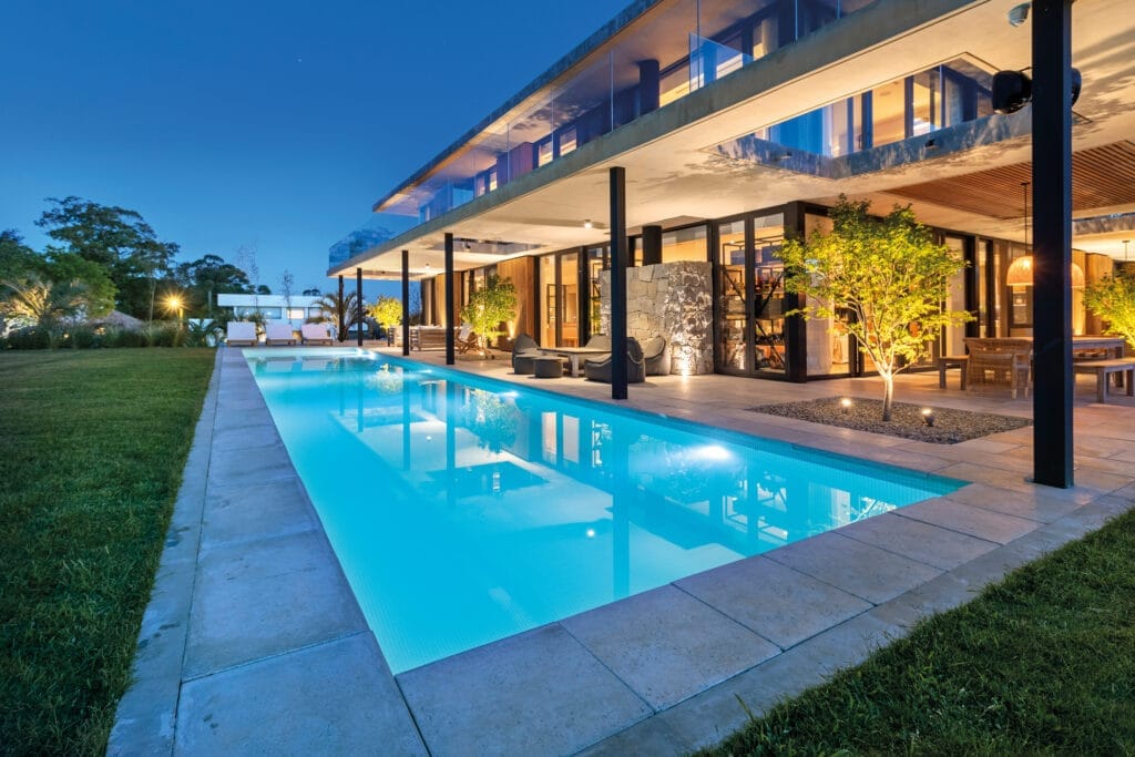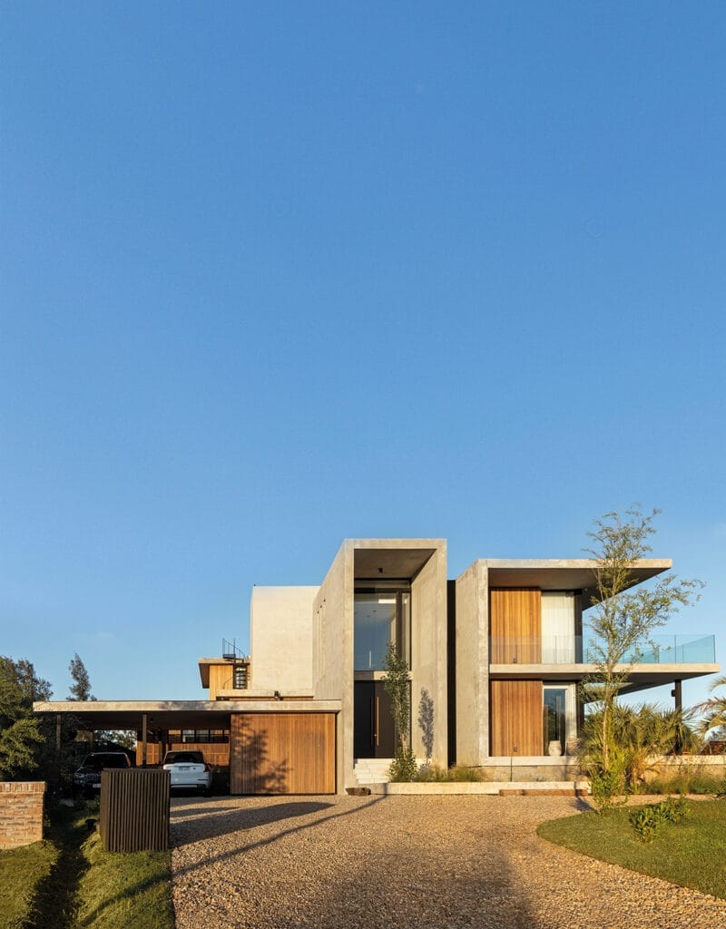 del asoleamiento y la orientación determinaron la estructura del proyecto. El resultado de las prolongadas entrevistas con los habitantes estableció un clima de trabajo fluido y armonioso que se traduce en la estética contemporánea que propone el volumen y la integración natural con el paisaje que propone. La materialidad es austera y efectiva, apela al hormigón, la madera, el vidrio y la piedra utilizada como recurso puntual.
