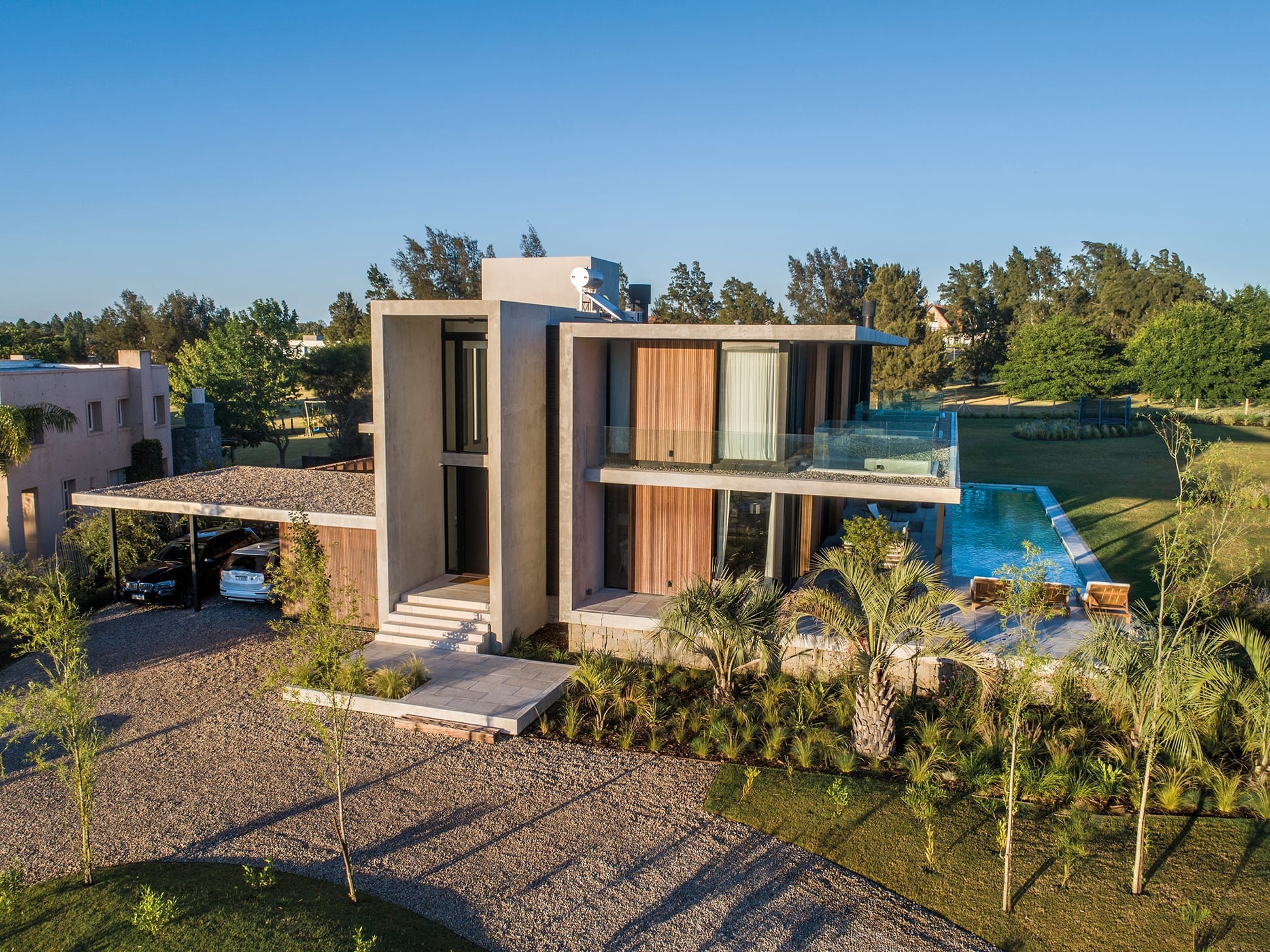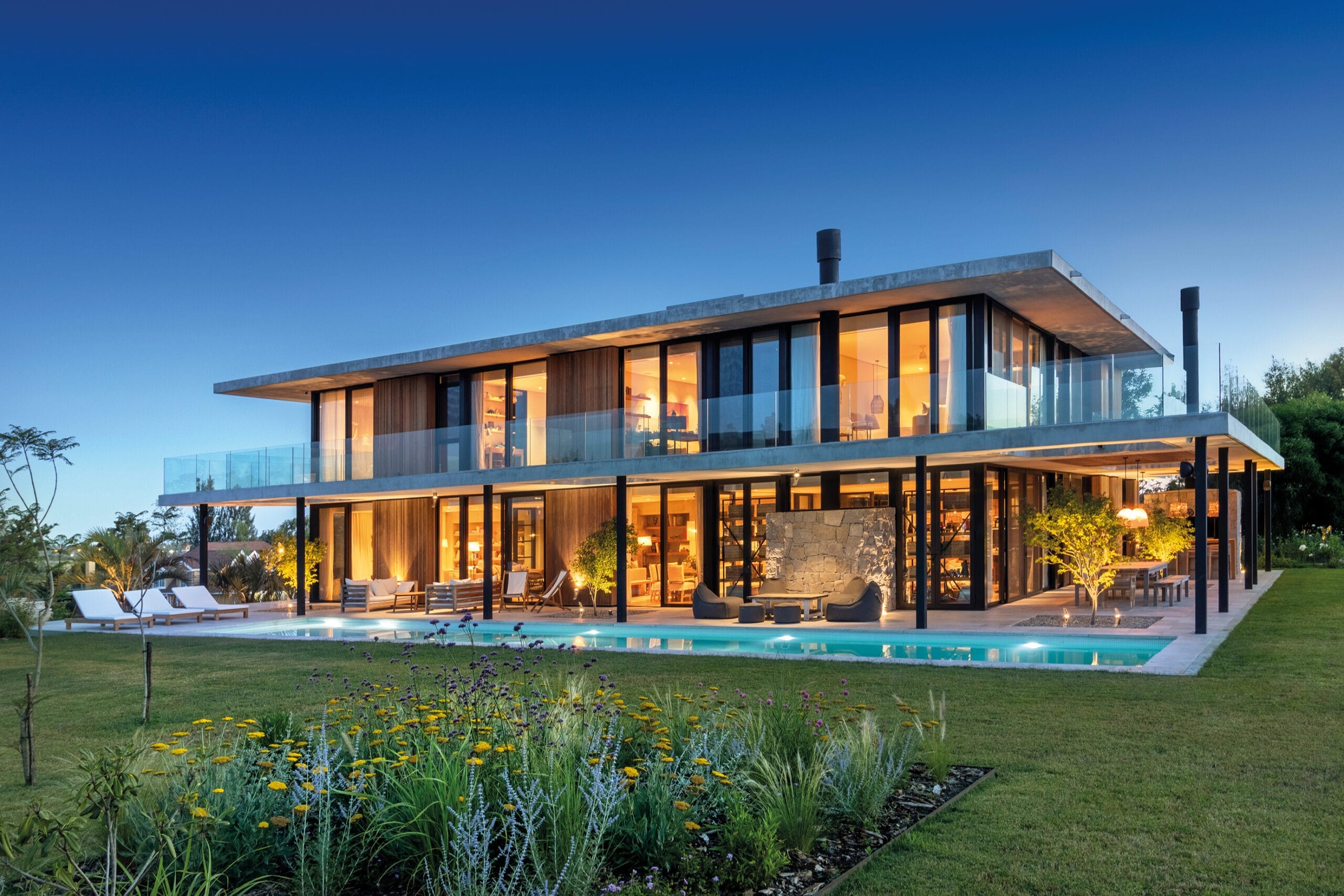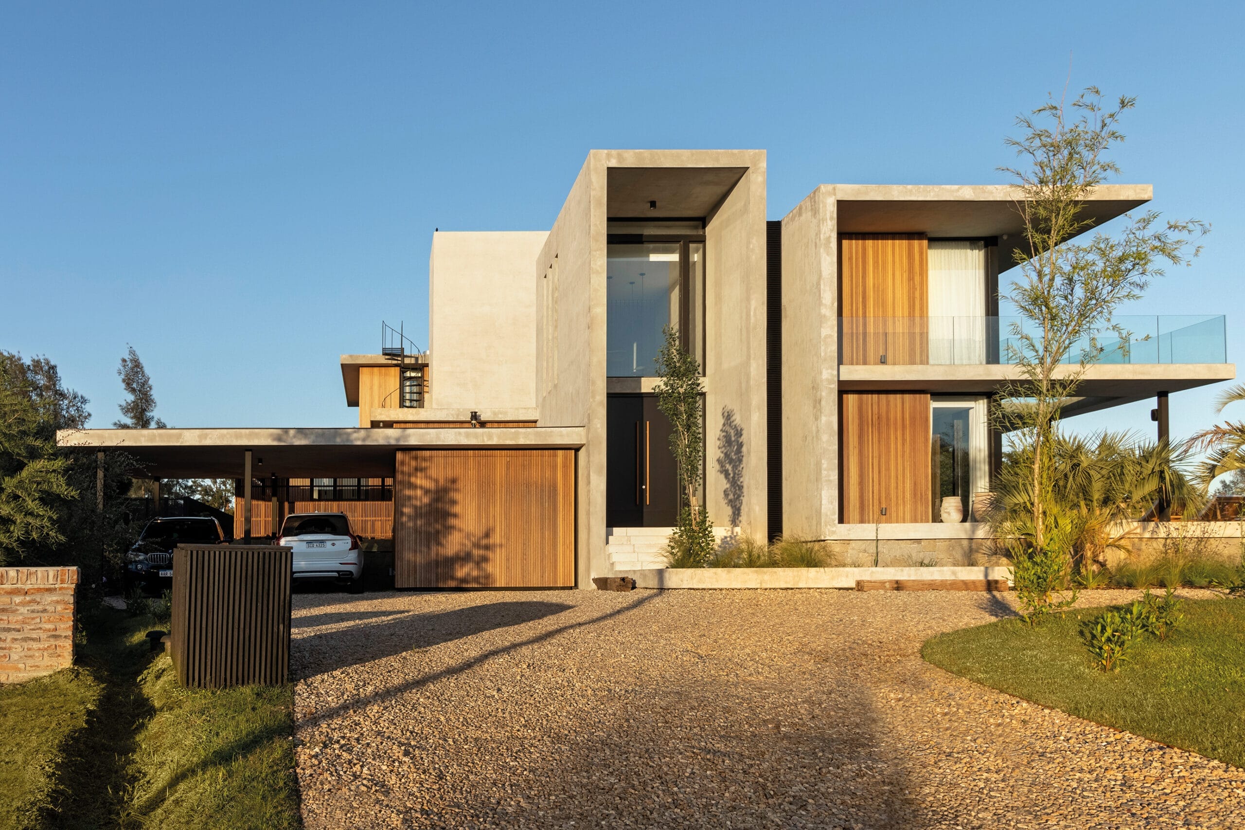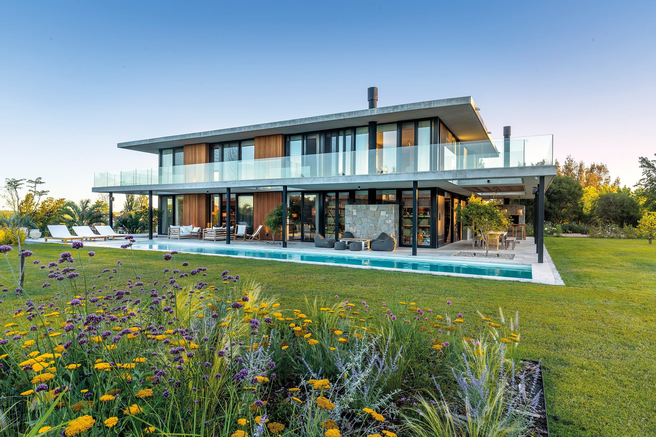 del asoleamiento y la orientación determinaron la estructura del proyecto. El resultado de las prolongadas entrevistas con los habitantes estableció un clima de trabajo fluido y armonioso que se traduce en la estética contemporánea que propone el volumen y la integración natural con el paisaje que propone. La materialidad es austera y efectiva, apela al hormigón, la madera, el vidrio y la piedra utilizada como recurso puntual.