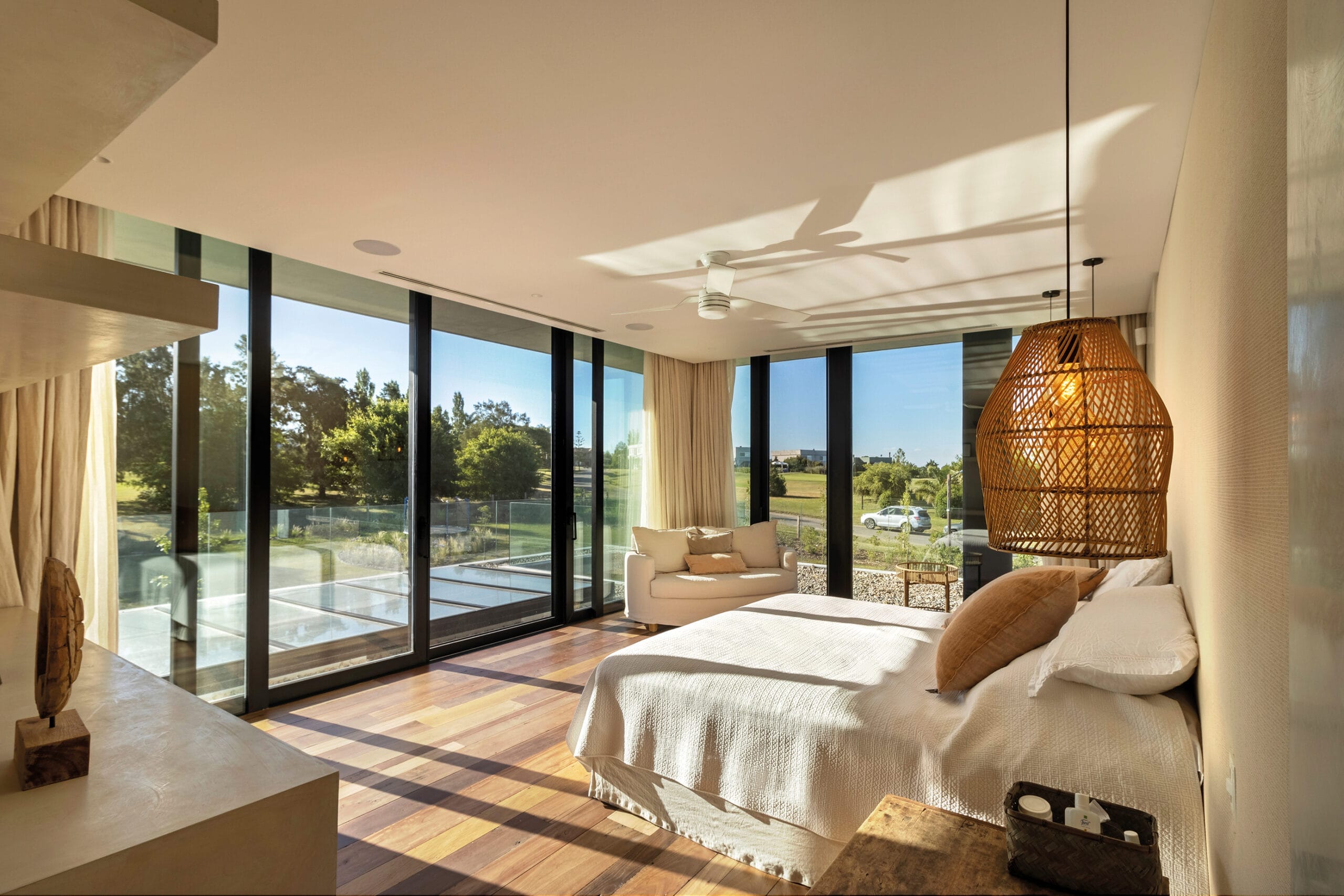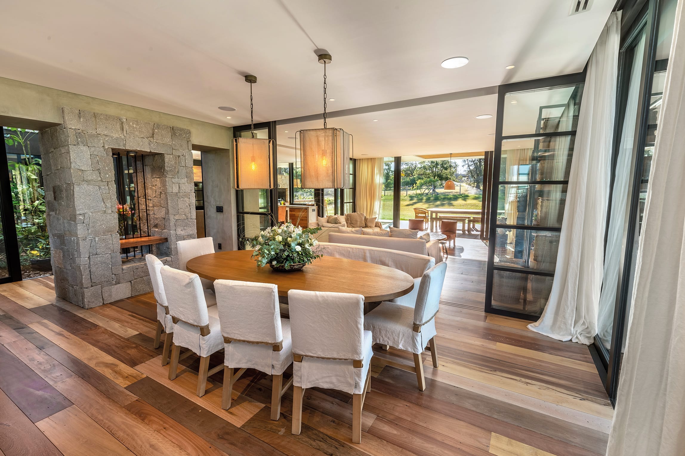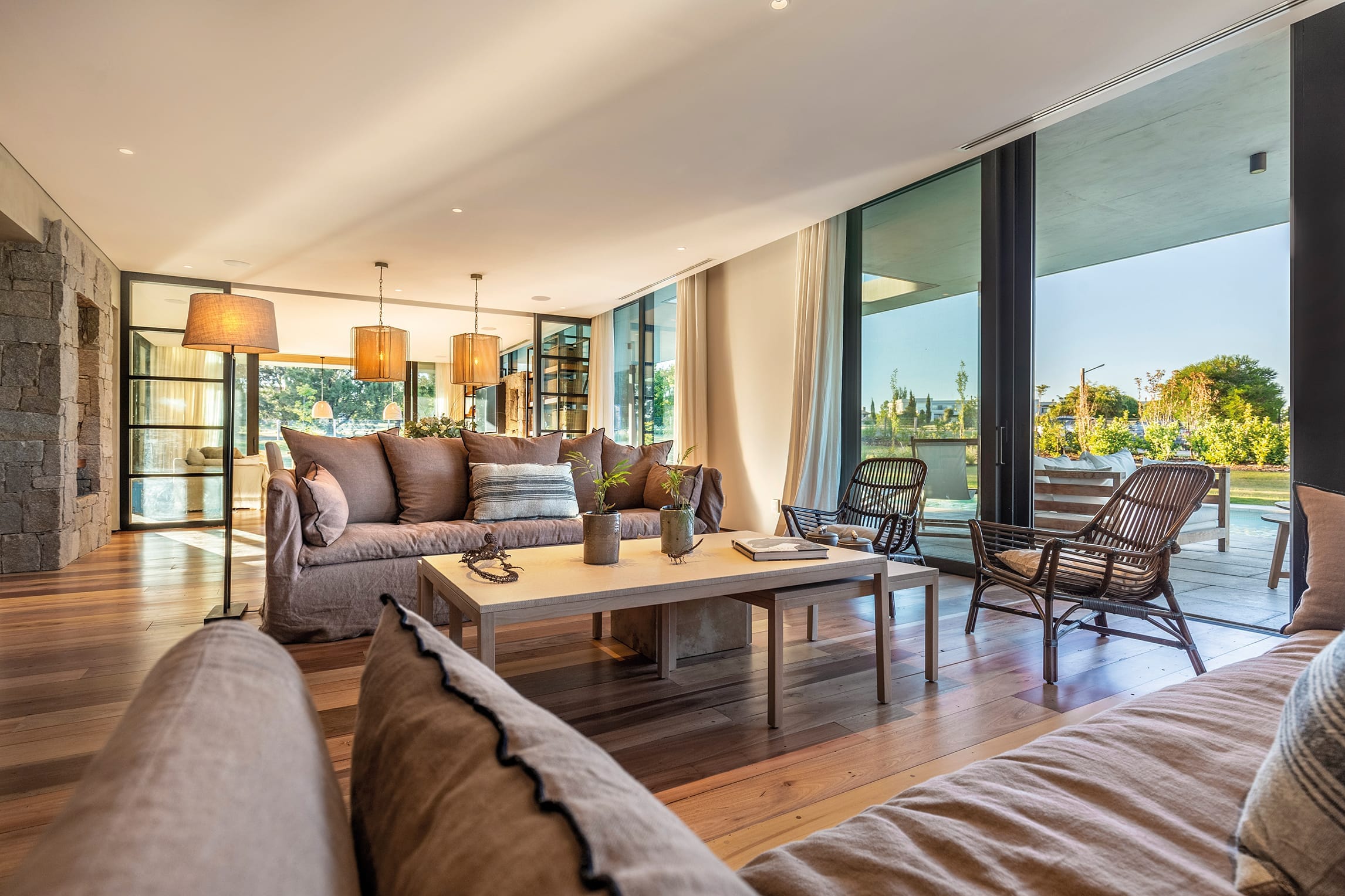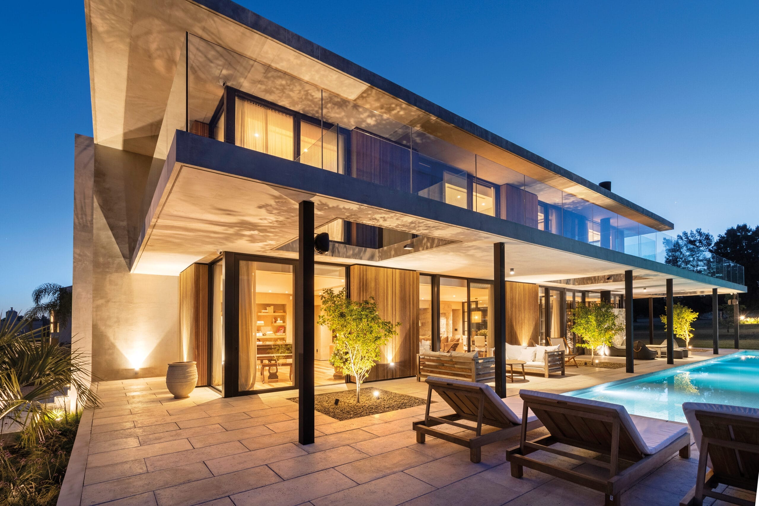 del asoleamiento y la orientación determinaron la estructura del proyecto. El resultado de las prolongadas entrevistas con los habitantes estableció un clima de trabajo fluido y armonioso que se traduce en la estética contemporánea que propone el volumen y la integración natural con el paisaje que propone. La materialidad es austera y efectiva, apela al hormigón, la madera, el vidrio y la piedra utilizada como recurso puntual.