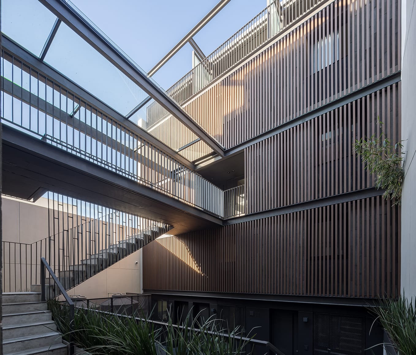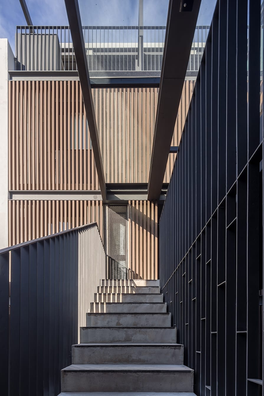 El uso del hormigón y el vidrio como elementos estructurales y de revestimiento aporta una estética moderna y vanguardista al edificio. Los bloques de hormigón, contenidos en vidrio, generan una sensación de solidez y estabilidad, mientras que los elementos verticales a forma de cortasoles de madera añaden un toque de calidez y elegancia al conjunto. Estos parasoles no solo generan transparencias y permiten el paso de la luz natural, sino que también otorgan seguridad y privacidad a los espacios interiores.