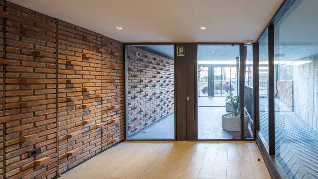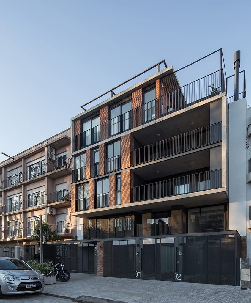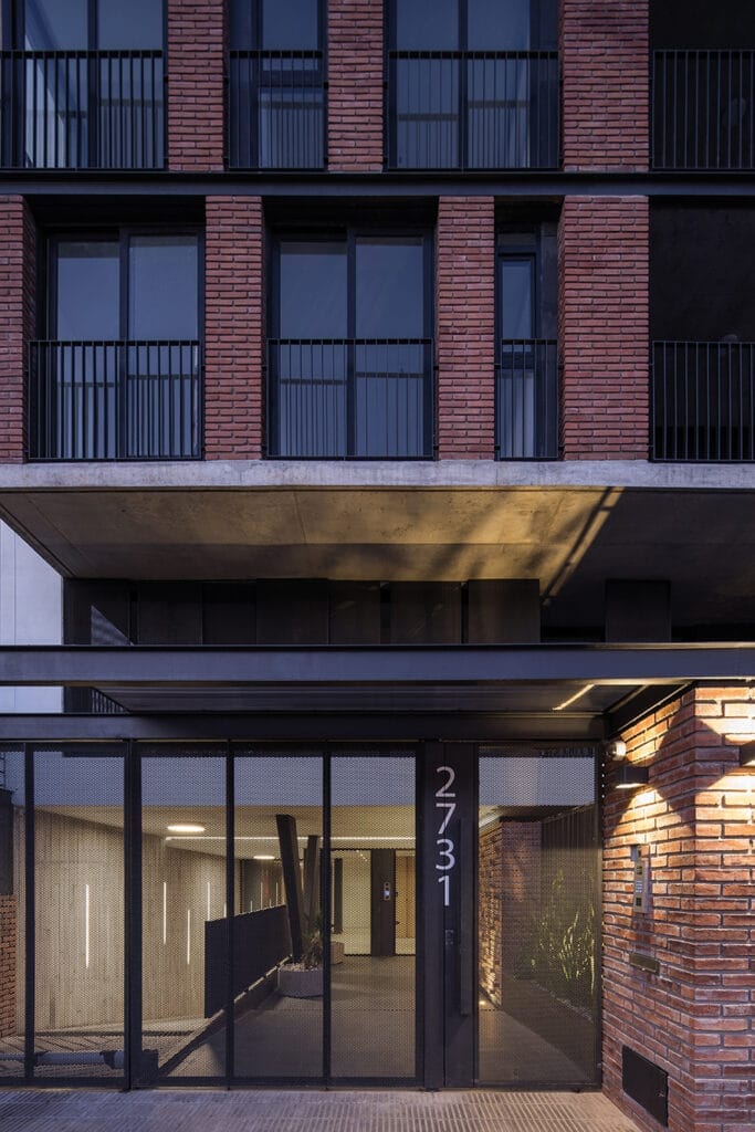 El edificio se presenta con una forma singular y un gesto audaz que enmarca su centro. Un volumen rectangular de hormigón se despliega de manera imponente, delineando claramente la distribución de las unidades. Esta estructura excepcional crea un contraste llamativo con el entorno, convirtiéndose en un edificio que atrae la atención de todos los transeúntes. Asimismo el uso del ladrillo visto, genera una vinculación armoniosa y cálida a la fachada. El uso del mismo, como una reinterpretación de la típica traba tradicional de colocación, va generando planos modernos y texturas audaces que van delimitando los espacios y generando un atractivo juego de sombras.
