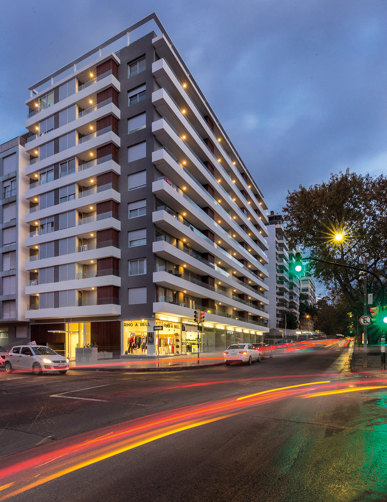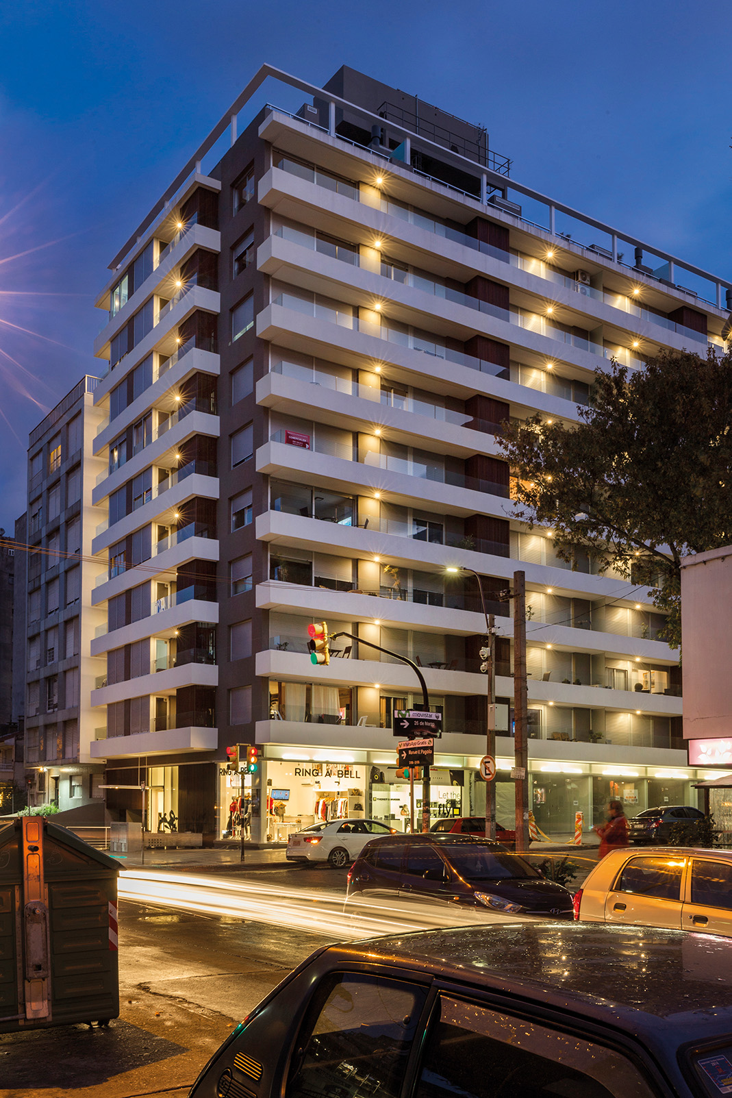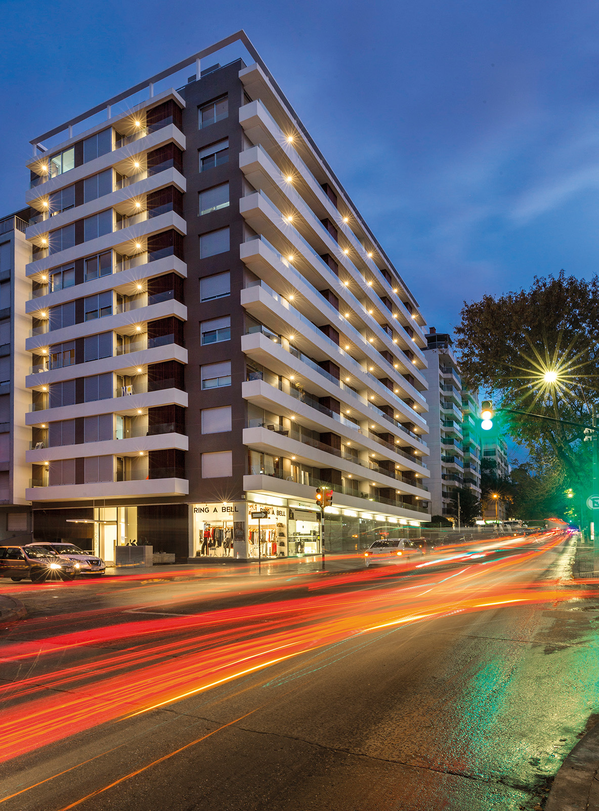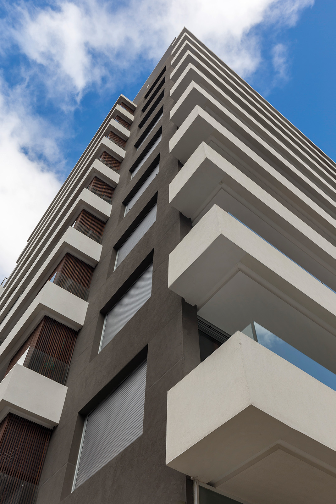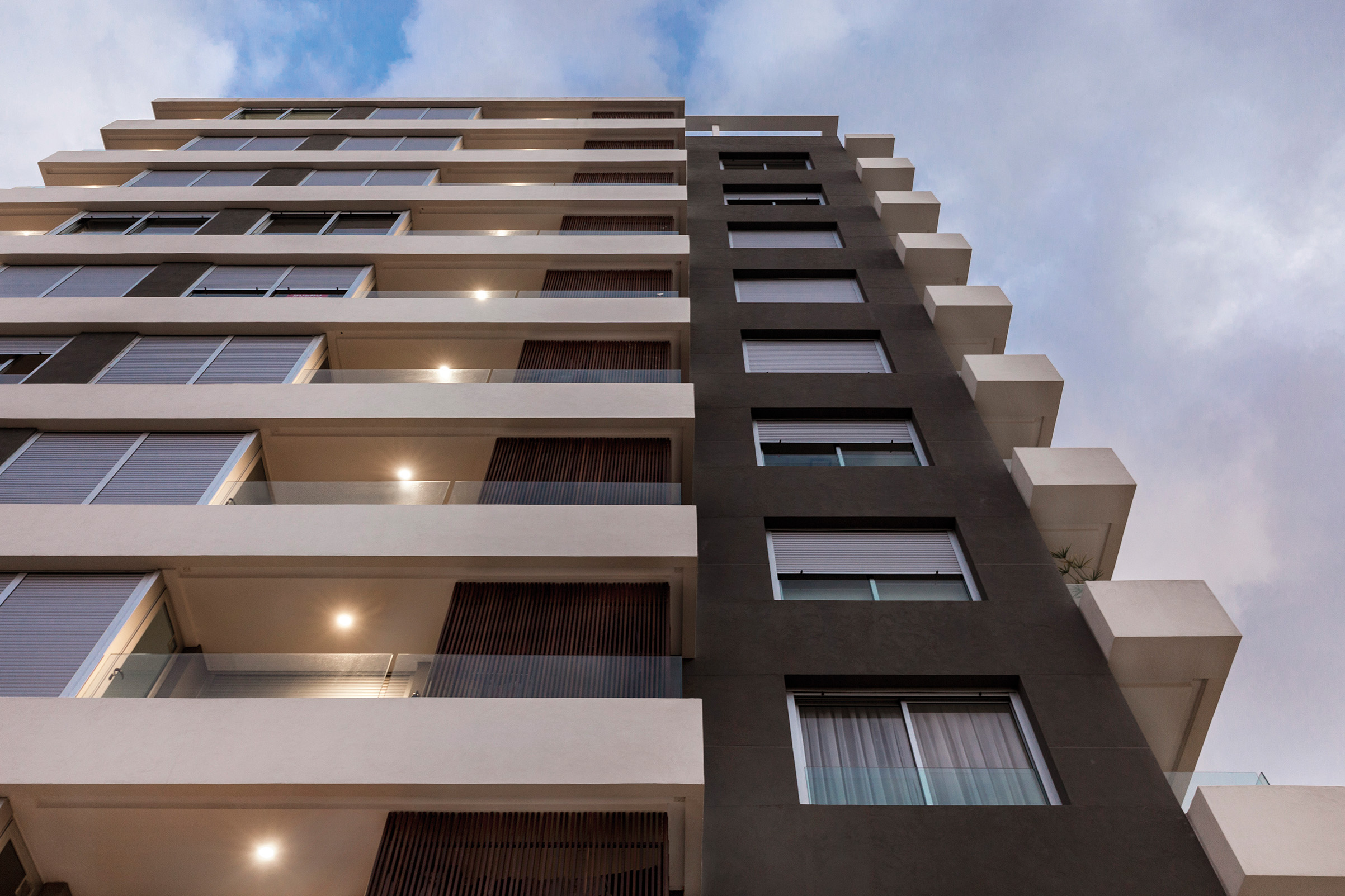 La geometría del volumen exalta la imponencia que alcanza al ocupar una esquina que, como un faro, ilumina desde gracia que promueve un lenguaje rupturista con el paisaje construido en la zona. El tratamiento lineal de las bandejas que contienen las terrazas recorren al edificio dotándolo de una singular plasticidad.
