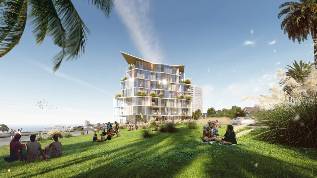 Desde esa conciencia, los arquitectos imaginaron una construcción que se abre hacia tres horizontes simultáneos: el Río de la Plata, la Plaza República de Armenia y la ciudad misma. Una tríada que define no solo su orientación física, sino también su identidad simbólica. Âme se concibe como una rótula entre esos tres mundos —urbano, cívico y natural—, un punto de inflexión donde la arquitectura deja de ser límite para convertirse en mediadora.