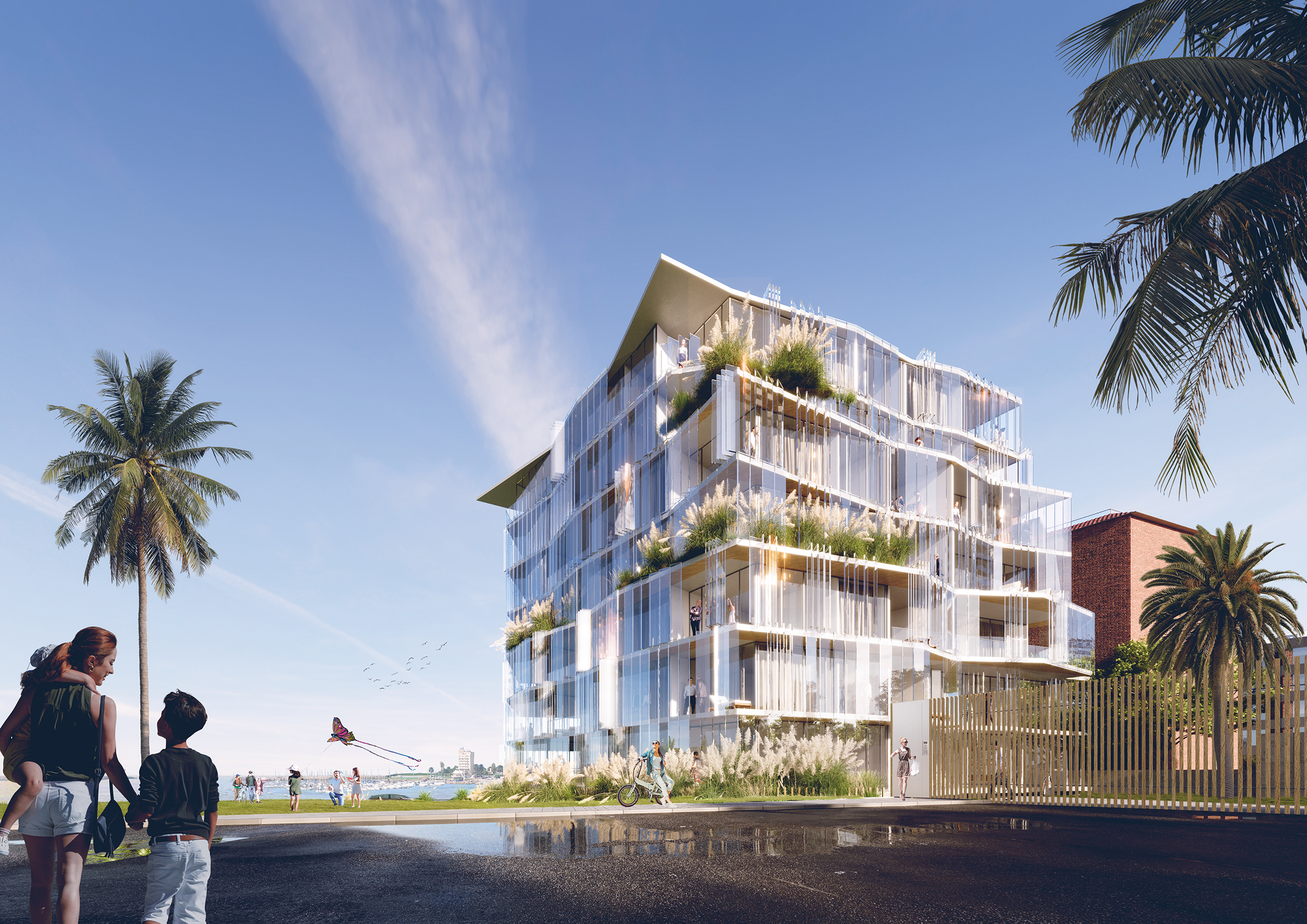 La fachada, esa epidermis que media entre la vida interior y el espacio público, se concibe como un organismo vivo. Sus lamas de vidrio pivotantes generan distintos grados de apertura, controlando la incidencia solar y transformando la apariencia del edificio según la hora del día. A veces lisa y reflexiva, como un espejo que devuelve el cielo; otras, transparente y permeable, revelando la vida interior de las residencias.