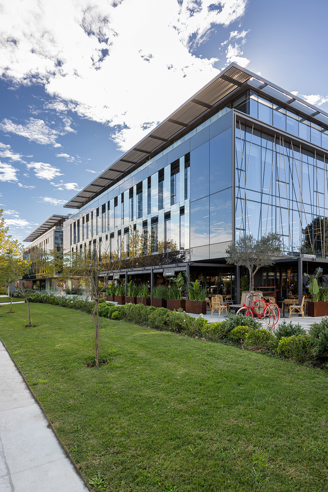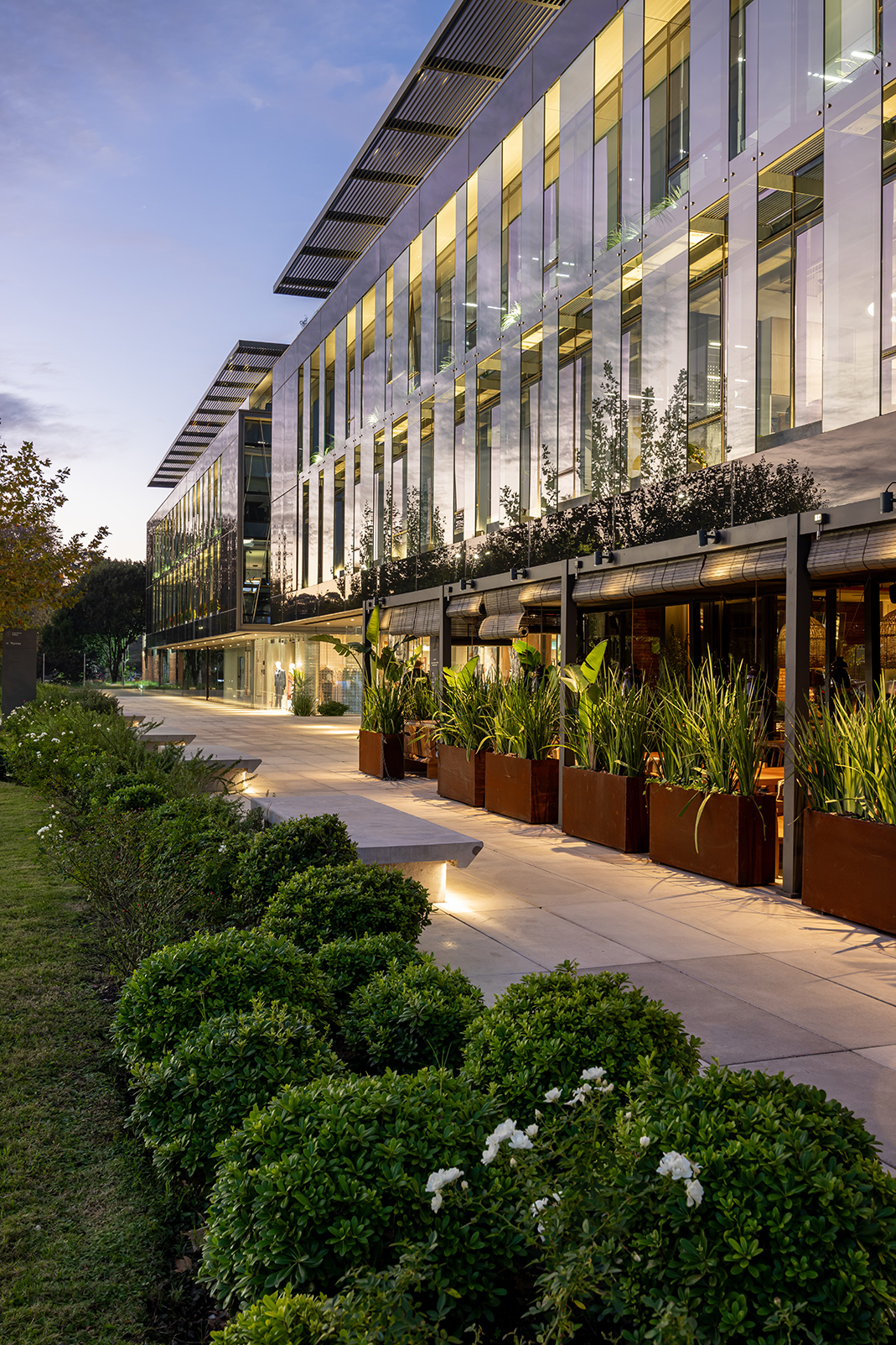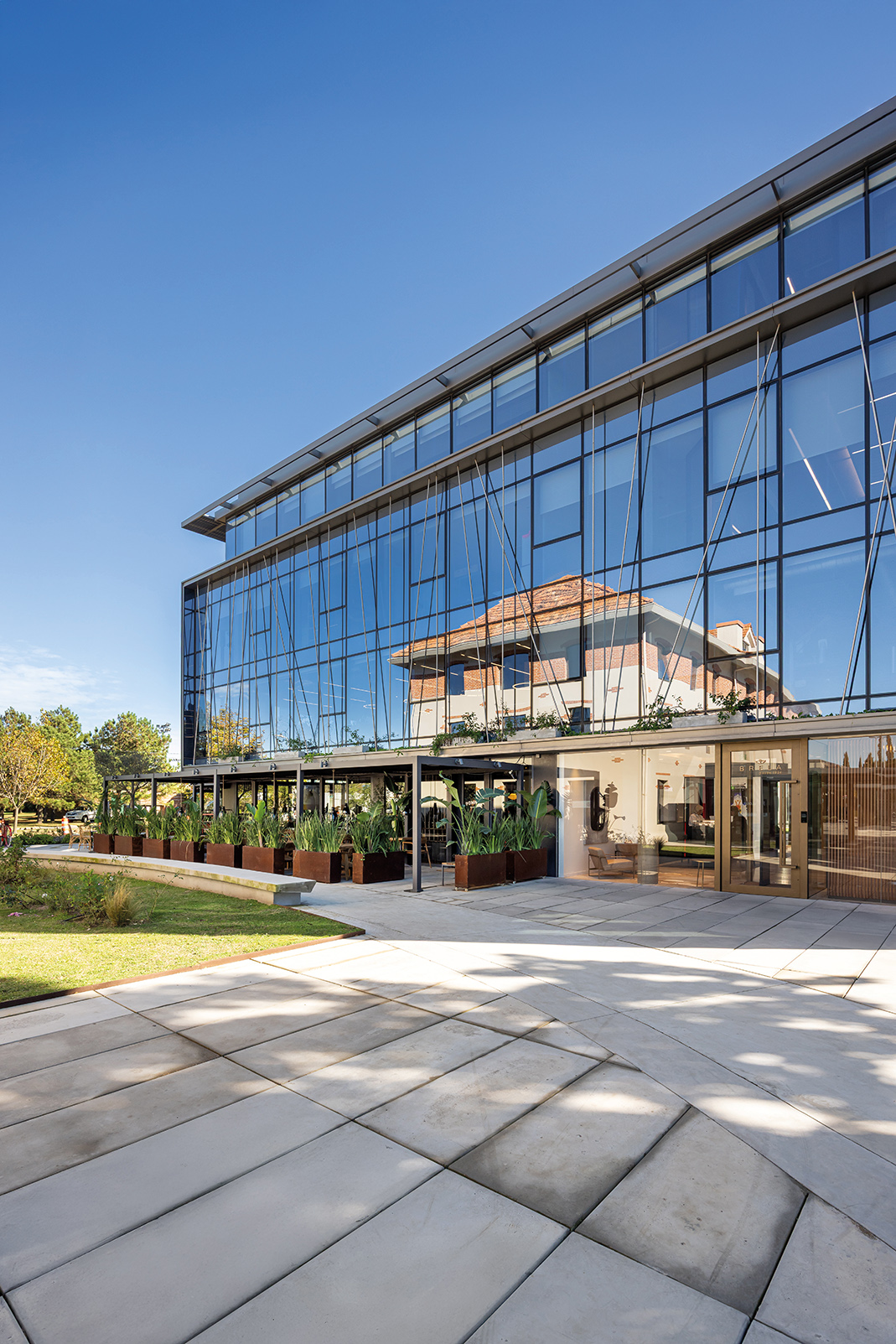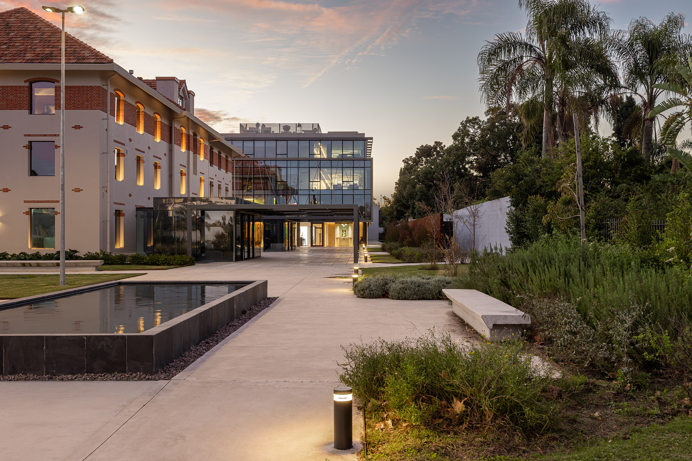 Dos nuevos edificios de piel acristalada y presencia sobria se ensamblan con la casona restaurada como quien encaja piezas de un rompecabezas delicado. Entre ellos, un paseo comercial abierto a la ciudad, una continuidad natural de la calle Costa Rica, hoy epicentro creciente de la gastronomía de autor y los cafés boutique. Todo respira, nada se impone: las transparencias, la segunda piel de control solar, las líneas limpias y la vegetación abundante se conjugan para celebrar esa utopía urbana tantas veces soñada: trabajar, pasear y vivir en un mismo lugar sin sacrificar calidad de vida. El conjunto ha sido concebido bajo los exigentes parámetros de la certificación LEED Gold, como una declaración de principios más que como un sello. Eficiencia energética, sostenibilidad, respeto por el entorno: no como discurso, sino como estructura. Y para que no falte el toque poético, el diseño del paisaje ha sido encomendado a Carlos Thays (el bisnieto), en una suerte de reencuentro silencioso con la obra fundacional de su tatarabuelo. Porque sí: el Parque Grauert, que hoy dialoga con Carrasco Valley como si fueran dos viejos amigos que se reencuentran después de años, fue originalmente bosquejado por el mismo linaje de paisajistas.