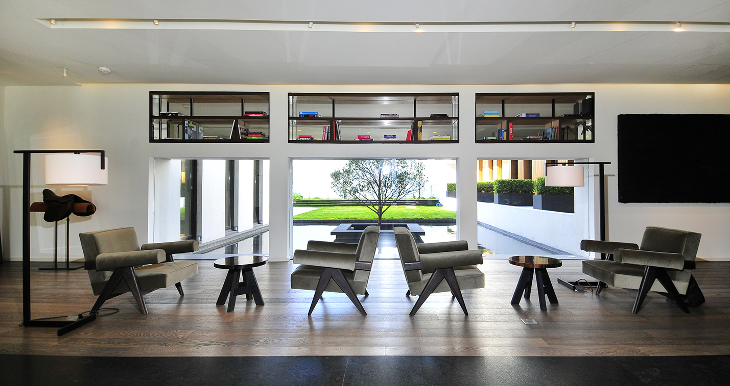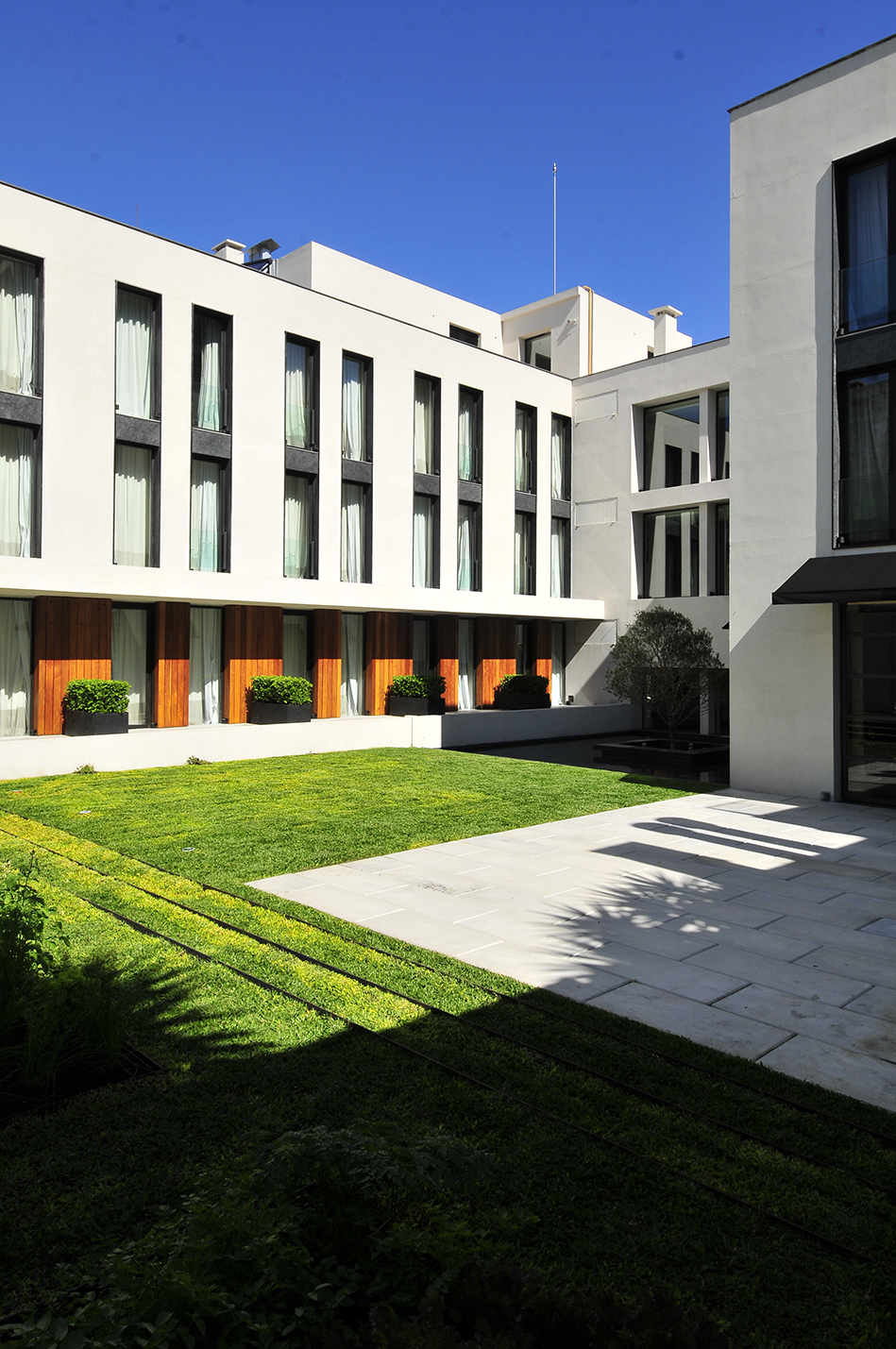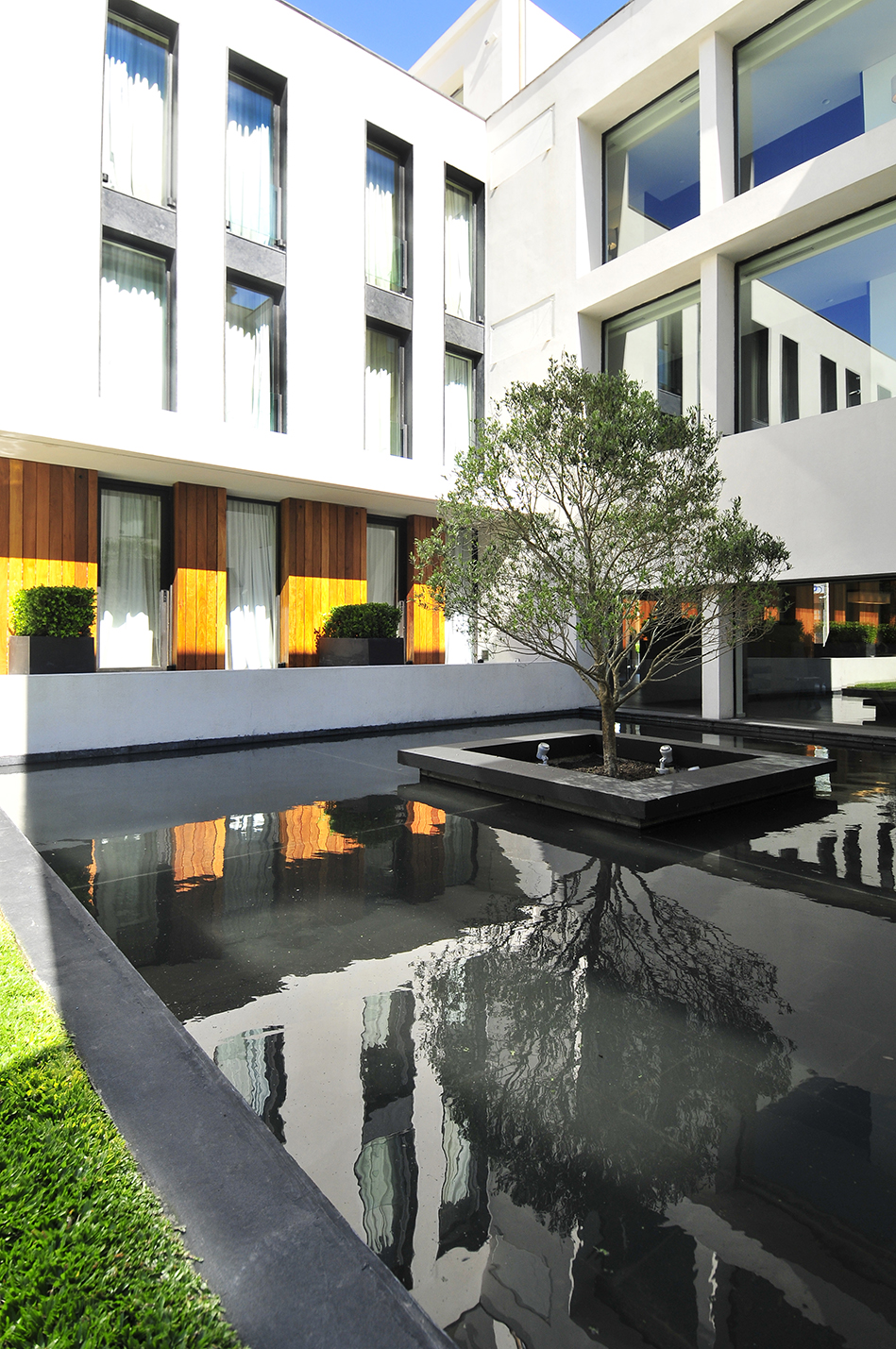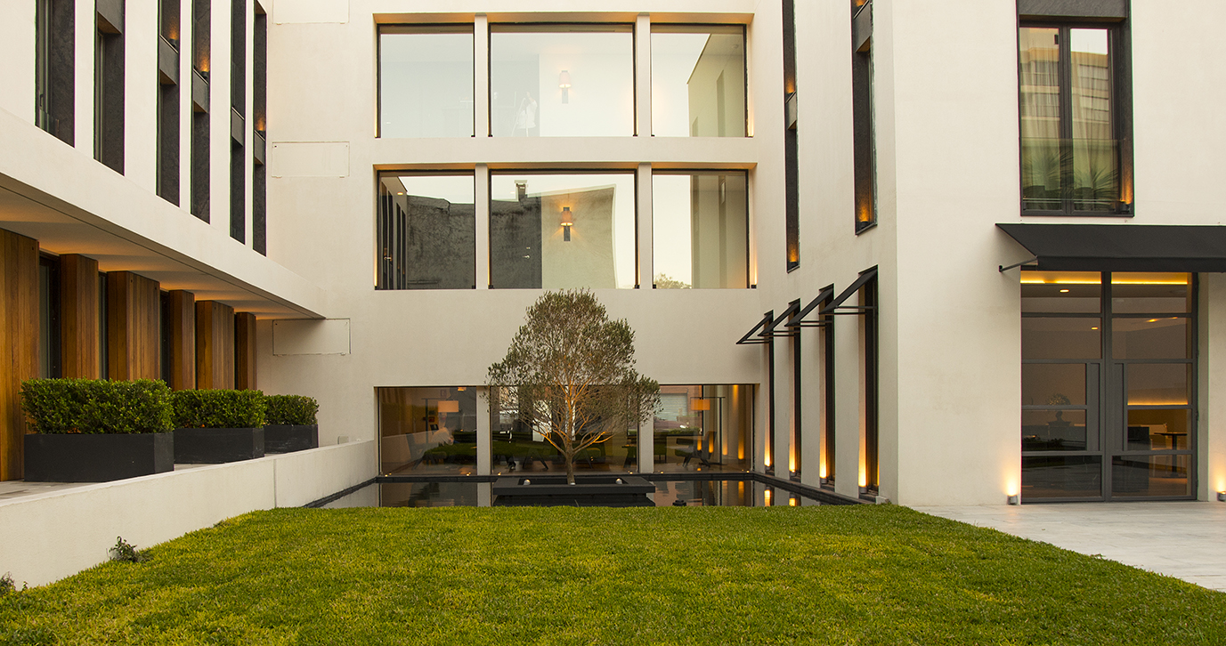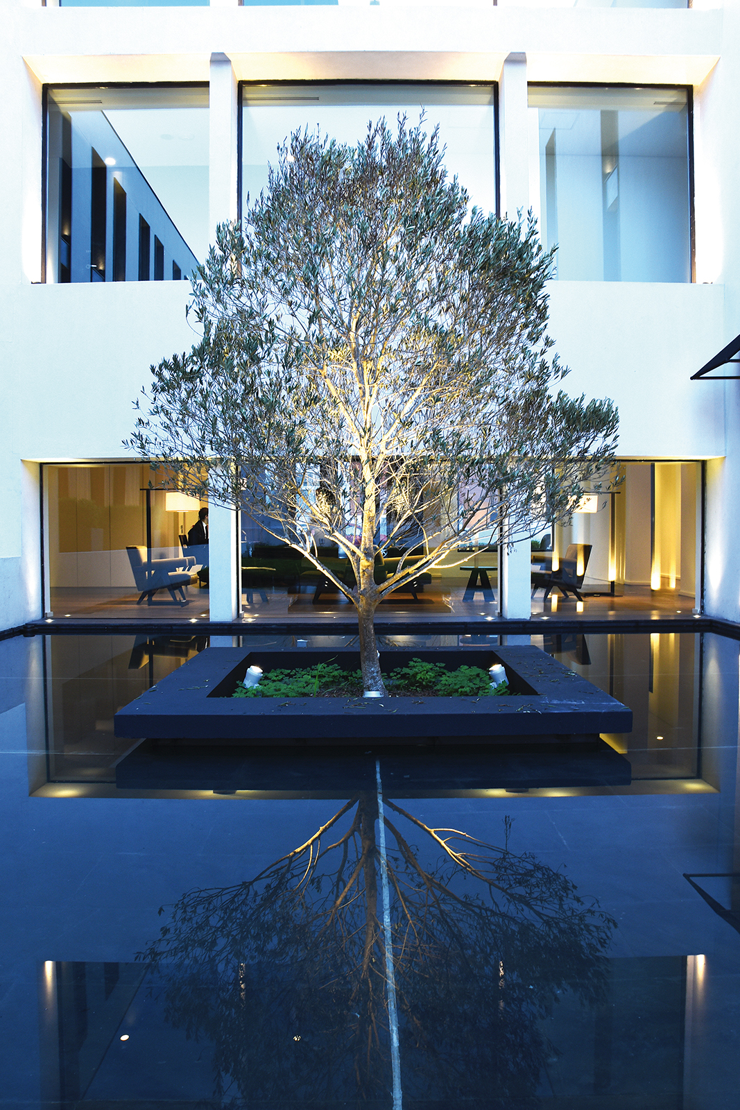 El diseño de los espacios interiores del hotel contiene una referencia oriental, reflejada en la atmósfera de calma, en la invitación a sus recorridos pausados, en el cuidadoso juego de sombras. En el centro de la edificación, se encuentra un espacio exterior, en el que predomina una vegetación baja, un circuito de equilibradas zonas de estancia, espejos de agua y la presencia central del estoico y honorable olivo, que deleita al huésped en su lujosa estadía, en la calma y en la pausa.