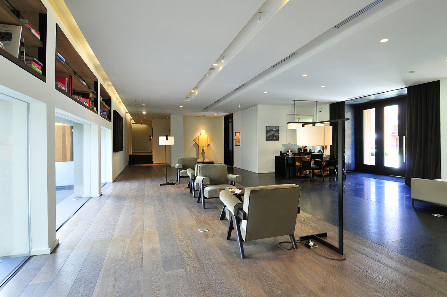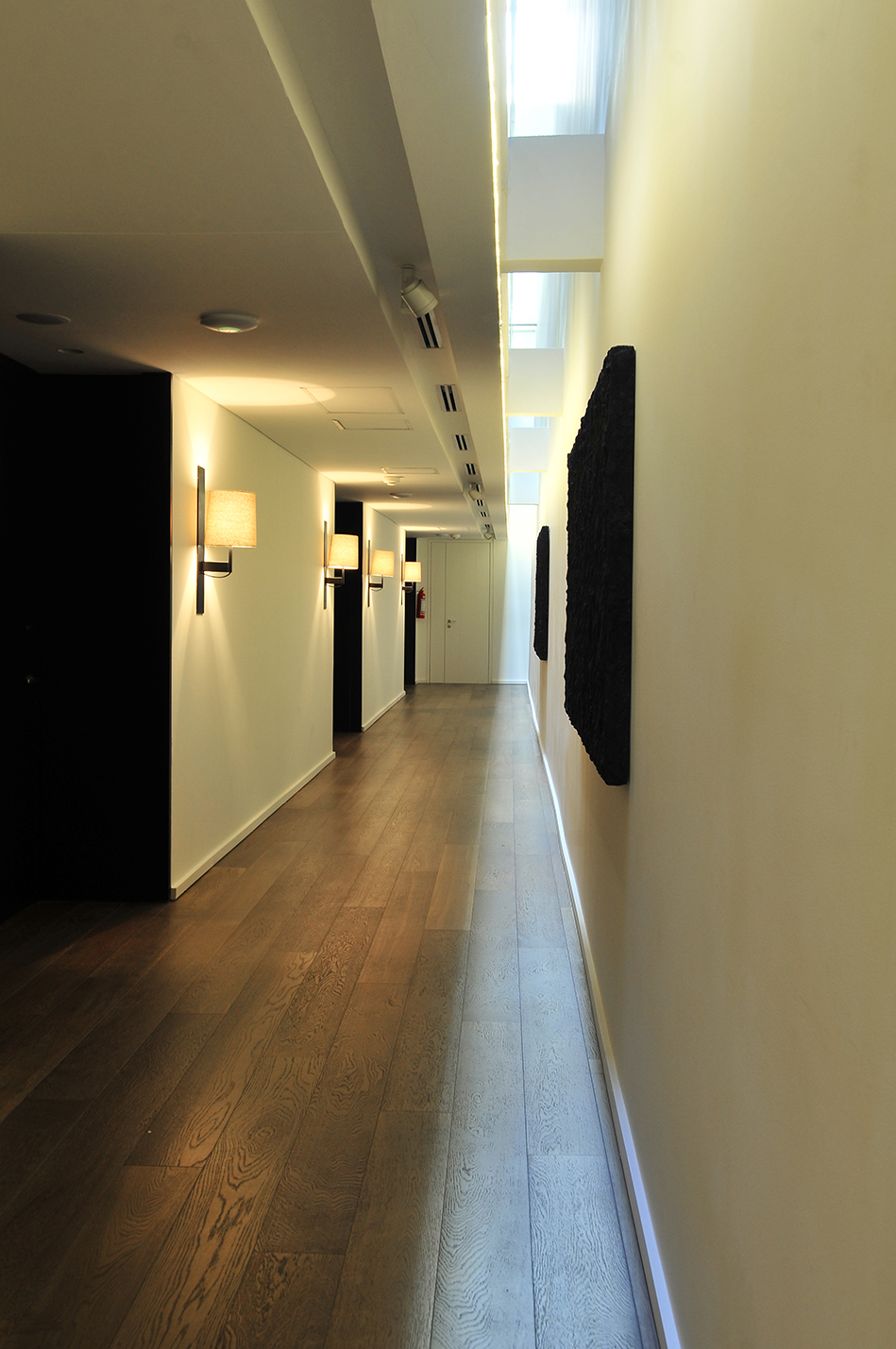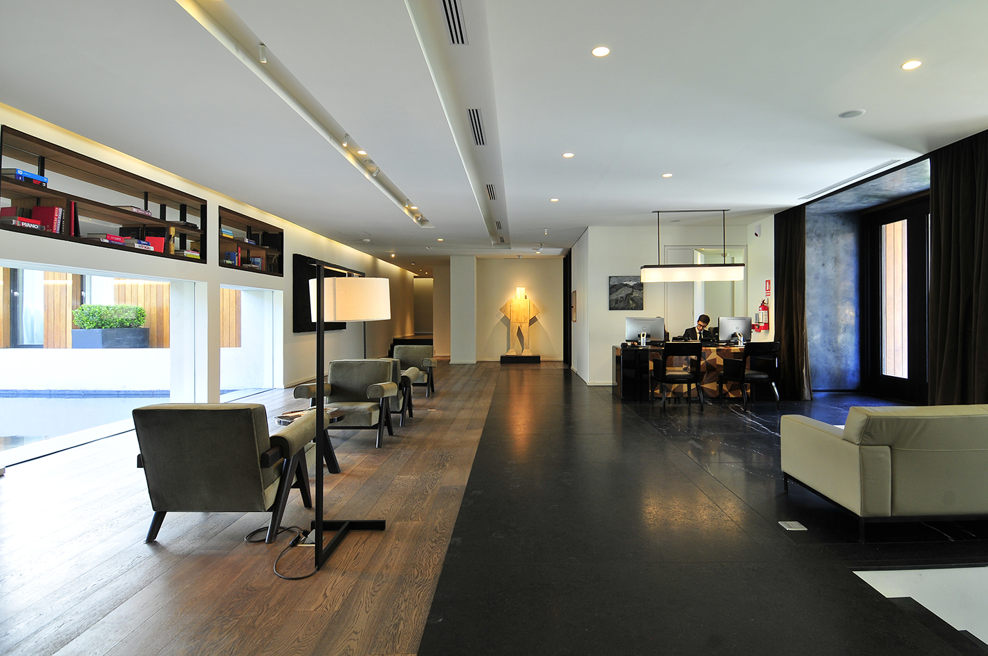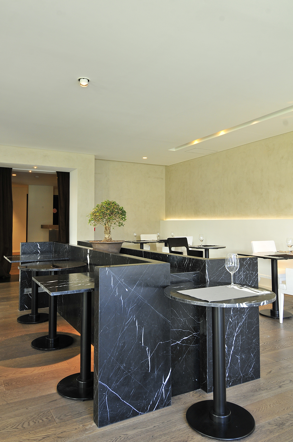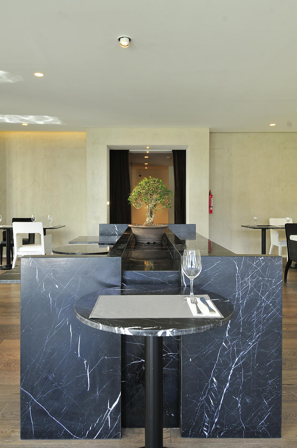 El diseño de los espacios interiores del hotel contiene una referencia oriental, reflejada en la atmósfera de calma, en la invitación a sus recorridos pausados, en el cuidadoso juego de sombras. En el centro de la edificación, se encuentra un espacio exterior, en el que predomina una vegetación baja, un circuito de equilibradas zonas de estancia, espejos de agua y la presencia central del estoico y honorable olivo, que deleita al huésped en su lujosa estadía, en la calma y en la pausa.