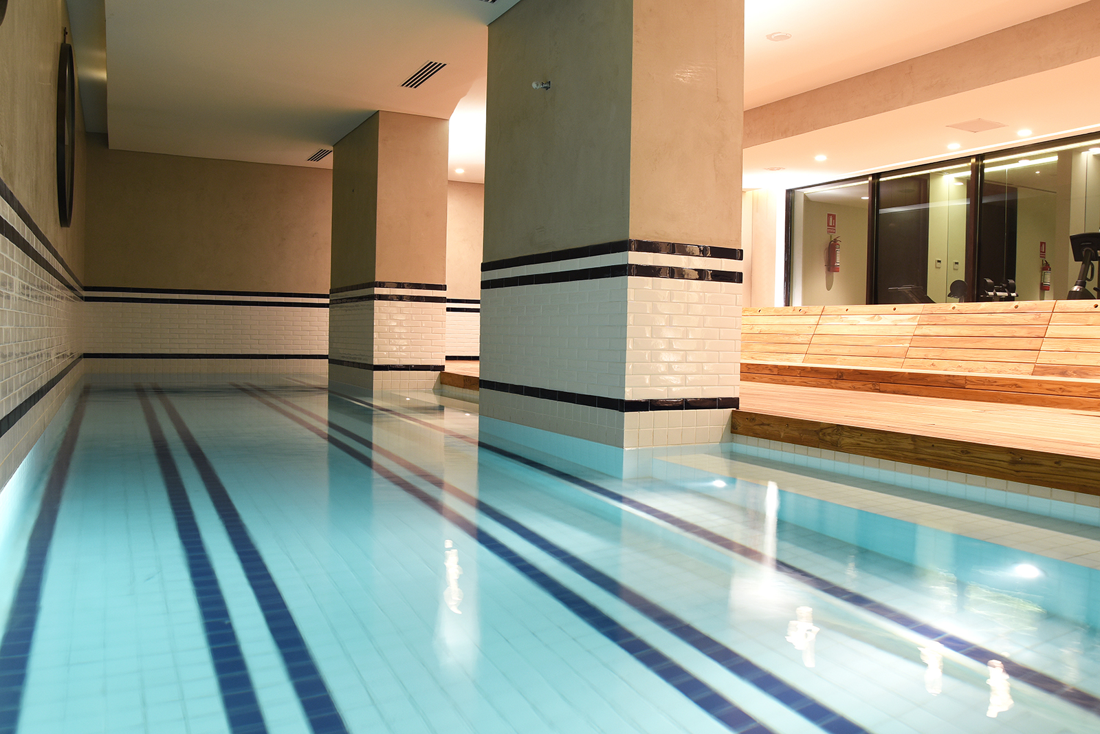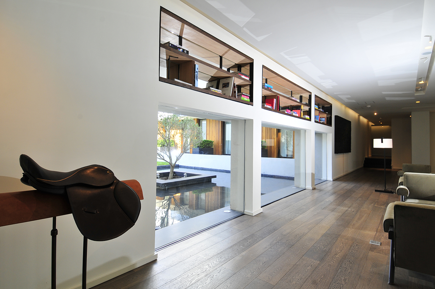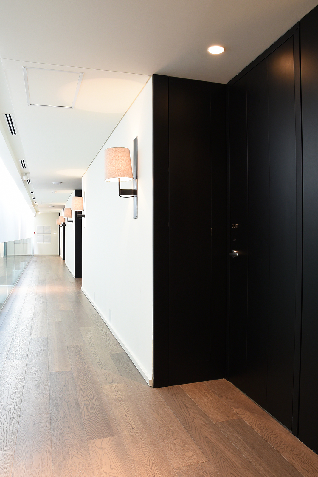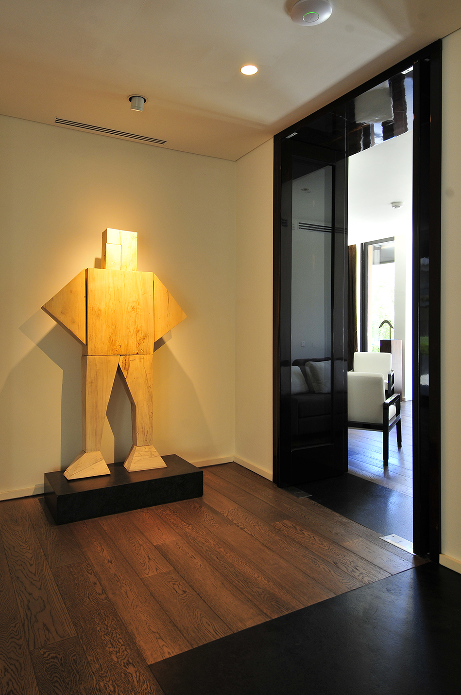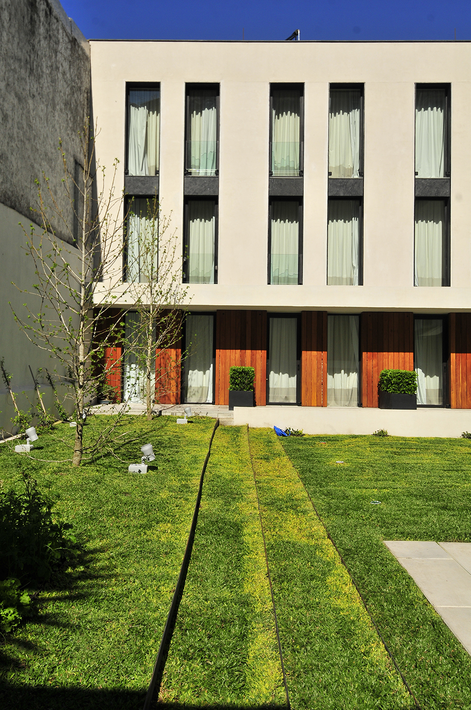 El diseño de los espacios interiores del hotel contiene una referencia oriental, reflejada en la atmósfera de calma, en la invitación a sus recorridos pausados, en el cuidadoso juego de sombras. En el centro de la edificación, se encuentra un espacio exterior, en el que predomina una vegetación baja, un circuito de equilibradas zonas de estancia, espejos de agua y la presencia central del estoico y honorable olivo, que deleita al huésped en su lujosa estadía, en la calma y en la pausa.