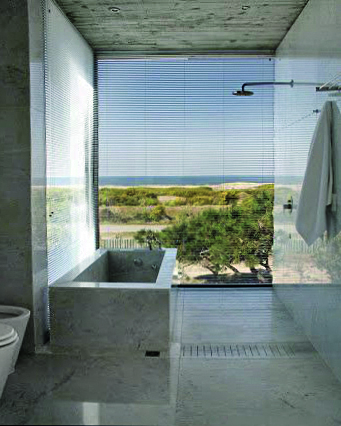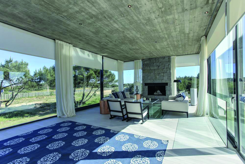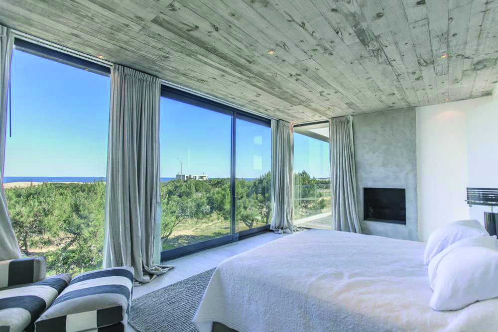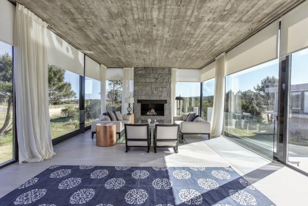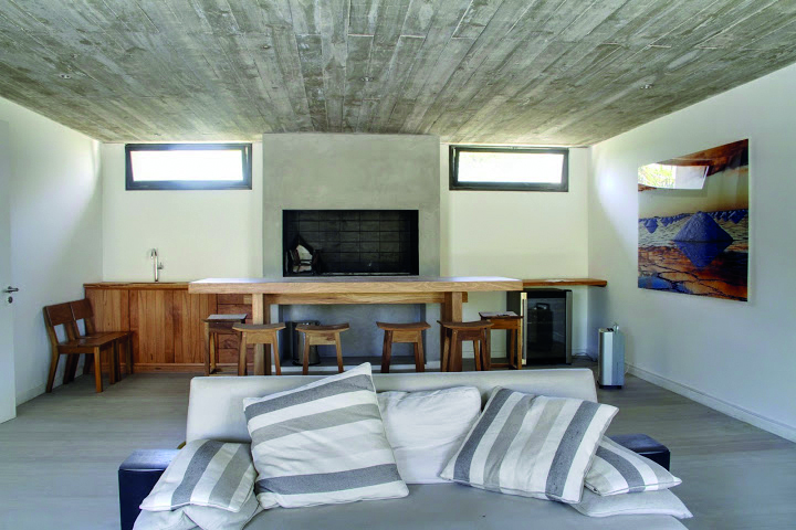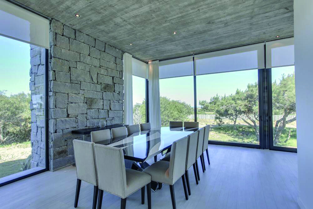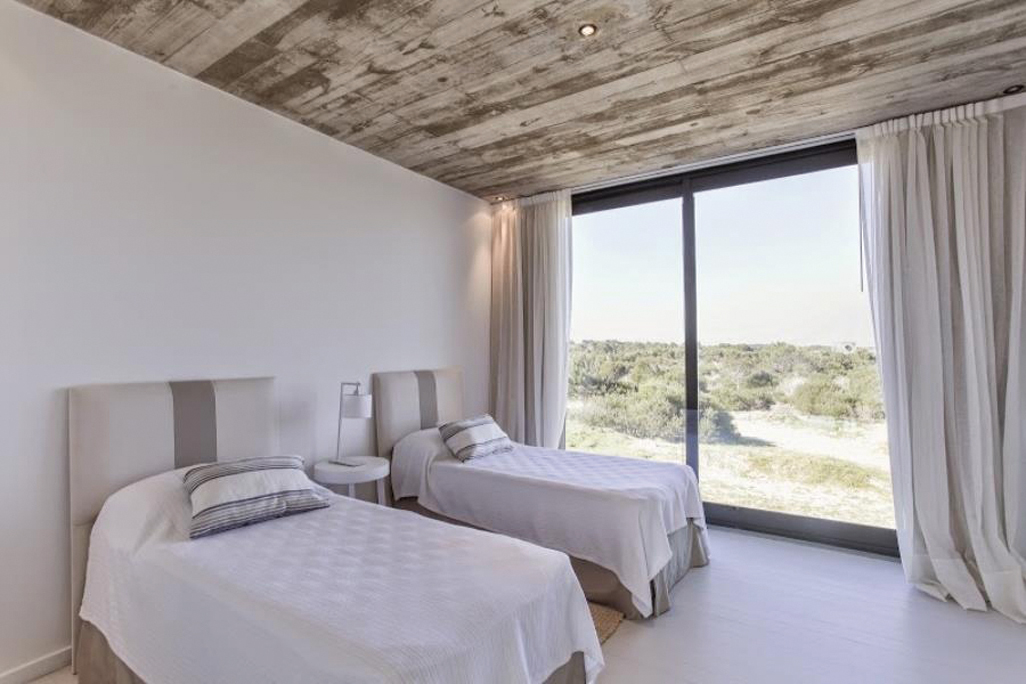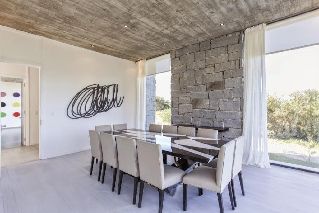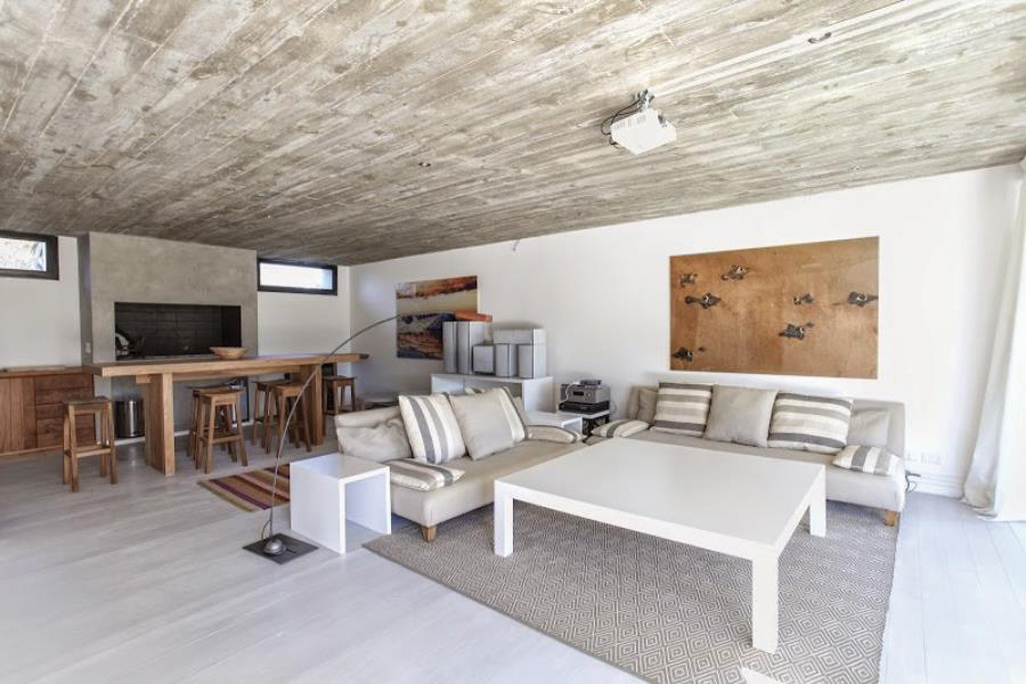 El equipamiento es ligero, casi etéreo, y provoca desde la simplicidad una idea de confort que se asocia al descanso, al verano y al mar. Los muebles escogidos para equipar la casa son de línea danesa y el concepto mismo del equipamiento es nórdico. Breve, pocas piezas, y muy bien elegidas. Los cielorrasos descarnados, el pavimento revestido en cerámica imitación madera color blanco, paredes de piedra, y luz, mucha luz natural que ingresa a raudales en todos los ambientes.