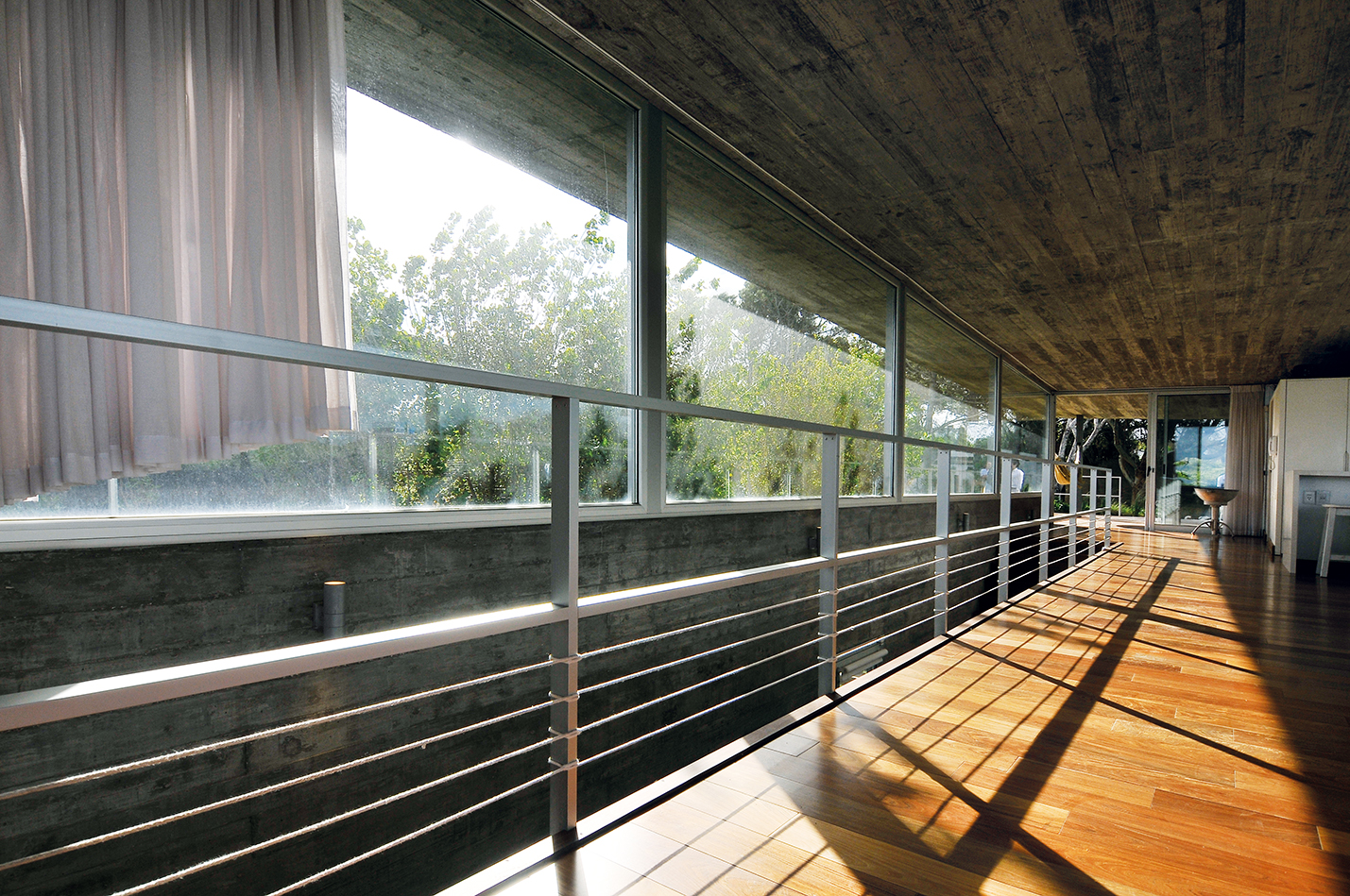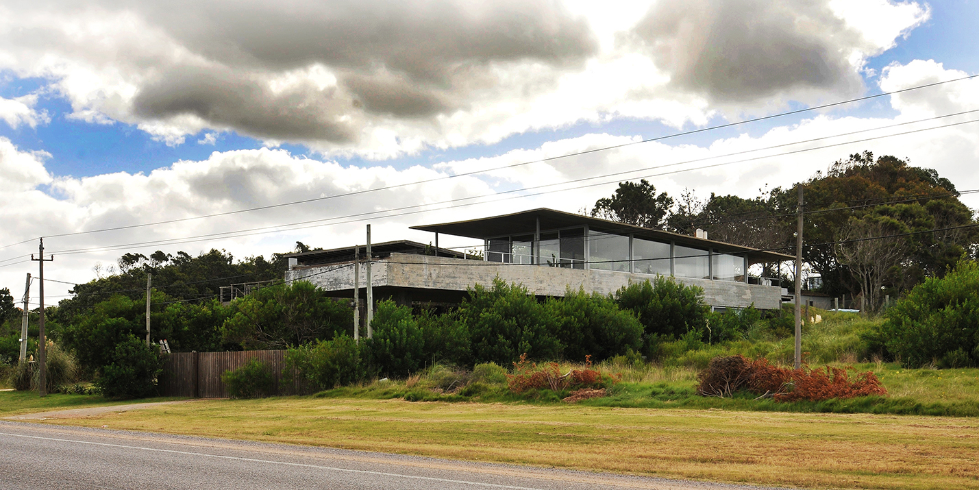 Desde la ruta 10, camino que transitamos regularmente, la casa llama nuestra atención. Algo así como una torre de hormigón armado que se levanta como un edificio que en planta baja está cerrado y se abre en su nivel superior con enormes ventanales y una gran terraza que vuela sobre el edificio.